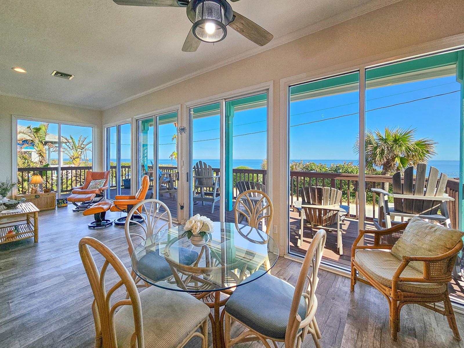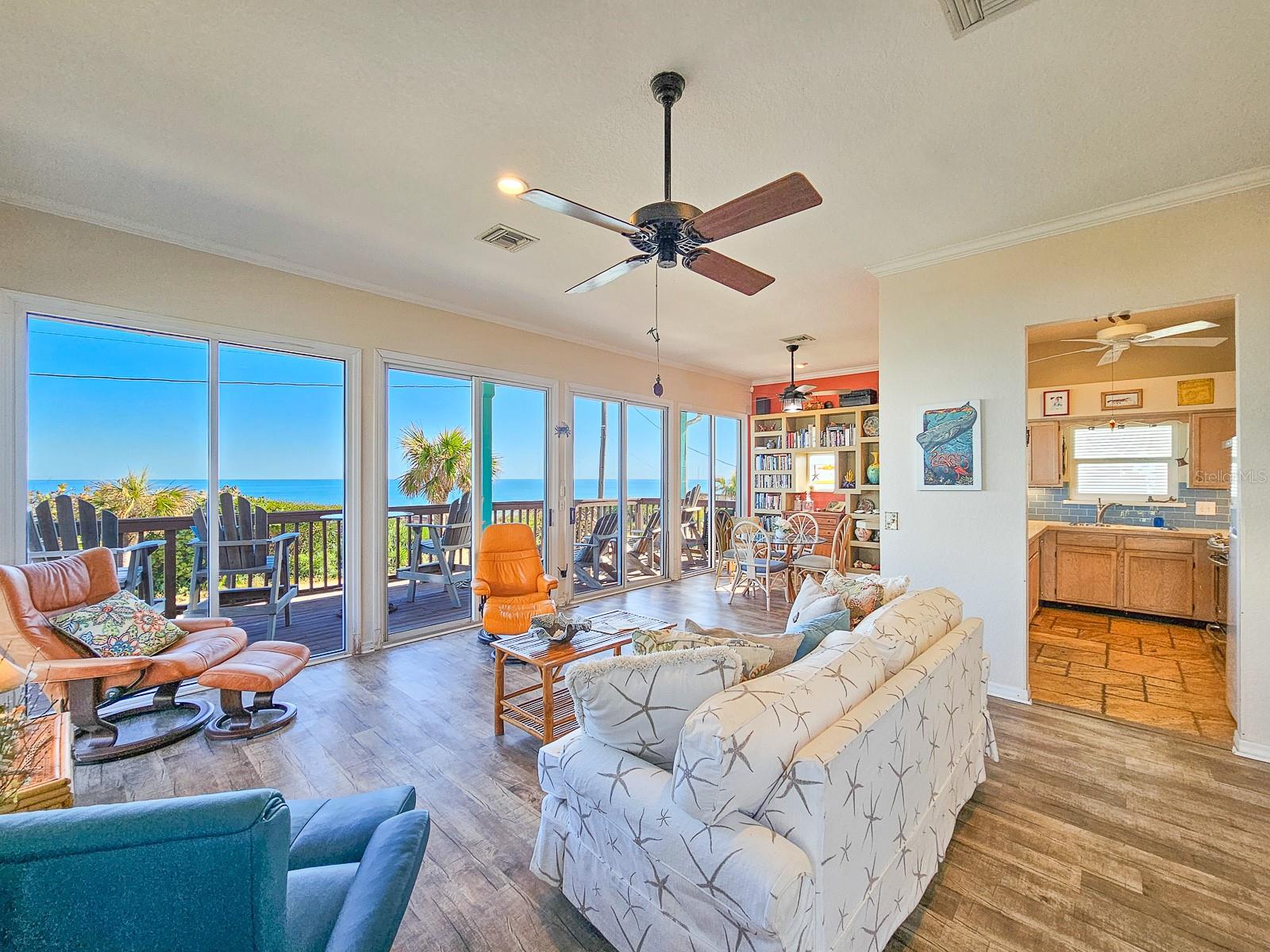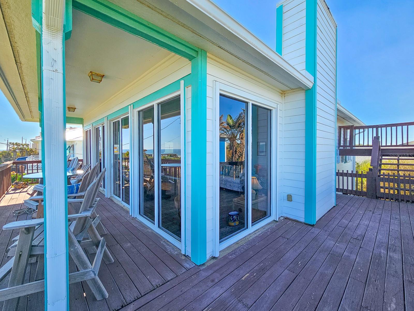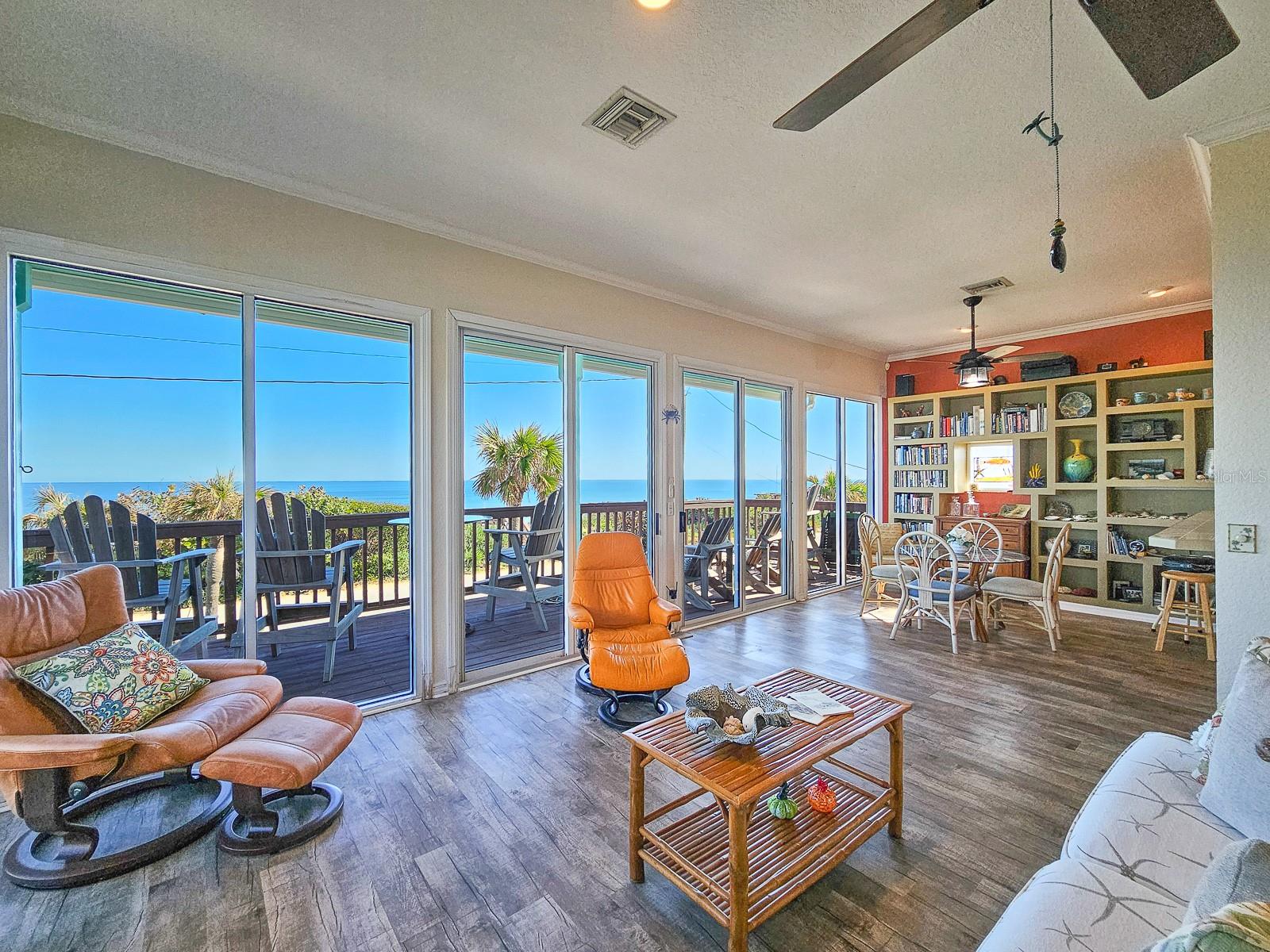 Rare opportunity to own 3 lot oceanfront home! Property is high and dry, one of highest dune elevations in New Smyrna Beach. Robust vegetation anchors the dune, making it extremely protected. The private deeded dune walkover is in the coveted, secluded beach section of Bethune Beach! Home has amazing ocean views from the large wrap-around deck along with 2 bedrooms and 2 baths and multiple built-ins. Two car garage has lift and will accommodate 3 vehicles. New roof in 2022. New HVAC in 2023, with Seer rating of 16.5. Whole house generator including auto transfer switch connected to three propane tanks and hurricane shutters. Outside propane connection on north side of garage to connect your grill. New 50 gallon hot water tank. Current termite bond. Outdoor shower. Plenty of parking with oversized driveway.