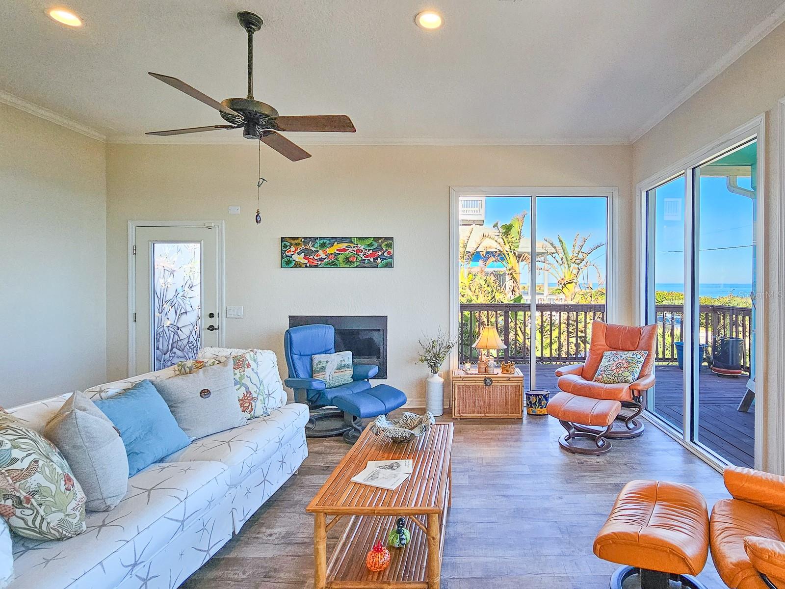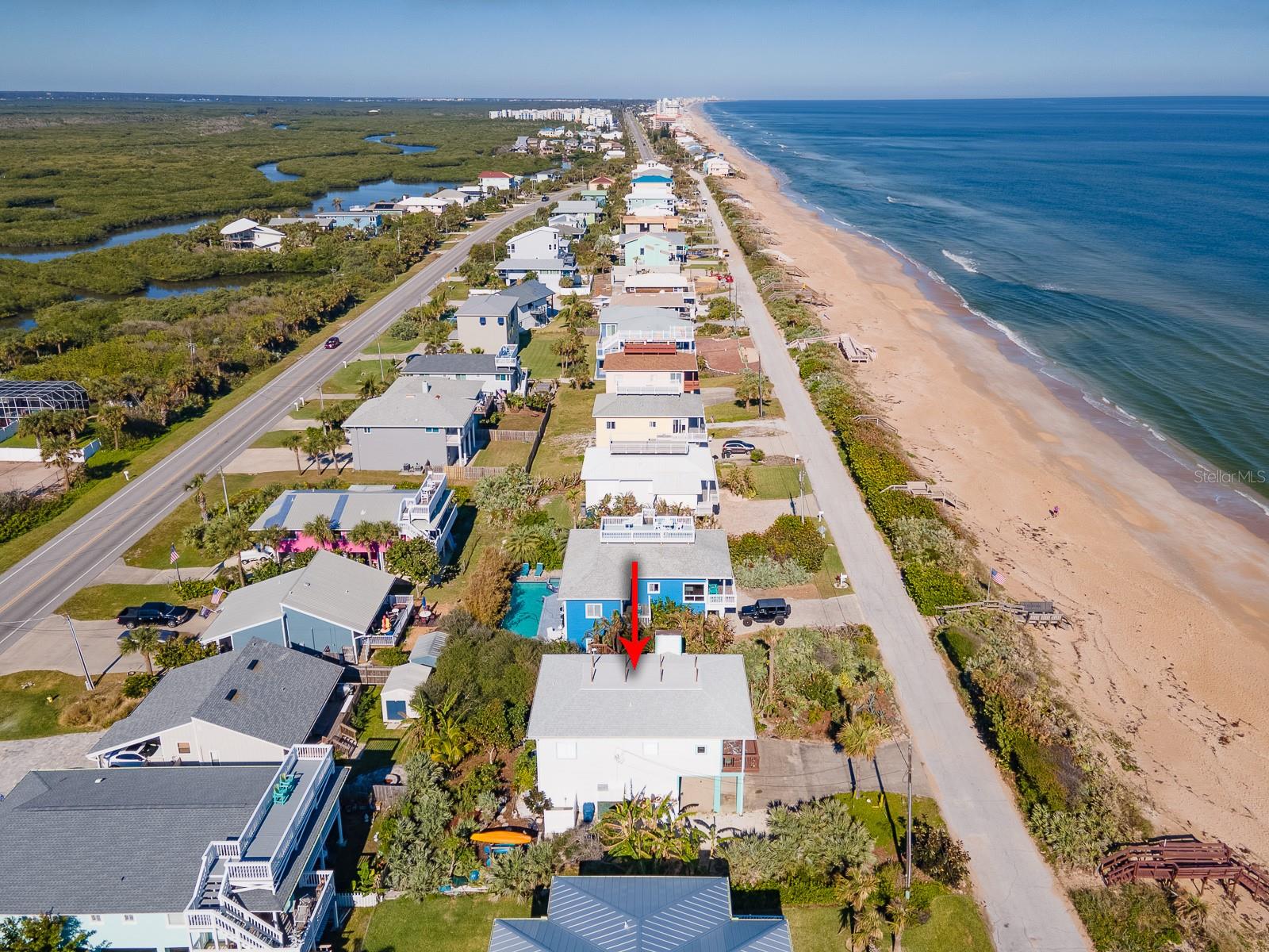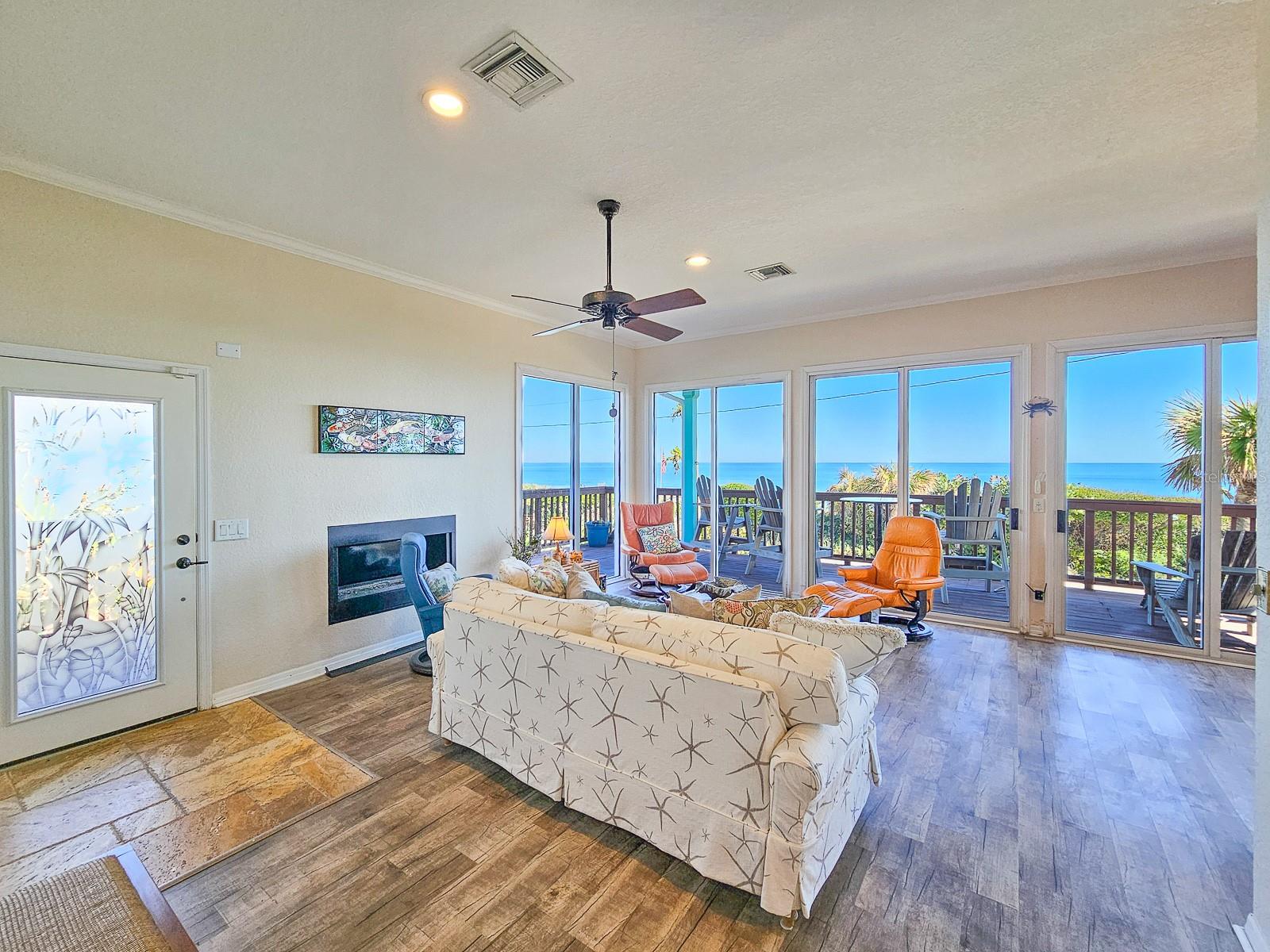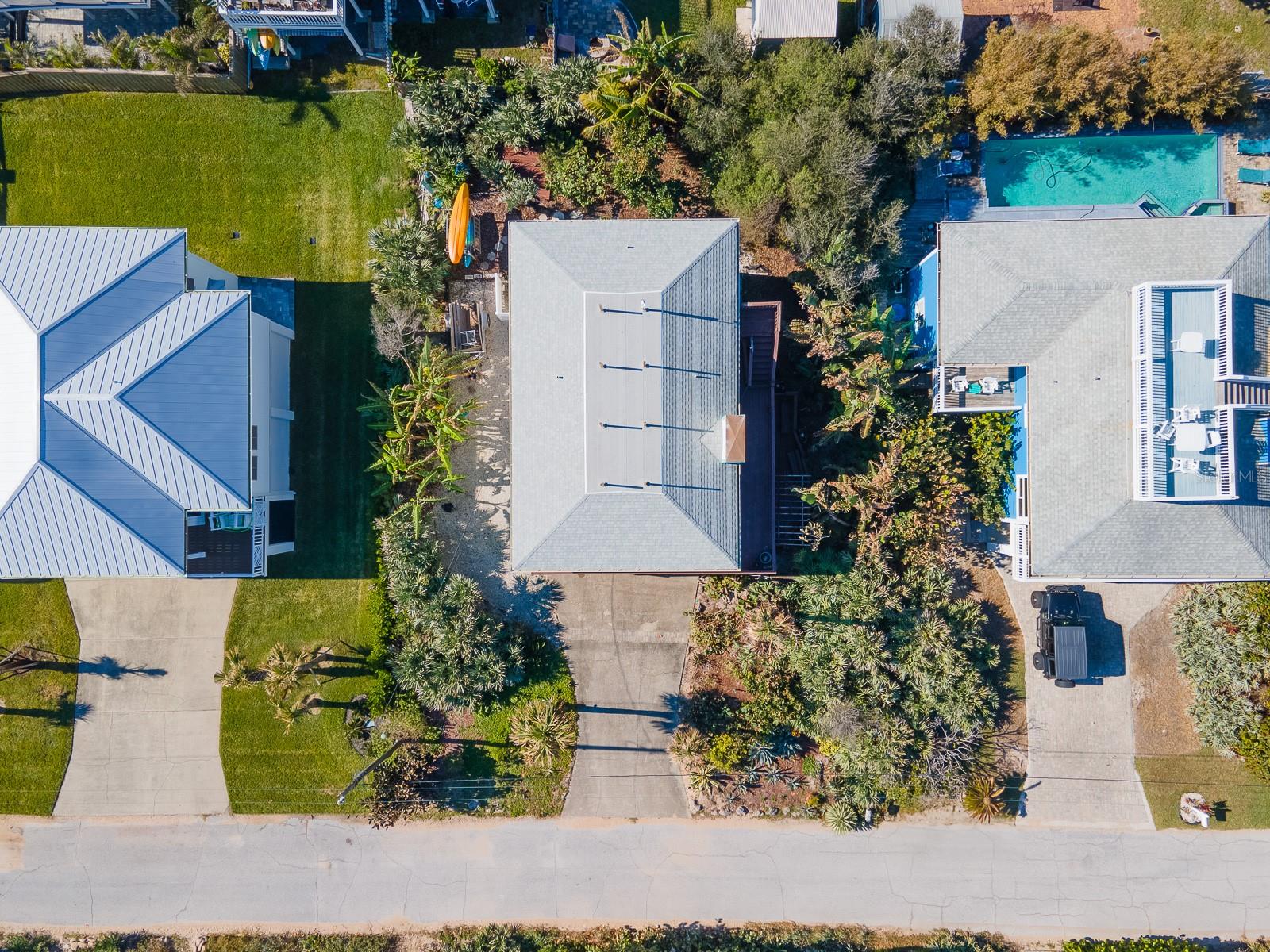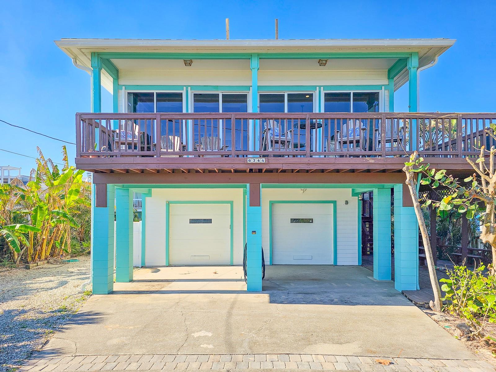 Rare opportunity to own 3 lot oceanfront home! Property is high and dry, one of highest dune elevations in New Smyrna Beach. Robust vegetation anchors the dune, making it extremely protected. The private deeded dune walkover is in the coveted, secluded beach section of Bethune Beach! Home has amazing ocean views from the large wrap-around deck along with 2 bedrooms and 2 baths and multiple built-ins. Two car garage has lift and will accommodate 3 vehicles. New roof in 2022. New HVAC in 2023, with Seer rating of 16.5. Whole house generator including auto transfer switch connected to three propane tanks and hurricane shutters. Outside propane connection on north side of garage to connect your grill. New 50 gallon hot water tank. Current termite bond. Outdoor shower. Plenty of parking with oversized driveway.