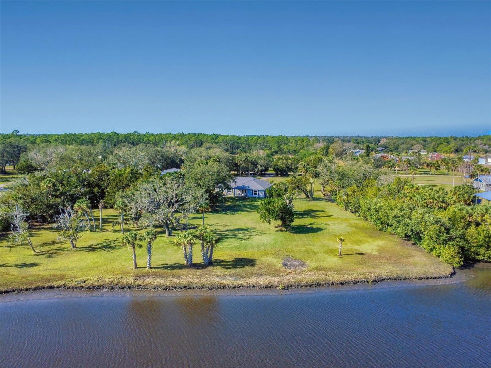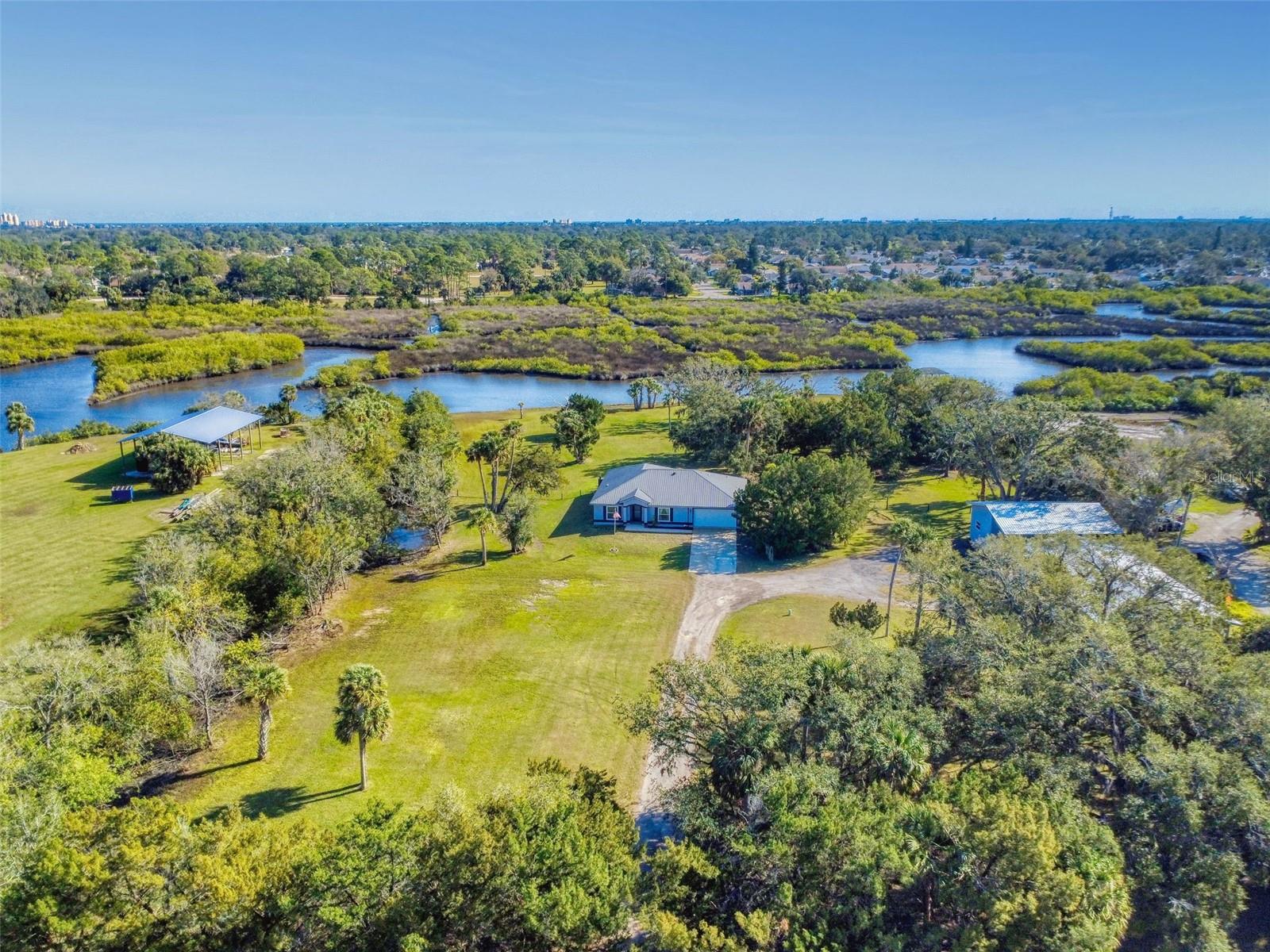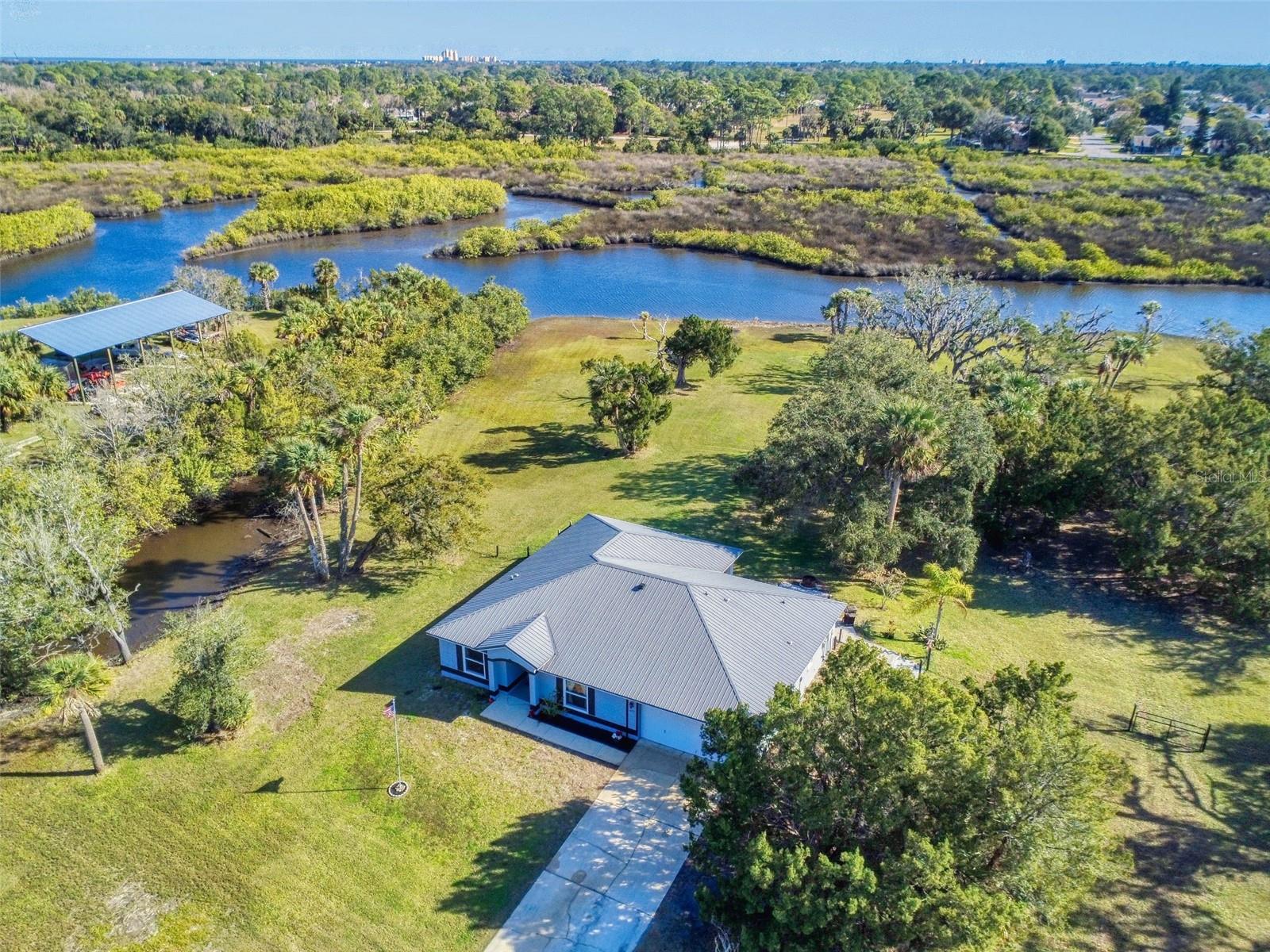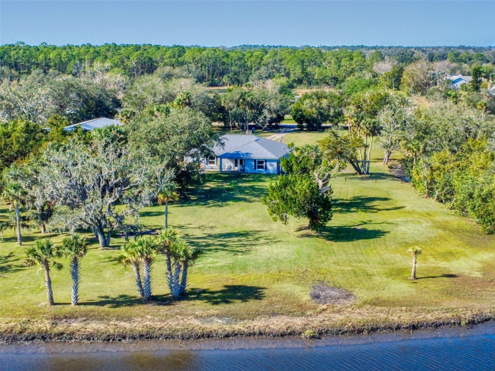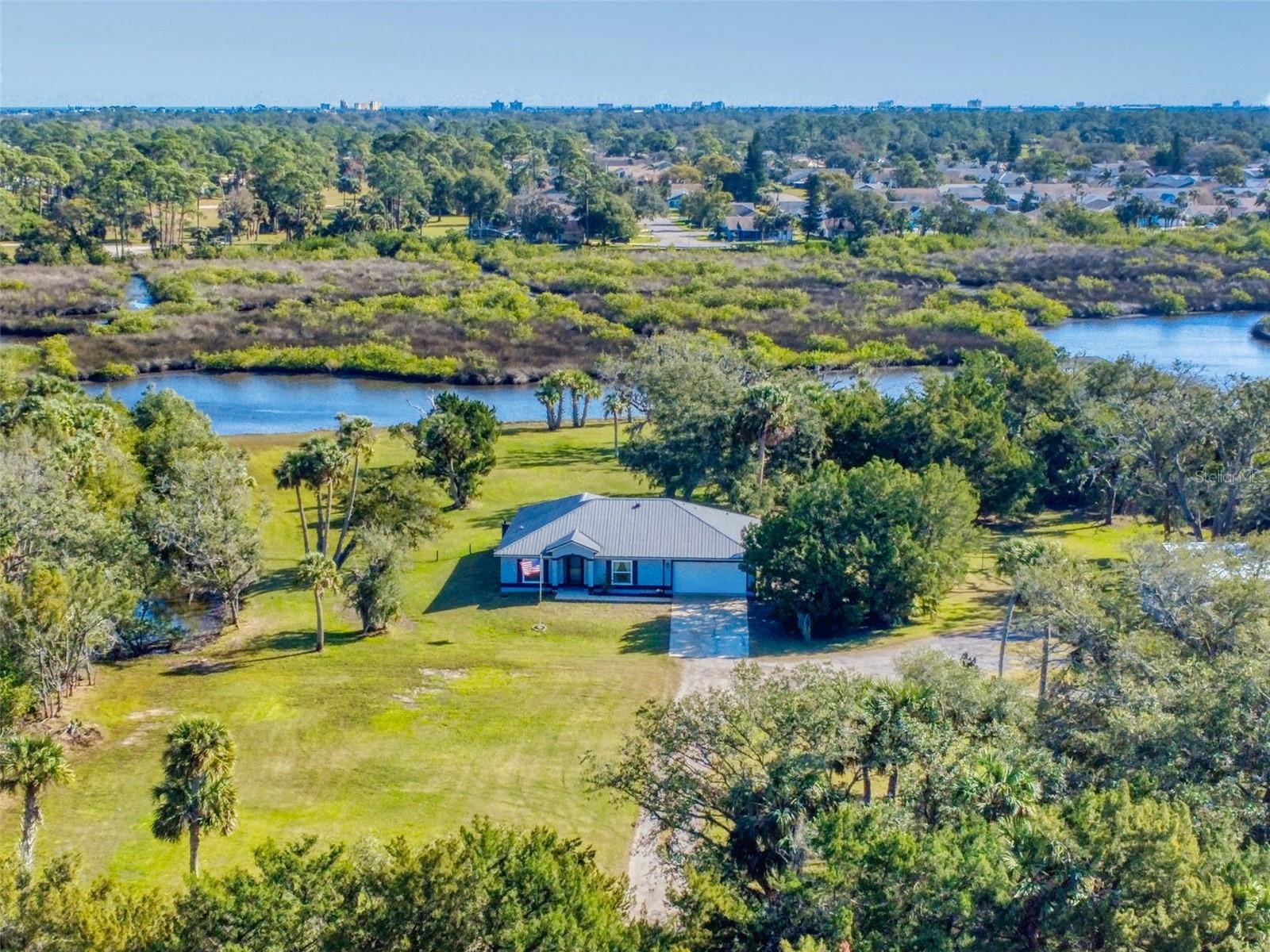 Private Waterfront Paradise – Welcome Home to 977 Bay Drive, New Smyrna Beach. This rare sprawling homestead offers the perfect combination of serene rural living and modern convenience on over 3 acres of lush, picturesque land along the tranquil Turnbull Creek, which feeds into Turnbull Bay. Designed for those who value peace, privacy, and nature, this eco-friendly concrete block home features a durable metal roof installed in 2019, new windows, and underground electric for efficient, worry-free living. Inside, the home boasts an open floor plan with 3 bedrooms and 2 Baths split-bedroom layout, updated flooring, and modern lighting throughout. The recently refreshed eat-in kitchen offers abundant counter space, generous storage, and thoughtful design updates, while the spacious owner’s suite features a beautifully remodeled en-suite bath and walk-in closet. The property’s amenities make it truly unique. A detached 32x60 workshop and garage, partially insulated and equipped with electric and air conditioning, offers endless possibilities for hobbies, storage, or entertaining. This property includes a separate 1 bedroom 1 bath private in-law suite with a kitchenette providing a perfect space for guests, rental income, or a secluded retreat for a personal gym or studio. The expansive grounds offer panoramic views of Turnbull Creek, where you can enjoy world-class fishing, kayaking, paddle-boarding, or simply relaxing and soaking in the natural beauty from your back porch. Tucked away on a quiet road behind mature foliage, this home provides a perfect sanctuary while remaining conveniently located. Don’t miss this rare chance to own a truly one-of-a-kind property. Schedule your private showing of 977 Bay Drive today!