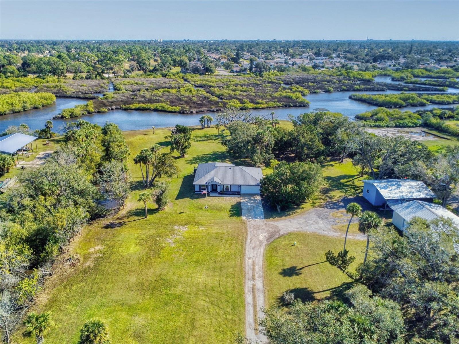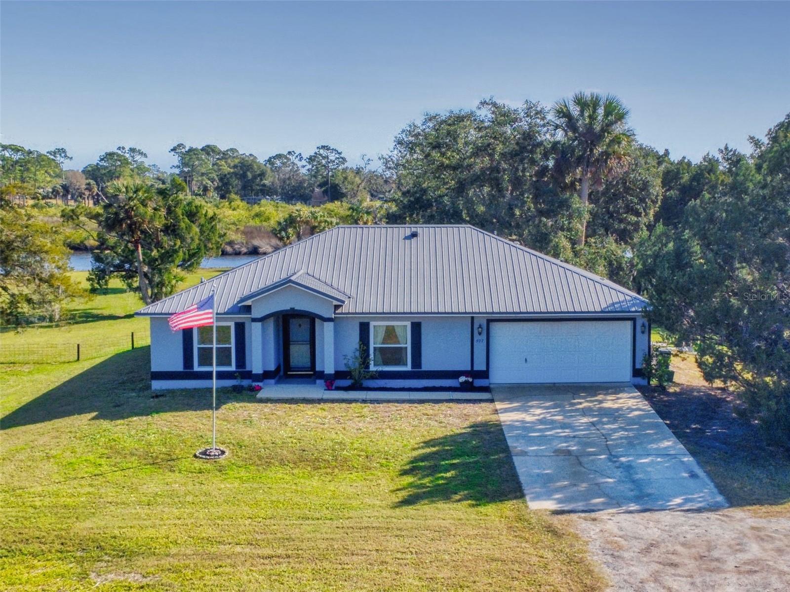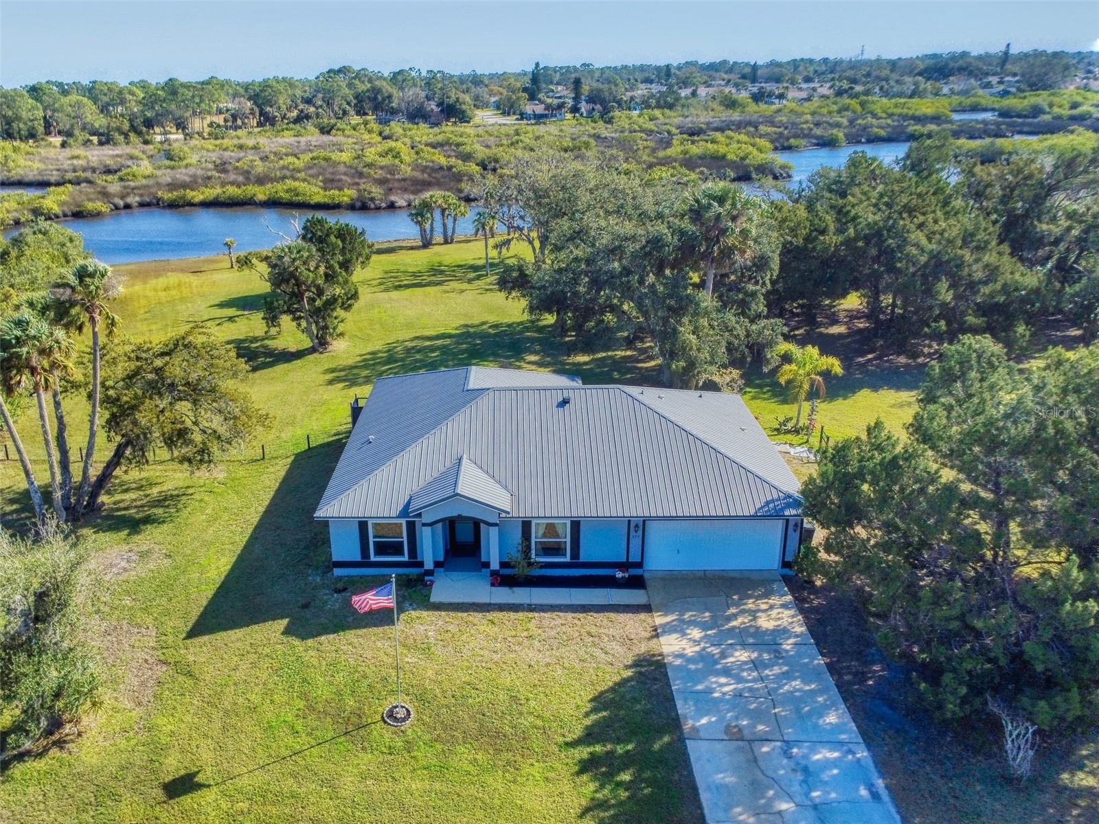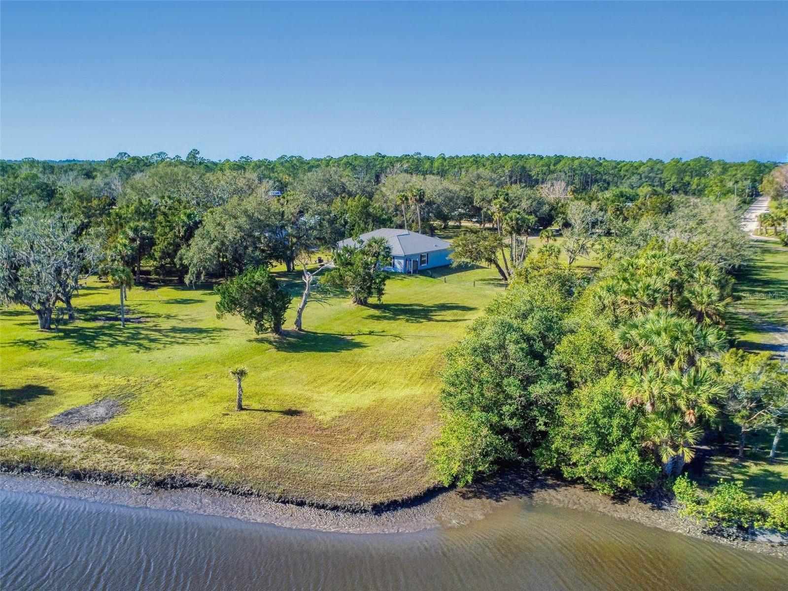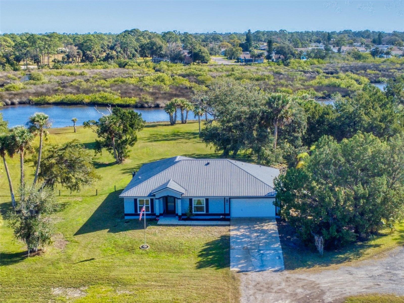 Private Waterfront Paradise – Welcome Home to 977 Bay Drive, New Smyrna Beach. This rare sprawling homestead offers the perfect combination of serene rural living and modern convenience on over 3 acres of lush, picturesque land along the tranquil Turnbull Creek, which feeds into Turnbull Bay. Designed for those who value peace, privacy, and nature, this eco-friendly concrete block home features a durable metal roof installed in 2019, new windows, and underground electric for efficient, worry-free living. Inside, the home boasts an open floor plan with 3 bedrooms and 2 Baths split-bedroom layout, updated flooring, and modern lighting throughout. The recently refreshed eat-in kitchen offers abundant counter space, generous storage, and thoughtful design updates, while the spacious owner’s suite features a beautifully remodeled en-suite bath and walk-in closet. The property’s amenities make it truly unique. A detached 32x60 workshop and garage, partially insulated and equipped with electric and air conditioning, offers endless possibilities for hobbies, storage, or entertaining. This property includes a separate 1 bedroom 1 bath private in-law suite with a kitchenette providing a perfect space for guests, rental income, or a secluded retreat for a personal gym or studio. The expansive grounds offer panoramic views of Turnbull Creek, where you can enjoy world-class fishing, kayaking, paddle-boarding, or simply relaxing and soaking in the natural beauty from your back porch. Tucked away on a quiet road behind mature foliage, this home provides a perfect sanctuary while remaining conveniently located. Don’t miss this rare chance to own a truly one-of-a-kind property. Schedule your private showing of 977 Bay Drive today!