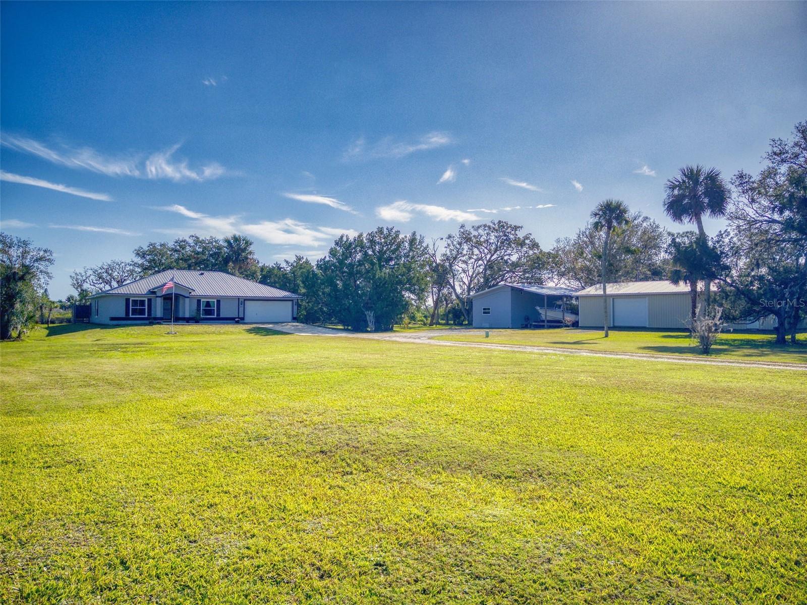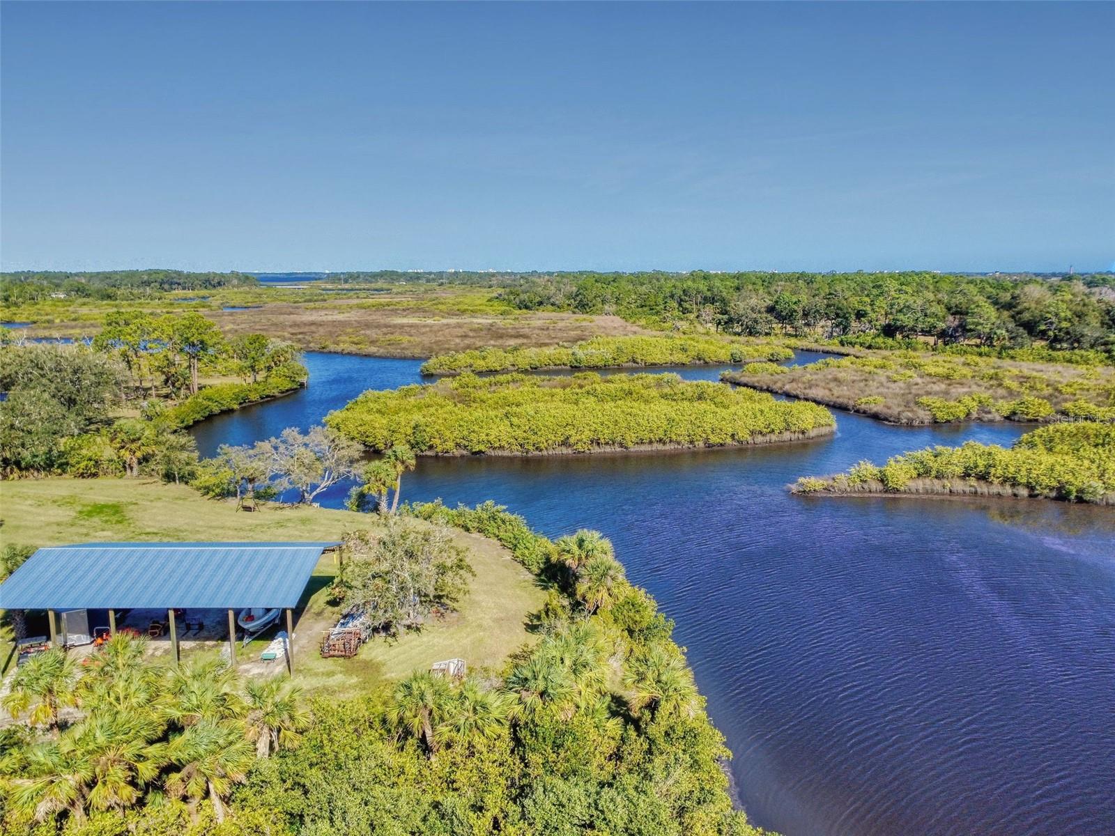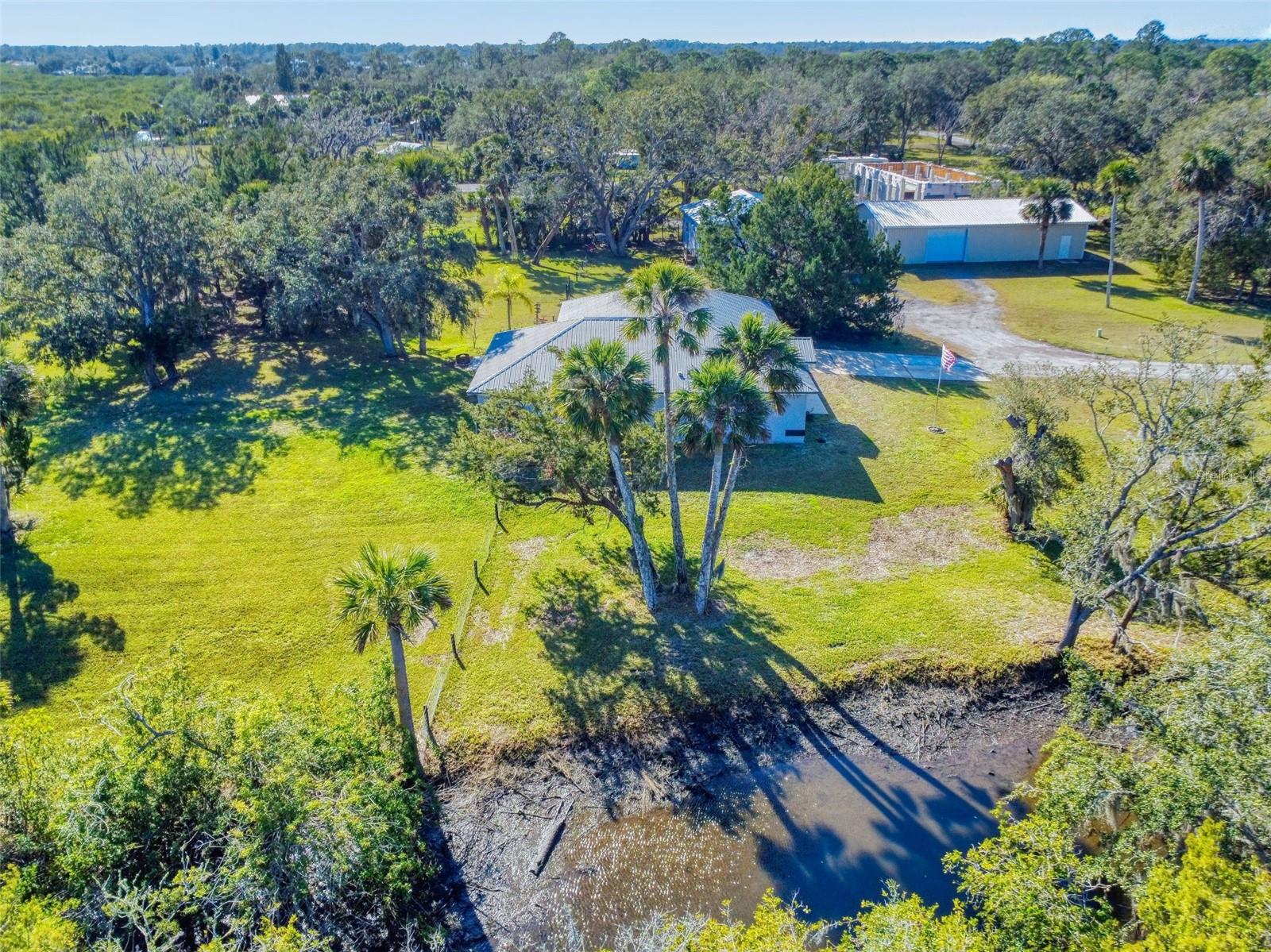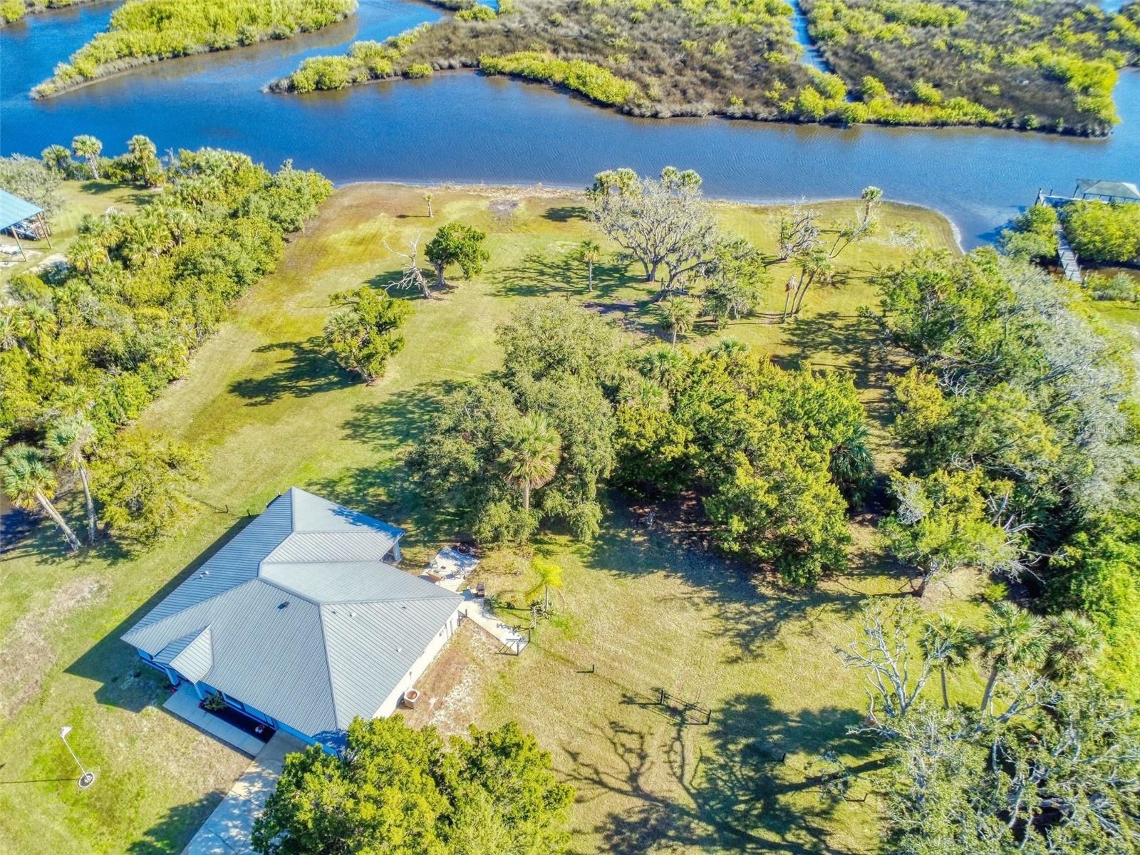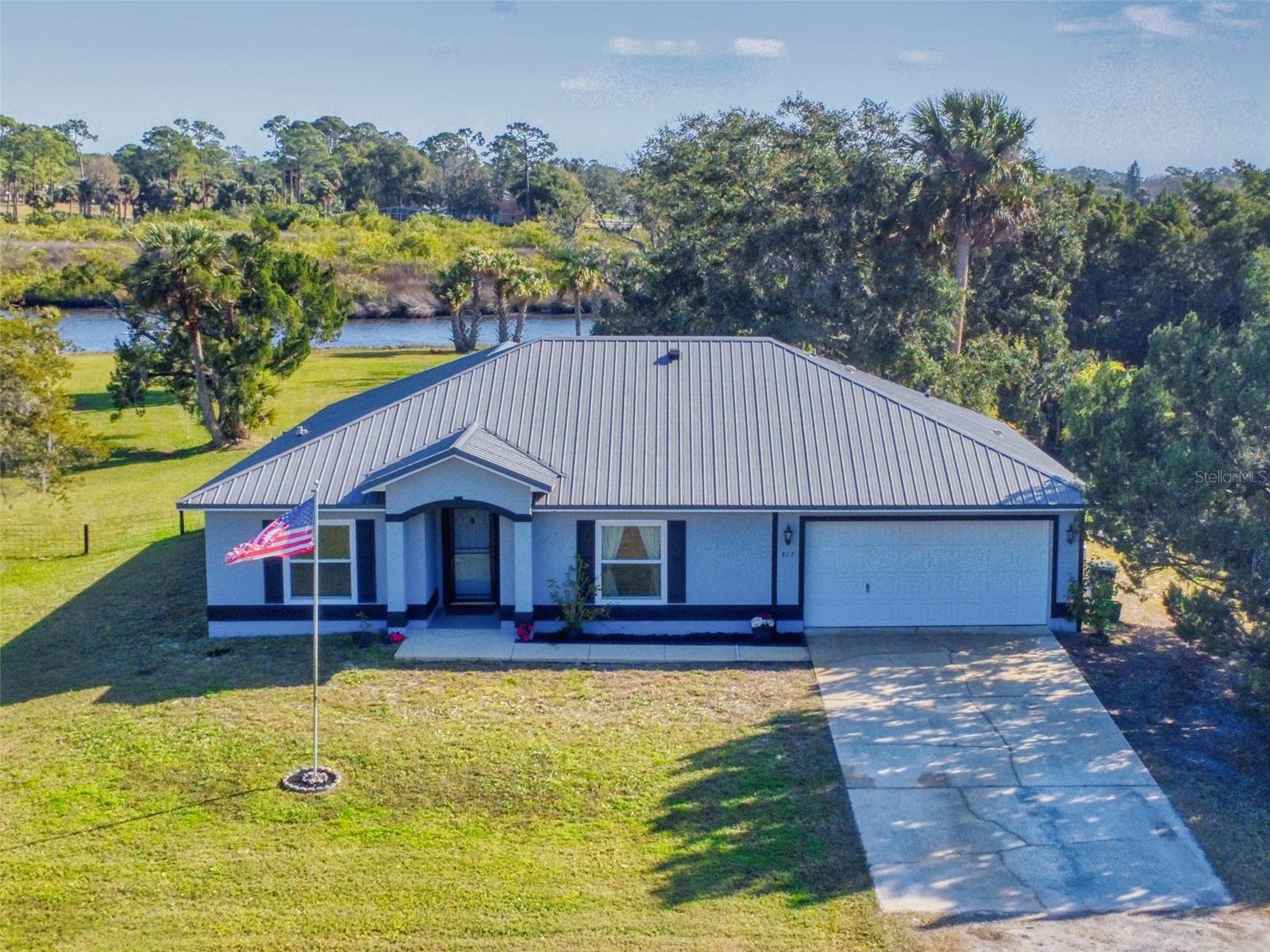 Private Waterfront Paradise – Welcome Home to 977 Bay Drive, New Smyrna Beach. This rare sprawling homestead offers the perfect combination of serene rural living and modern convenience on over 3 acres of lush, picturesque land along the tranquil Turnbull Creek, which feeds into Turnbull Bay. Designed for those who value peace, privacy, and nature, this eco-friendly concrete block home features a durable metal roof installed in 2019, new windows, and underground electric for efficient, worry-free living. Inside, the home boasts an open floor plan with 3 bedrooms and 2 Baths split-bedroom layout, updated flooring, and modern lighting throughout. The recently refreshed eat-in kitchen offers abundant counter space, generous storage, and thoughtful design updates, while the spacious owner’s suite features a beautifully remodeled en-suite bath and walk-in closet. The property’s amenities make it truly unique. A detached 32x60 workshop and garage, partially insulated and equipped with electric and air conditioning, offers endless possibilities for hobbies, storage, or entertaining. This property includes a separate 1 bedroom 1 bath private in-law suite with a kitchenette providing a perfect space for guests, rental income, or a secluded retreat for a personal gym or studio. The expansive grounds offer panoramic views of Turnbull Creek, where you can enjoy world-class fishing, kayaking, paddle-boarding, or simply relaxing and soaking in the natural beauty from your back porch. Tucked away on a quiet road behind mature foliage, this home provides a perfect sanctuary while remaining conveniently located. Don’t miss this rare chance to own a truly one-of-a-kind property. Schedule your private showing of 977 Bay Drive today!