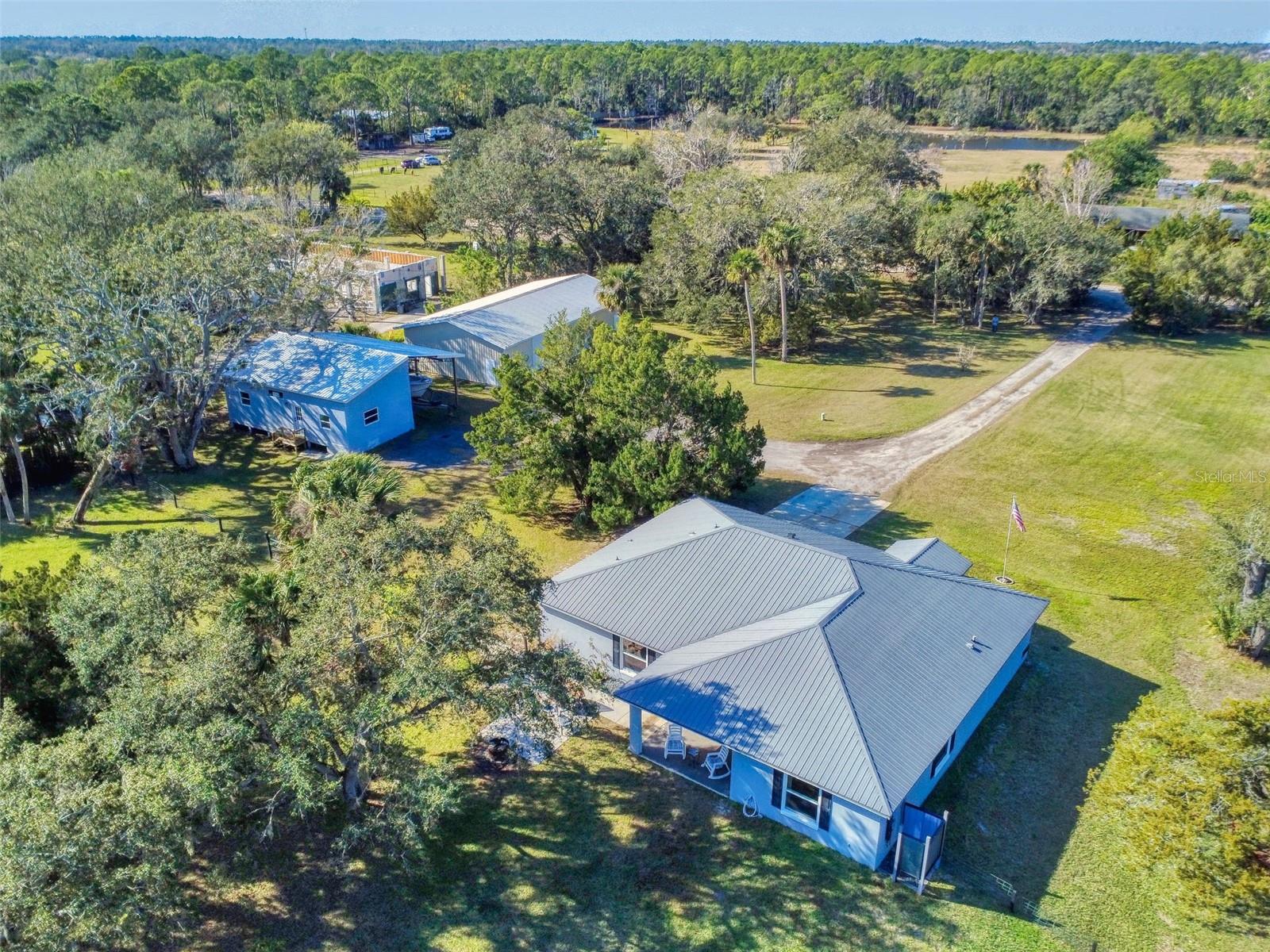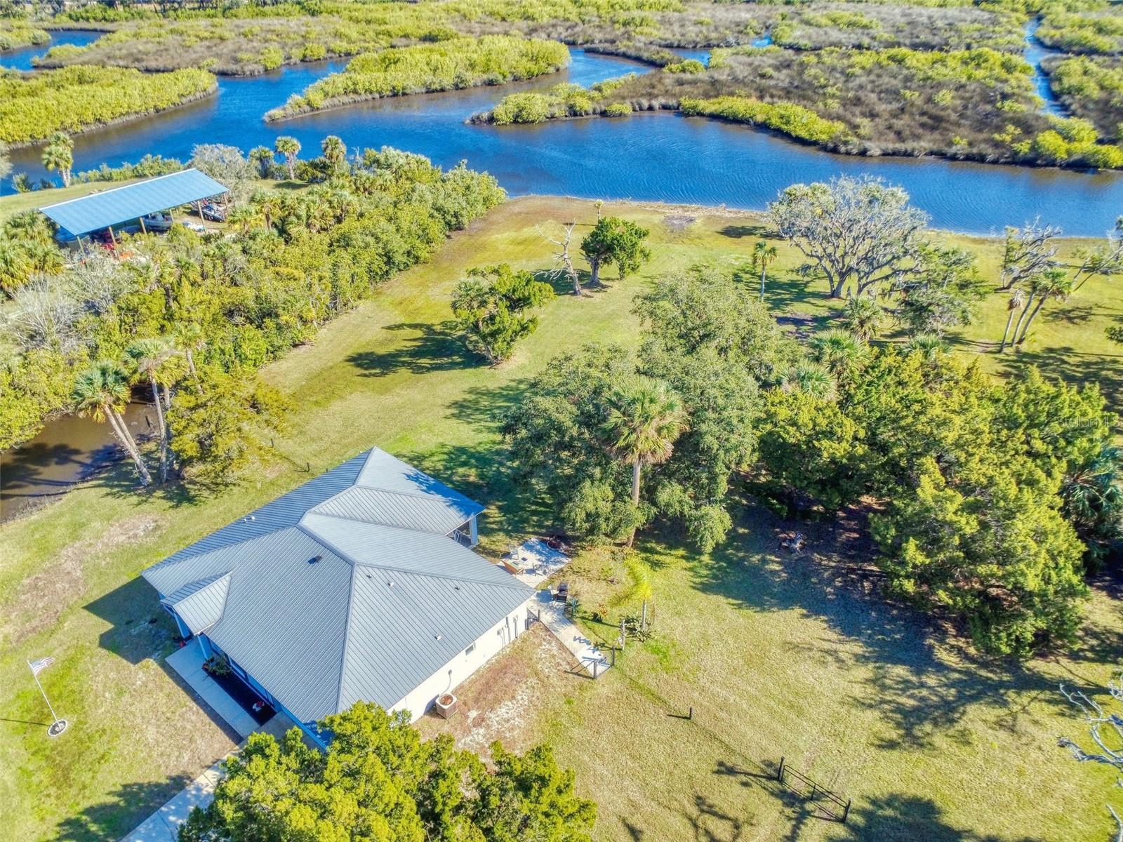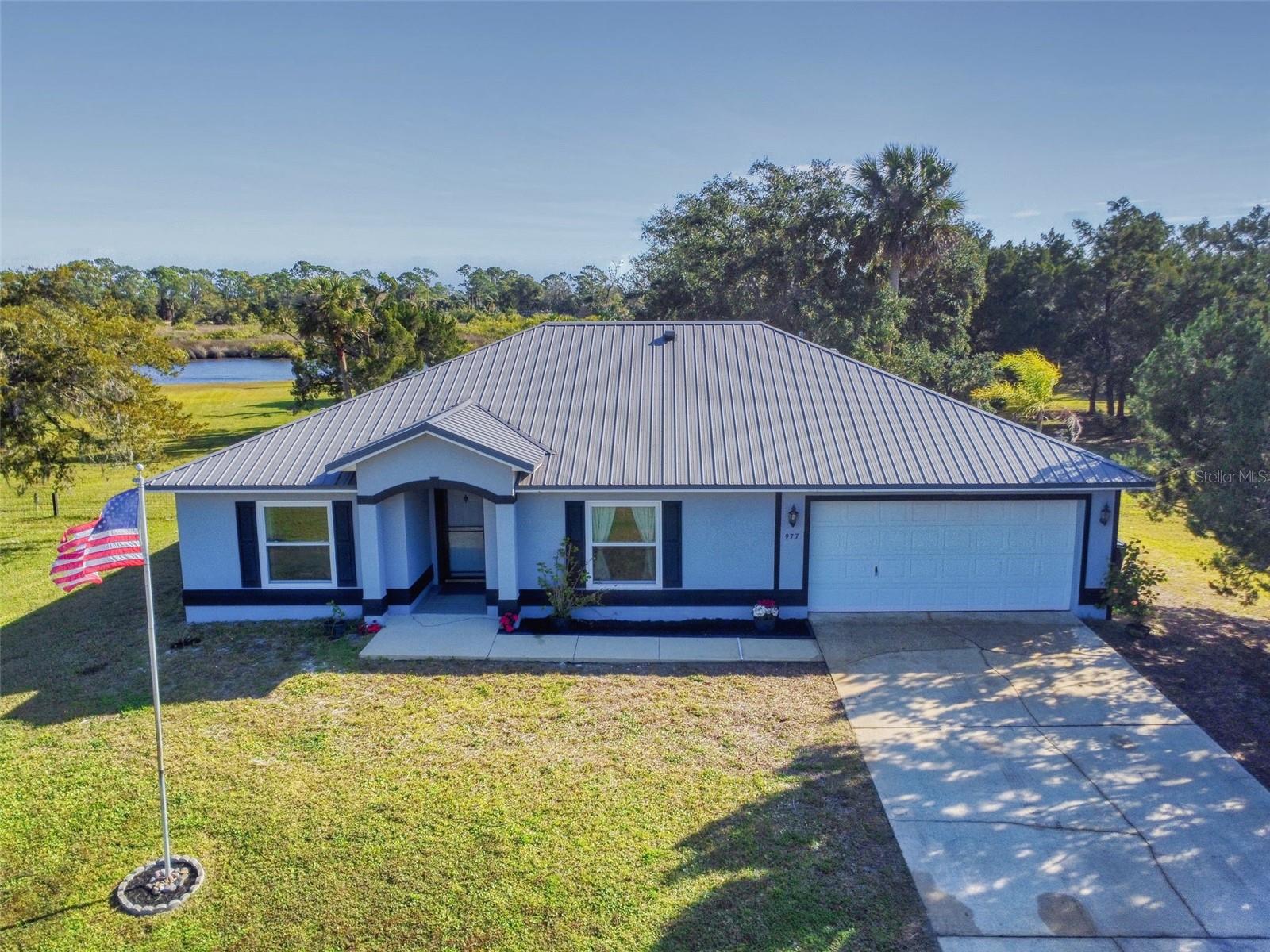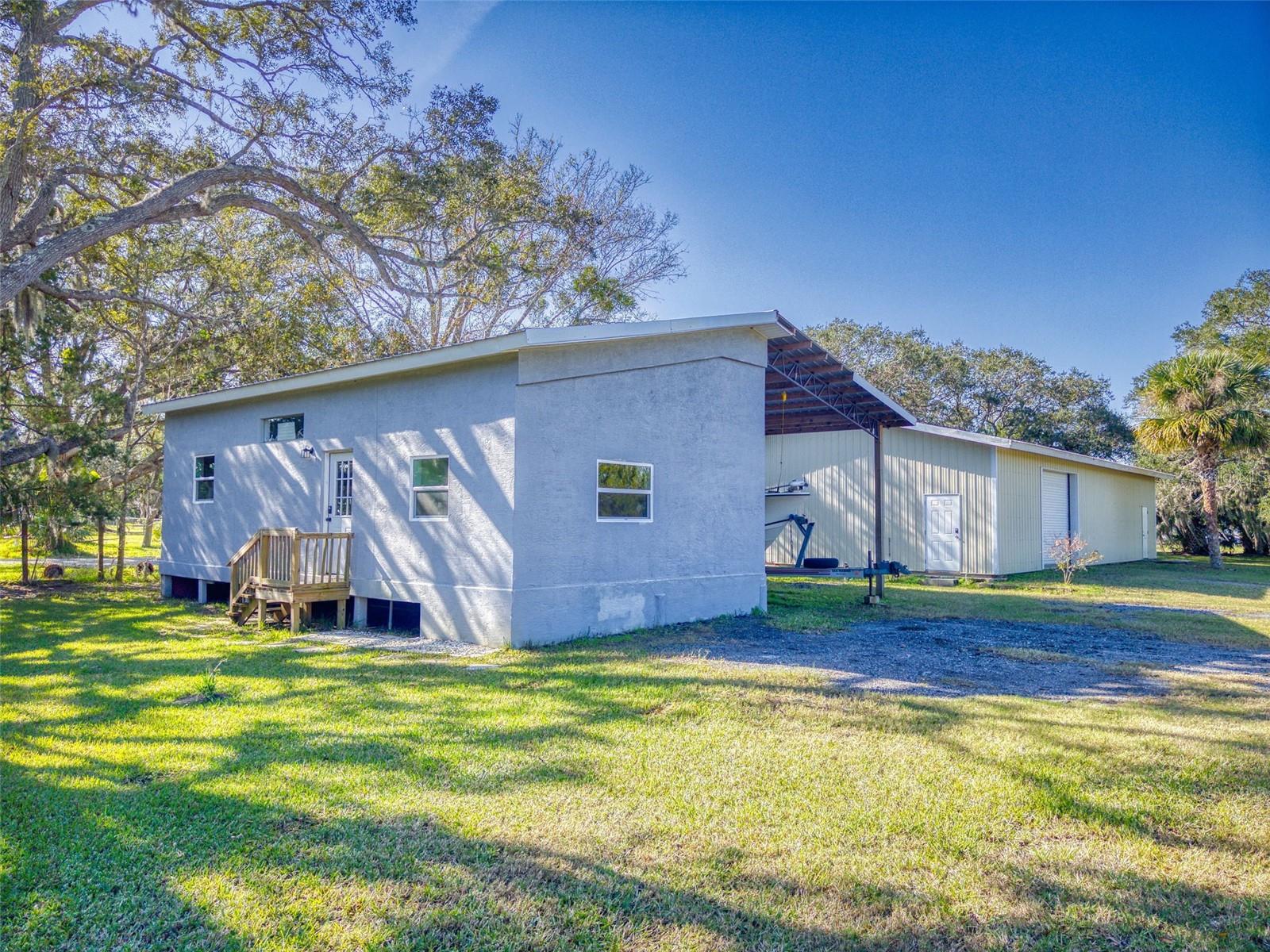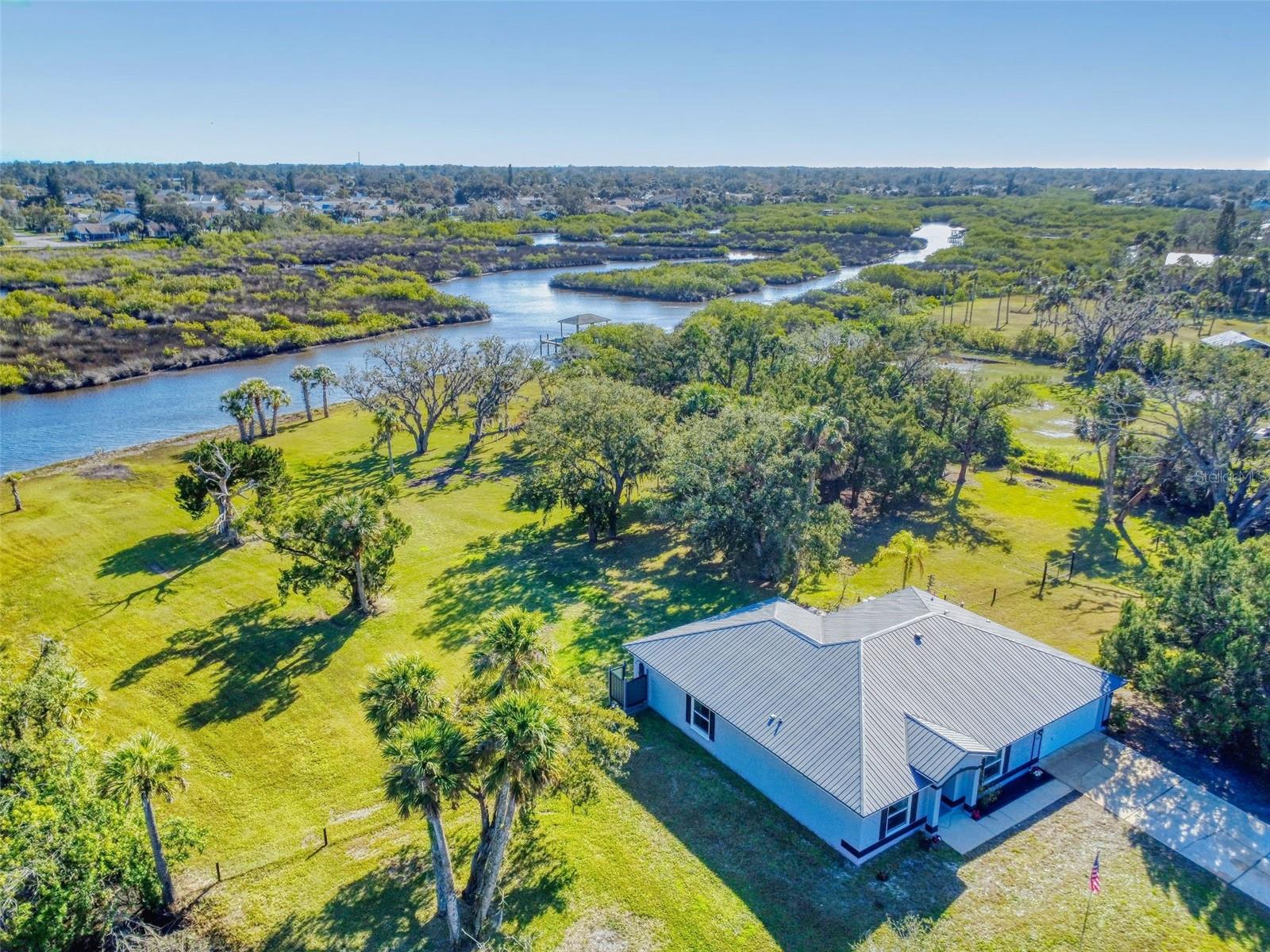Private Waterfront Paradise – Welcome Home to 977 Bay Drive, New Smyrna Beach. This rare sprawling homestead offers the perfect combination of serene rural living and modern convenience on over 3 acres of lush, picturesque land along the tranquil Turnbull Creek, which feeds into Turnbull Bay. Designed for those who value peace, privacy, and nature, this eco-friendly concrete block home features a durable metal roof installed in 2019, new windows, and underground electric for efficient, worry-free living. Inside, the home boasts an open floor plan with 3 bedrooms and 2 Baths split-bedroom layout, updated flooring, and modern lighting throughout. The recently refreshed eat-in kitchen offers abundant counter space, generous storage, and thoughtful design updates, while the spacious owner’s suite features a beautifully remodeled en-suite bath and walk-in closet. The property’s amenities make it truly unique. A detached 32x60 workshop and garage, partially insulated and equipped with electric and air conditioning, offers endless possibilities for hobbies, storage, or entertaining. This property includes a separate 1 bedroom 1 bath private in-law suite with a kitchenette providing a perfect space for guests, rental income, or a secluded retreat for a personal gym or studio. The expansive grounds offer panoramic views of Turnbull Creek, where you can enjoy world-class fishing, kayaking, paddle-boarding, or simply relaxing and soaking in the natural beauty from your back porch. Tucked away on a quiet road behind mature foliage, this home provides a perfect sanctuary while remaining conveniently located. Don’t miss this rare chance to own a truly one-of-a-kind property. Schedule your private showing of 977 Bay Drive today!