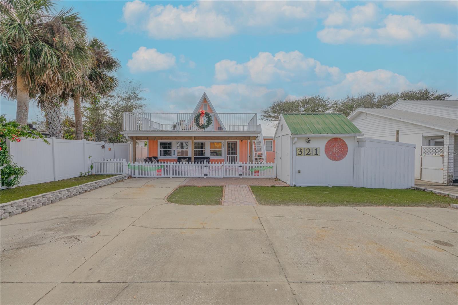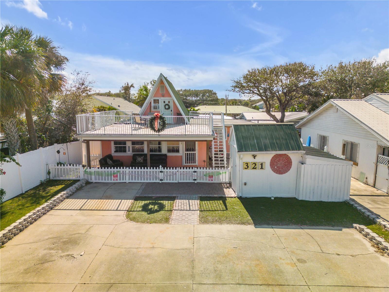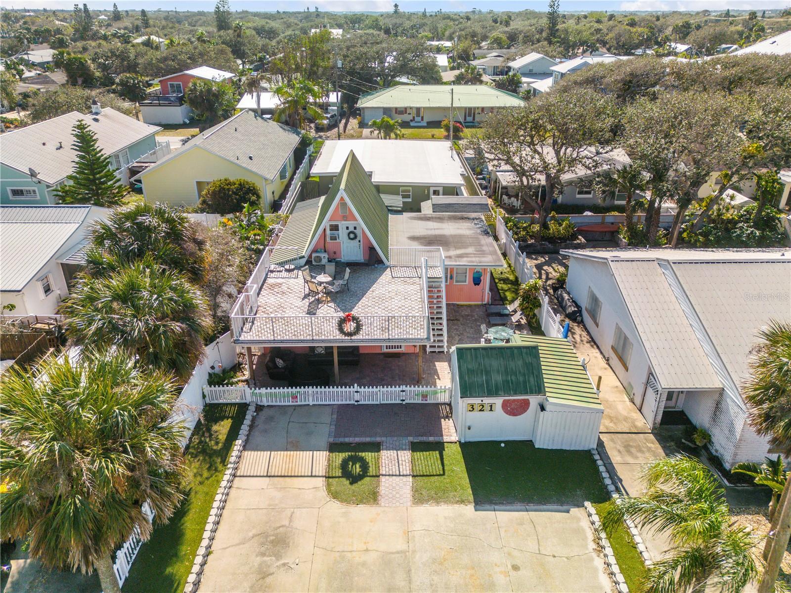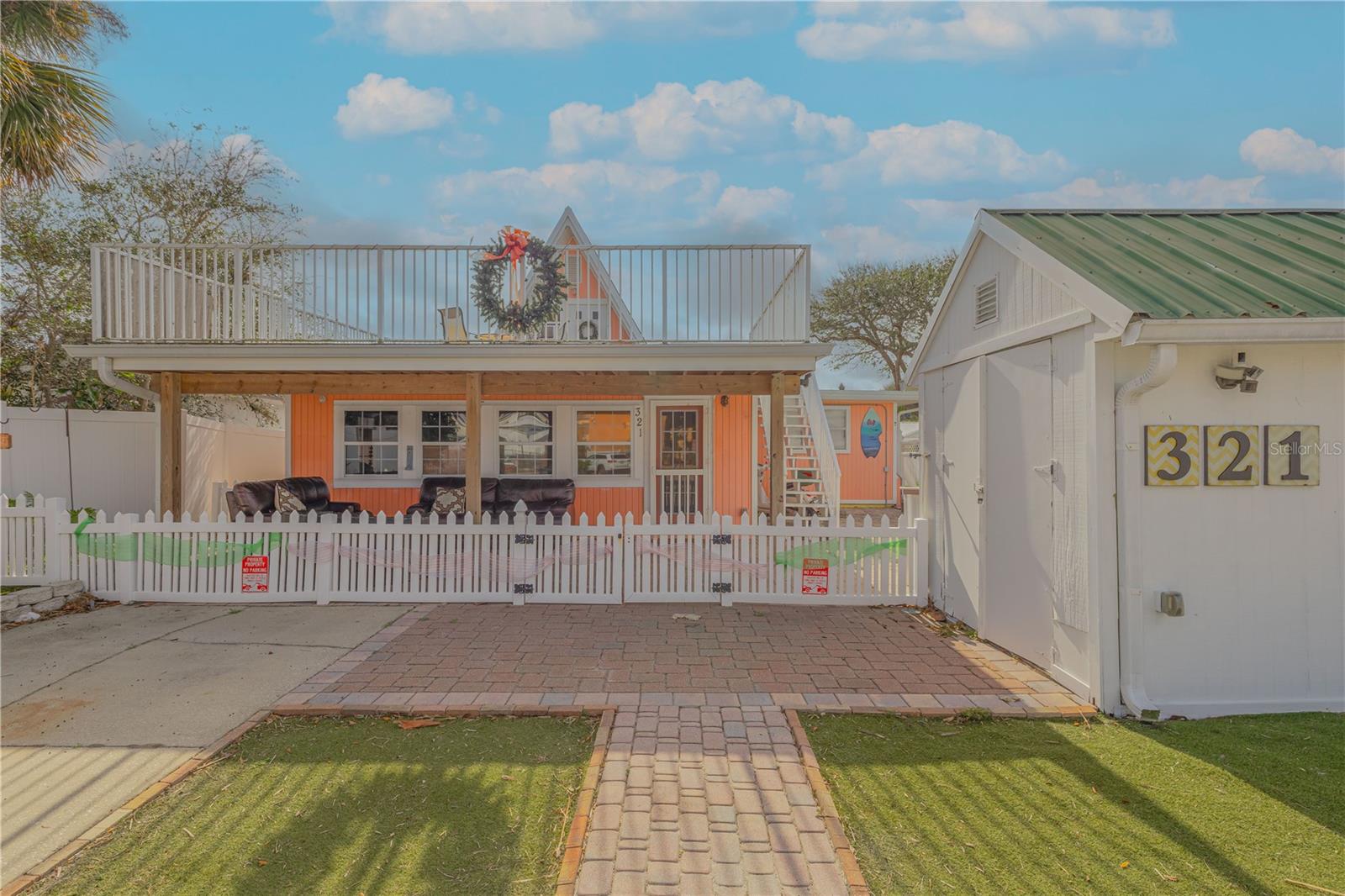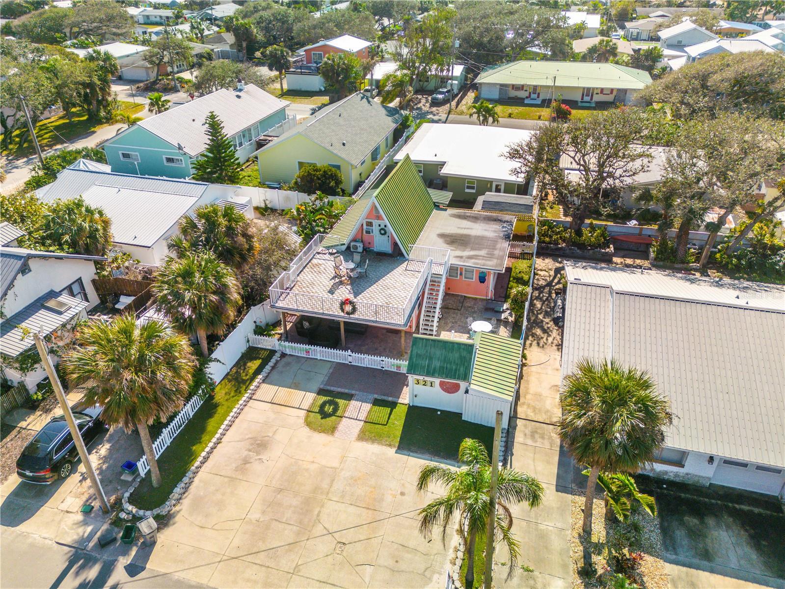 This charming beachside bungalow offers an unbeatable location just steps to the iconic Flagler Avenue shopping district and a short stroll to the sandy shores of New Smyrna Beach. The property features two separate suites with private entrances, making it a unique and versatile find with rental income potential. The upper suite boasts a spacious teak deck, perfect for soaking in the ocean breeze. The lower suite includes two bedrooms, one bathroom, a spacious kitchen with a breakfast bar open to the living area creating an open floor plan. Convenient amenities are an outdoor shower with hot and cold water, a stainless steel sink, and a large storage area for beach toys and a golf cart. The pet-friendly, fully fenced yard includes two gated sections, and the property offers ample paved parking for plenty of company. The paved side area and covered front porch provide excellent spaces for entertaining or relaxing with friends and family. If you're looking for a home that embodies the ultimate beach lifestyle, this is a must-see!