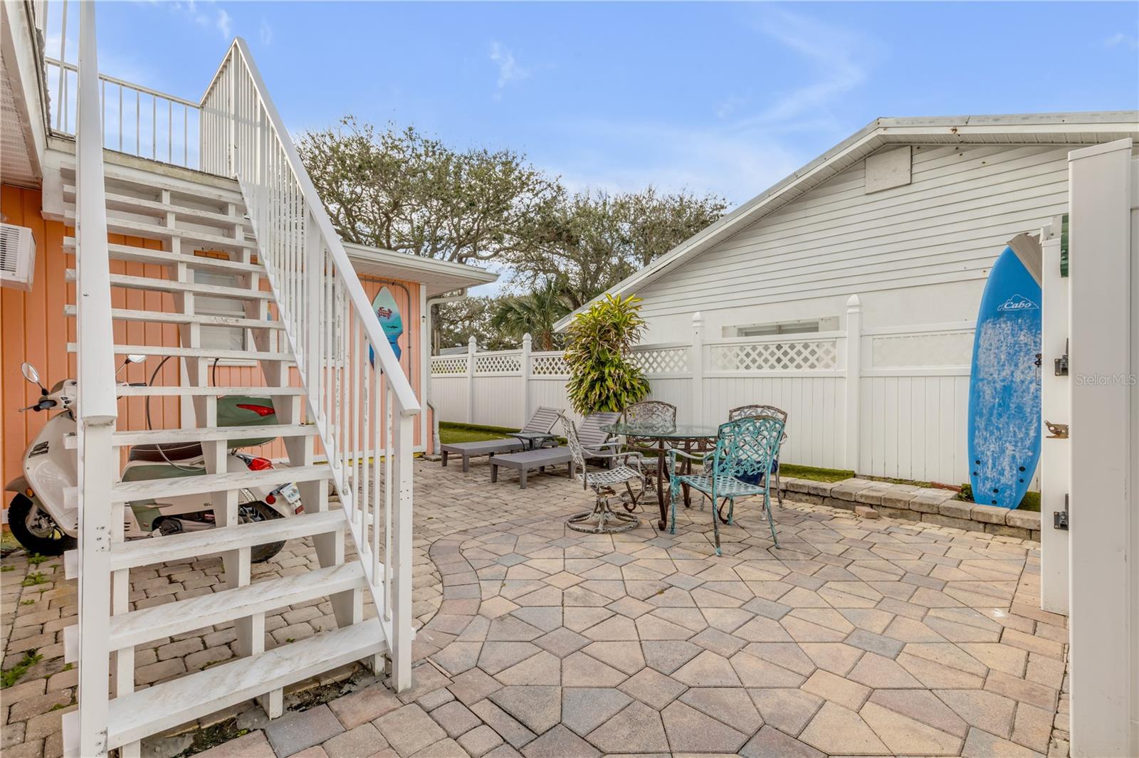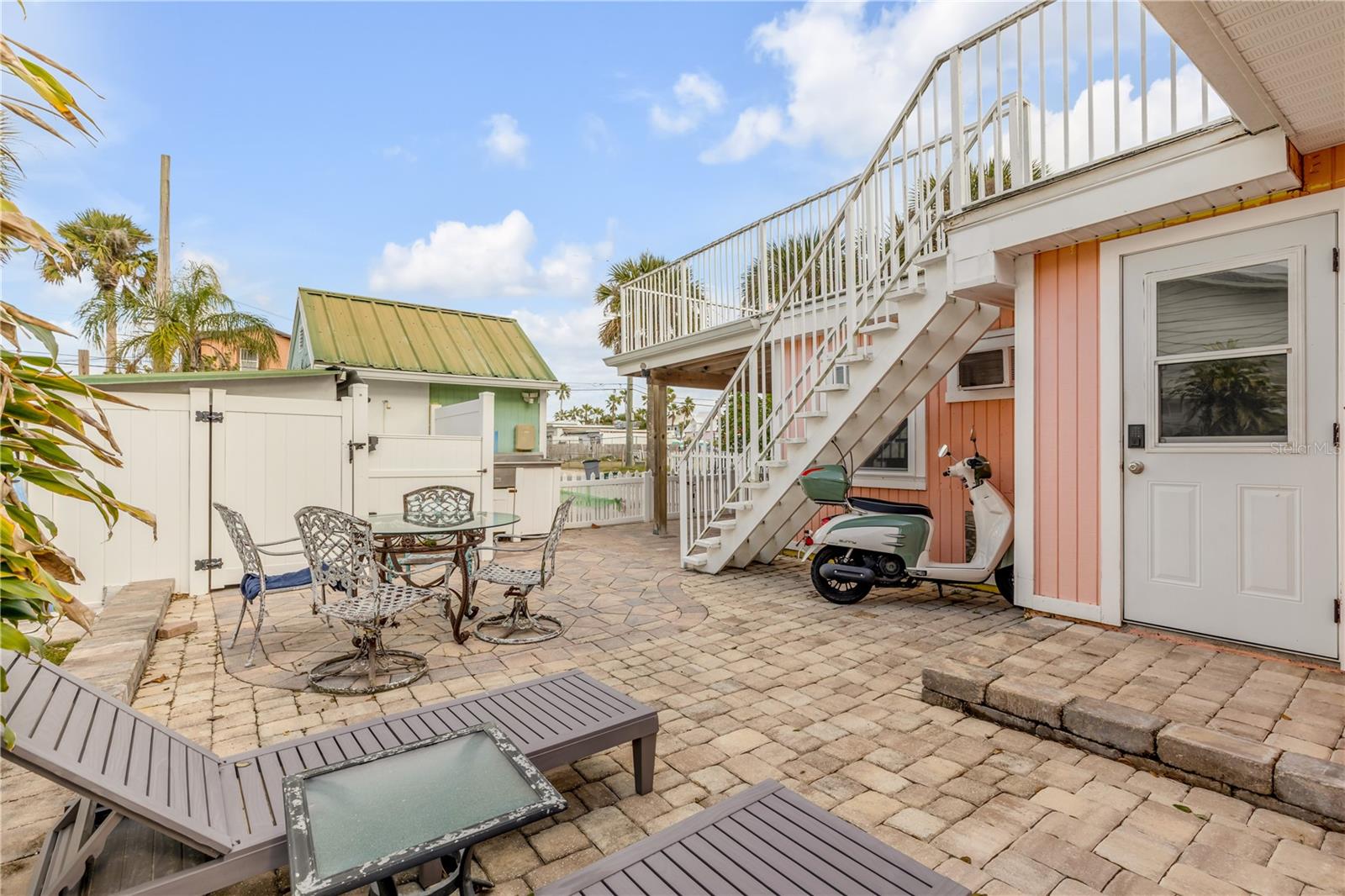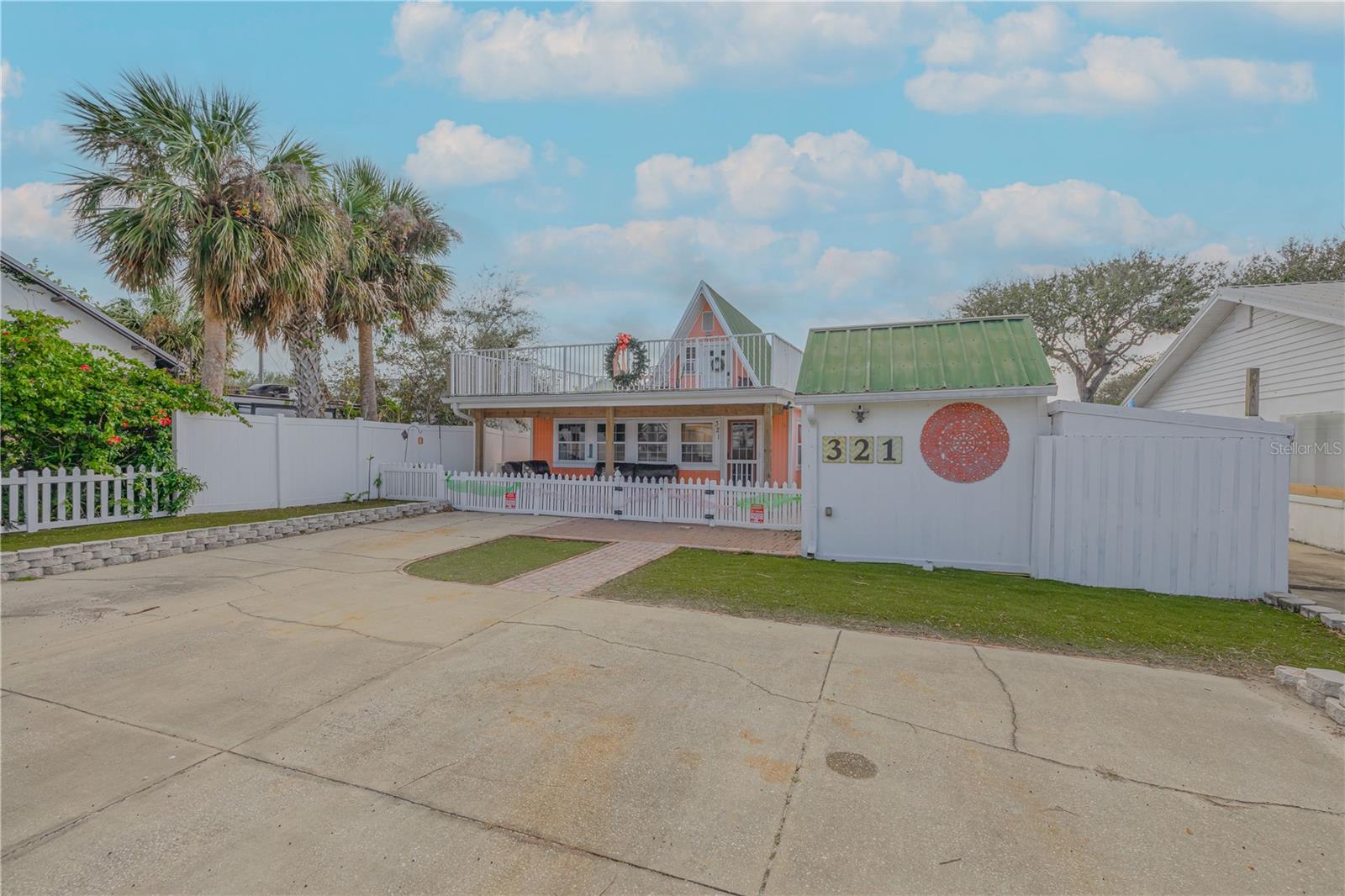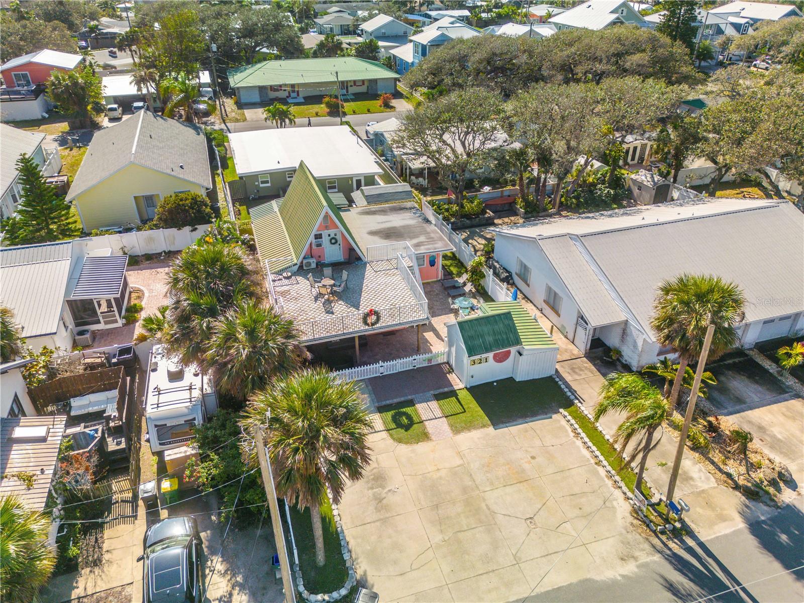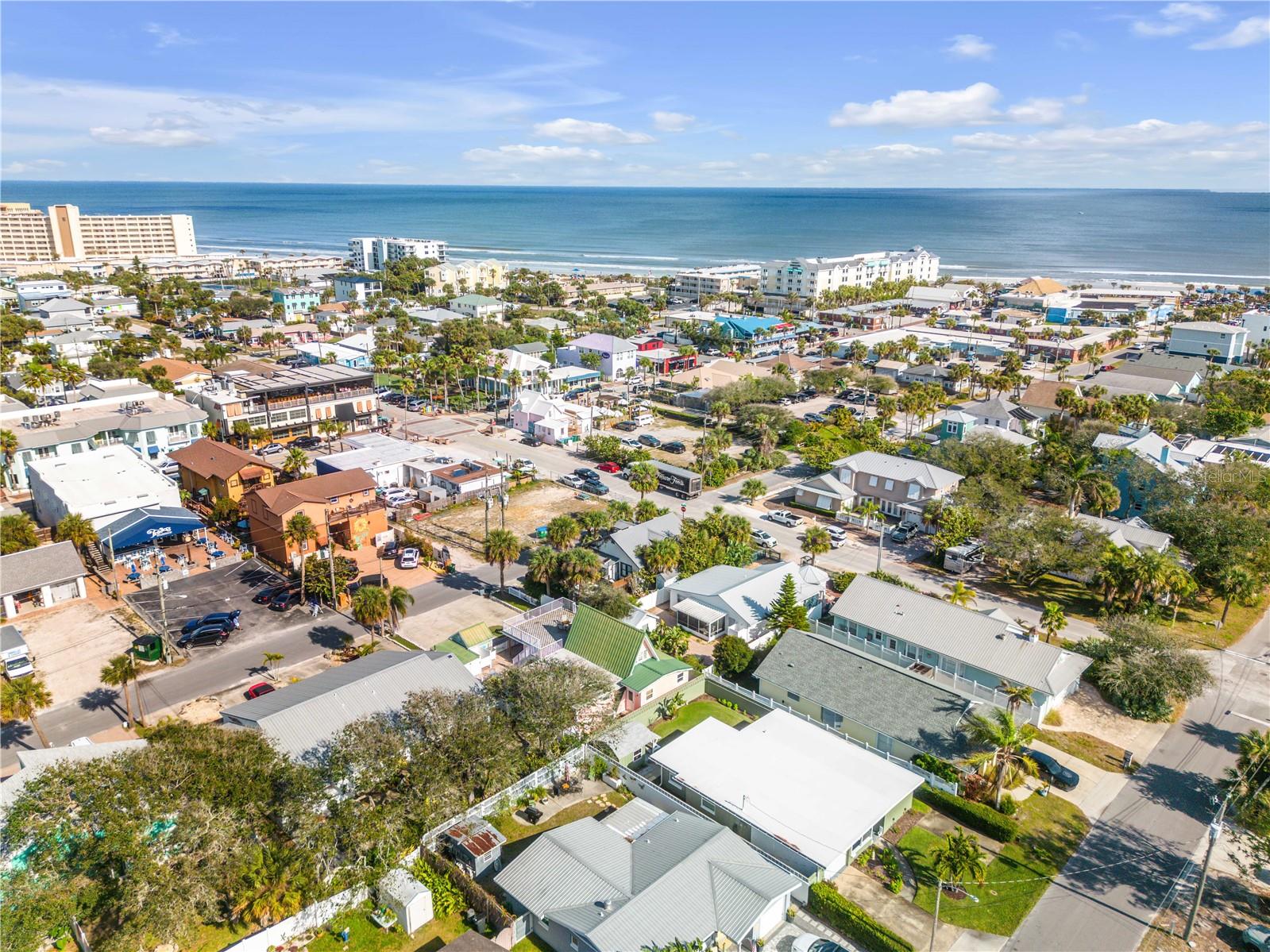 This charming beachside bungalow offers an unbeatable location just steps to the iconic Flagler Avenue shopping district and a short stroll to the sandy shores of New Smyrna Beach. The property features two separate suites with private entrances, making it a unique and versatile find with rental income potential. The upper suite boasts a spacious teak deck, perfect for soaking in the ocean breeze. The lower suite includes two bedrooms, one bathroom, a spacious kitchen with a breakfast bar open to the living area creating an open floor plan. Convenient amenities are an outdoor shower with hot and cold water, a stainless steel sink, and a large storage area for beach toys and a golf cart. The pet-friendly, fully fenced yard includes two gated sections, and the property offers ample paved parking for plenty of company. The paved side area and covered front porch provide excellent spaces for entertaining or relaxing with friends and family. If you're looking for a home that embodies the ultimate beach lifestyle, this is a must-see!
