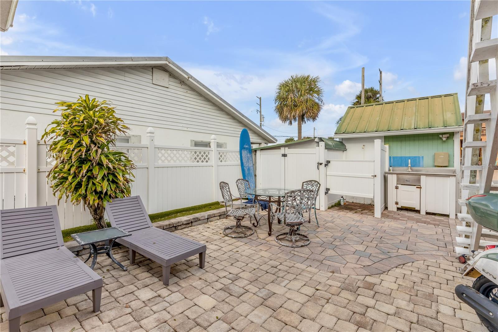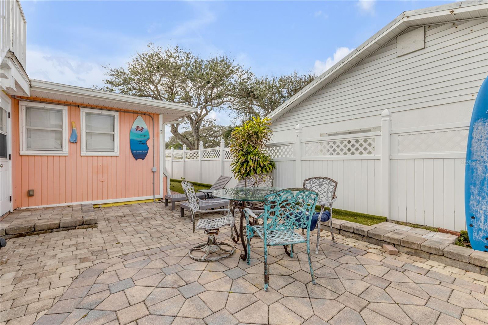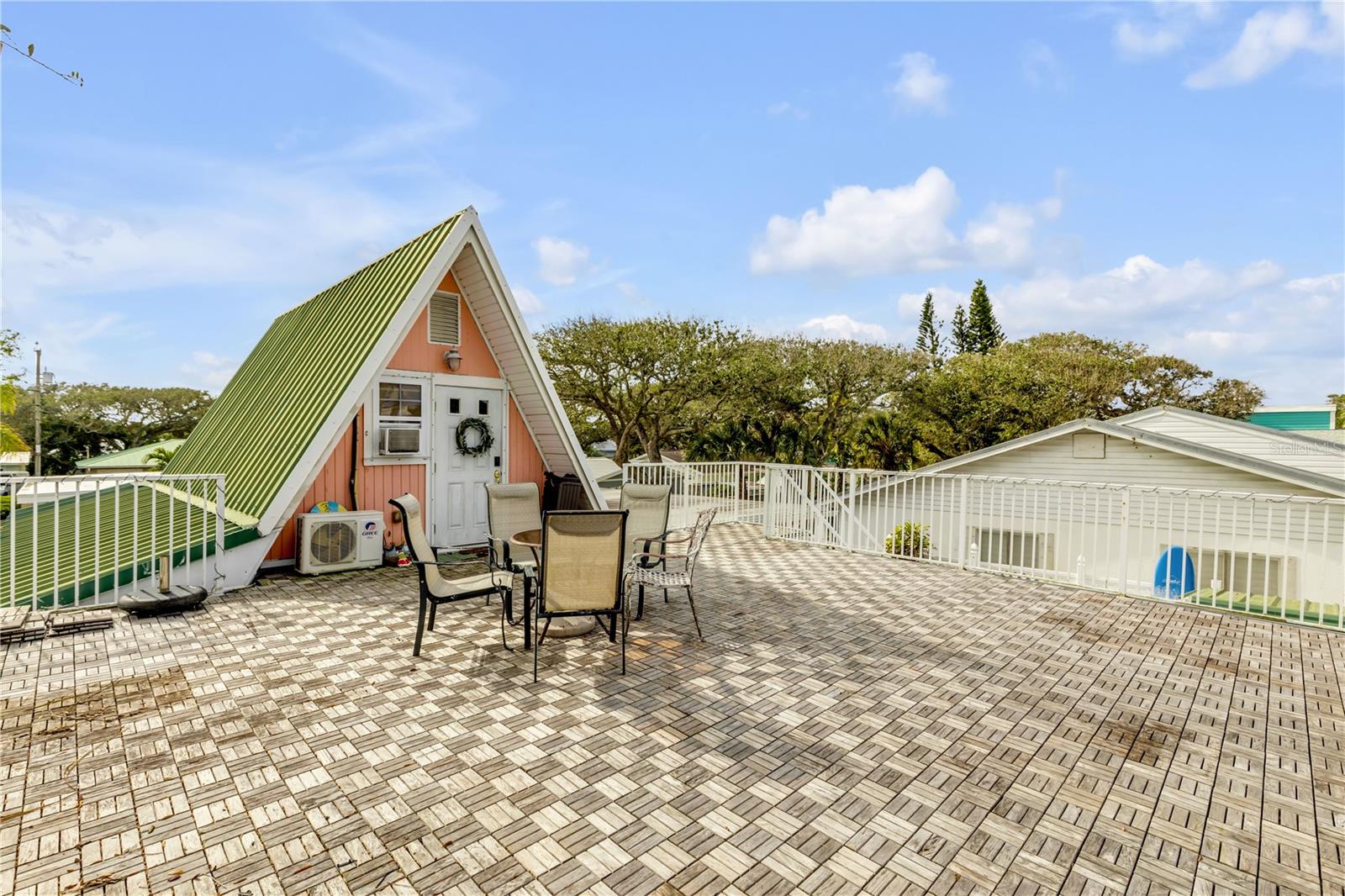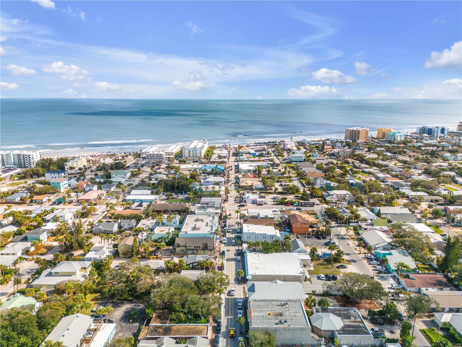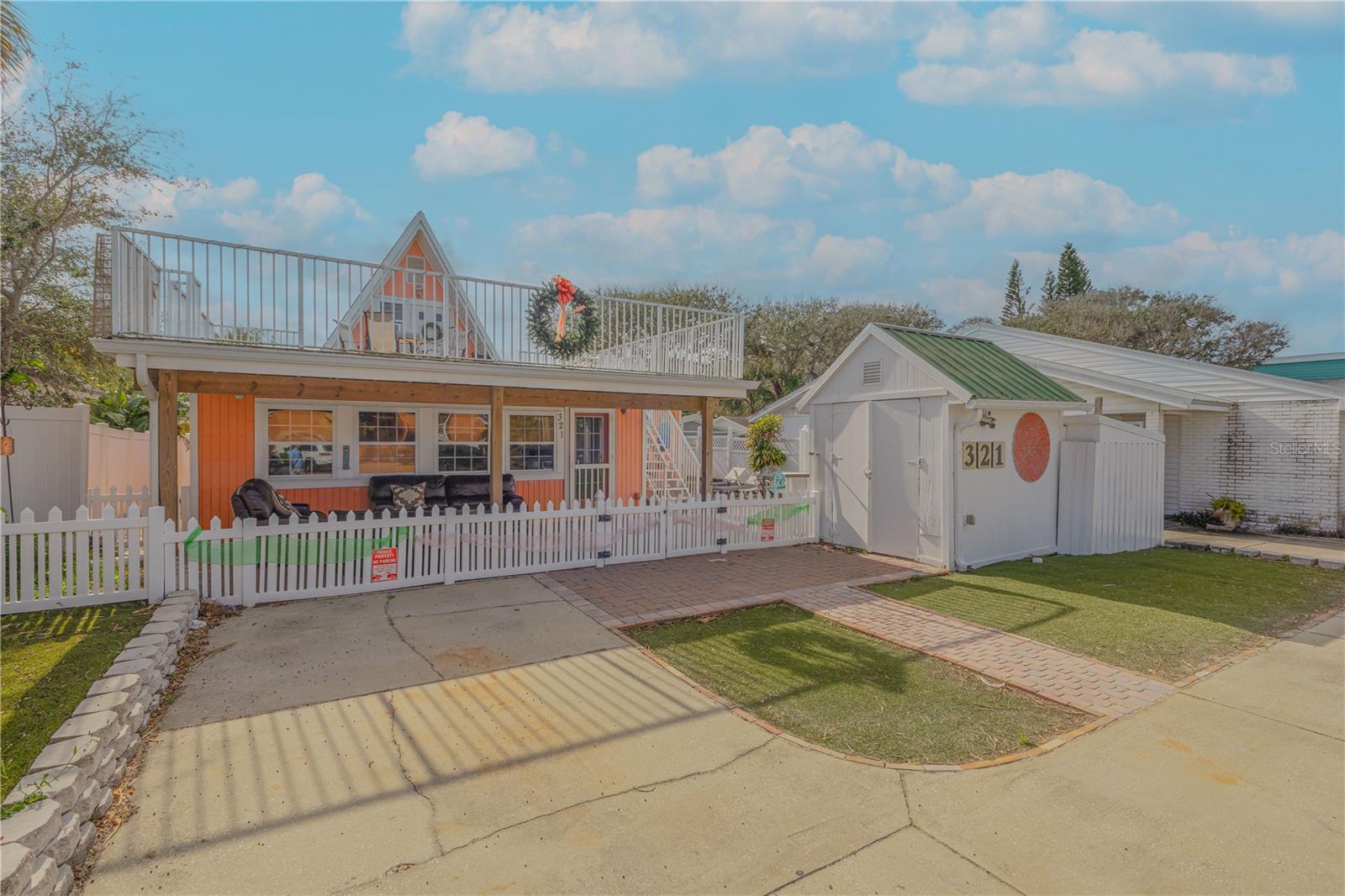 This charming beachside bungalow offers an unbeatable location just steps to the iconic Flagler Avenue shopping district and a short stroll to the sandy shores of New Smyrna Beach. The property features two separate suites with private entrances, making it a unique and versatile find with rental income potential. The upper suite boasts a spacious teak deck, perfect for soaking in the ocean breeze. The lower suite includes two bedrooms, one bathroom, a spacious kitchen with a breakfast bar open to the living area creating an open floor plan. Convenient amenities are an outdoor shower with hot and cold water, a stainless steel sink, and a large storage area for beach toys and a golf cart. The pet-friendly, fully fenced yard includes two gated sections, and the property offers ample paved parking for plenty of company. The paved side area and covered front porch provide excellent spaces for entertaining or relaxing with friends and family. If you're looking for a home that embodies the ultimate beach lifestyle, this is a must-see!