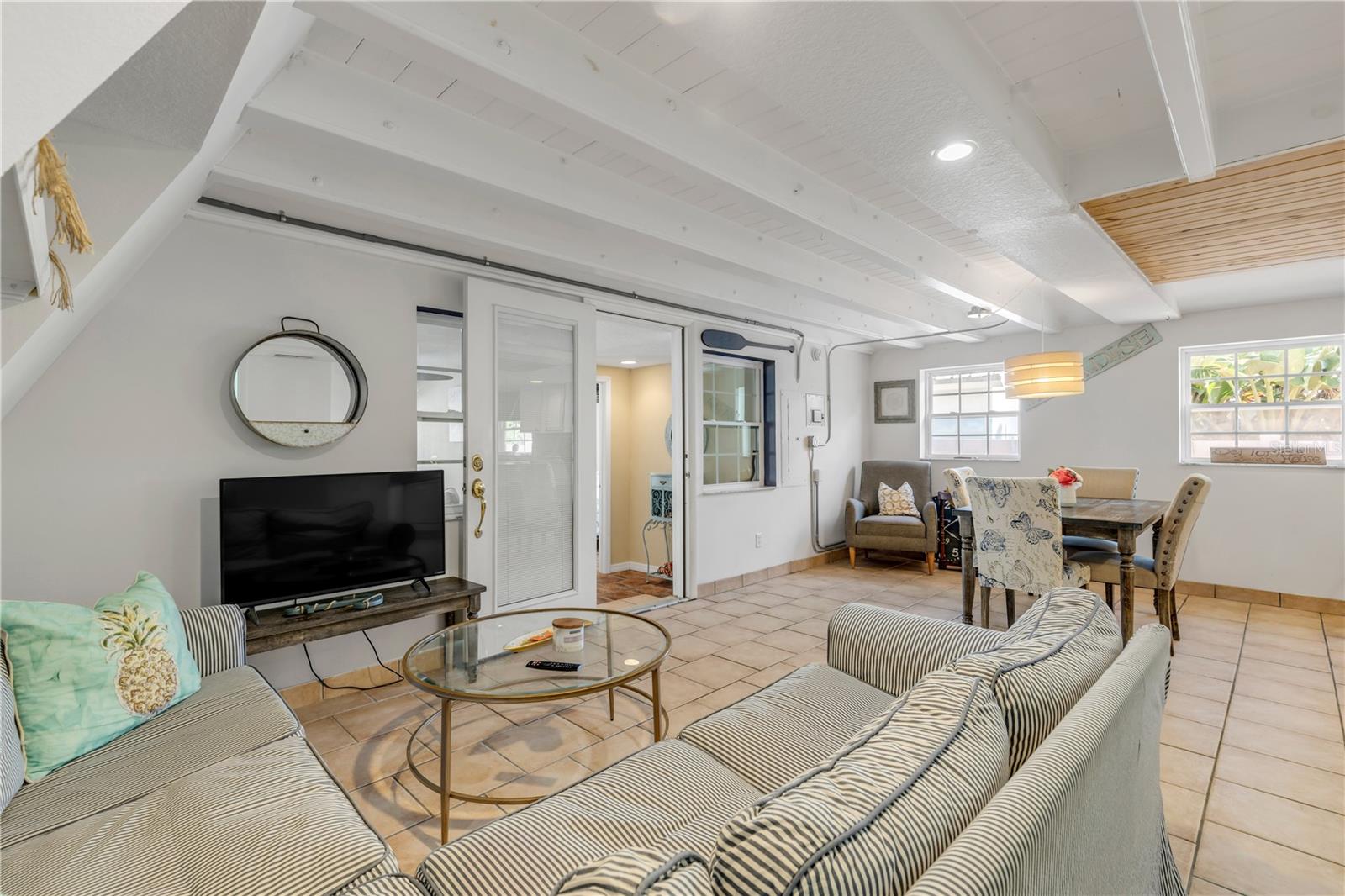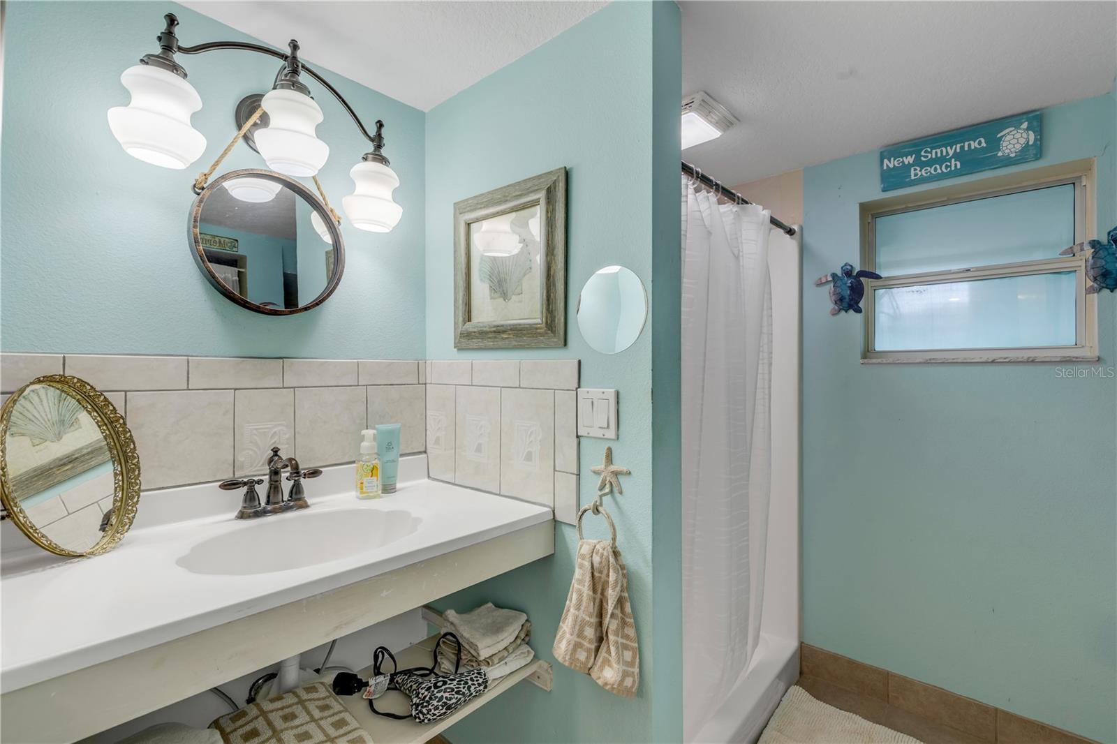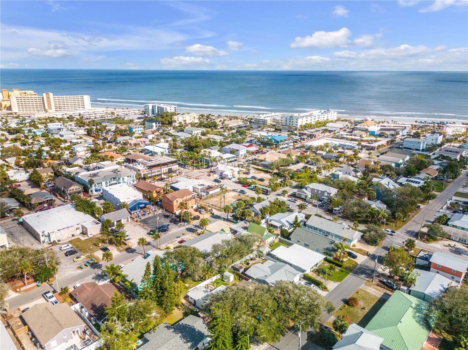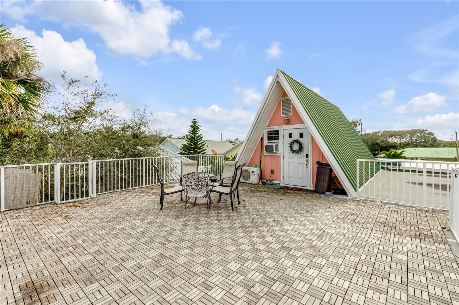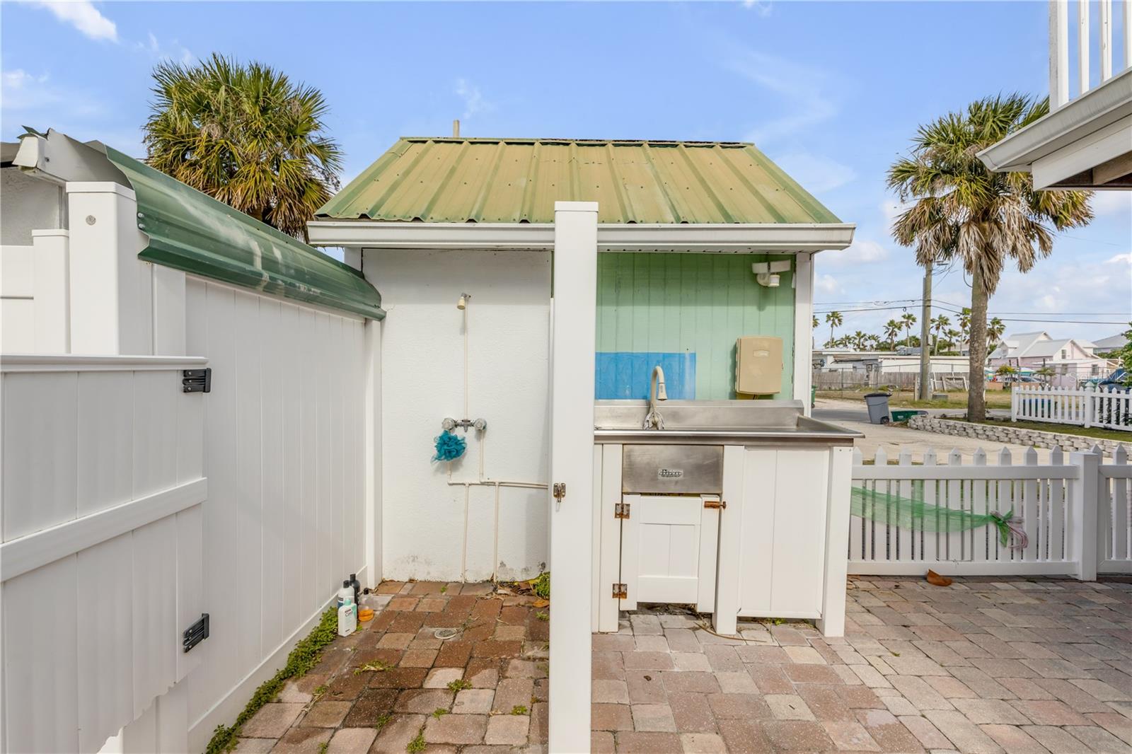 This charming beachside bungalow offers an unbeatable location just steps to the iconic Flagler Avenue shopping district and a short stroll to the sandy shores of New Smyrna Beach. The property features two separate suites with private entrances, making it a unique and versatile find with rental income potential. The upper suite boasts a spacious teak deck, perfect for soaking in the ocean breeze. The lower suite includes two bedrooms, one bathroom, a spacious kitchen with a breakfast bar open to the living area creating an open floor plan. Convenient amenities are an outdoor shower with hot and cold water, a stainless steel sink, and a large storage area for beach toys and a golf cart. The pet-friendly, fully fenced yard includes two gated sections, and the property offers ample paved parking for plenty of company. The paved side area and covered front porch provide excellent spaces for entertaining or relaxing with friends and family. If you're looking for a home that embodies the ultimate beach lifestyle, this is a must-see!