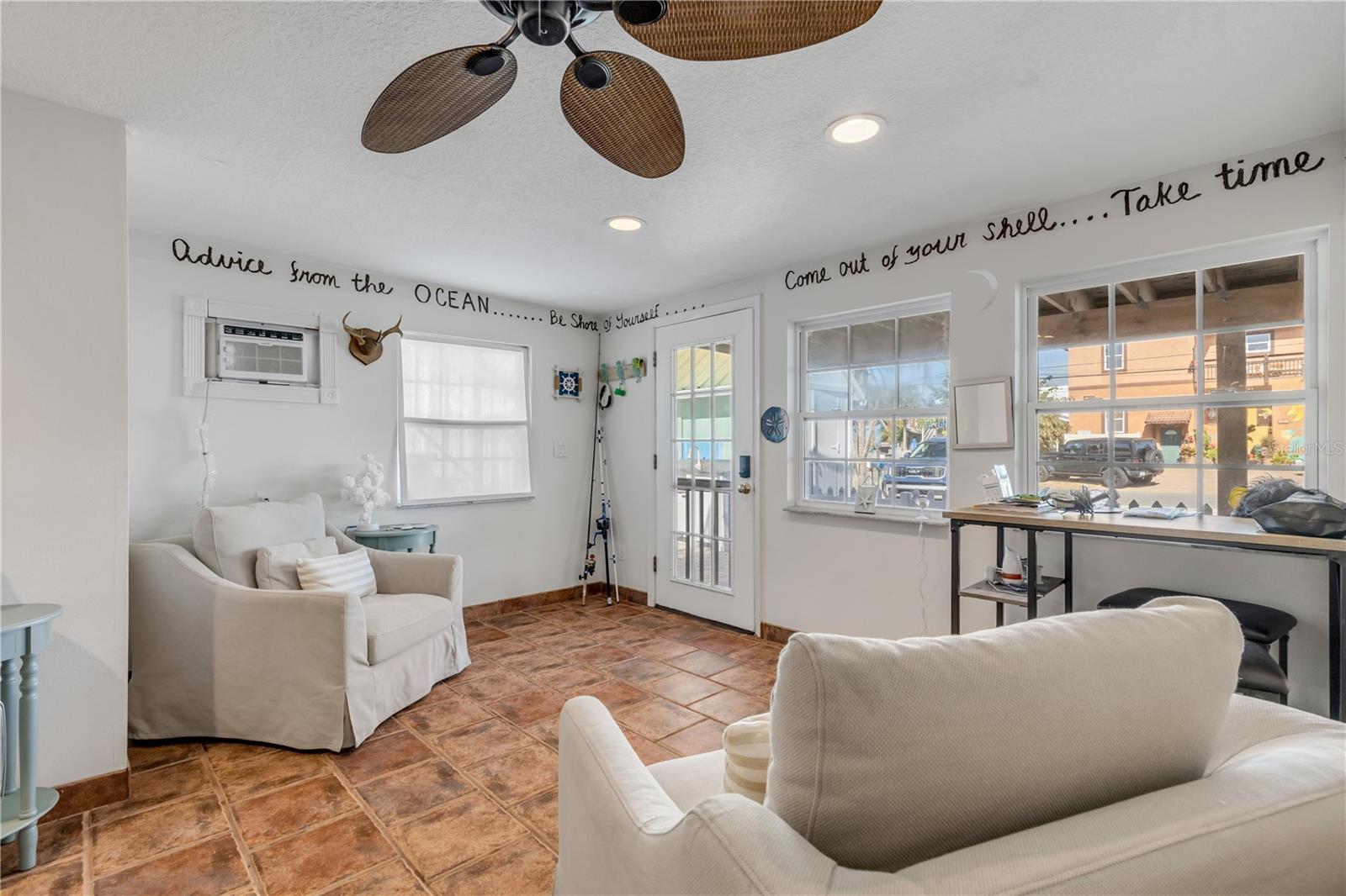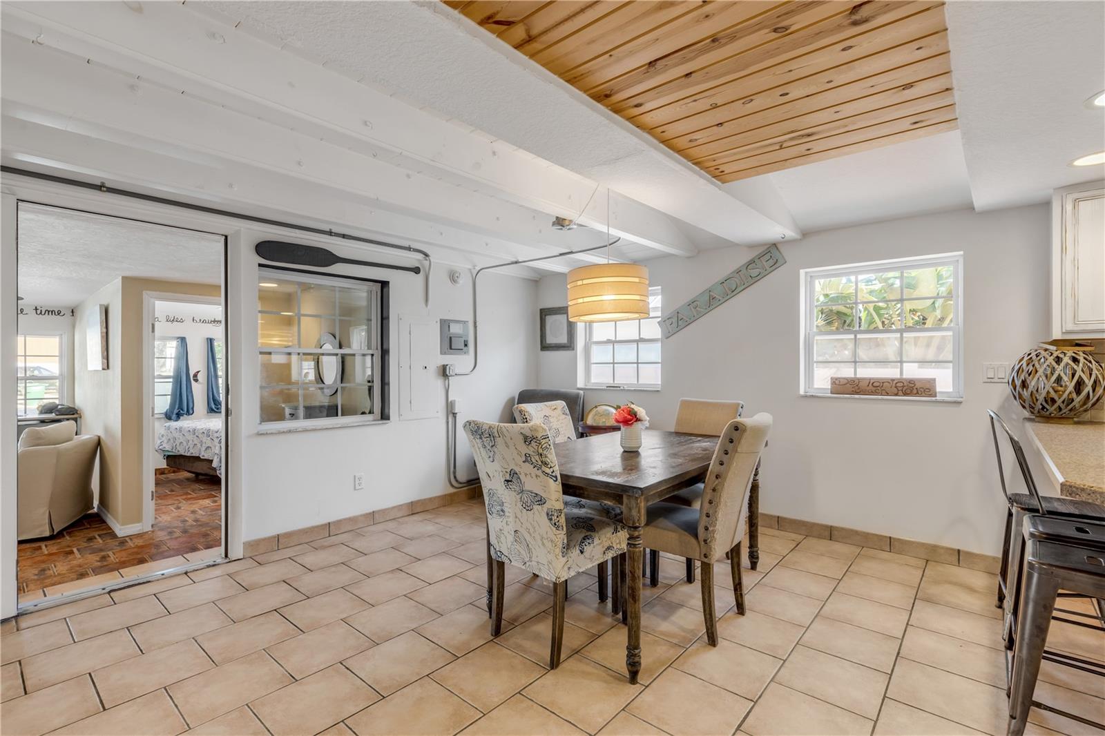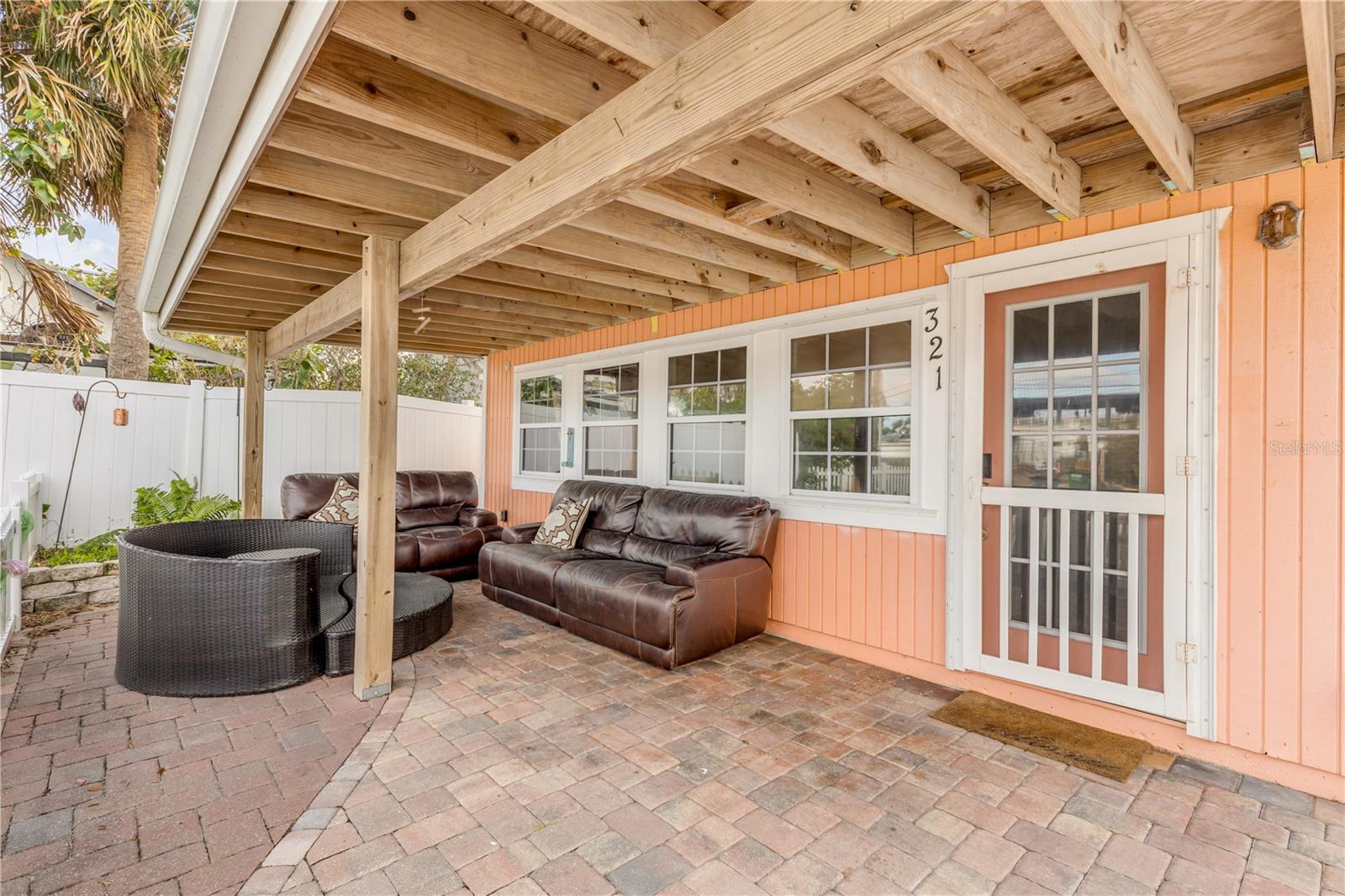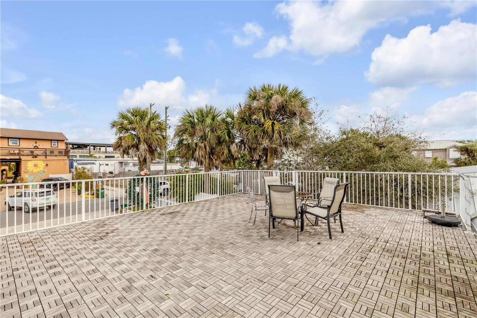 This charming beachside bungalow offers an unbeatable location just steps to the iconic Flagler Avenue shopping district and a short stroll to the sandy shores of New Smyrna Beach. The property features two separate suites with private entrances, making it a unique and versatile find with rental income potential. The upper suite boasts a spacious teak deck, perfect for soaking in the ocean breeze. The lower suite includes two bedrooms, one bathroom, a spacious kitchen with a breakfast bar open to the living area creating an open floor plan. Convenient amenities are an outdoor shower with hot and cold water, a stainless steel sink, and a large storage area for beach toys and a golf cart. The pet-friendly, fully fenced yard includes two gated sections, and the property offers ample paved parking for plenty of company. The paved side area and covered front porch provide excellent spaces for entertaining or relaxing with friends and family. If you're looking for a home that embodies the ultimate beach lifestyle, this is a must-see!