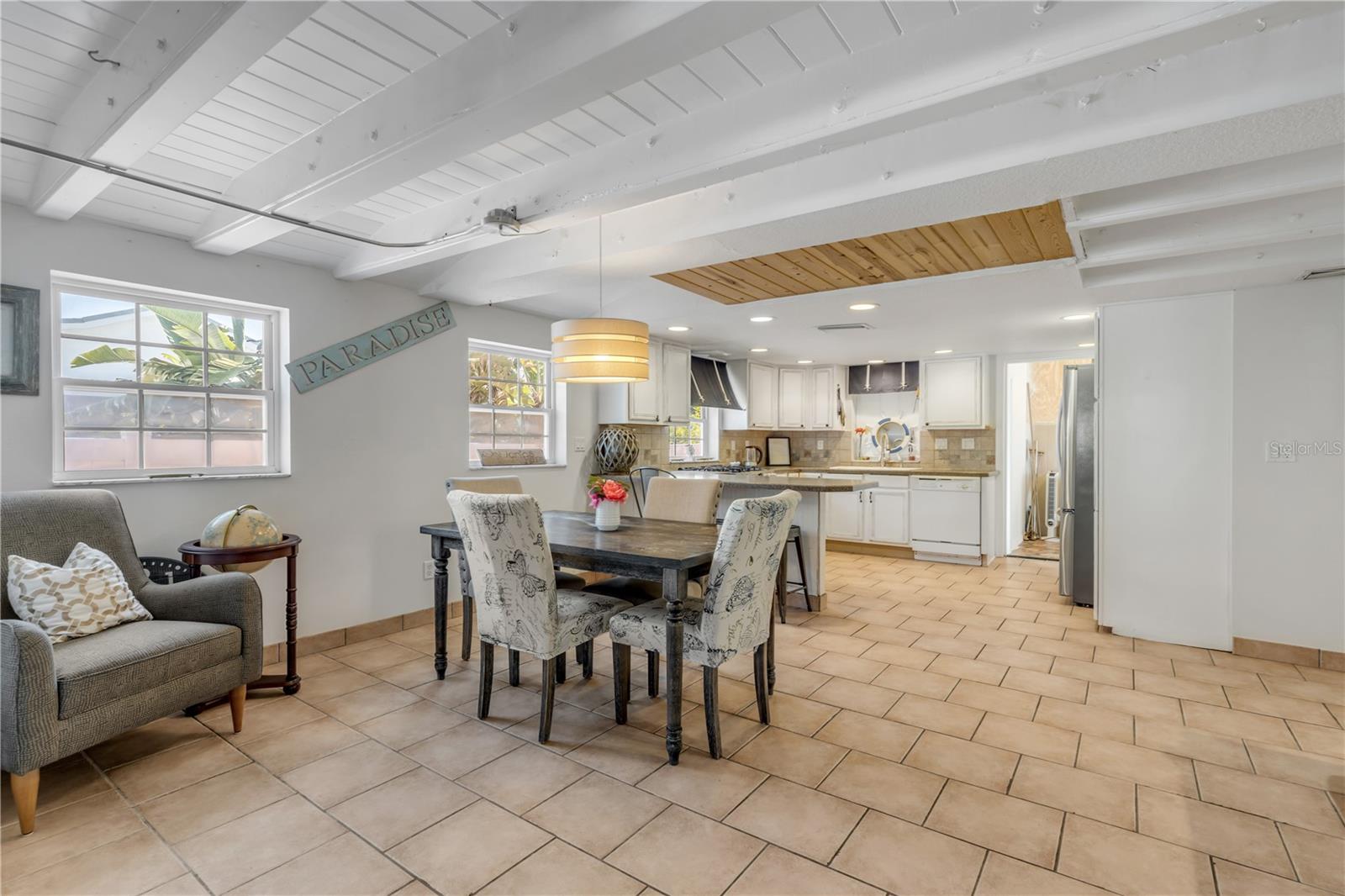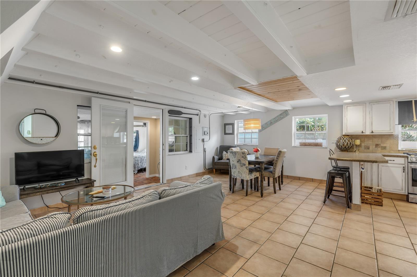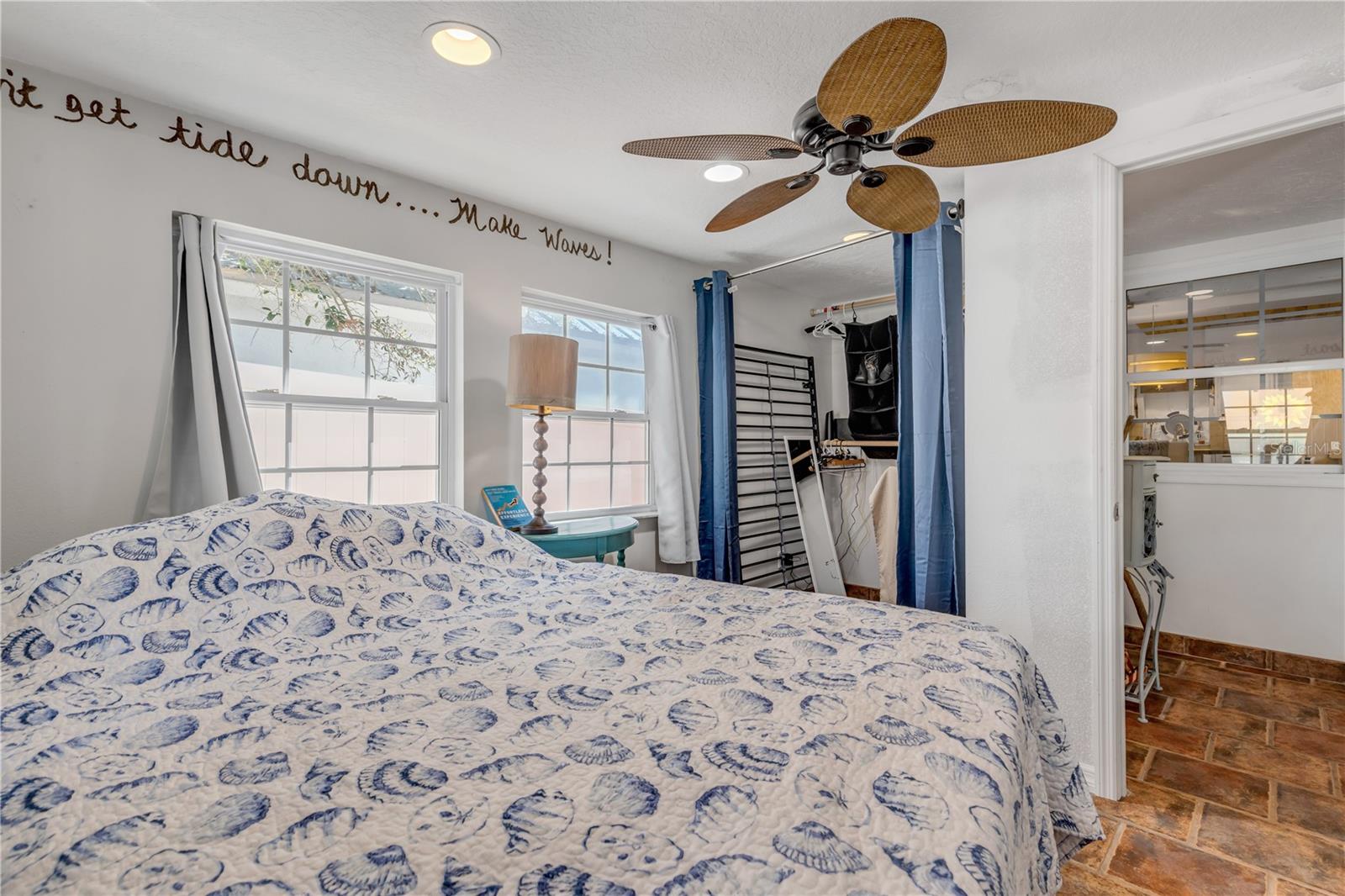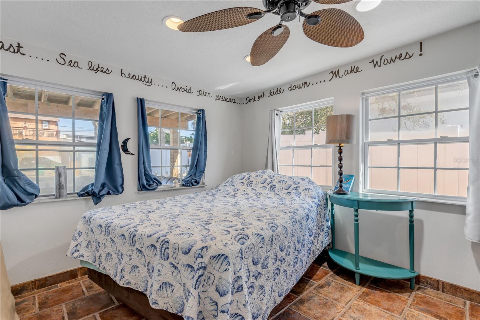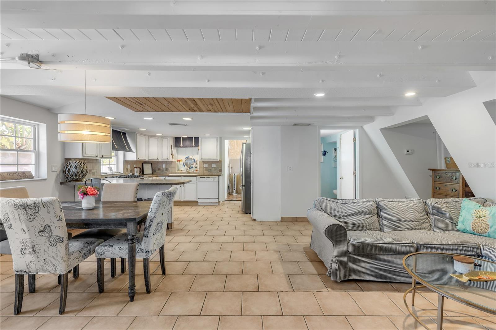 This charming beachside bungalow offers an unbeatable location just steps to the iconic Flagler Avenue shopping district and a short stroll to the sandy shores of New Smyrna Beach. The property features two separate suites with private entrances, making it a unique and versatile find with rental income potential. The upper suite boasts a spacious teak deck, perfect for soaking in the ocean breeze. The lower suite includes two bedrooms, one bathroom, a spacious kitchen with a breakfast bar open to the living area creating an open floor plan. Convenient amenities are an outdoor shower with hot and cold water, a stainless steel sink, and a large storage area for beach toys and a golf cart. The pet-friendly, fully fenced yard includes two gated sections, and the property offers ample paved parking for plenty of company. The paved side area and covered front porch provide excellent spaces for entertaining or relaxing with friends and family. If you're looking for a home that embodies the ultimate beach lifestyle, this is a must-see!