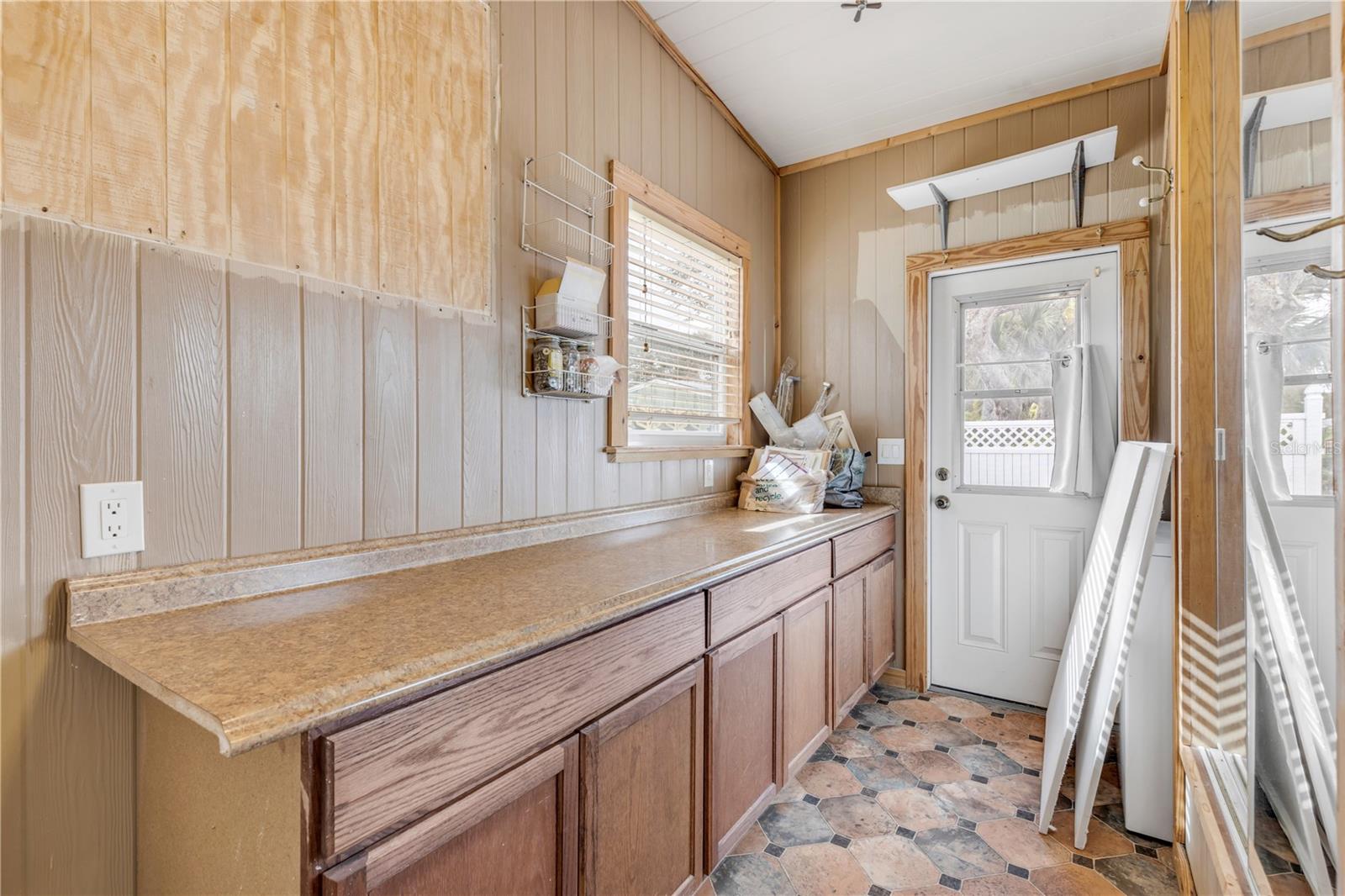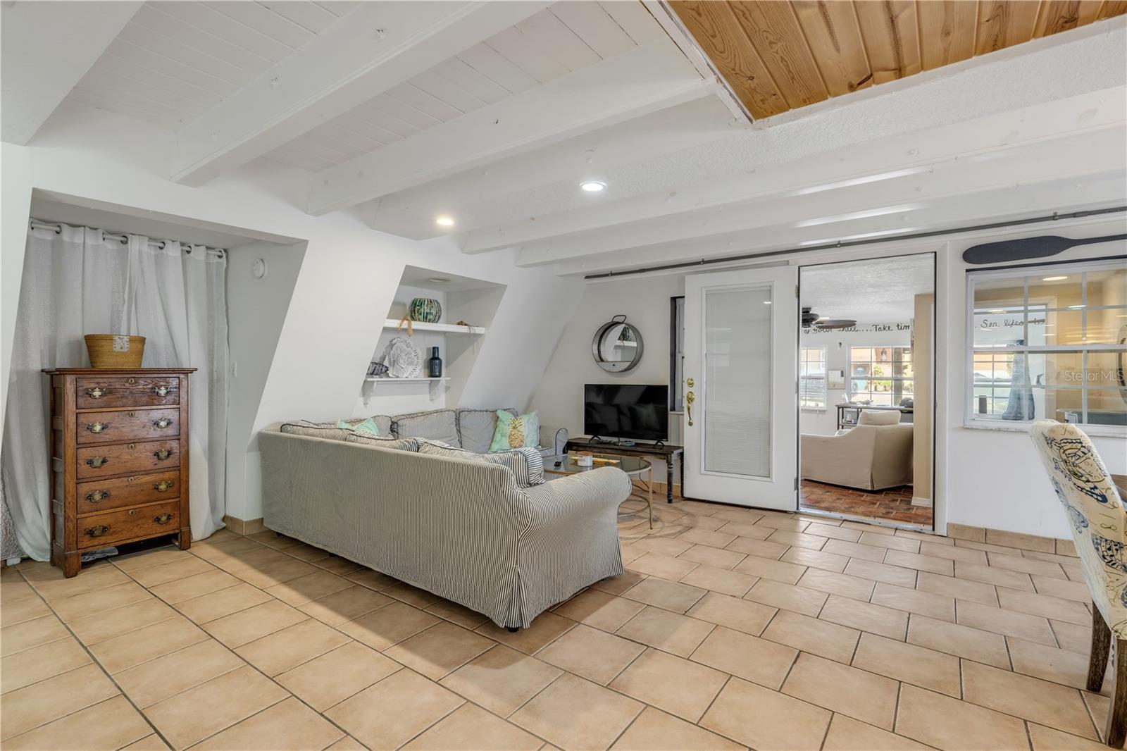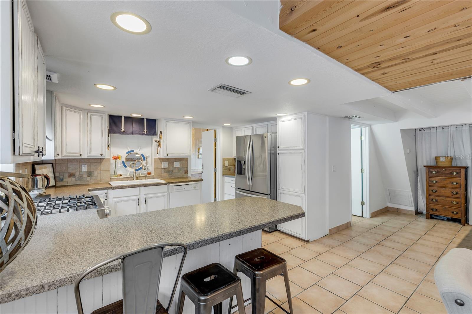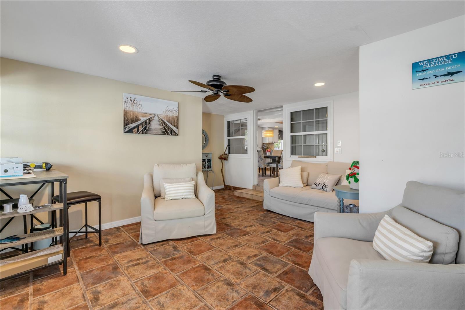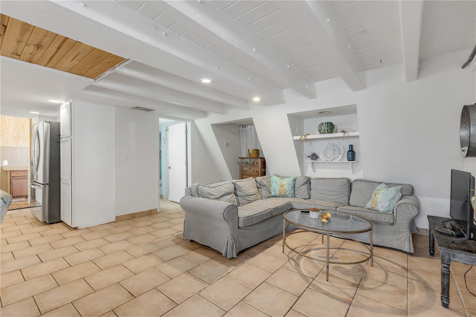 This charming beachside bungalow offers an unbeatable location just steps to the iconic Flagler Avenue shopping district and a short stroll to the sandy shores of New Smyrna Beach. The property features two separate suites with private entrances, making it a unique and versatile find with rental income potential. The upper suite boasts a spacious teak deck, perfect for soaking in the ocean breeze. The lower suite includes two bedrooms, one bathroom, a spacious kitchen with a breakfast bar open to the living area creating an open floor plan. Convenient amenities are an outdoor shower with hot and cold water, a stainless steel sink, and a large storage area for beach toys and a golf cart. The pet-friendly, fully fenced yard includes two gated sections, and the property offers ample paved parking for plenty of company. The paved side area and covered front porch provide excellent spaces for entertaining or relaxing with friends and family. If you're looking for a home that embodies the ultimate beach lifestyle, this is a must-see!