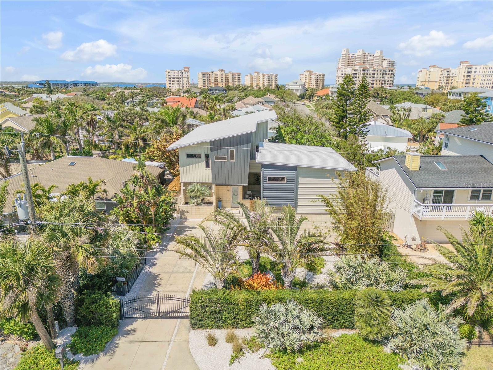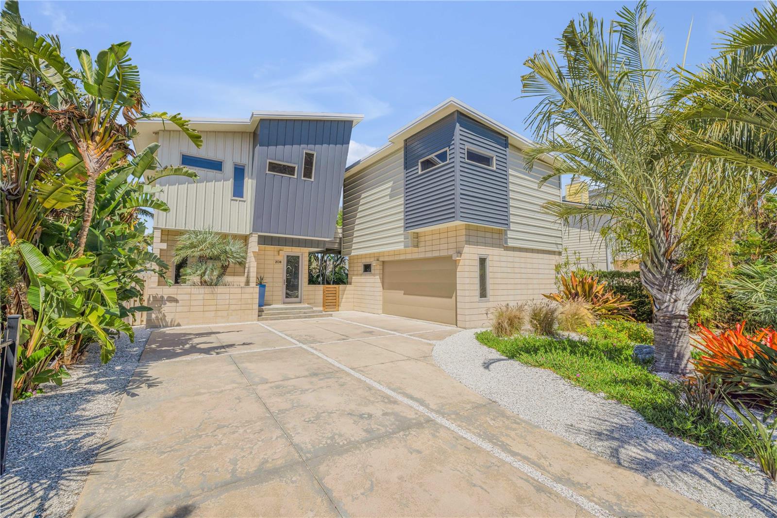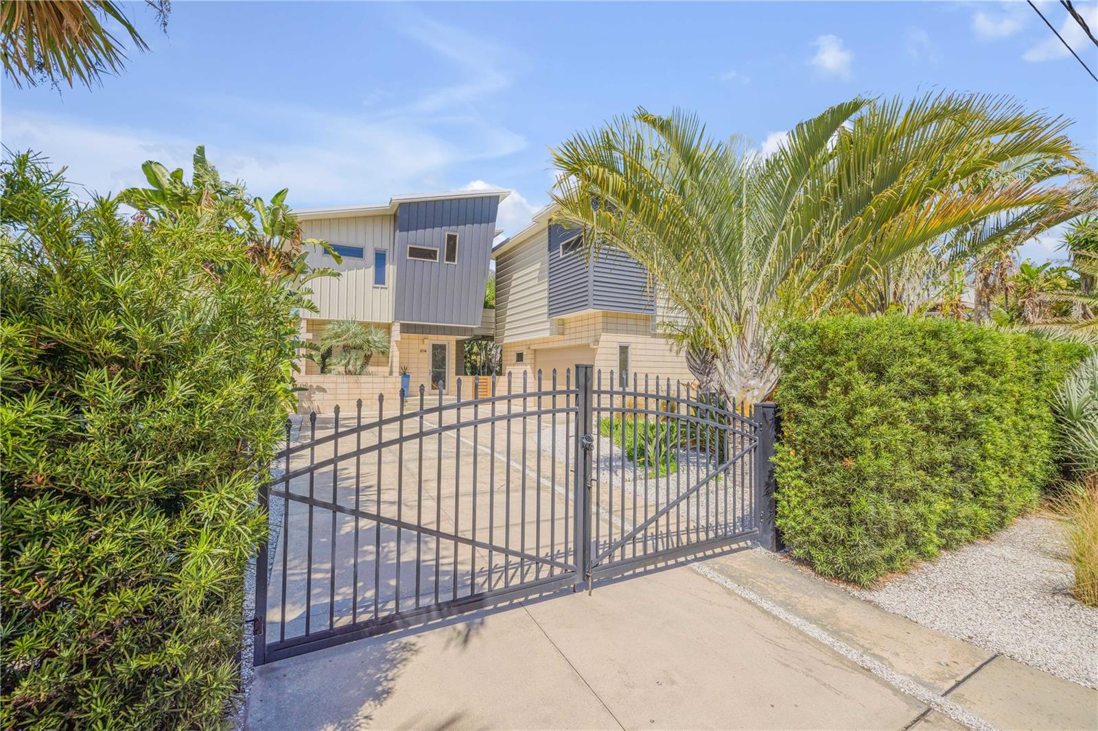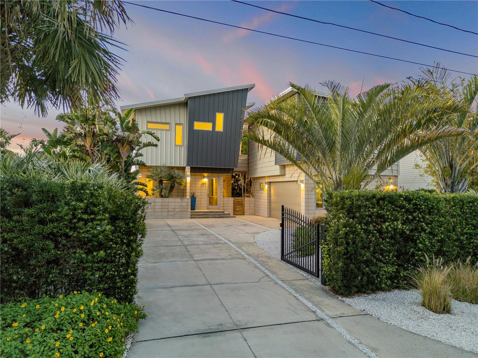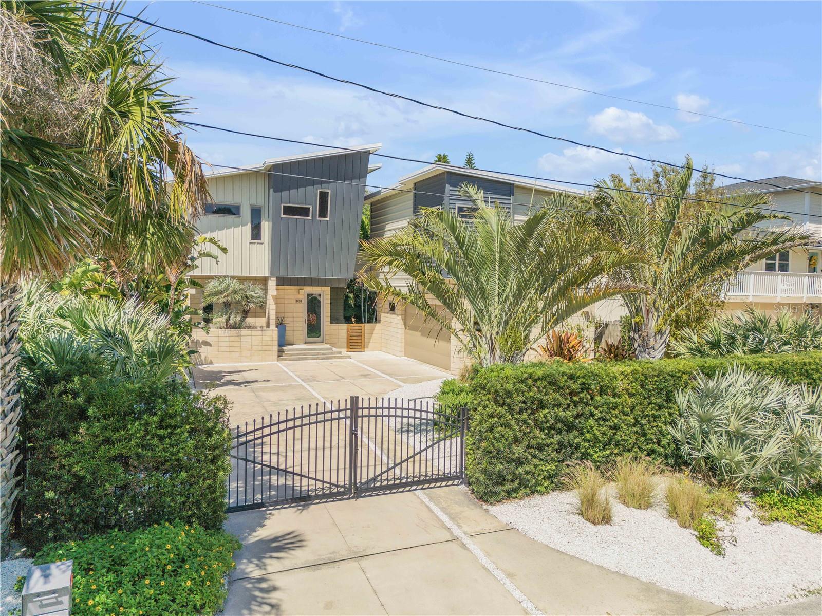 North Beach gated 3Br, 3 Ba contemporary pool home. Nestled between the Intracoastal Waterway and New Smyrna’s Beach this home exudes curb appeal and is just steps to the beach and dune walk-over. Once through the gated driveway, lush tropical landscaping welcomes you. This custom home features polished concrete and Eucalyptus wood floors, and 25’ ceilings. The first floor bedroom is accessed through double doors in the foyer and adjacent to the bedroom you will find a full bathroom with floor to ceiling decorative tile. The gourmet kitchen features Italian Valcucine cabinets, stainless steel Wolf and Miele appliances, quartz countertops, two sinks and a spacious walk-in pantry. The dining room features exposed concrete block walls with views out to the pool. The grand living space adjoins the pool and the Media room. The second floor walk-ways overlook the main floor leading to a luxurious primary suite with both walk-in and built-in closets. Primary bathroom offers dual sinks, dual shower heads and quartz countertops. Bedroom 2 with en-suite, features glass countertops and a polished concrete tub. The 2nd floor laundry room with deep stainless steel utility tub is conveniently located. Two-story garage/guest house has additional bonus space suitable for workshop, mother-in-law suite or additional living space. A 40’ lap pool, covered patio, fire pit and outdoor shower enhance outdoor living. This home has newer Pac-Clad Roof and siding, whole house Generac natural gas generator, two yr 2022 A/C units & tankless hot water heater, Anderson hurricane rated windows, and Ring brand security cameras. Beach Access, Smyrna Dunes Park with dog beach and fishing pier are minutes away. Flagler Avenue’s shops, restaurants and entertainment are 1.5 miles away, a leisurely bike ride. No flood insurance required.