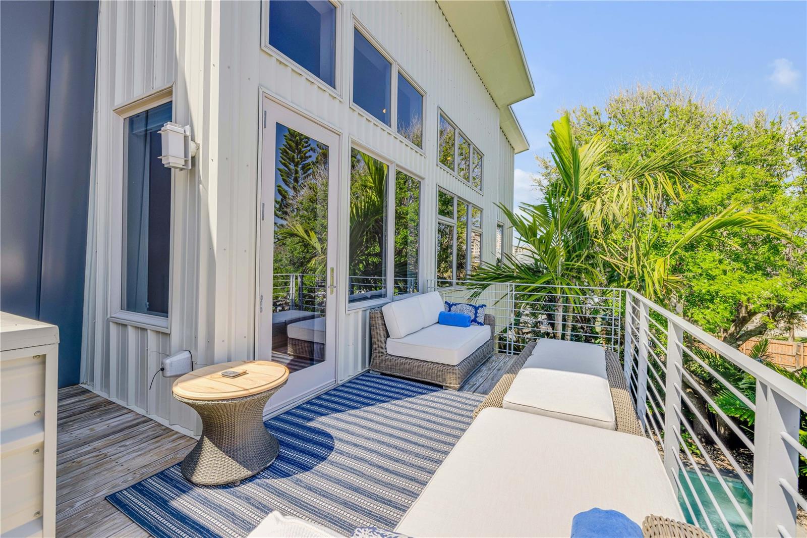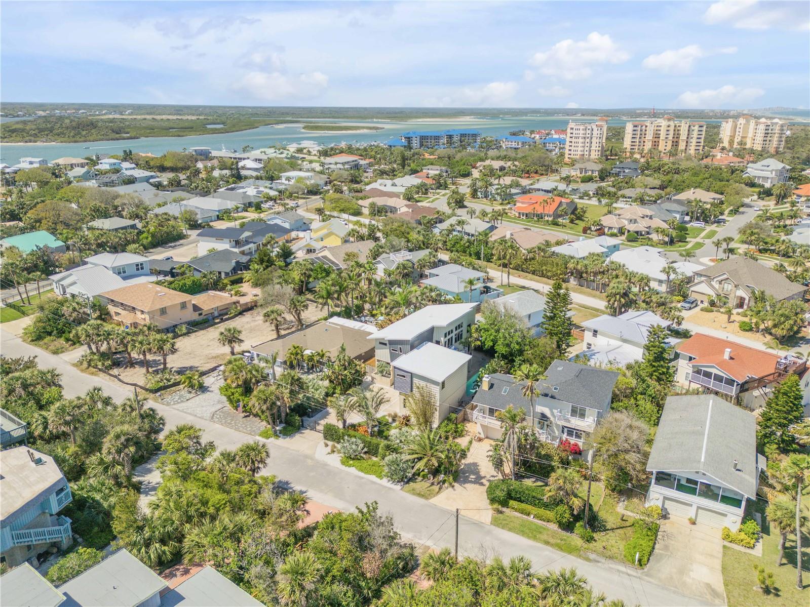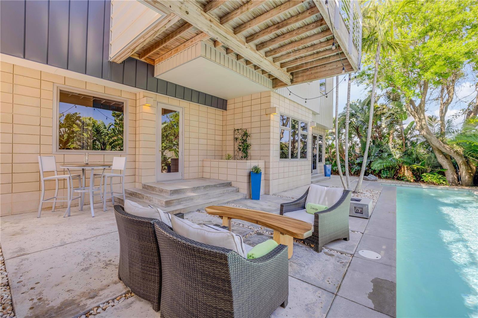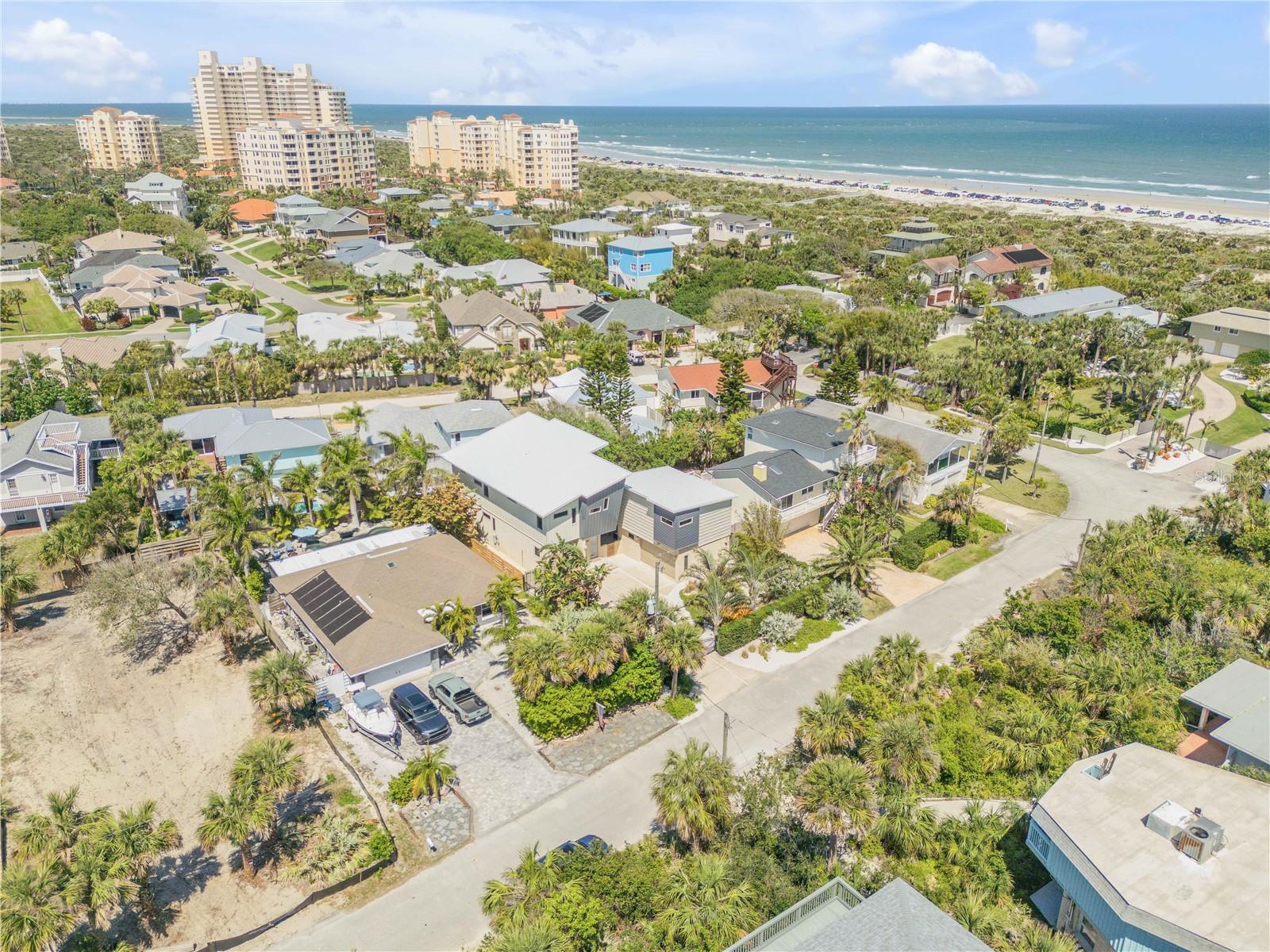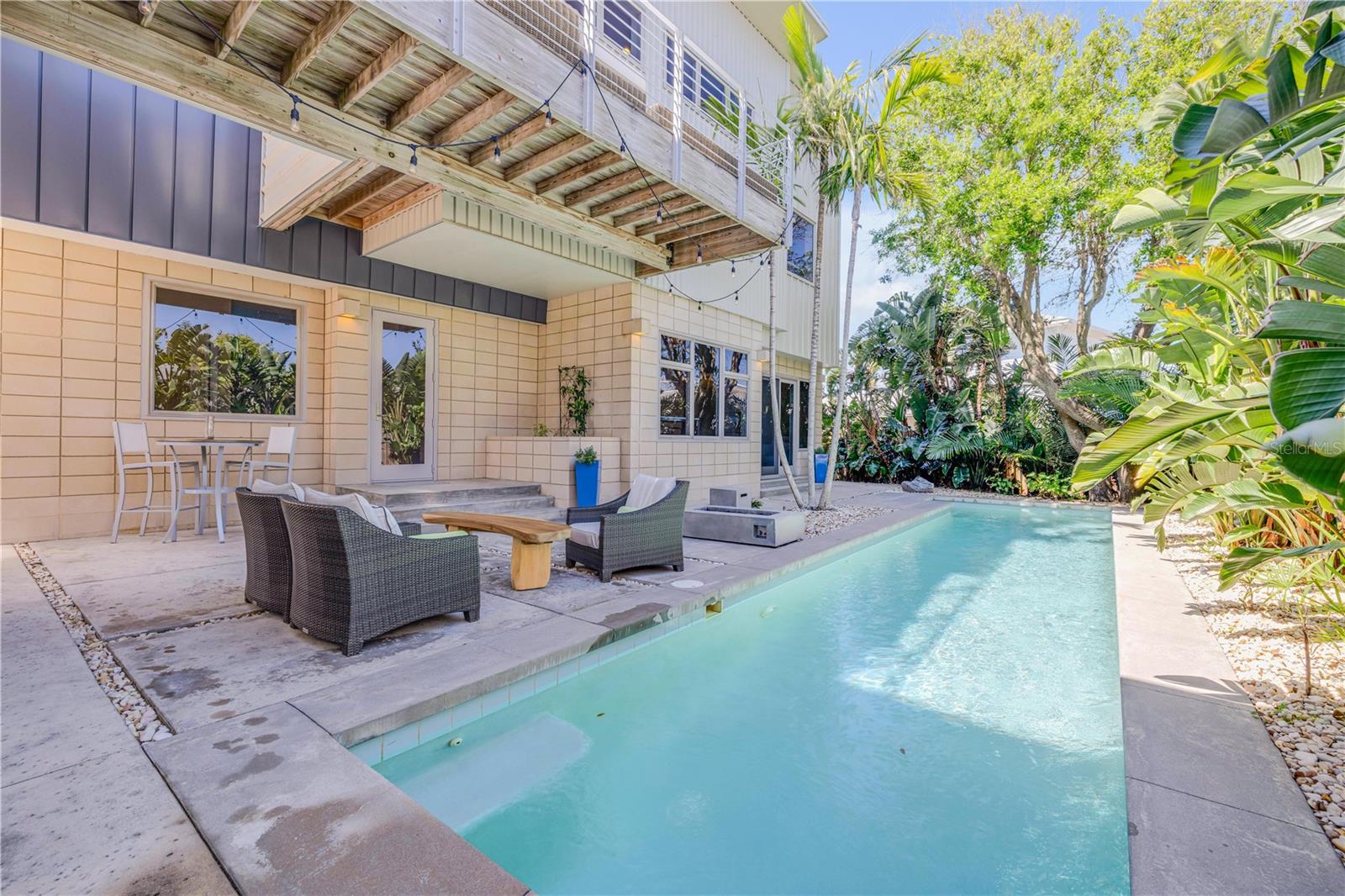 North Beach gated 3Br, 3 Ba contemporary pool home. Nestled between the Intracoastal Waterway and New Smyrna’s Beach this home exudes curb appeal and is just steps to the beach and dune walk-over. Once through the gated driveway, lush tropical landscaping welcomes you. This custom home features polished concrete and Eucalyptus wood floors, and 25’ ceilings. The first floor bedroom is accessed through double doors in the foyer and adjacent to the bedroom you will find a full bathroom with floor to ceiling decorative tile. The gourmet kitchen features Italian Valcucine cabinets, stainless steel Wolf and Miele appliances, quartz countertops, two sinks and a spacious walk-in pantry. The dining room features exposed concrete block walls with views out to the pool. The grand living space adjoins the pool and the Media room. The second floor walk-ways overlook the main floor leading to a luxurious primary suite with both walk-in and built-in closets. Primary bathroom offers dual sinks, dual shower heads and quartz countertops. Bedroom 2 with en-suite, features glass countertops and a polished concrete tub. The 2nd floor laundry room with deep stainless steel utility tub is conveniently located. Two-story garage/guest house has additional bonus space suitable for workshop, mother-in-law suite or additional living space. A 40’ lap pool, covered patio, fire pit and outdoor shower enhance outdoor living. This home has newer Pac-Clad Roof and siding, whole house Generac natural gas generator, two yr 2022 A/C units & tankless hot water heater, Anderson hurricane rated windows, and Ring brand security cameras. Beach Access, Smyrna Dunes Park with dog beach and fishing pier are minutes away. Flagler Avenue’s shops, restaurants and entertainment are 1.5 miles away, a leisurely bike ride. No flood insurance required.