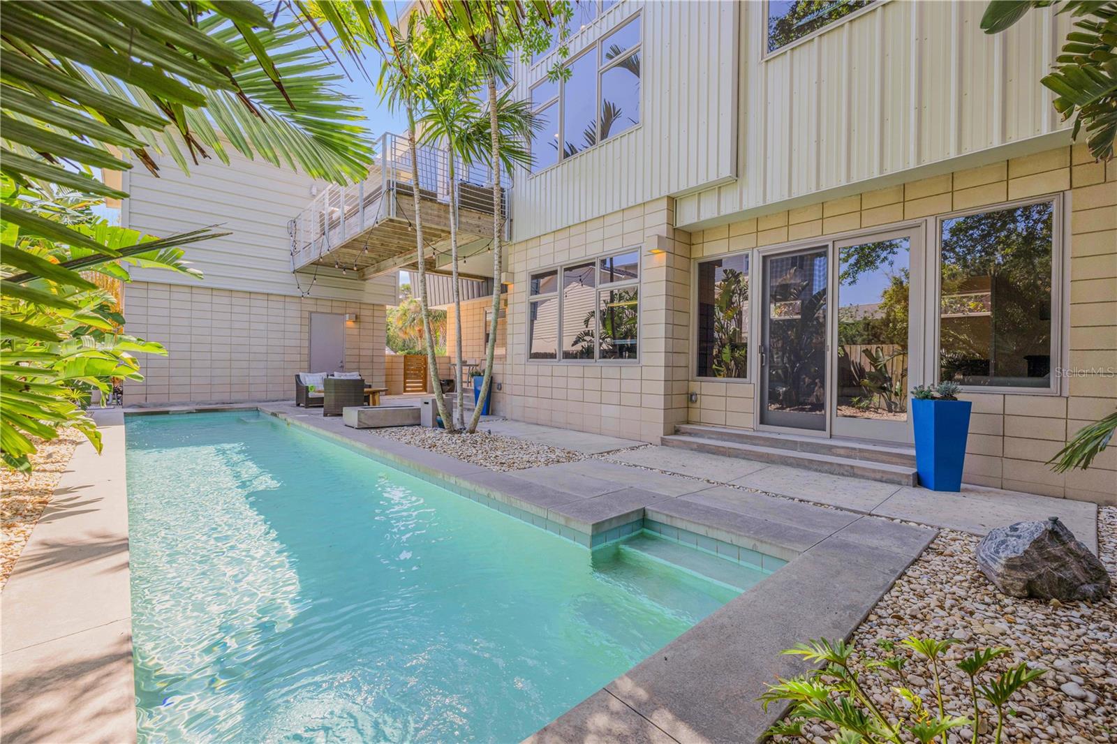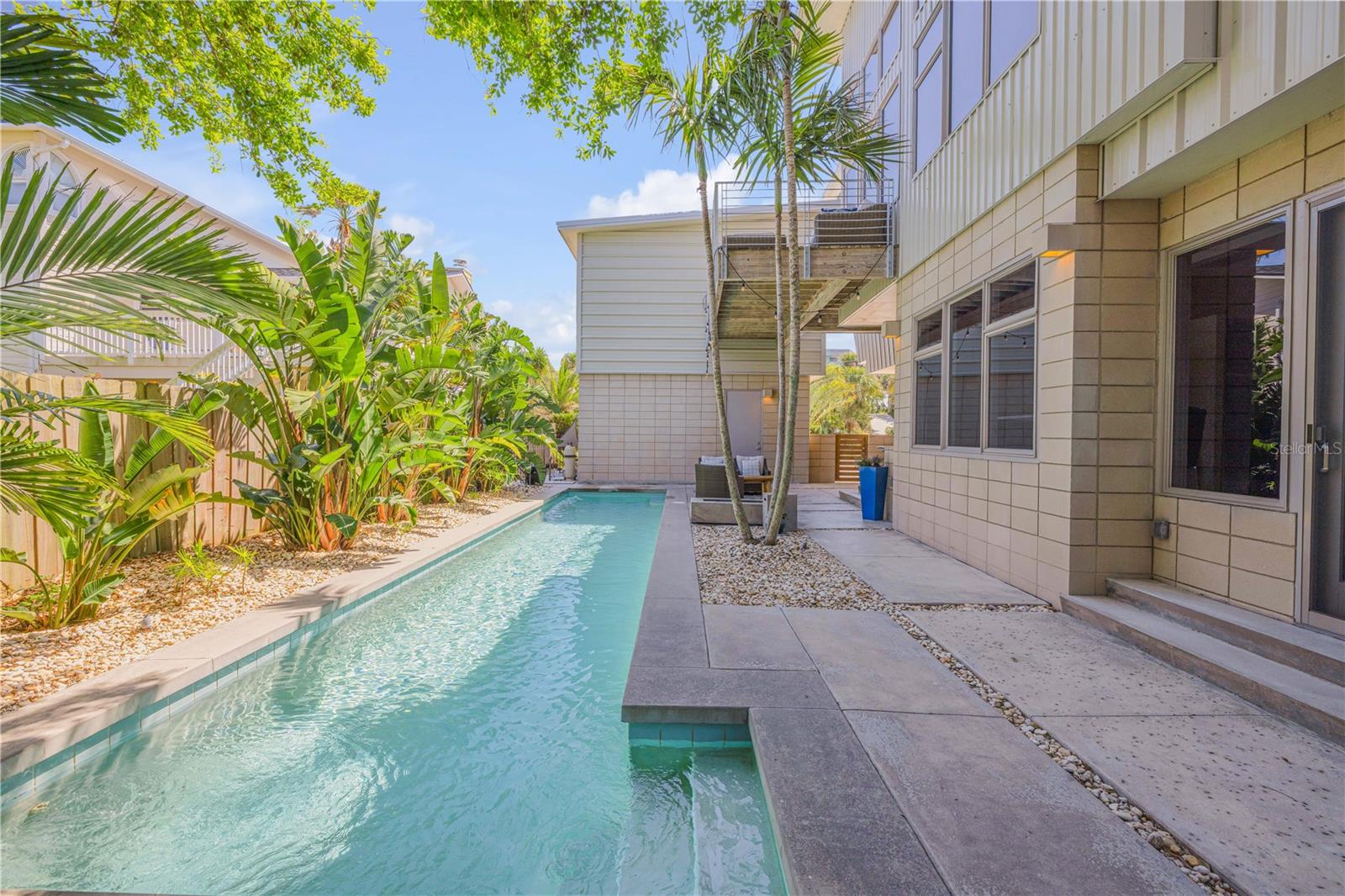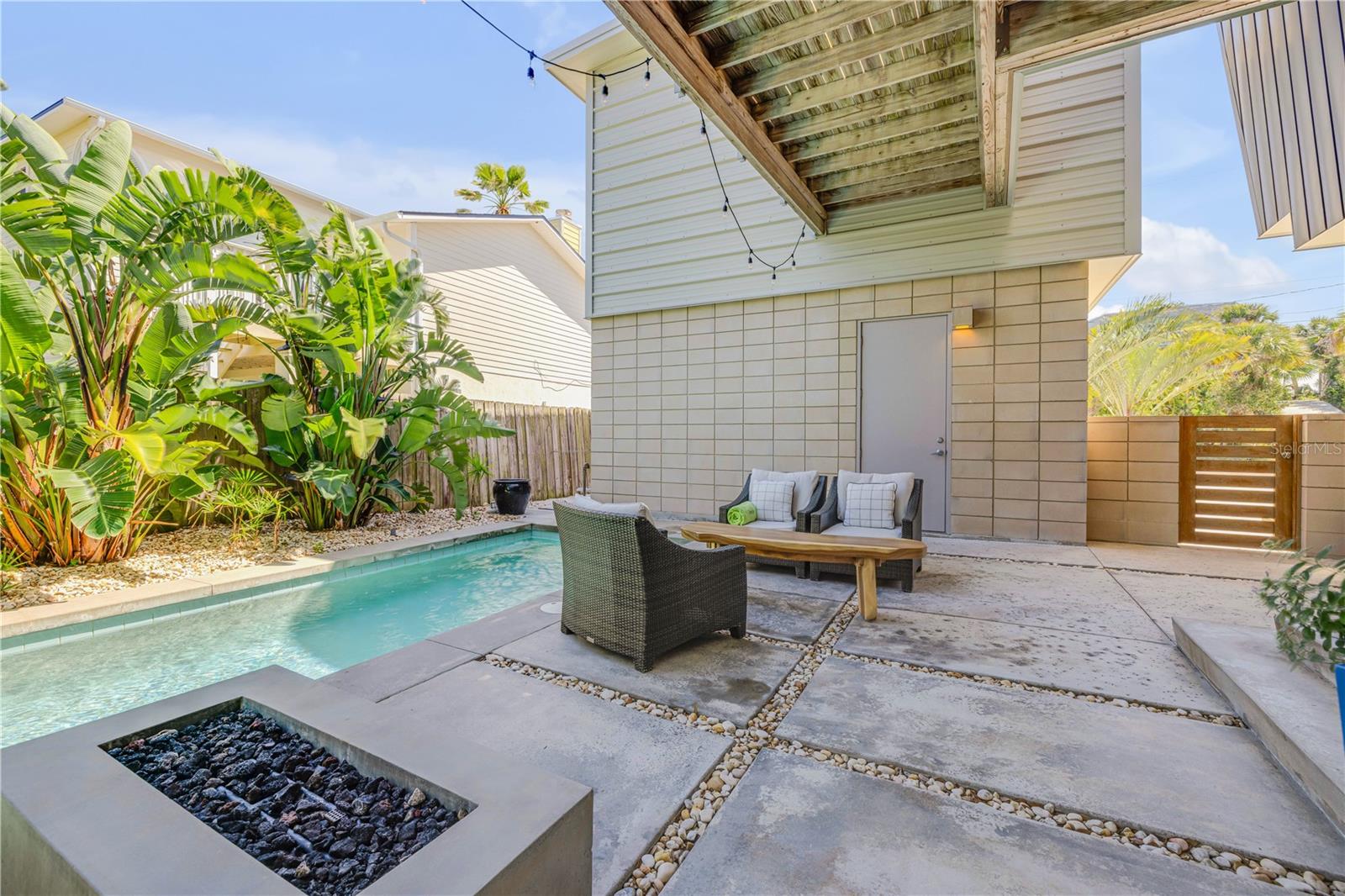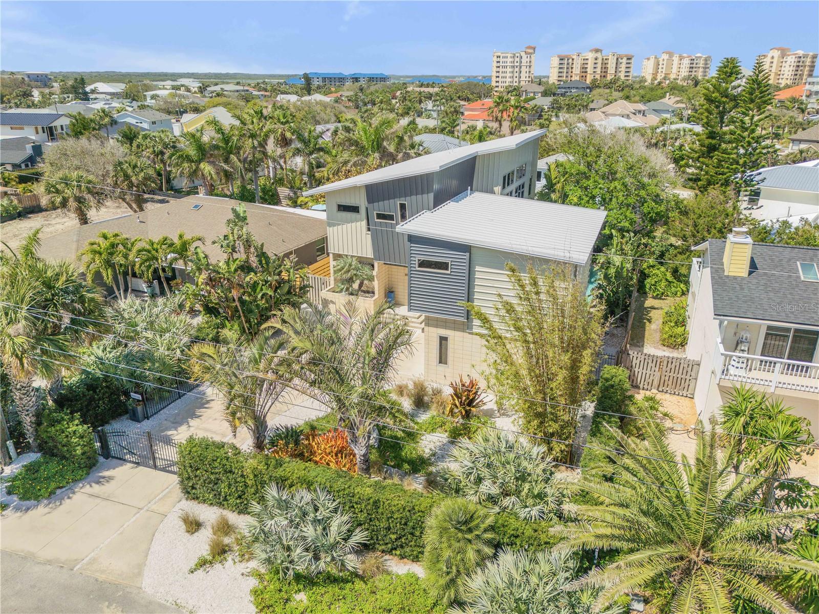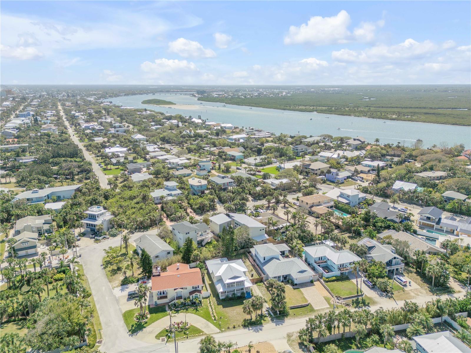 North Beach gated 3Br, 3 Ba contemporary pool home. Nestled between the Intracoastal Waterway and New Smyrna’s Beach this home exudes curb appeal and is just steps to the beach and dune walk-over. Once through the gated driveway, lush tropical landscaping welcomes you. This custom home features polished concrete and Eucalyptus wood floors, and 25’ ceilings. The first floor bedroom is accessed through double doors in the foyer and adjacent to the bedroom you will find a full bathroom with floor to ceiling decorative tile. The gourmet kitchen features Italian Valcucine cabinets, stainless steel Wolf and Miele appliances, quartz countertops, two sinks and a spacious walk-in pantry. The dining room features exposed concrete block walls with views out to the pool. The grand living space adjoins the pool and the Media room. The second floor walk-ways overlook the main floor leading to a luxurious primary suite with both walk-in and built-in closets. Primary bathroom offers dual sinks, dual shower heads and quartz countertops. Bedroom 2 with en-suite, features glass countertops and a polished concrete tub. The 2nd floor laundry room with deep stainless steel utility tub is conveniently located. Two-story garage/guest house has additional bonus space suitable for workshop, mother-in-law suite or additional living space. A 40’ lap pool, covered patio, fire pit and outdoor shower enhance outdoor living. This home has newer Pac-Clad Roof and siding, whole house Generac natural gas generator, two yr 2022 A/C units & tankless hot water heater, Anderson hurricane rated windows, and Ring brand security cameras. Beach Access, Smyrna Dunes Park with dog beach and fishing pier are minutes away. Flagler Avenue’s shops, restaurants and entertainment are 1.5 miles away, a leisurely bike ride. No flood insurance required.