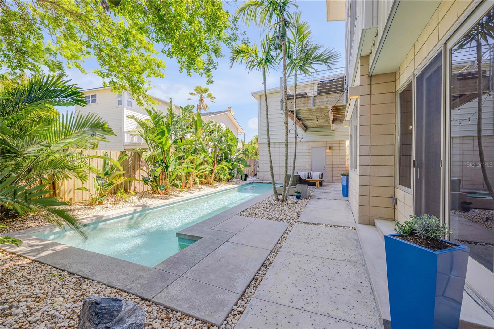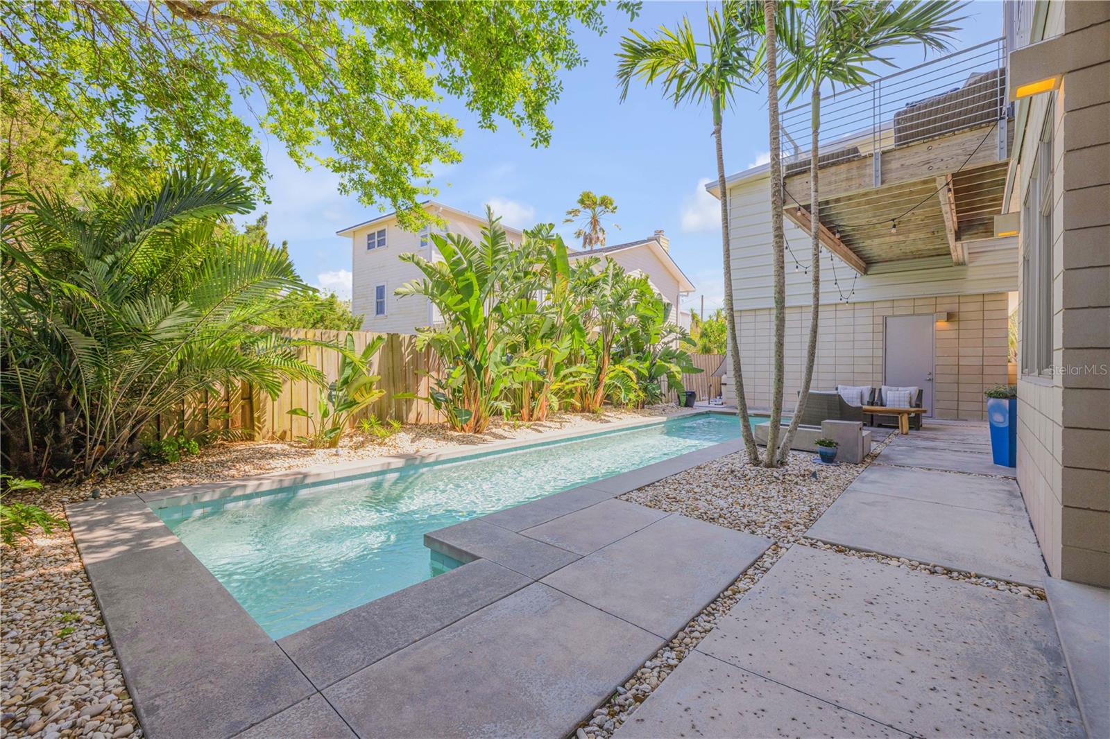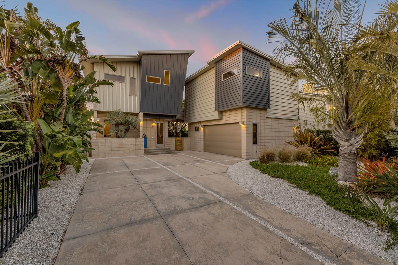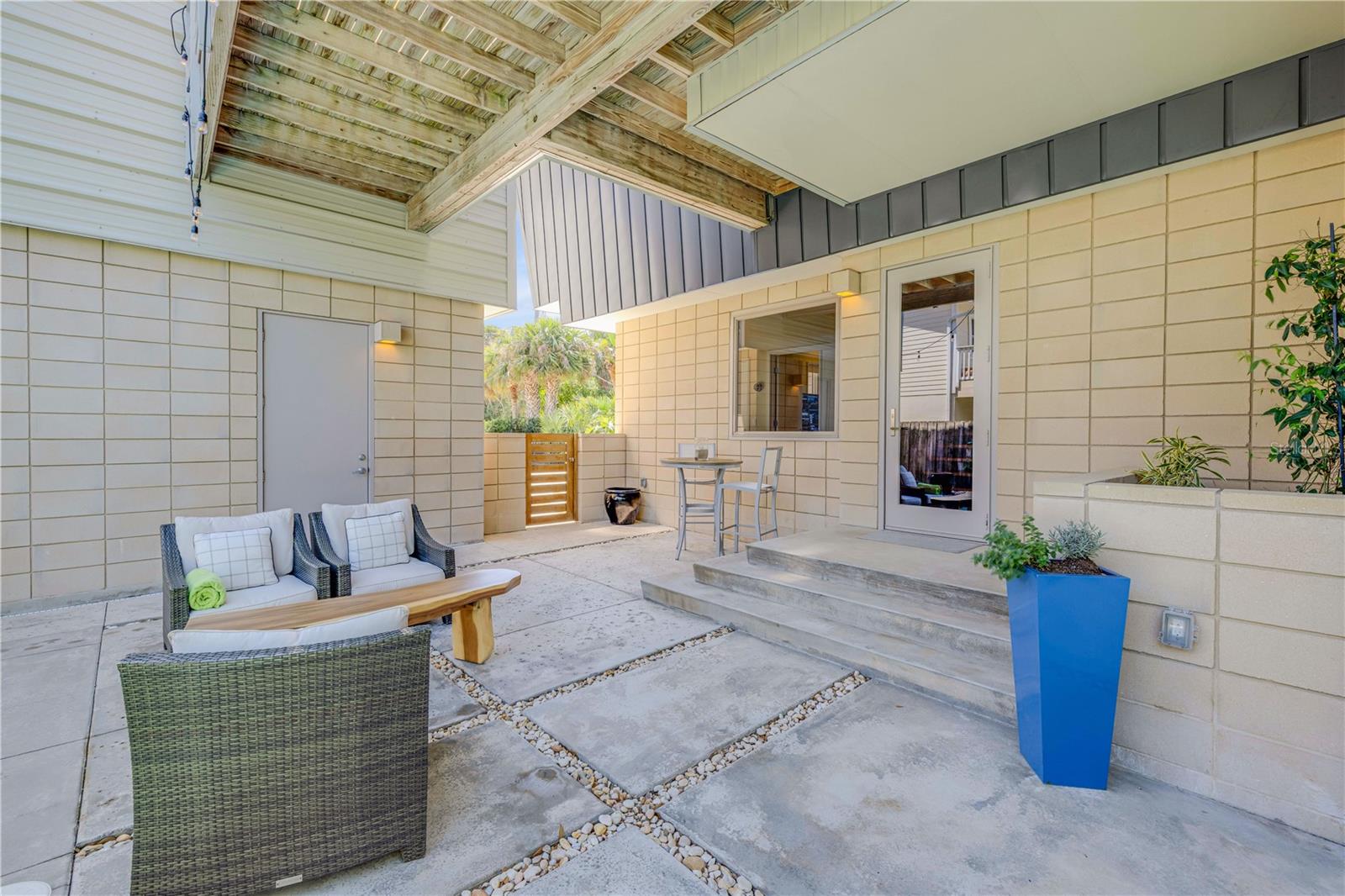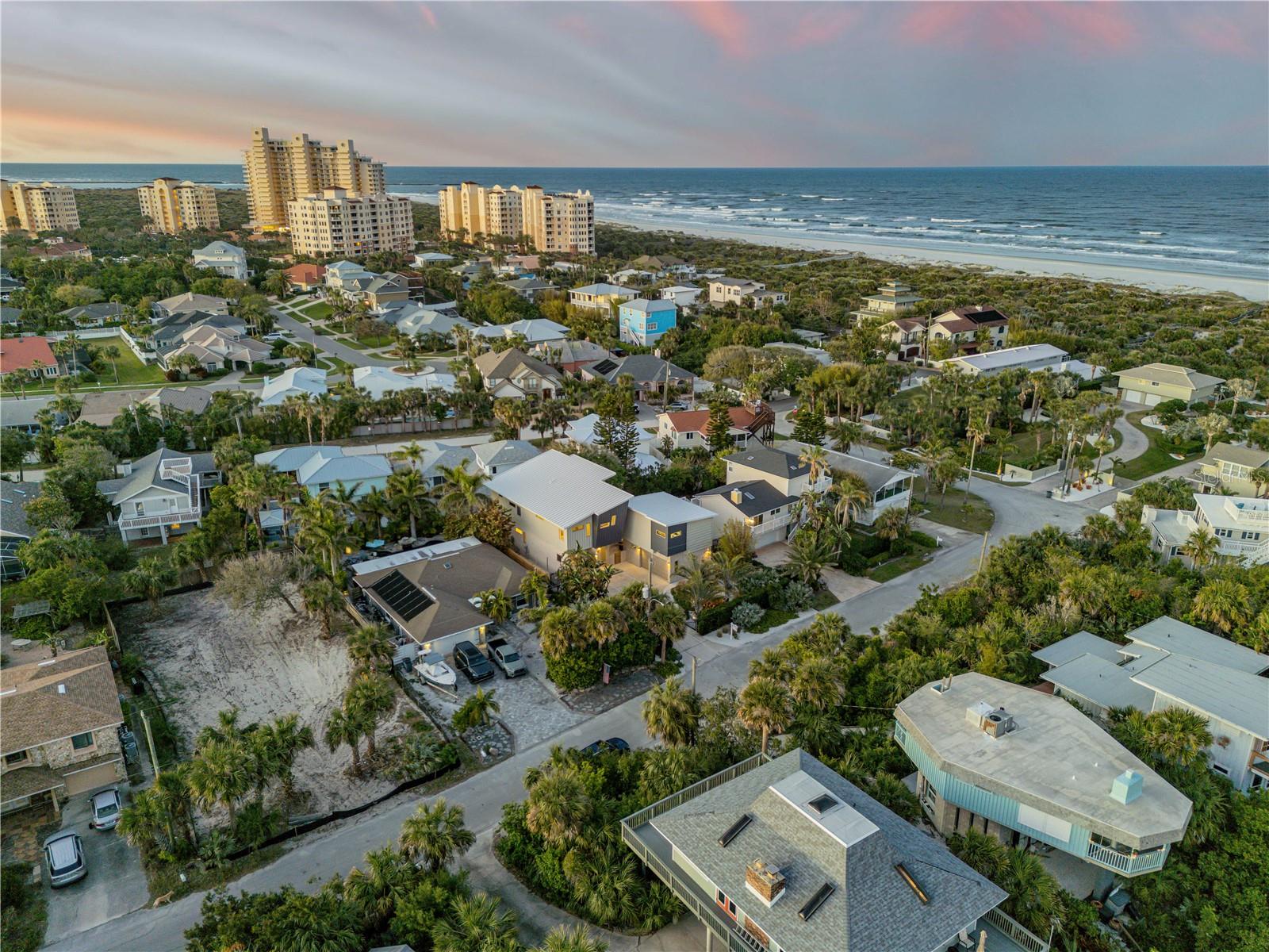 North Beach gated 3Br, 3 Ba contemporary pool home. Nestled between the Intracoastal Waterway and New Smyrna’s Beach this home exudes curb appeal and is just steps to the beach and dune walk-over. Once through the gated driveway, lush tropical landscaping welcomes you. This custom home features polished concrete and Eucalyptus wood floors, and 25’ ceilings. The first floor bedroom is accessed through double doors in the foyer and adjacent to the bedroom you will find a full bathroom with floor to ceiling decorative tile. The gourmet kitchen features Italian Valcucine cabinets, stainless steel Wolf and Miele appliances, quartz countertops, two sinks and a spacious walk-in pantry. The dining room features exposed concrete block walls with views out to the pool. The grand living space adjoins the pool and the Media room. The second floor walk-ways overlook the main floor leading to a luxurious primary suite with both walk-in and built-in closets. Primary bathroom offers dual sinks, dual shower heads and quartz countertops. Bedroom 2 with en-suite, features glass countertops and a polished concrete tub. The 2nd floor laundry room with deep stainless steel utility tub is conveniently located. Two-story garage/guest house has additional bonus space suitable for workshop, mother-in-law suite or additional living space. A 40’ lap pool, covered patio, fire pit and outdoor shower enhance outdoor living. This home has newer Pac-Clad Roof and siding, whole house Generac natural gas generator, two yr 2022 A/C units & tankless hot water heater, Anderson hurricane rated windows, and Ring brand security cameras. Beach Access, Smyrna Dunes Park with dog beach and fishing pier are minutes away. Flagler Avenue’s shops, restaurants and entertainment are 1.5 miles away, a leisurely bike ride. No flood insurance required.
