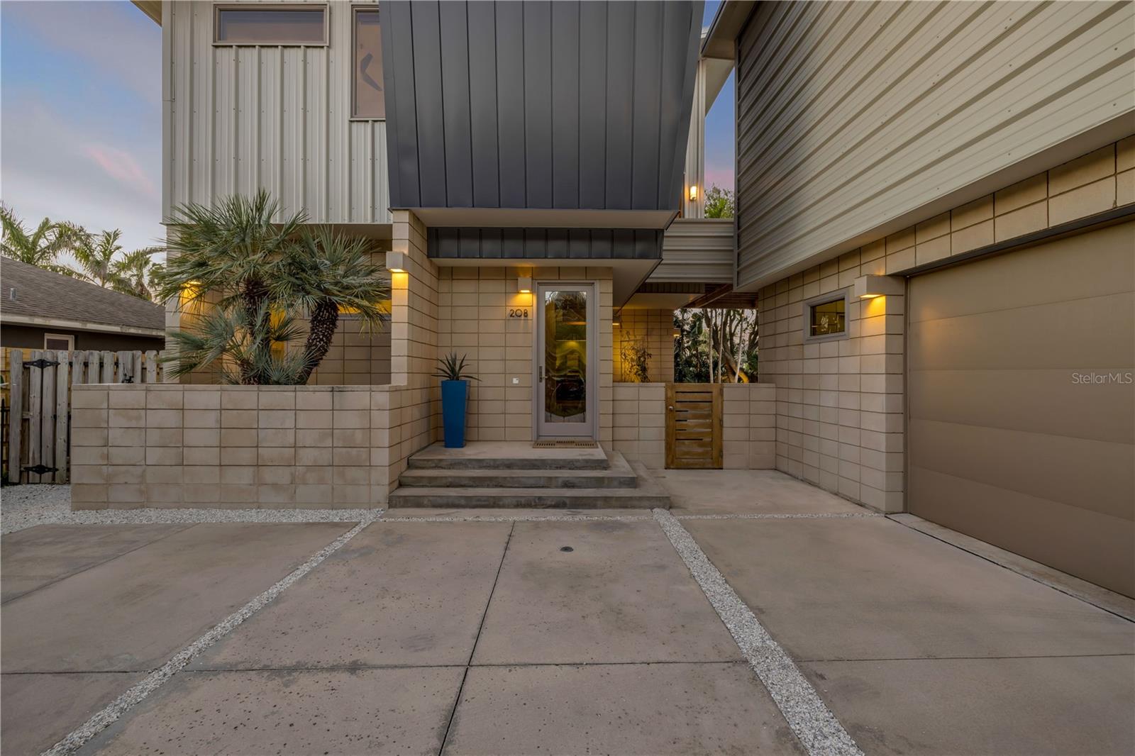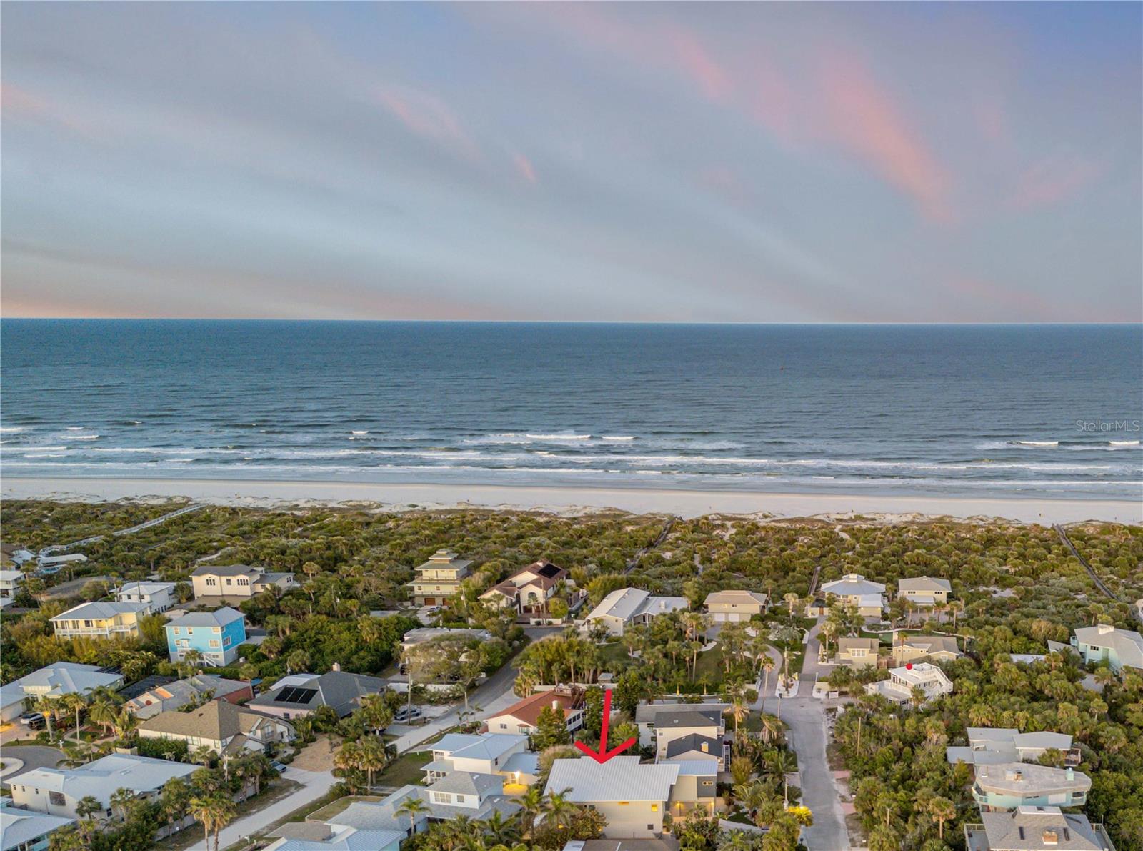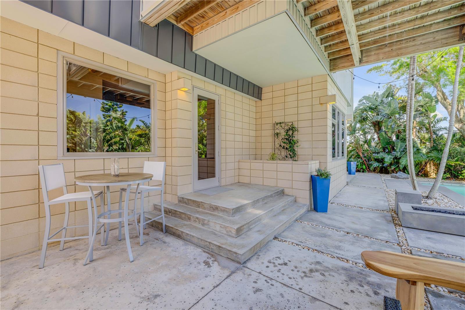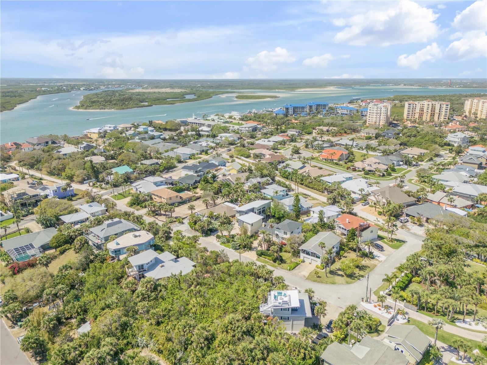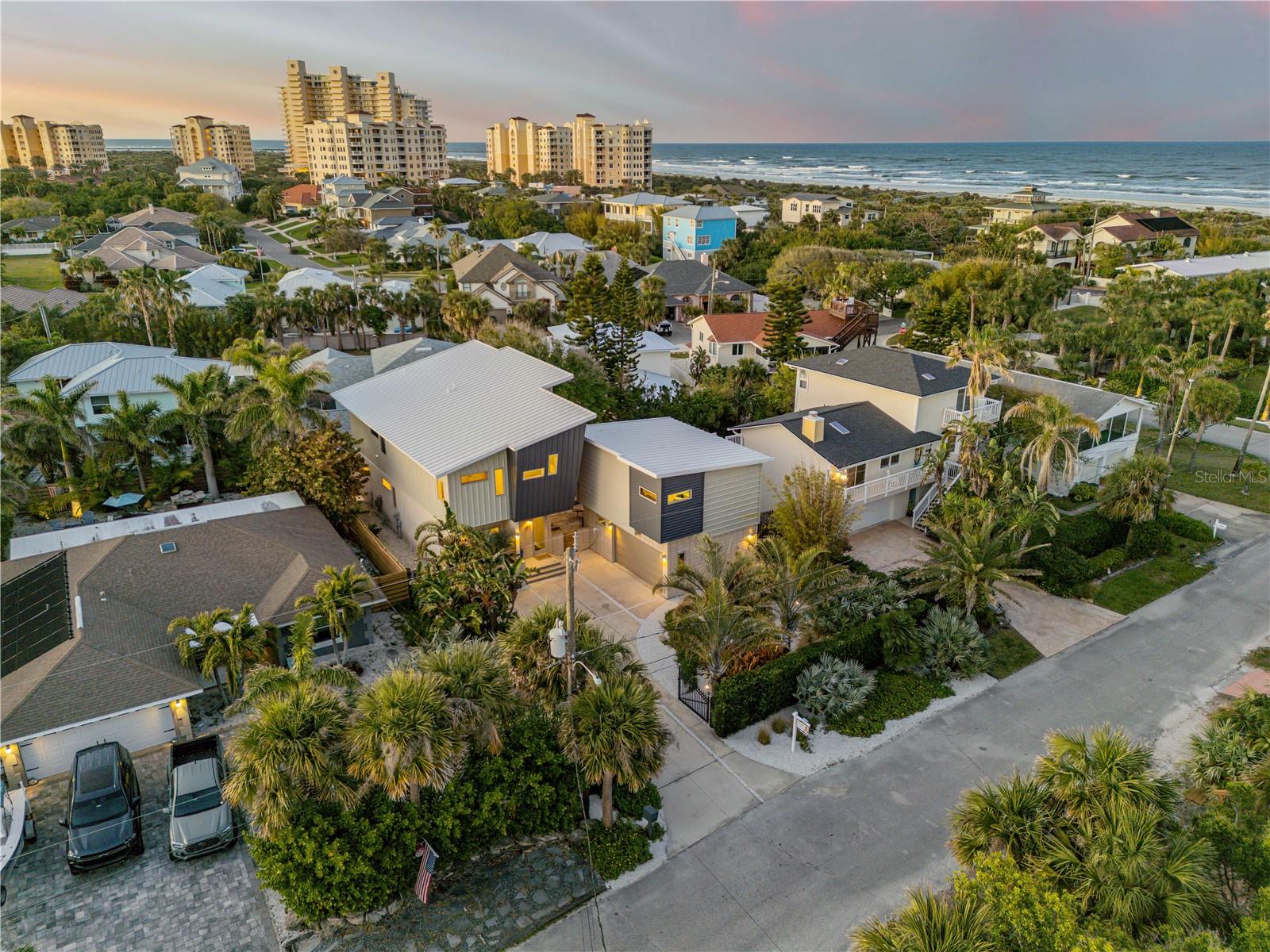 North Beach gated 3Br, 3 Ba contemporary pool home. Nestled between the Intracoastal Waterway and New Smyrna’s Beach this home exudes curb appeal and is just steps to the beach and dune walk-over. Once through the gated driveway, lush tropical landscaping welcomes you. This custom home features polished concrete and Eucalyptus wood floors, and 25’ ceilings. The first floor bedroom is accessed through double doors in the foyer and adjacent to the bedroom you will find a full bathroom with floor to ceiling decorative tile. The gourmet kitchen features Italian Valcucine cabinets, stainless steel Wolf and Miele appliances, quartz countertops, two sinks and a spacious walk-in pantry. The dining room features exposed concrete block walls with views out to the pool. The grand living space adjoins the pool and the Media room. The second floor walk-ways overlook the main floor leading to a luxurious primary suite with both walk-in and built-in closets. Primary bathroom offers dual sinks, dual shower heads and quartz countertops. Bedroom 2 with en-suite, features glass countertops and a polished concrete tub. The 2nd floor laundry room with deep stainless steel utility tub is conveniently located. Two-story garage/guest house has additional bonus space suitable for workshop, mother-in-law suite or additional living space. A 40’ lap pool, covered patio, fire pit and outdoor shower enhance outdoor living. This home has newer Pac-Clad Roof and siding, whole house Generac natural gas generator, two yr 2022 A/C units & tankless hot water heater, Anderson hurricane rated windows, and Ring brand security cameras. Beach Access, Smyrna Dunes Park with dog beach and fishing pier are minutes away. Flagler Avenue’s shops, restaurants and entertainment are 1.5 miles away, a leisurely bike ride. No flood insurance required.