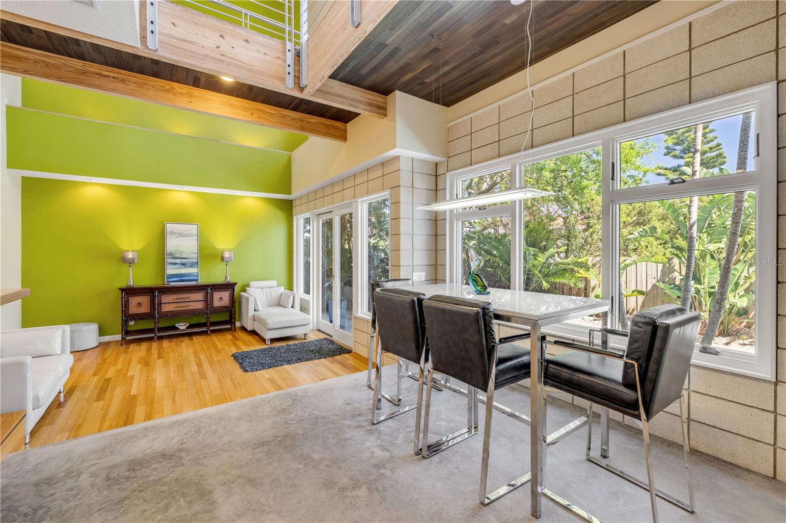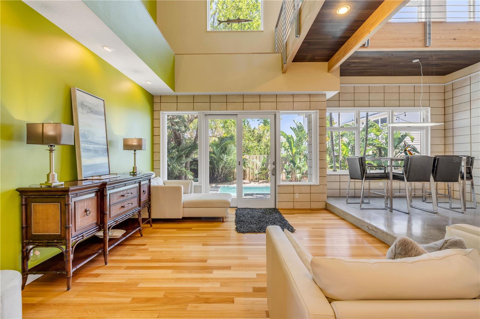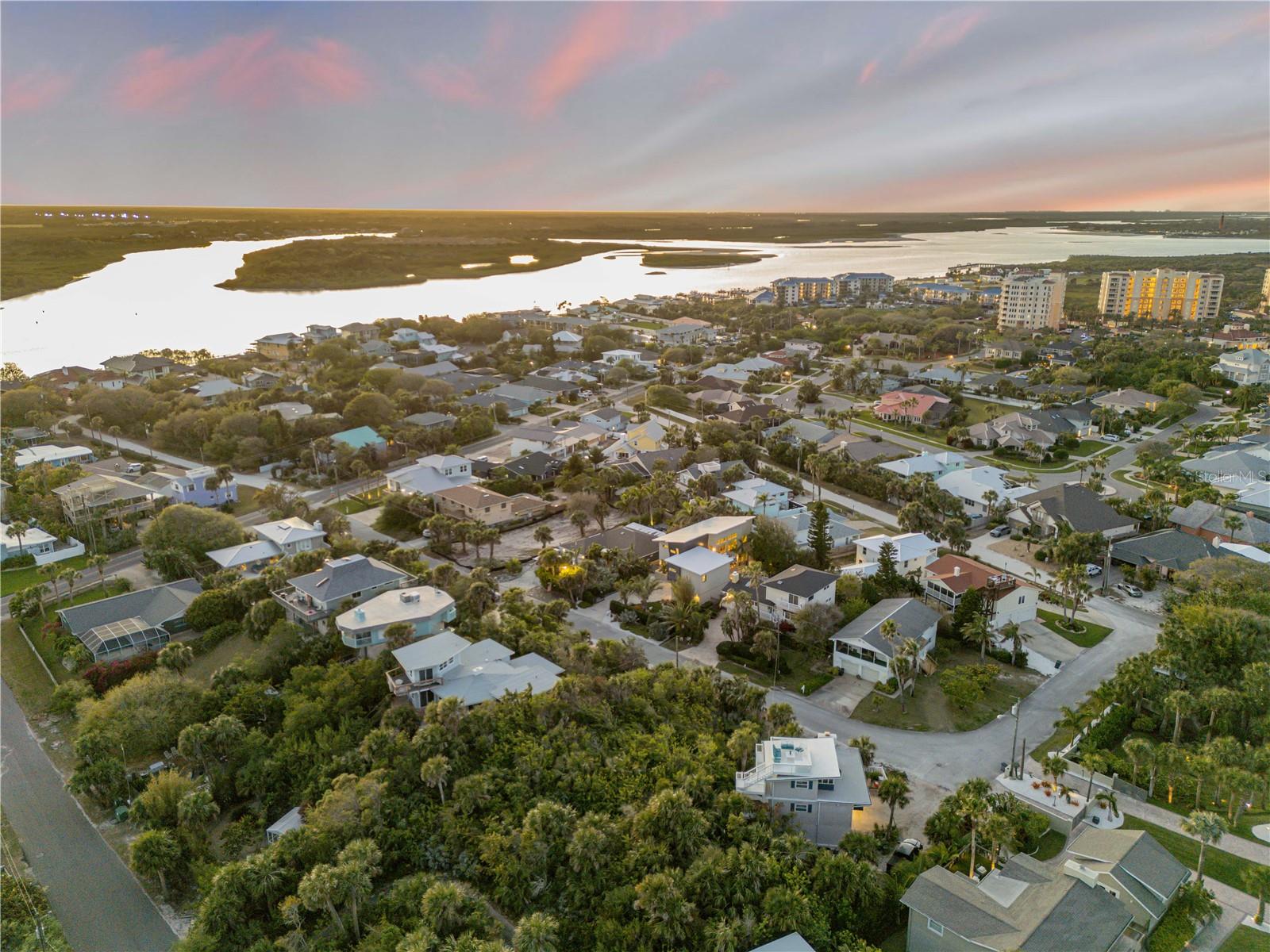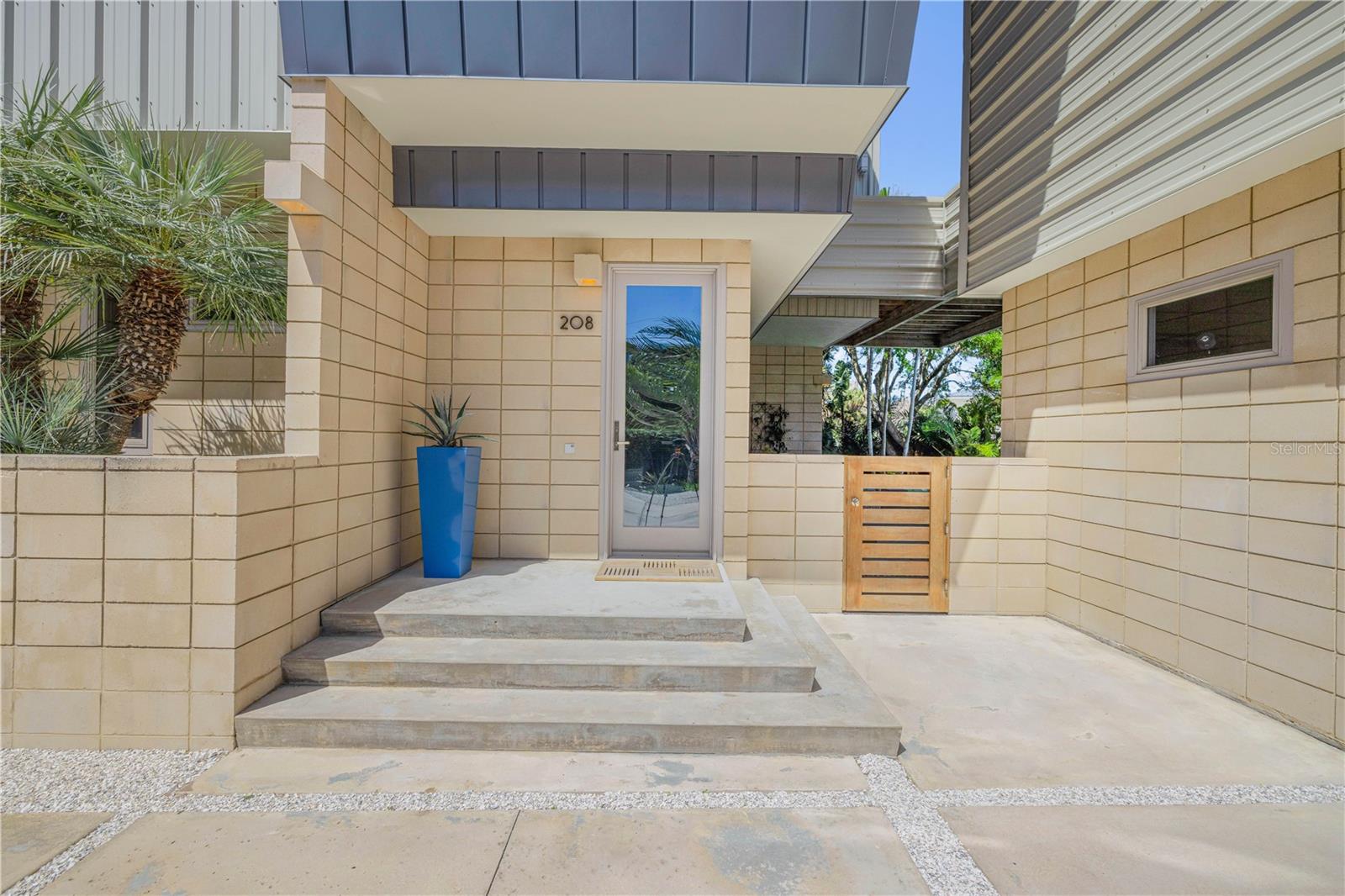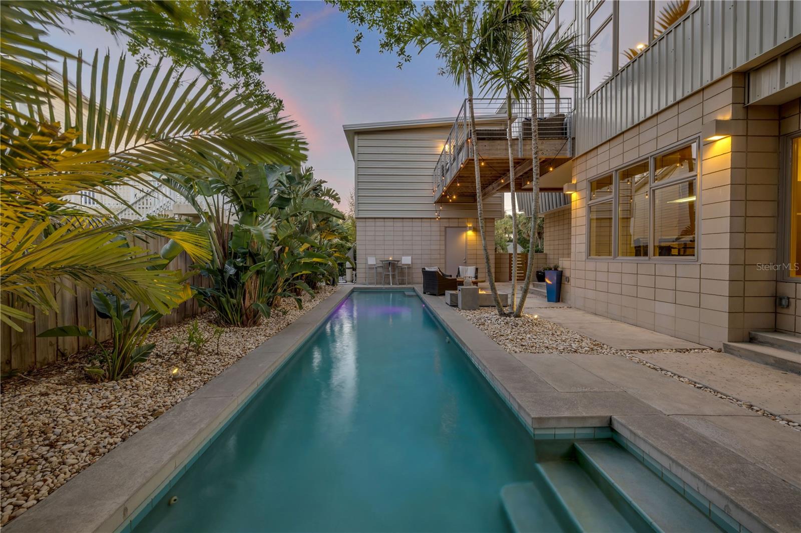 North Beach gated 3Br, 3 Ba contemporary pool home. Nestled between the Intracoastal Waterway and New Smyrna’s Beach this home exudes curb appeal and is just steps to the beach and dune walk-over. Once through the gated driveway, lush tropical landscaping welcomes you. This custom home features polished concrete and Eucalyptus wood floors, and 25’ ceilings. The first floor bedroom is accessed through double doors in the foyer and adjacent to the bedroom you will find a full bathroom with floor to ceiling decorative tile. The gourmet kitchen features Italian Valcucine cabinets, stainless steel Wolf and Miele appliances, quartz countertops, two sinks and a spacious walk-in pantry. The dining room features exposed concrete block walls with views out to the pool. The grand living space adjoins the pool and the Media room. The second floor walk-ways overlook the main floor leading to a luxurious primary suite with both walk-in and built-in closets. Primary bathroom offers dual sinks, dual shower heads and quartz countertops. Bedroom 2 with en-suite, features glass countertops and a polished concrete tub. The 2nd floor laundry room with deep stainless steel utility tub is conveniently located. Two-story garage/guest house has additional bonus space suitable for workshop, mother-in-law suite or additional living space. A 40’ lap pool, covered patio, fire pit and outdoor shower enhance outdoor living. This home has newer Pac-Clad Roof and siding, whole house Generac natural gas generator, two yr 2022 A/C units & tankless hot water heater, Anderson hurricane rated windows, and Ring brand security cameras. Beach Access, Smyrna Dunes Park with dog beach and fishing pier are minutes away. Flagler Avenue’s shops, restaurants and entertainment are 1.5 miles away, a leisurely bike ride. No flood insurance required.