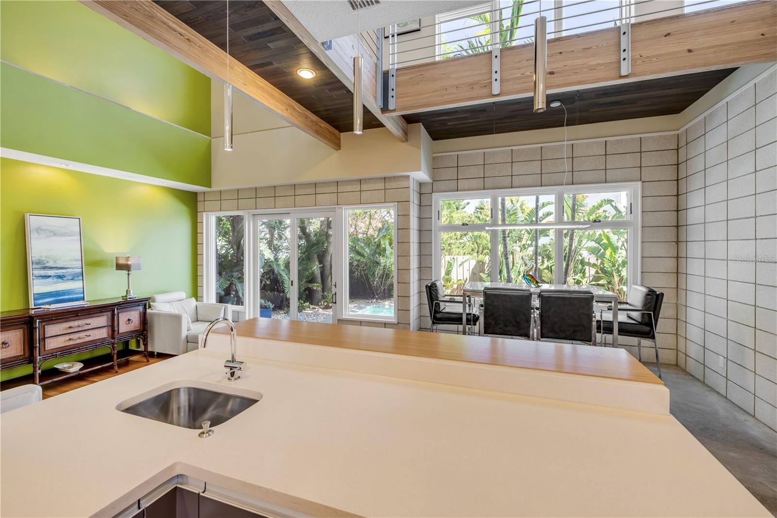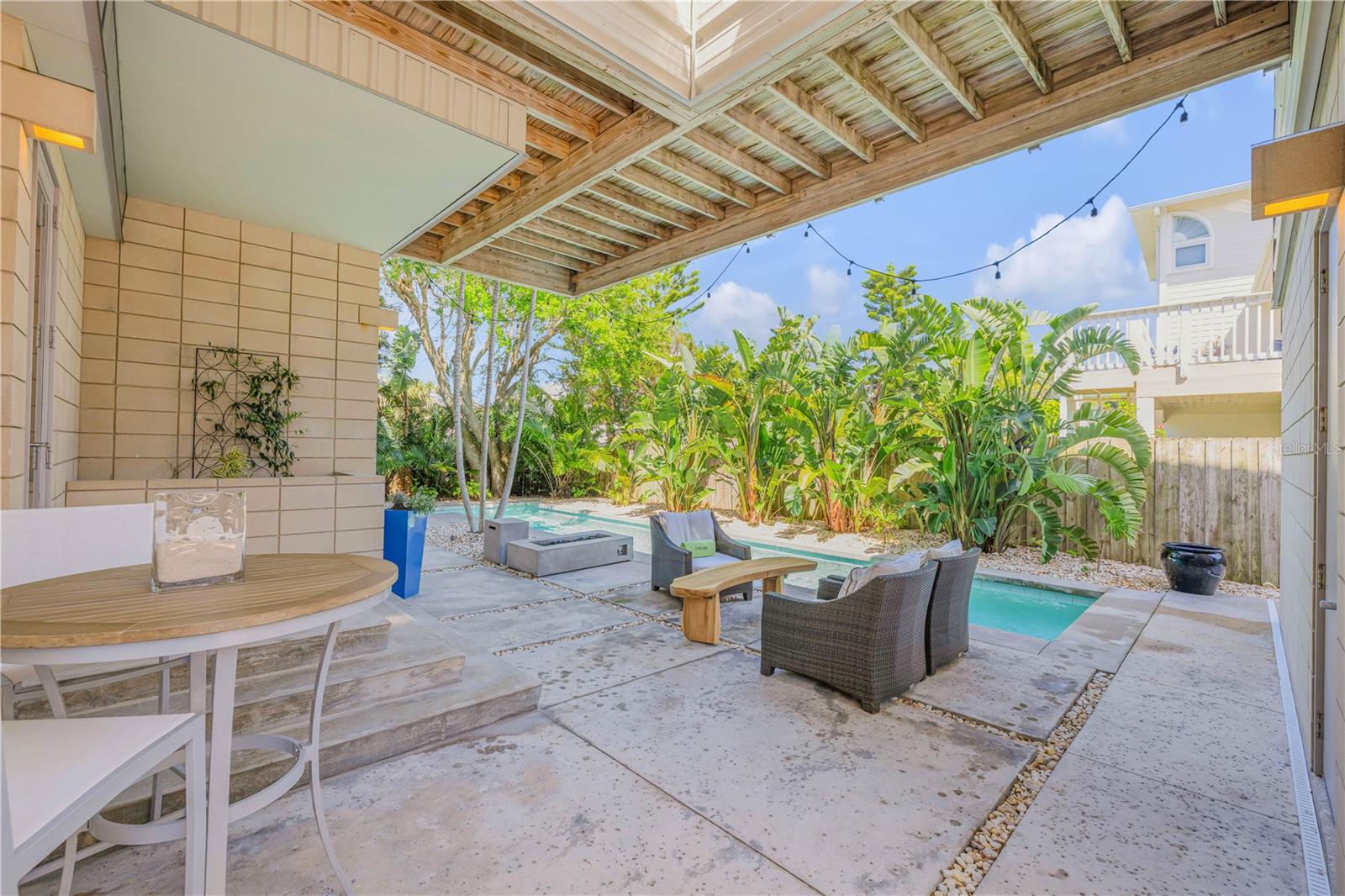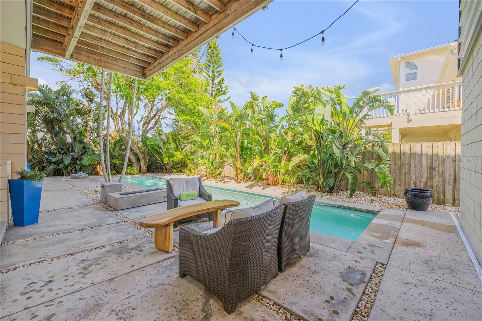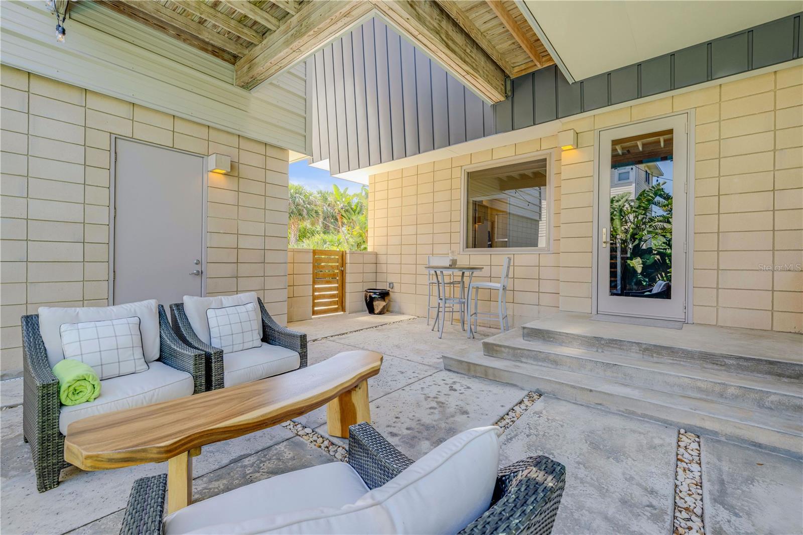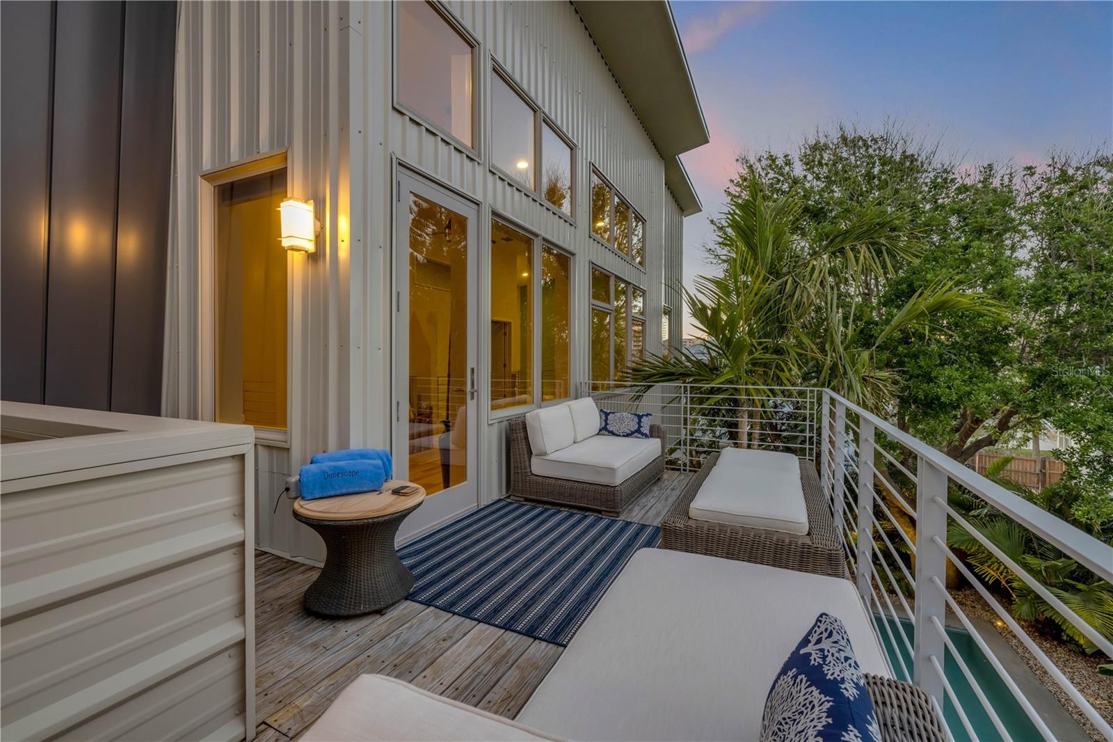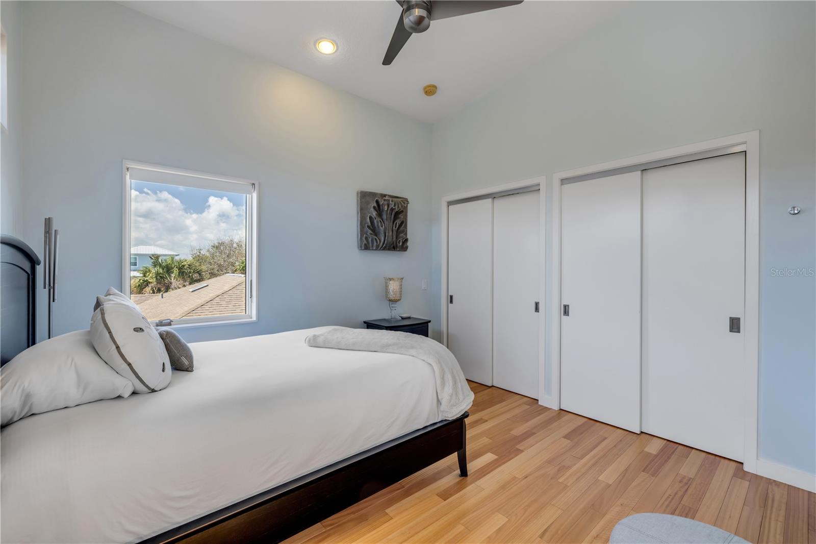 North Beach gated 3Br, 3 Ba contemporary pool home. Nestled between the Intracoastal Waterway and New Smyrna’s Beach this home exudes curb appeal and is just steps to the beach and dune walk-over. Once through the gated driveway, lush tropical landscaping welcomes you. This custom home features polished concrete and Eucalyptus wood floors, and 25’ ceilings. The first floor bedroom is accessed through double doors in the foyer and adjacent to the bedroom you will find a full bathroom with floor to ceiling decorative tile. The gourmet kitchen features Italian Valcucine cabinets, stainless steel Wolf and Miele appliances, quartz countertops, two sinks and a spacious walk-in pantry. The dining room features exposed concrete block walls with views out to the pool. The grand living space adjoins the pool and the Media room. The second floor walk-ways overlook the main floor leading to a luxurious primary suite with both walk-in and built-in closets. Primary bathroom offers dual sinks, dual shower heads and quartz countertops. Bedroom 2 with en-suite, features glass countertops and a polished concrete tub. The 2nd floor laundry room with deep stainless steel utility tub is conveniently located. Two-story garage/guest house has additional bonus space suitable for workshop, mother-in-law suite or additional living space. A 40’ lap pool, covered patio, fire pit and outdoor shower enhance outdoor living. This home has newer Pac-Clad Roof and siding, whole house Generac natural gas generator, two yr 2022 A/C units & tankless hot water heater, Anderson hurricane rated windows, and Ring brand security cameras. Beach Access, Smyrna Dunes Park with dog beach and fishing pier are minutes away. Flagler Avenue’s shops, restaurants and entertainment are 1.5 miles away, a leisurely bike ride. No flood insurance required.