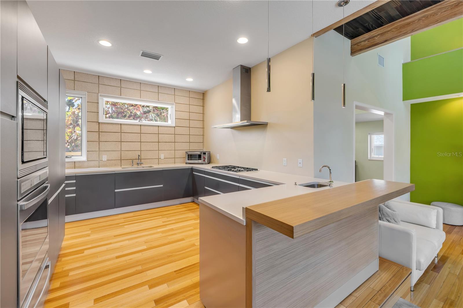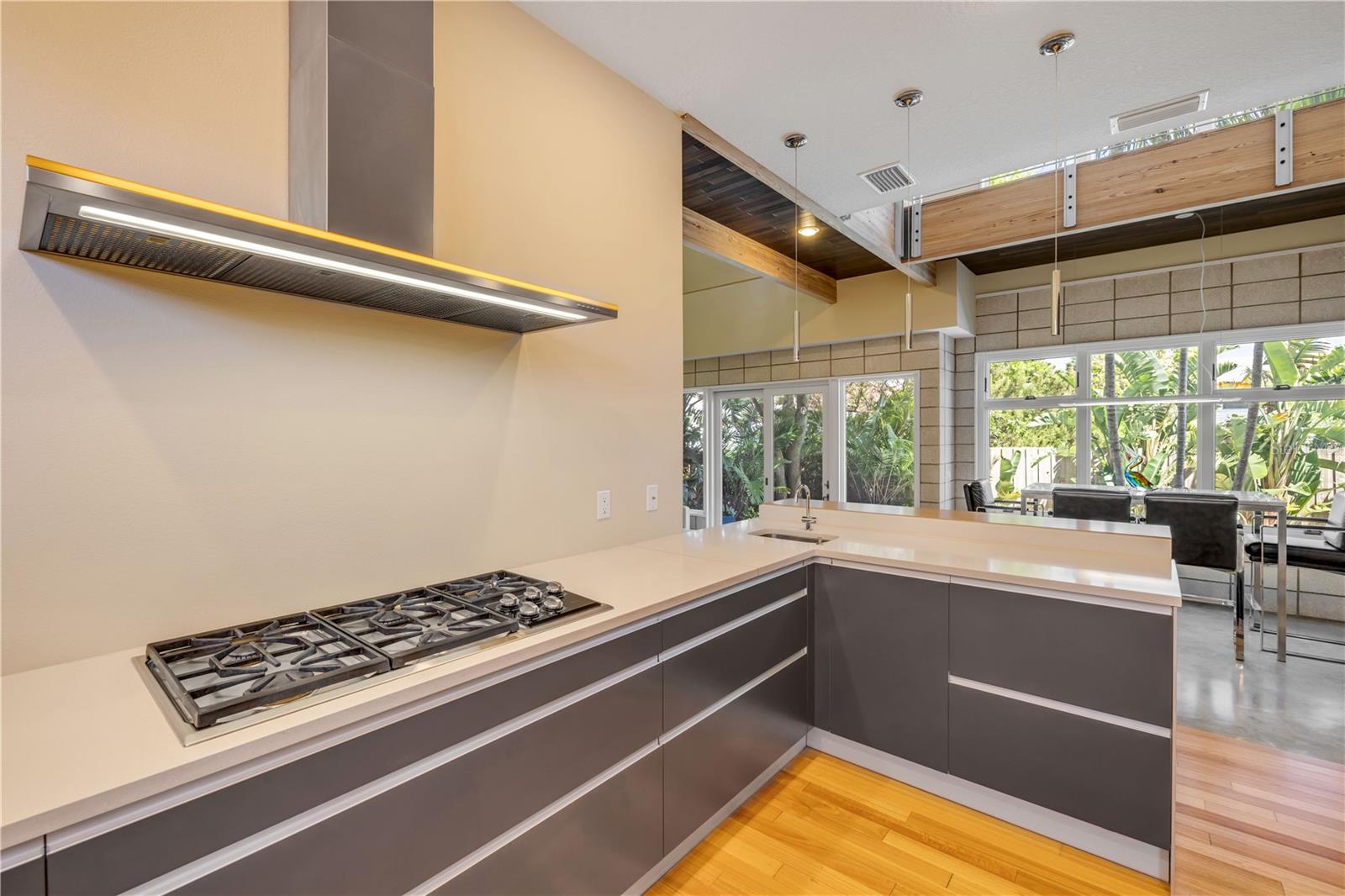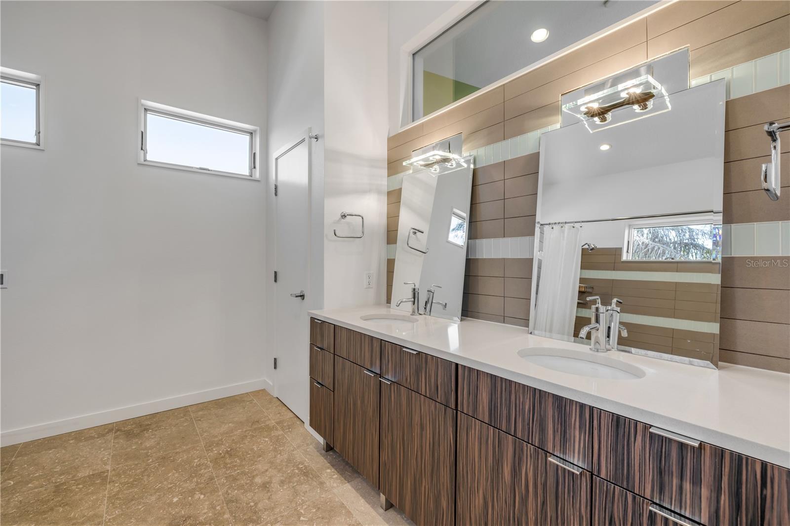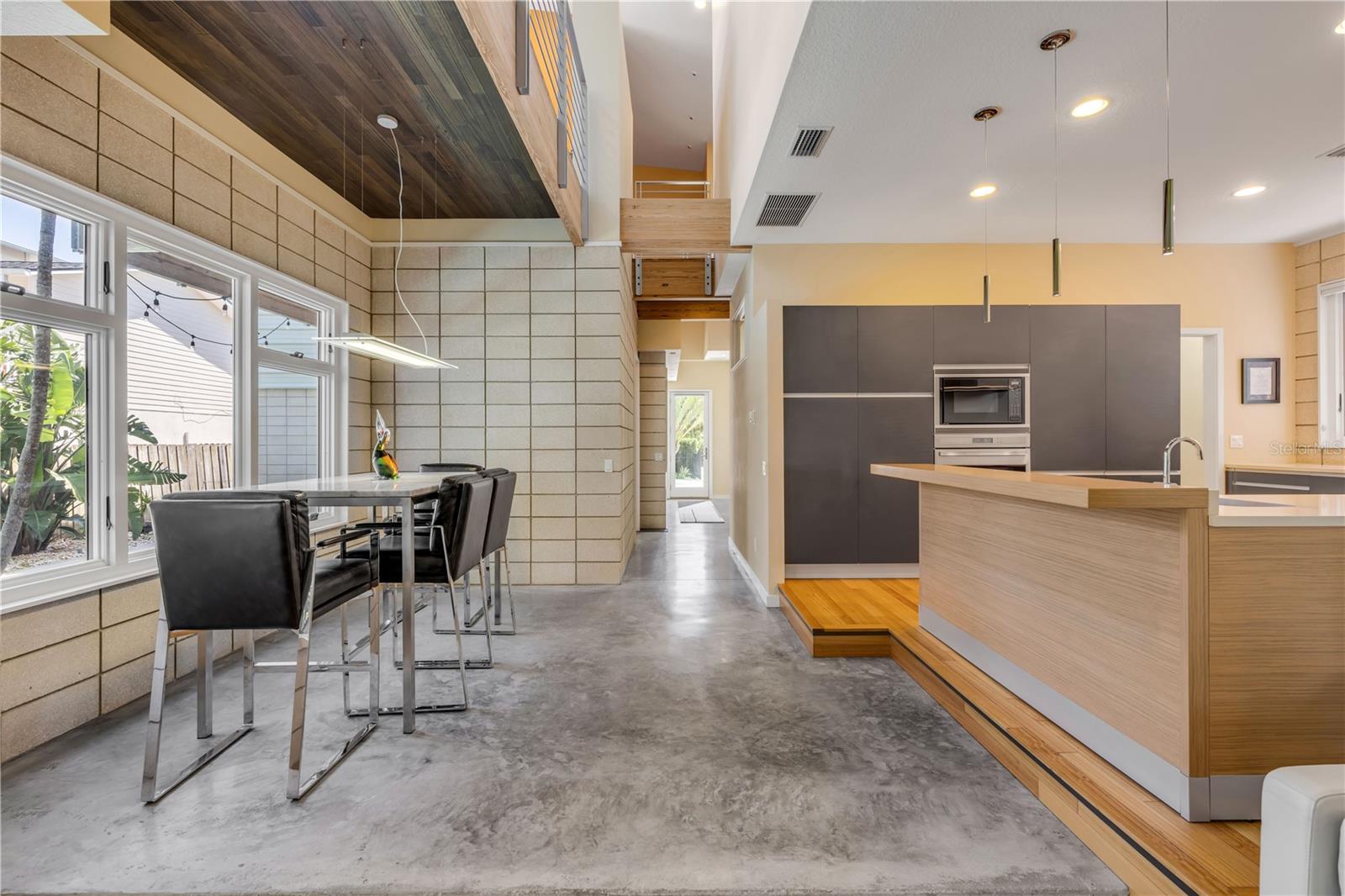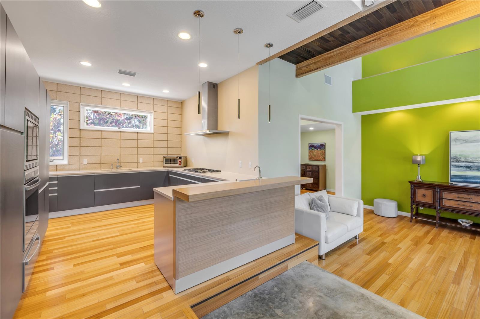 North Beach gated 3Br, 3 Ba contemporary pool home. Nestled between the Intracoastal Waterway and New Smyrna’s Beach this home exudes curb appeal and is just steps to the beach and dune walk-over. Once through the gated driveway, lush tropical landscaping welcomes you. This custom home features polished concrete and Eucalyptus wood floors, and 25’ ceilings. The first floor bedroom is accessed through double doors in the foyer and adjacent to the bedroom you will find a full bathroom with floor to ceiling decorative tile. The gourmet kitchen features Italian Valcucine cabinets, stainless steel Wolf and Miele appliances, quartz countertops, two sinks and a spacious walk-in pantry. The dining room features exposed concrete block walls with views out to the pool. The grand living space adjoins the pool and the Media room. The second floor walk-ways overlook the main floor leading to a luxurious primary suite with both walk-in and built-in closets. Primary bathroom offers dual sinks, dual shower heads and quartz countertops. Bedroom 2 with en-suite, features glass countertops and a polished concrete tub. The 2nd floor laundry room with deep stainless steel utility tub is conveniently located. Two-story garage/guest house has additional bonus space suitable for workshop, mother-in-law suite or additional living space. A 40’ lap pool, covered patio, fire pit and outdoor shower enhance outdoor living. This home has newer Pac-Clad Roof and siding, whole house Generac natural gas generator, two yr 2022 A/C units & tankless hot water heater, Anderson hurricane rated windows, and Ring brand security cameras. Beach Access, Smyrna Dunes Park with dog beach and fishing pier are minutes away. Flagler Avenue’s shops, restaurants and entertainment are 1.5 miles away, a leisurely bike ride. No flood insurance required.
