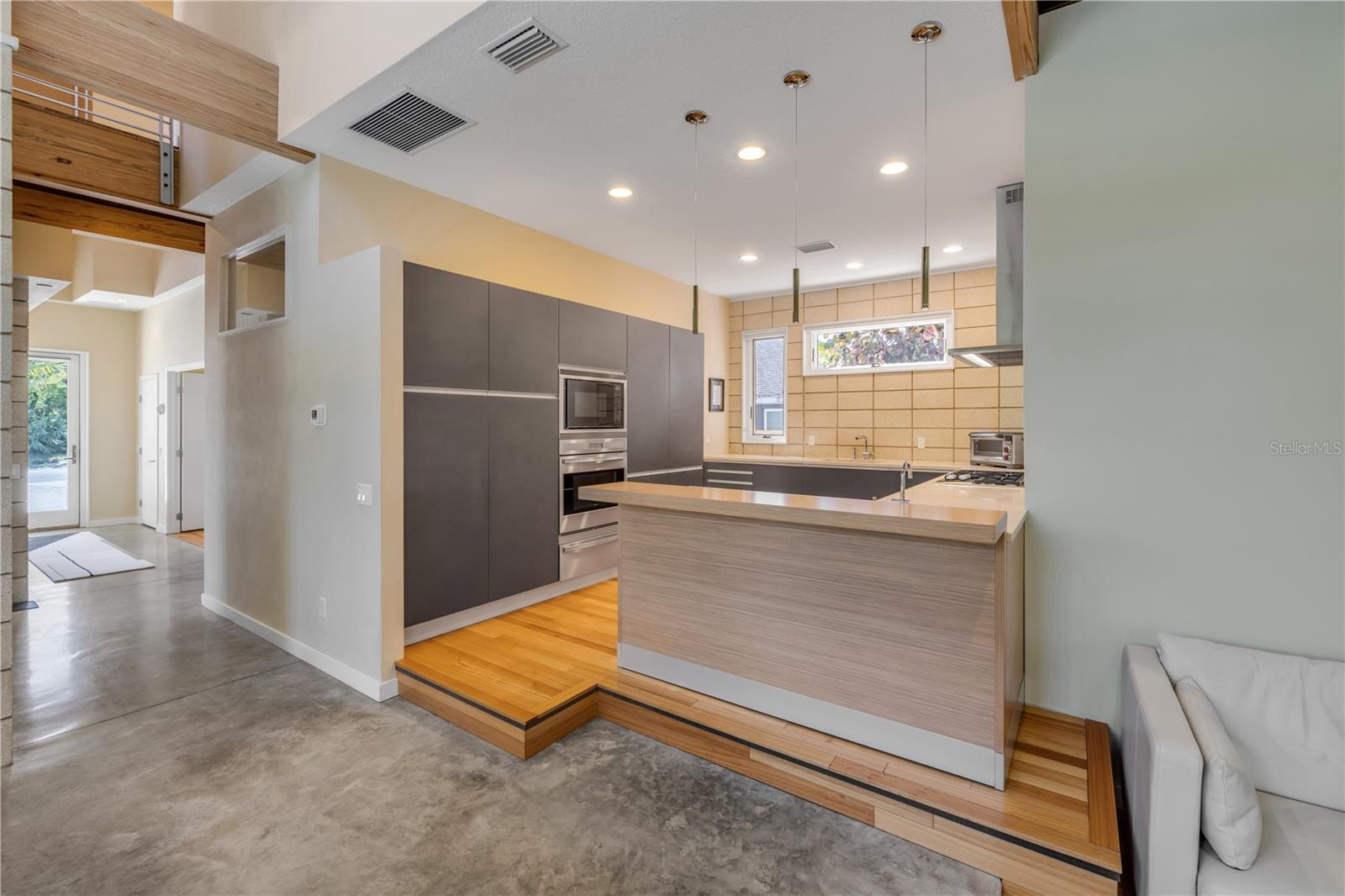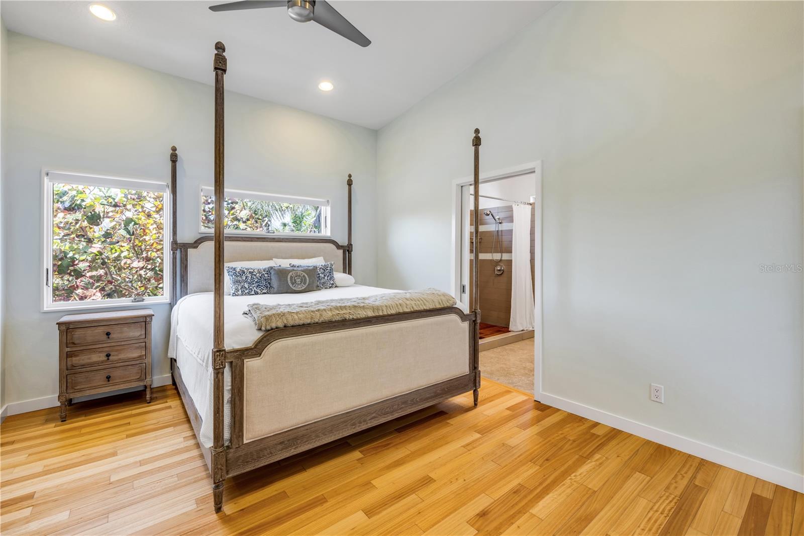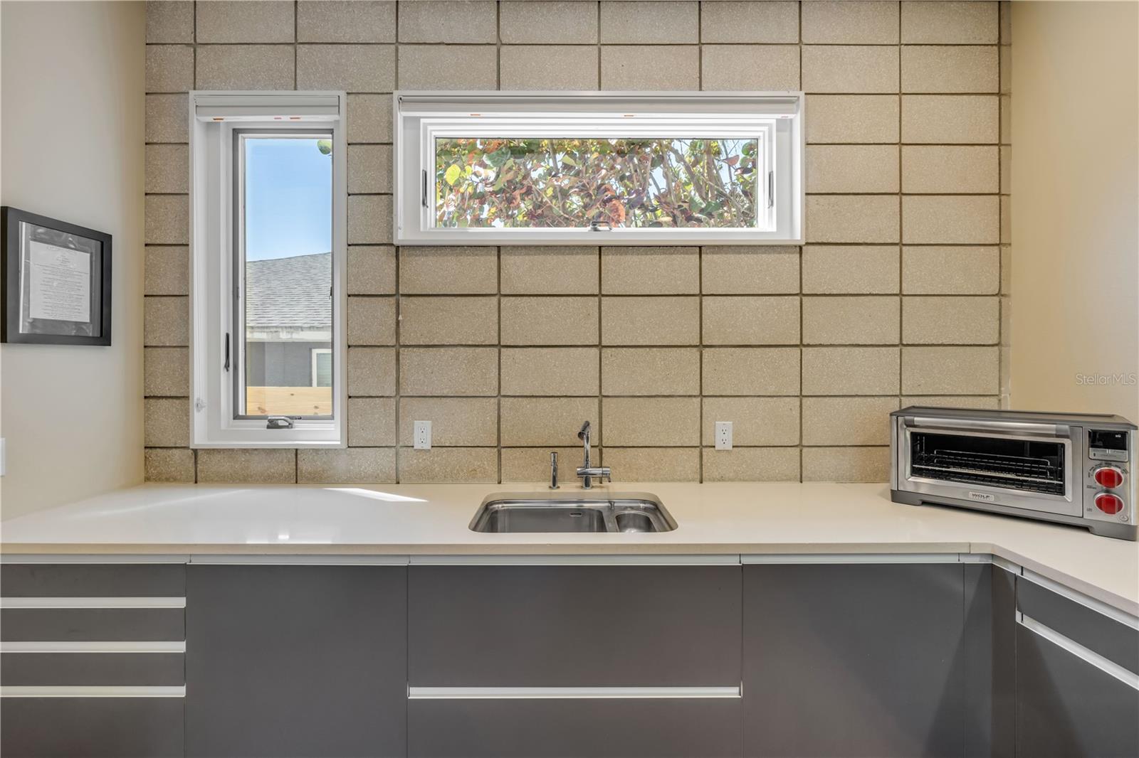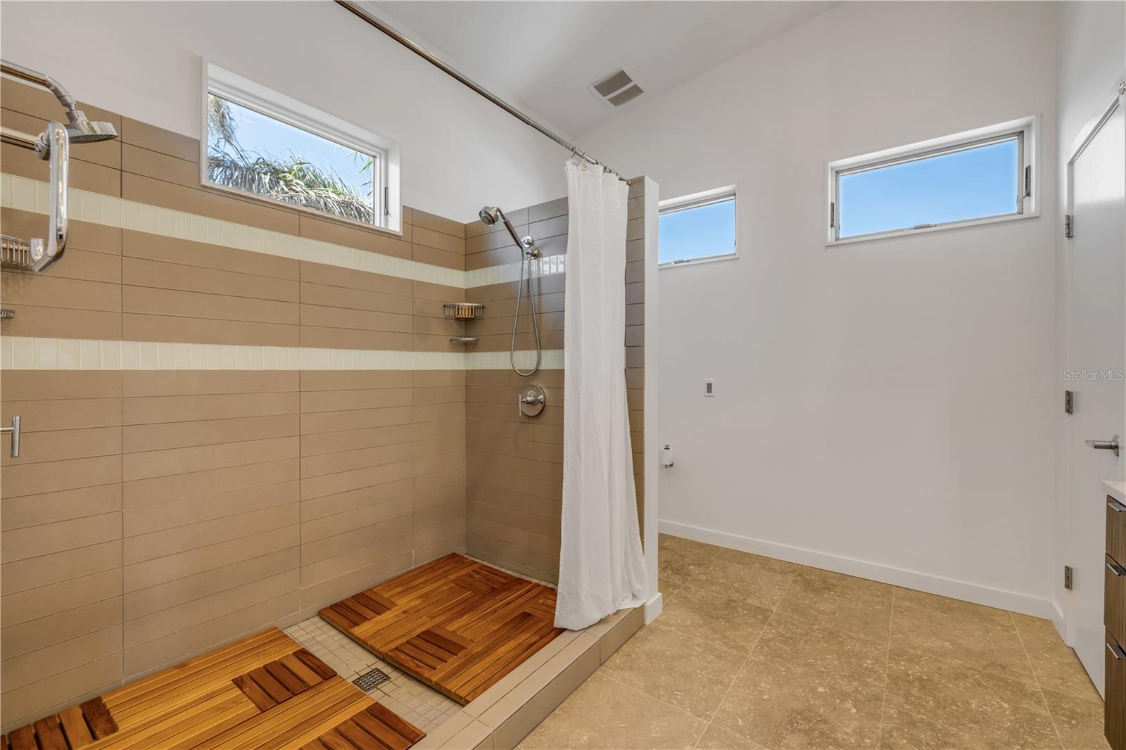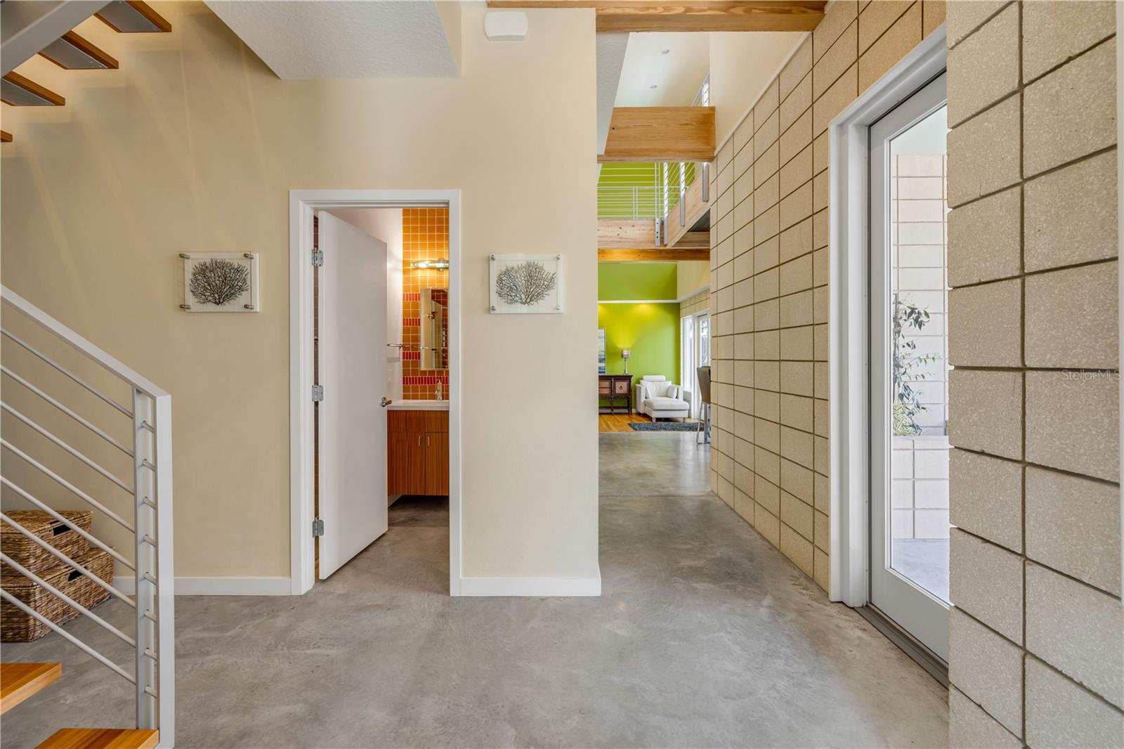 North Beach gated 3Br, 3 Ba contemporary pool home. Nestled between the Intracoastal Waterway and New Smyrna’s Beach this home exudes curb appeal and is just steps to the beach and dune walk-over. Once through the gated driveway, lush tropical landscaping welcomes you. This custom home features polished concrete and Eucalyptus wood floors, and 25’ ceilings. The first floor bedroom is accessed through double doors in the foyer and adjacent to the bedroom you will find a full bathroom with floor to ceiling decorative tile. The gourmet kitchen features Italian Valcucine cabinets, stainless steel Wolf and Miele appliances, quartz countertops, two sinks and a spacious walk-in pantry. The dining room features exposed concrete block walls with views out to the pool. The grand living space adjoins the pool and the Media room. The second floor walk-ways overlook the main floor leading to a luxurious primary suite with both walk-in and built-in closets. Primary bathroom offers dual sinks, dual shower heads and quartz countertops. Bedroom 2 with en-suite, features glass countertops and a polished concrete tub. The 2nd floor laundry room with deep stainless steel utility tub is conveniently located. Two-story garage/guest house has additional bonus space suitable for workshop, mother-in-law suite or additional living space. A 40’ lap pool, covered patio, fire pit and outdoor shower enhance outdoor living. This home has newer Pac-Clad Roof and siding, whole house Generac natural gas generator, two yr 2022 A/C units & tankless hot water heater, Anderson hurricane rated windows, and Ring brand security cameras. Beach Access, Smyrna Dunes Park with dog beach and fishing pier are minutes away. Flagler Avenue’s shops, restaurants and entertainment are 1.5 miles away, a leisurely bike ride. No flood insurance required.