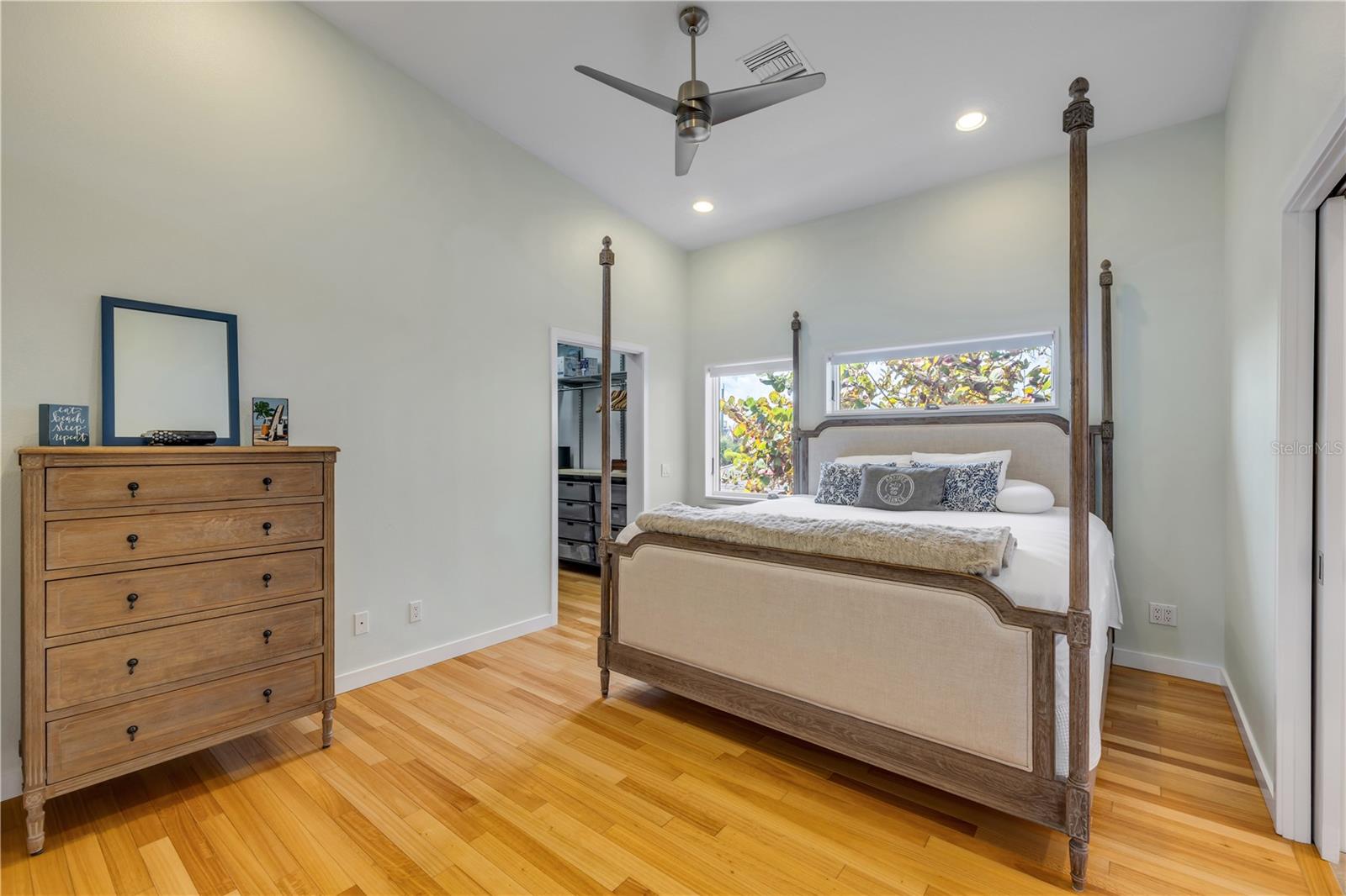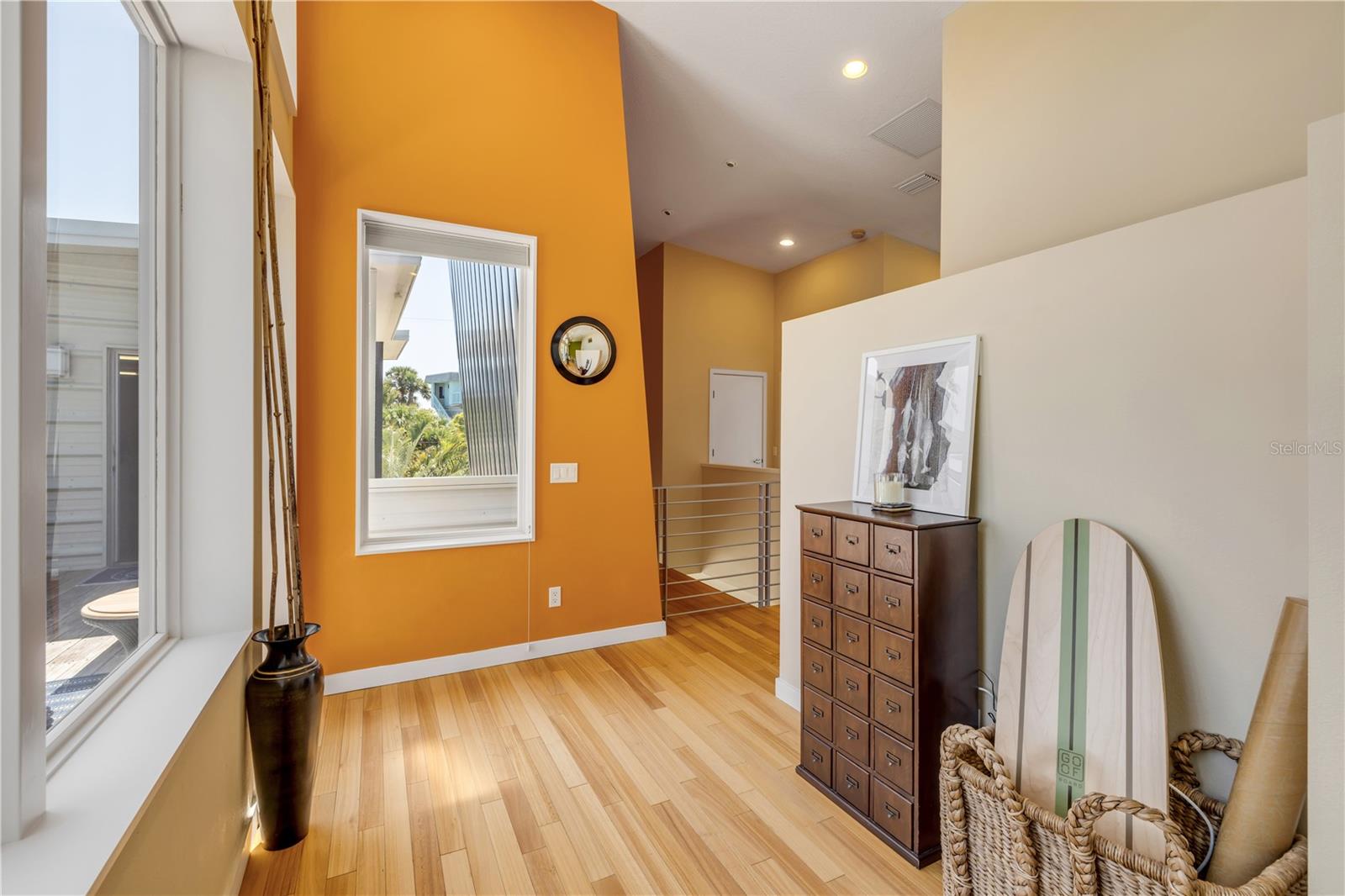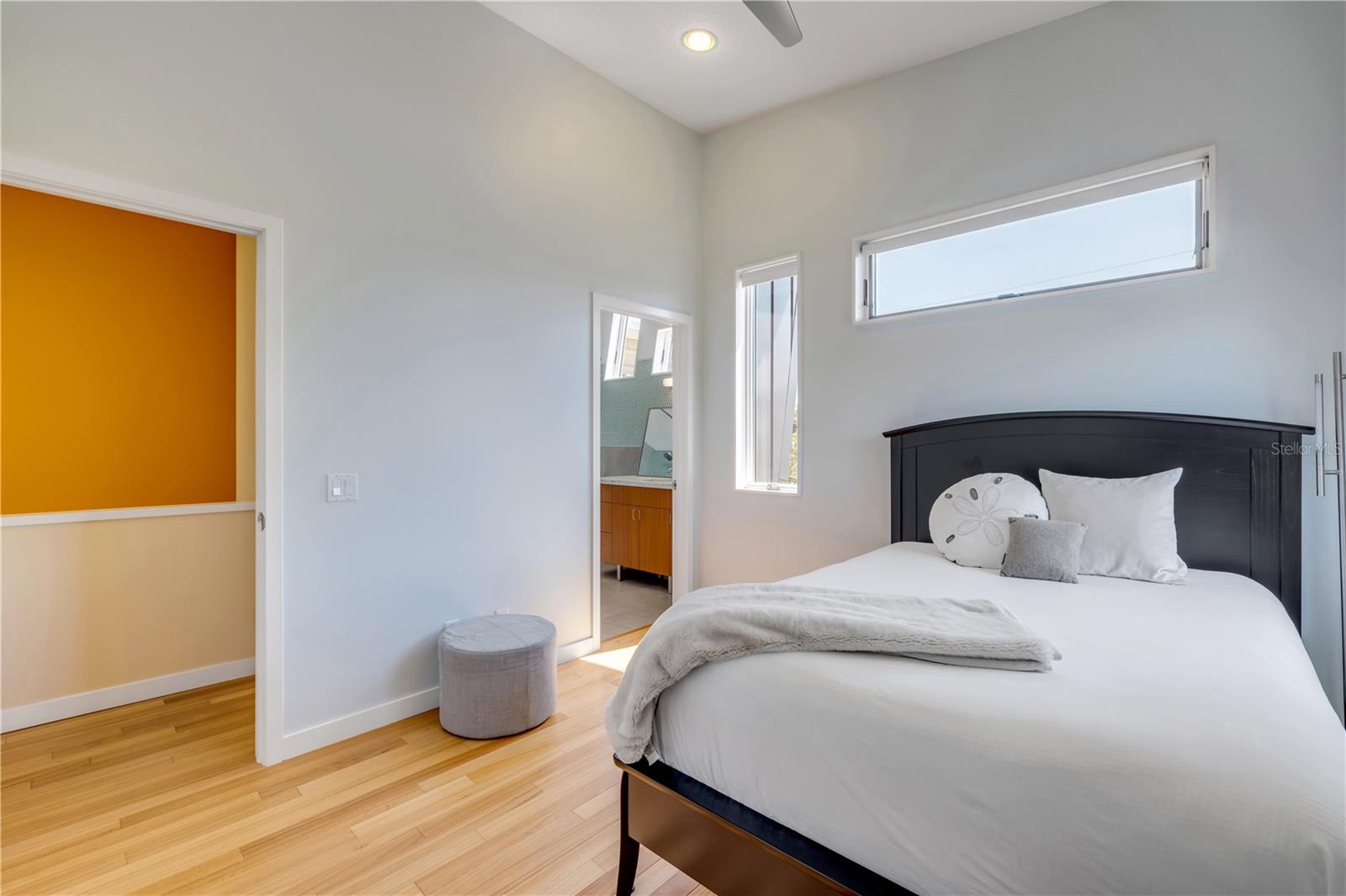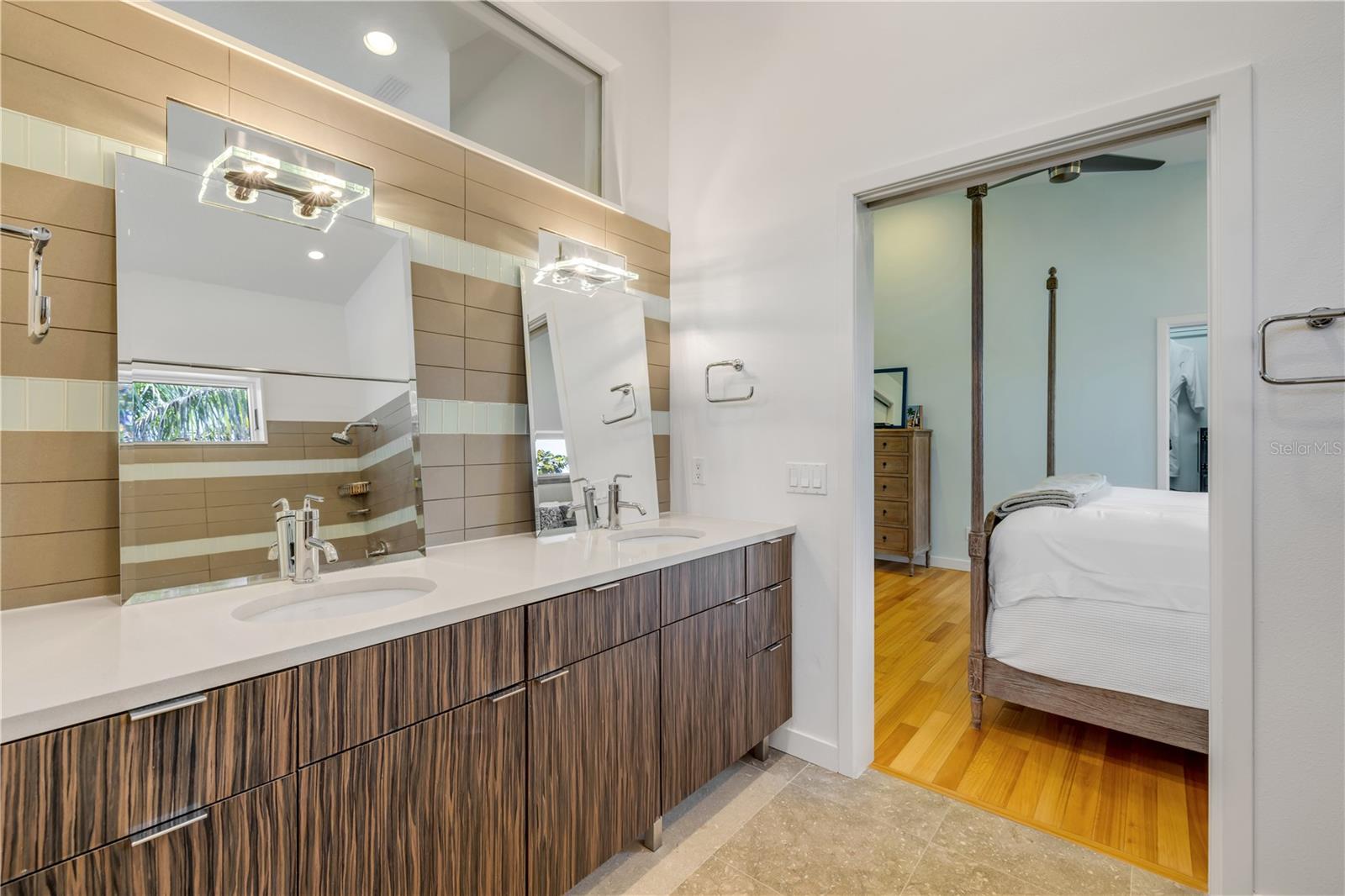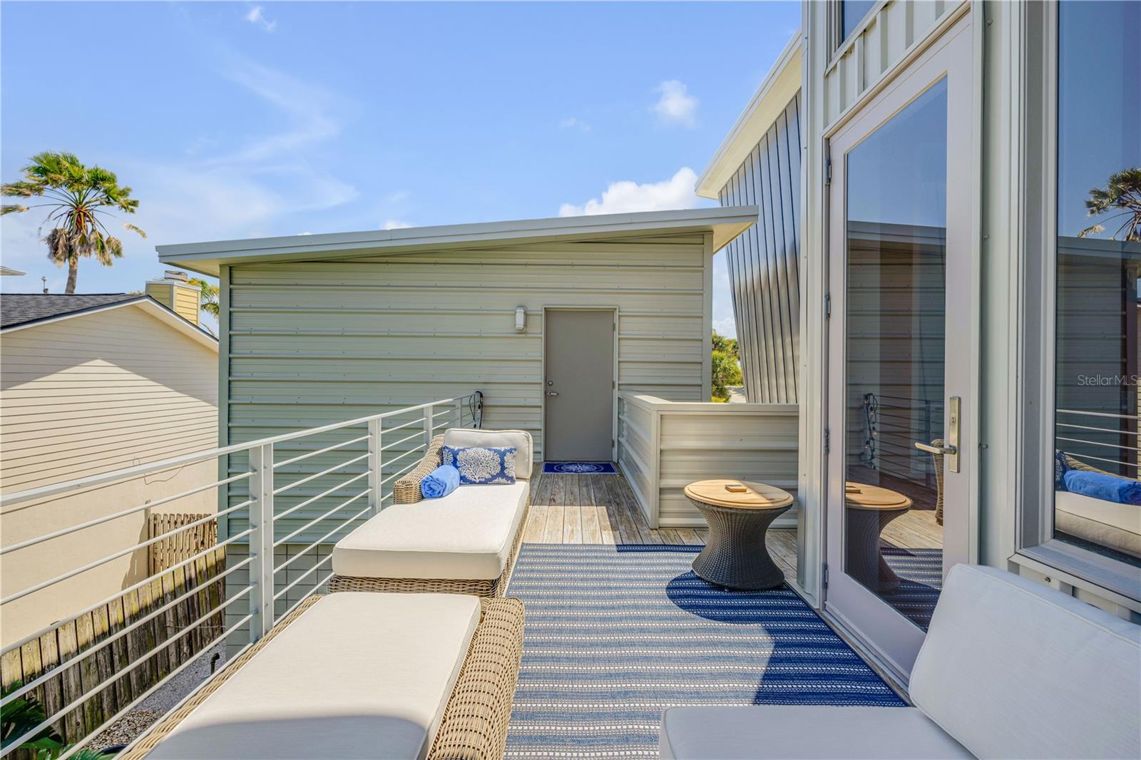 North Beach gated 3Br, 3 Ba contemporary pool home. Nestled between the Intracoastal Waterway and New Smyrna’s Beach this home exudes curb appeal and is just steps to the beach and dune walk-over. Once through the gated driveway, lush tropical landscaping welcomes you. This custom home features polished concrete and Eucalyptus wood floors, and 25’ ceilings. The first floor bedroom is accessed through double doors in the foyer and adjacent to the bedroom you will find a full bathroom with floor to ceiling decorative tile. The gourmet kitchen features Italian Valcucine cabinets, stainless steel Wolf and Miele appliances, quartz countertops, two sinks and a spacious walk-in pantry. The dining room features exposed concrete block walls with views out to the pool. The grand living space adjoins the pool and the Media room. The second floor walk-ways overlook the main floor leading to a luxurious primary suite with both walk-in and built-in closets. Primary bathroom offers dual sinks, dual shower heads and quartz countertops. Bedroom 2 with en-suite, features glass countertops and a polished concrete tub. The 2nd floor laundry room with deep stainless steel utility tub is conveniently located. Two-story garage/guest house has additional bonus space suitable for workshop, mother-in-law suite or additional living space. A 40’ lap pool, covered patio, fire pit and outdoor shower enhance outdoor living. This home has newer Pac-Clad Roof and siding, whole house Generac natural gas generator, two yr 2022 A/C units & tankless hot water heater, Anderson hurricane rated windows, and Ring brand security cameras. Beach Access, Smyrna Dunes Park with dog beach and fishing pier are minutes away. Flagler Avenue’s shops, restaurants and entertainment are 1.5 miles away, a leisurely bike ride. No flood insurance required.
