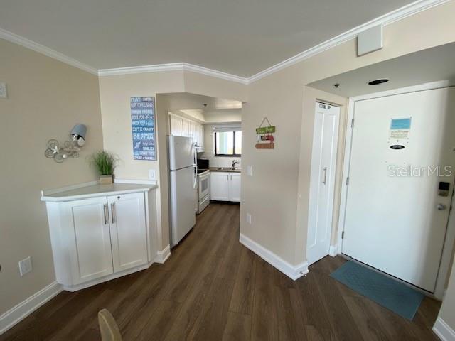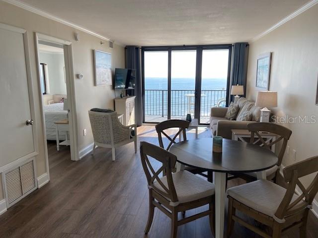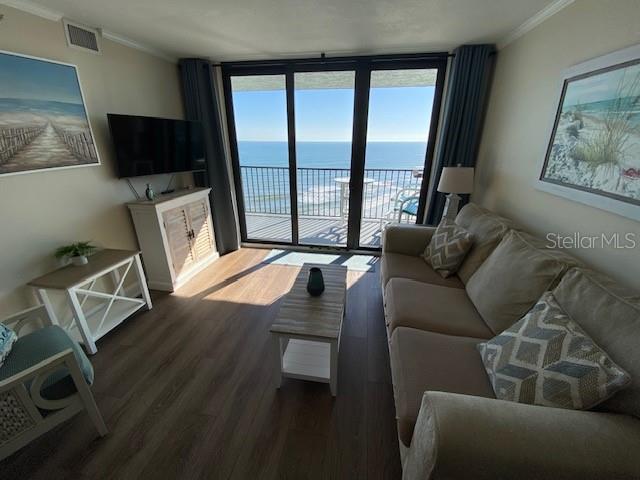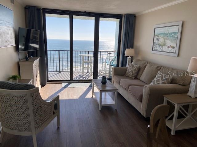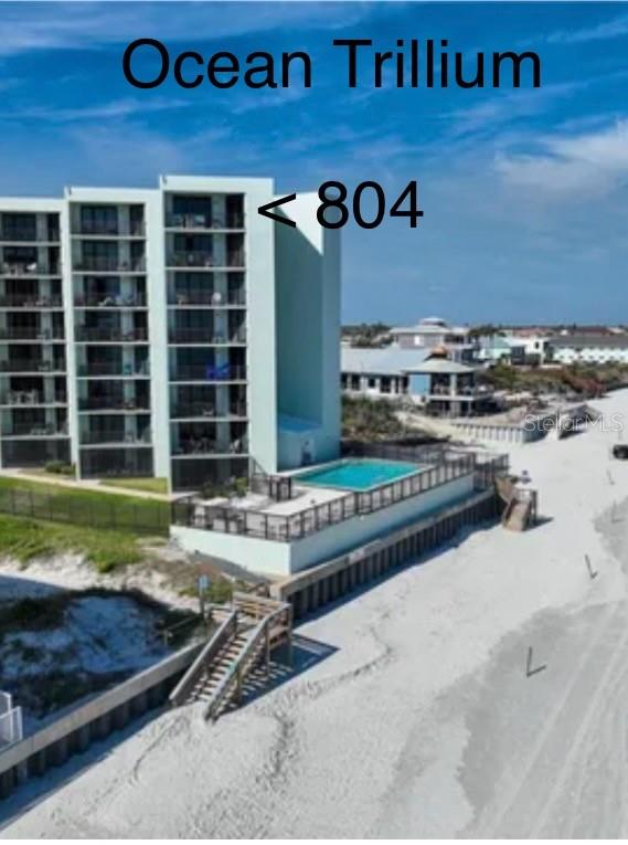 Ocean Trillium unit 804 is a 1 bdrm / 1 bath condo with exceptional privacy and views of beautiful New Smyrna Beach. The unit has water views from all rooms and is located on the top floor closest to the beach. The balcony is private with no adjacent balconies. The front entry also has an additional seating area and unobstructed views of the North end of the beach. There are many restaurants that are within walking distance from the unit. The unit is exceptionally clean and recently had new flooring installed along with crown molding in the living room & bedroom. The A/C was replaced less than two years ago. The monthly HOA includes all utilities ( electric, water, cable, wifi ). Washers and dryers are on site. The pool is located next to the beach with great views.