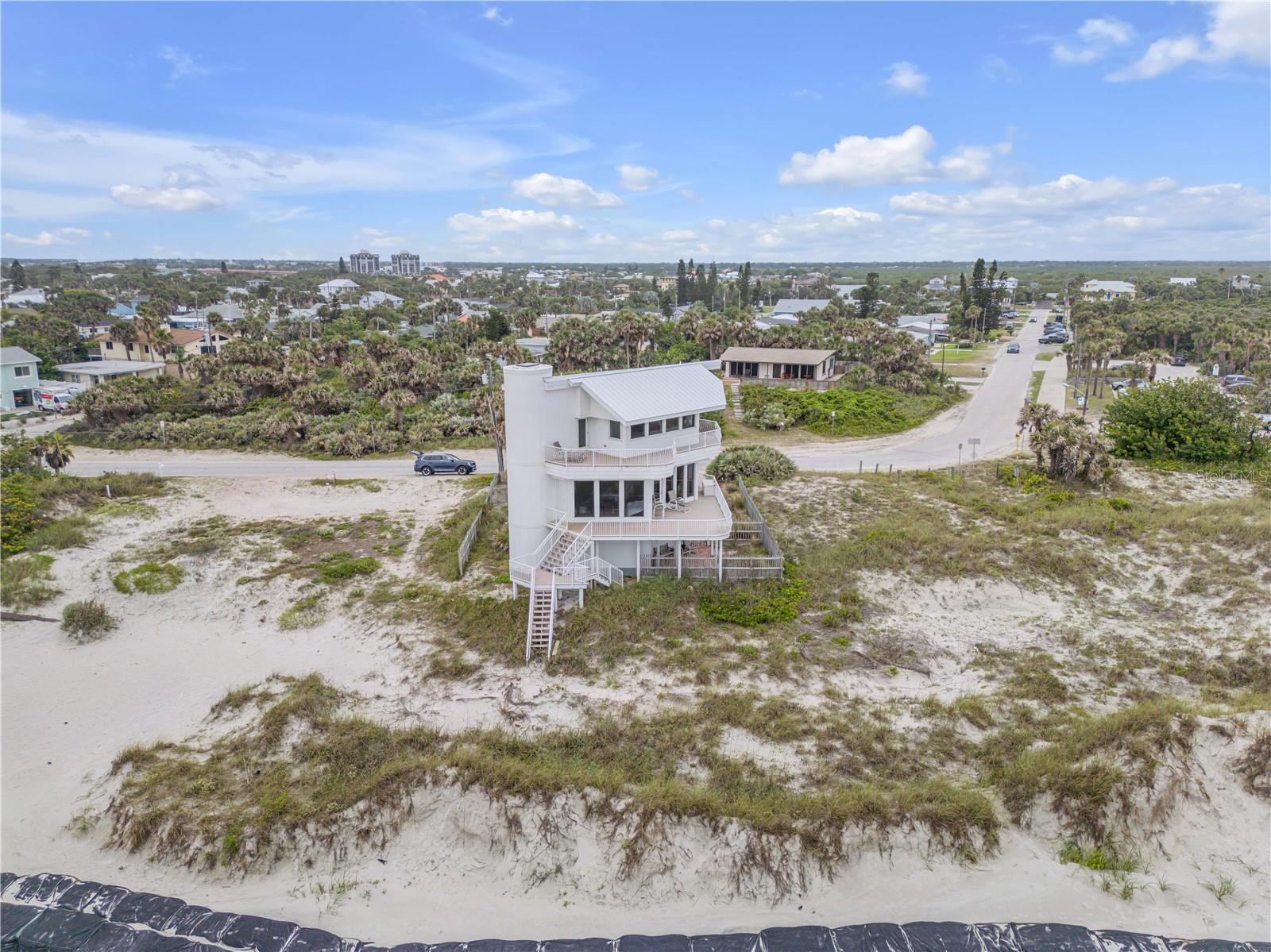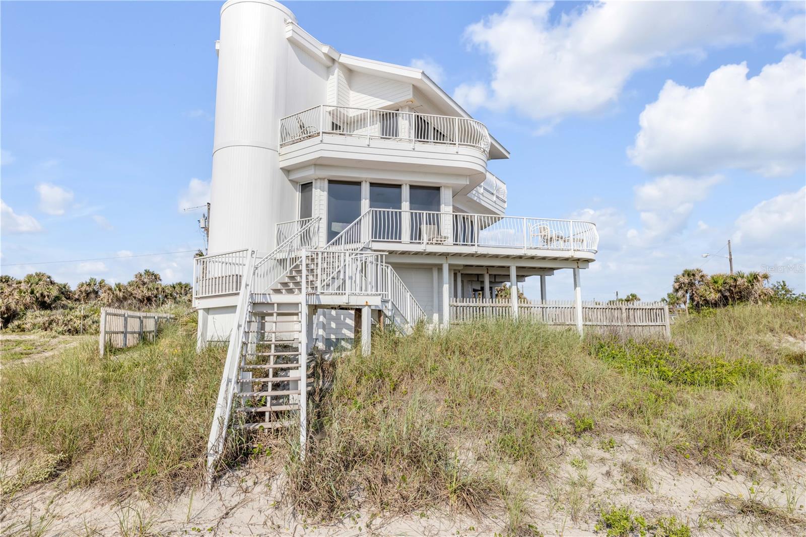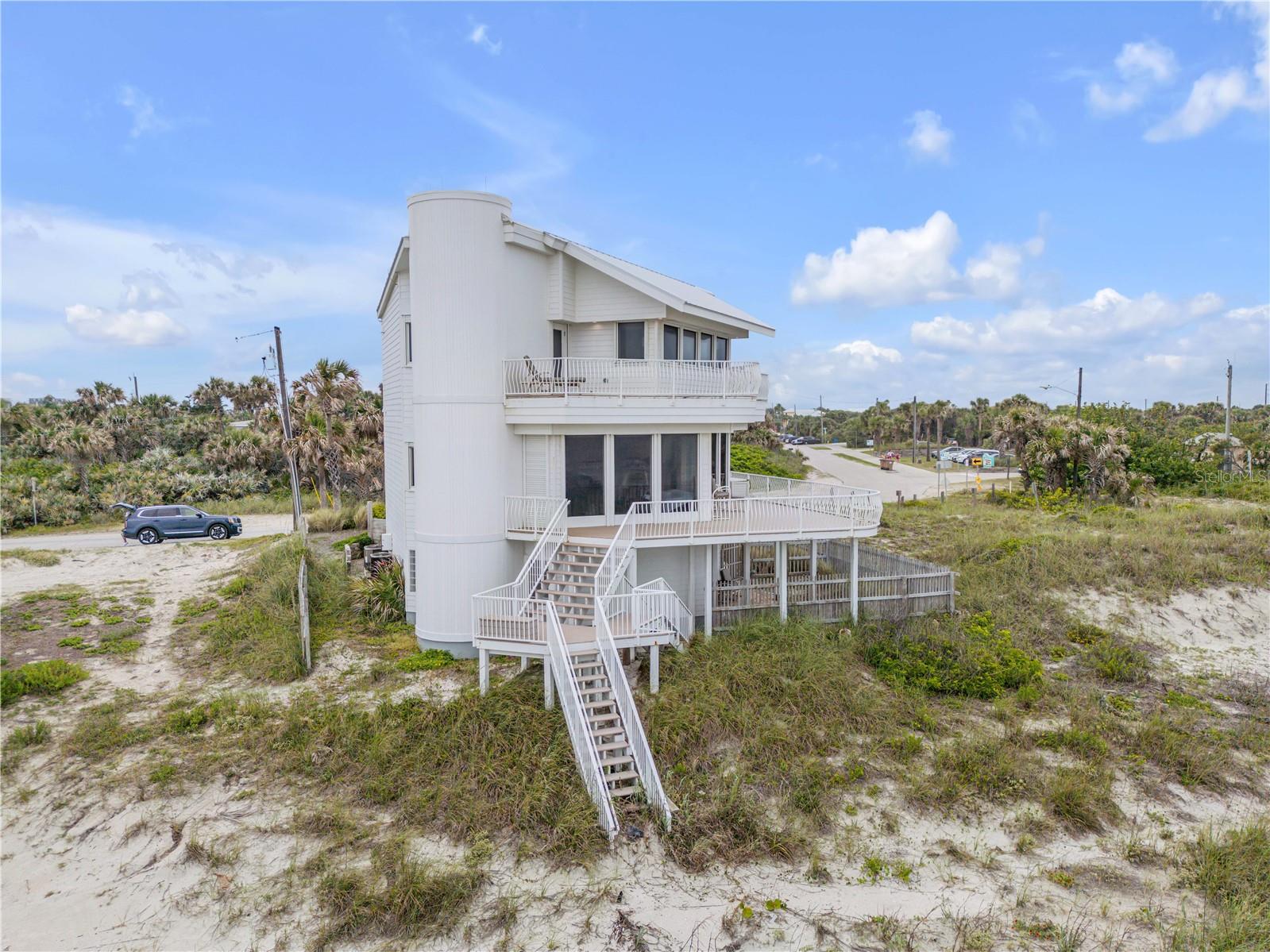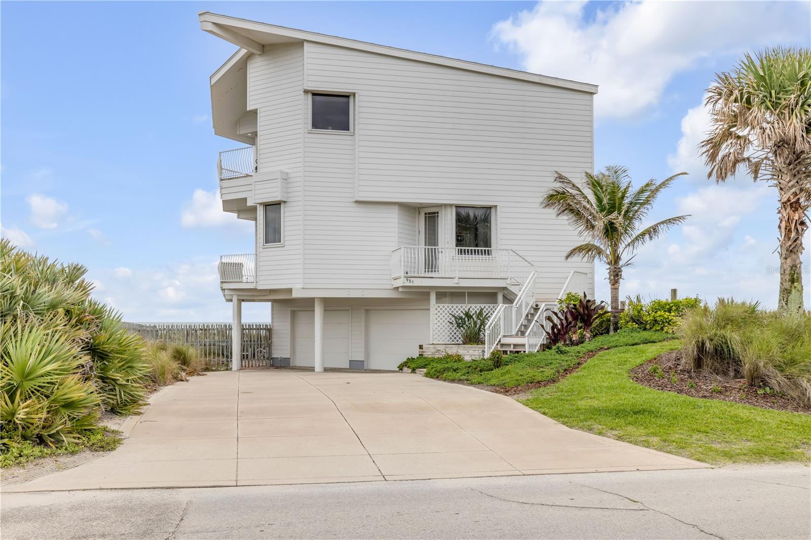 Direct Oceanfront Home. This 3-bed, 3-bath breathtaking contemporary beach home with an oversized 2-car garage is on a corner lot, giving it the appearance of a private island retreat. Designed by Bruce Krall, this iconic 3-story concrete pier fortress offers uninterrupted views of the ocean, sunrises, and surf from walls of windows and multiple balconies. With east-west doors open, enjoy constant ocean breezes that make every day feel like a vacation. The home features Rolladen storm shutters (regularly maintained) and a new 2024 roof. The ground level includes garage parking, laundry, utility sink, storage, outdoor patios, and space for a dog run. A turret stairwell leads to the open-concept second floor with sweeping ocean views. A chef's kitchen with bamboo cabinetry, glass backsplash, honey-toned granite, Sub-Zero fridge/freezer, Fisher & Paykel dishwashers, dual ovens, warming drawers, and a 5-burner gas range, walk-out to a patio ready for a gas grill. One full bedroom and bath complete this level. The top floor features a spacious oversized ocean front primary suite with vaulted ceilings, built-ins, walk-in closet, a primary bath with dual glass sinks, soaking tub, and separate shower. A third ensuite bedroom is located at the southwest corner of the 3rd floor. Private beach walkover and a short stroll to Flagler Avenue’s shops and dining. This is exceptional oceanfront living.
