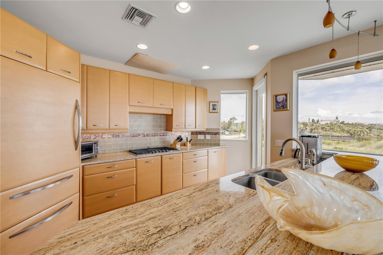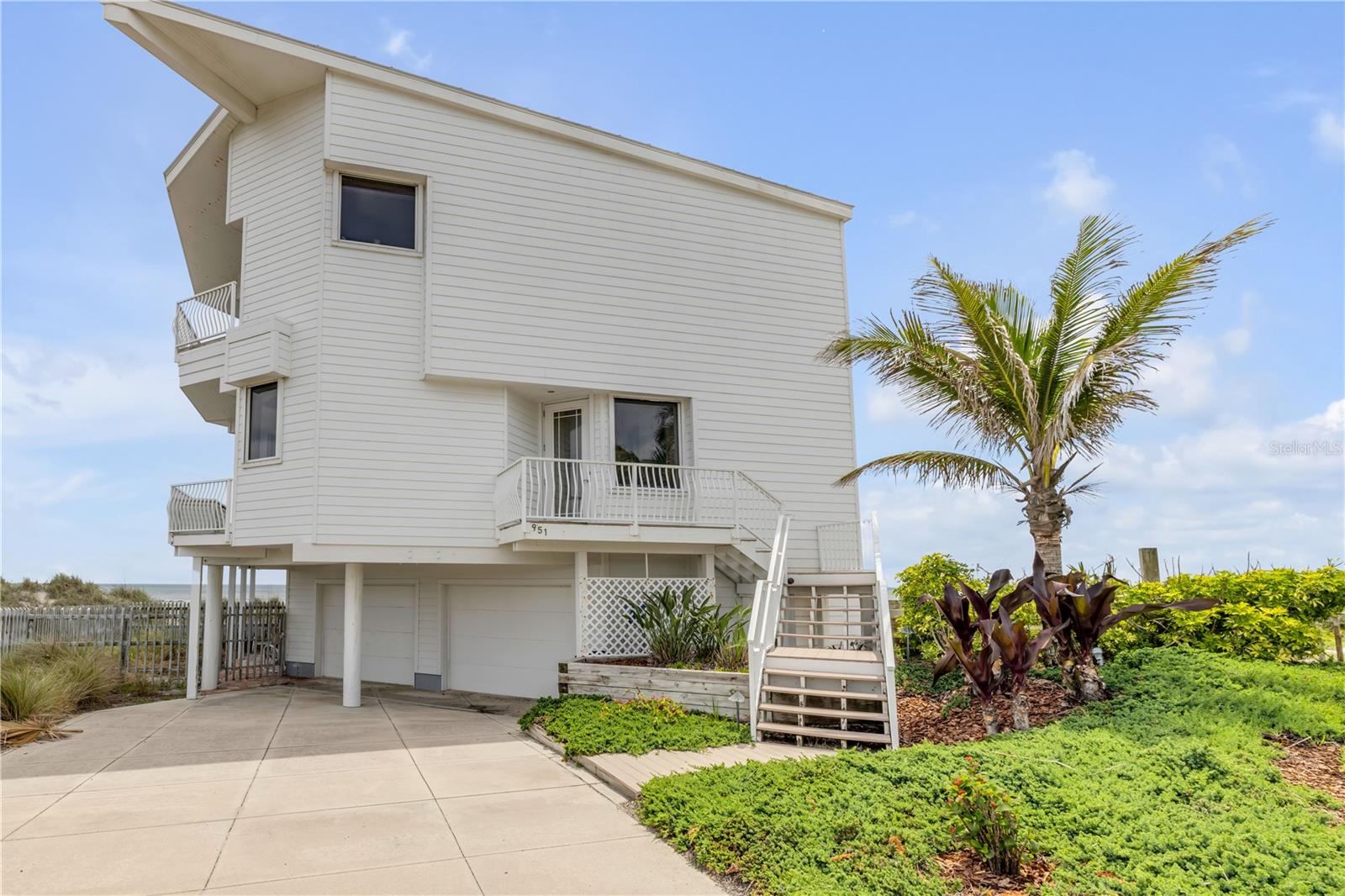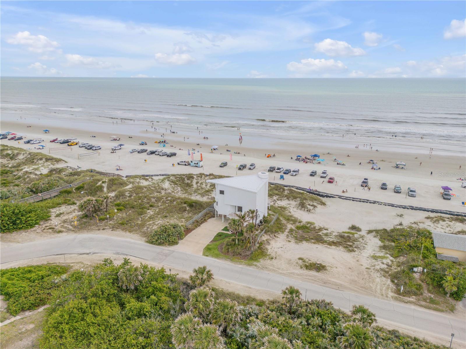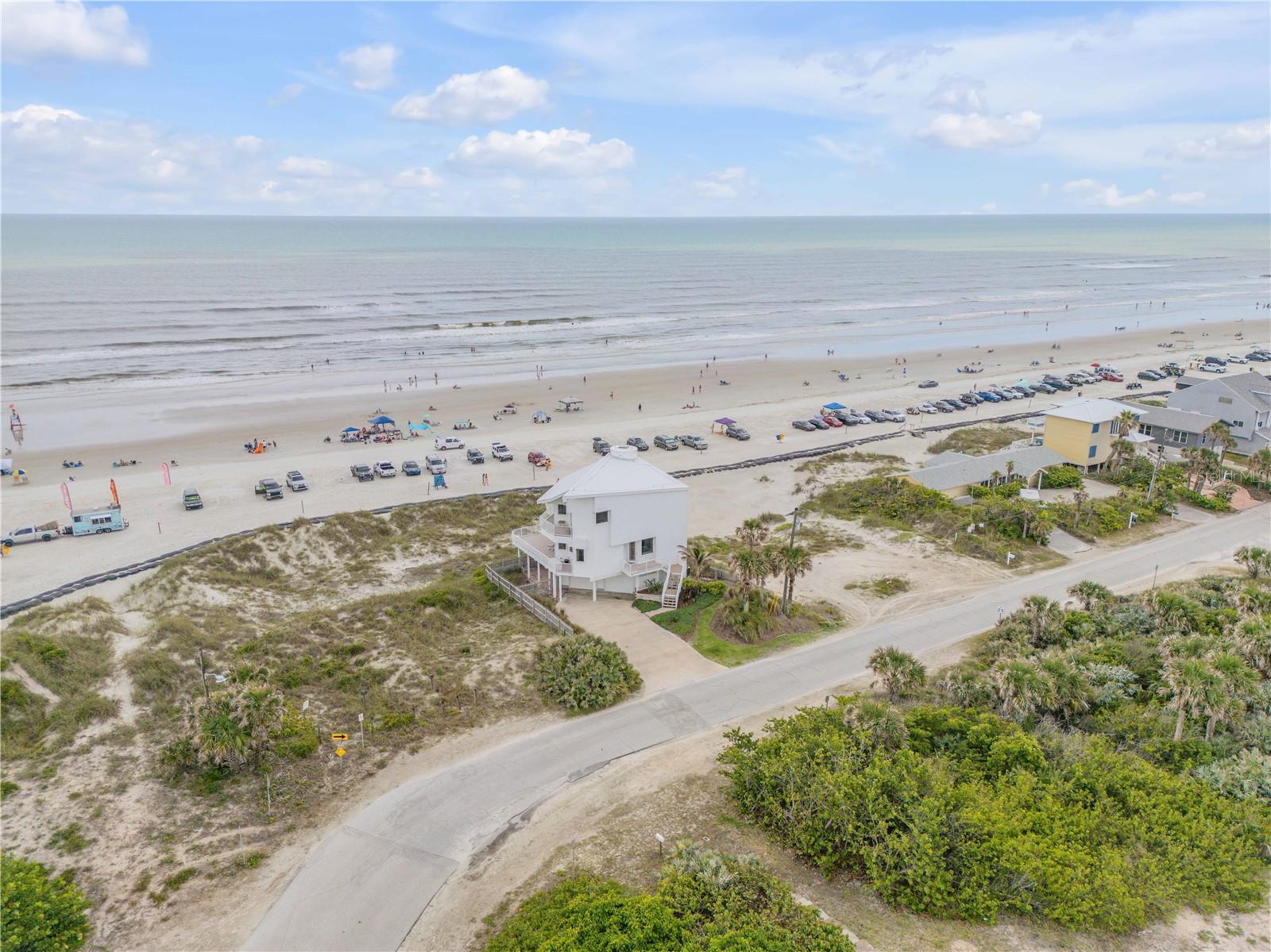 Direct Oceanfront Home. This 3-bed, 3-bath breathtaking contemporary beach home with an oversized 2-car garage is on a corner lot, giving it the appearance of a private island retreat. Designed by Bruce Krall, this iconic 3-story concrete pier fortress offers uninterrupted views of the ocean, sunrises, and surf from walls of windows and multiple balconies. With east-west doors open, enjoy constant ocean breezes that make every day feel like a vacation. The home features Rolladen storm shutters (regularly maintained) and a new 2024 roof. The ground level includes garage parking, laundry, utility sink, storage, outdoor patios, and space for a dog run. A turret stairwell leads to the open-concept second floor with sweeping ocean views. A chef's kitchen with bamboo cabinetry, glass backsplash, honey-toned granite, Sub-Zero fridge/freezer, Fisher & Paykel dishwashers, dual ovens, warming drawers, and a 5-burner gas range, walk-out to a patio ready for a gas grill. One full bedroom and bath complete this level. The top floor features a spacious oversized ocean front primary suite with vaulted ceilings, built-ins, walk-in closet, a primary bath with dual glass sinks, soaking tub, and separate shower. A third ensuite bedroom is located at the southwest corner of the 3rd floor. Private beach walkover and a short stroll to Flagler Avenue’s shops and dining. This is exceptional oceanfront living.