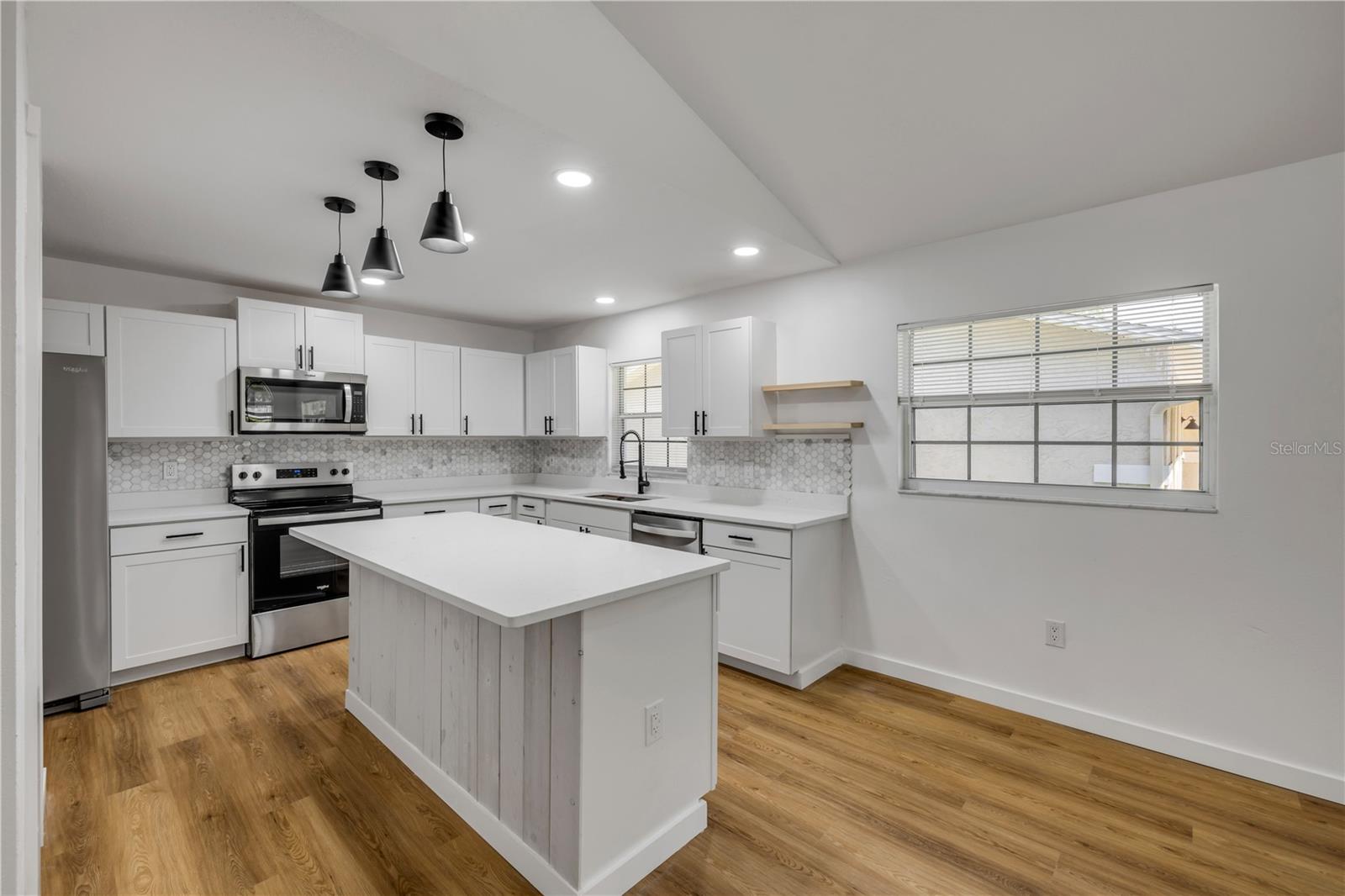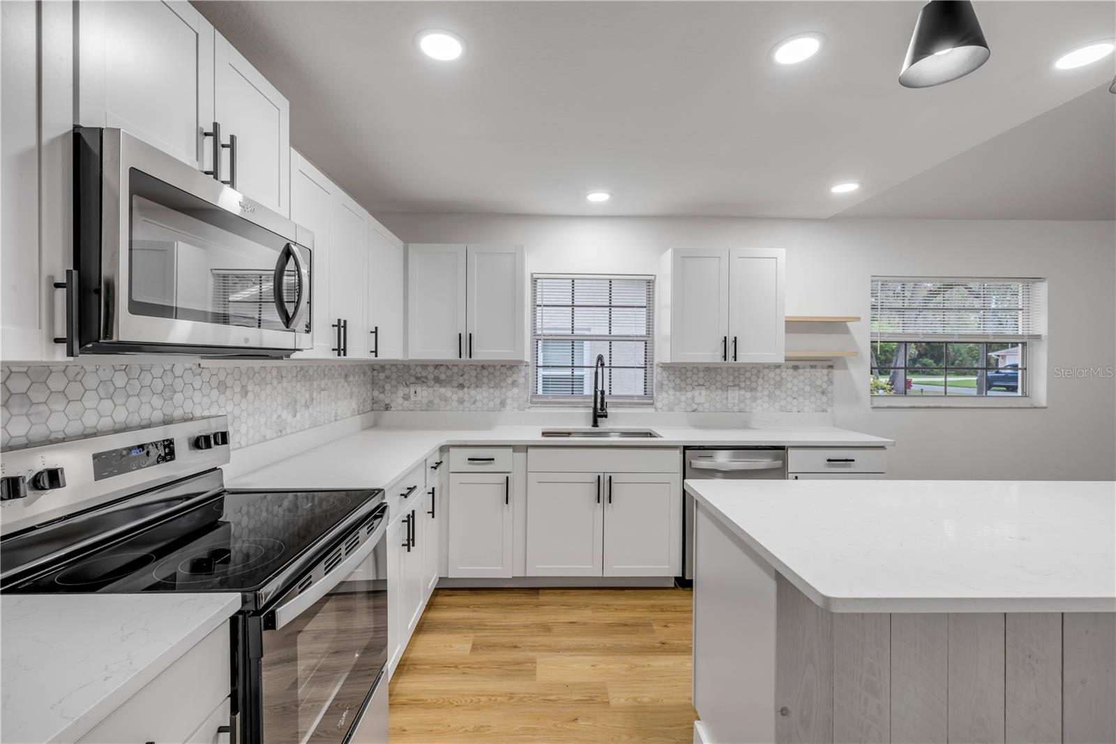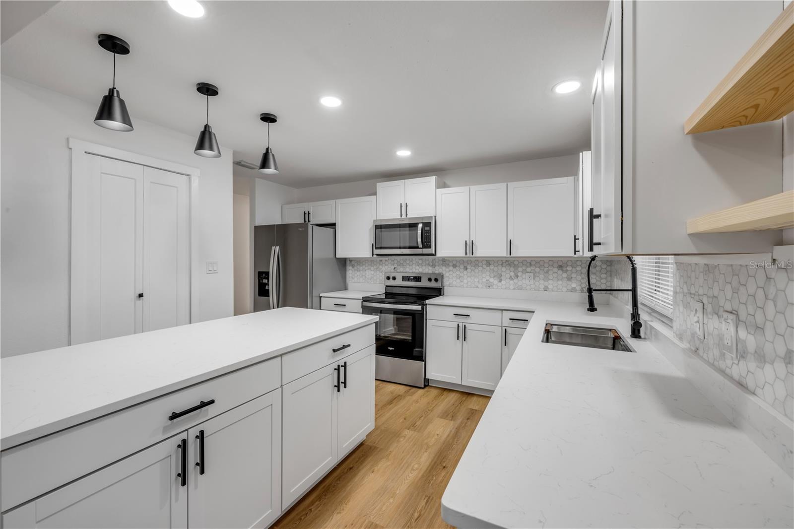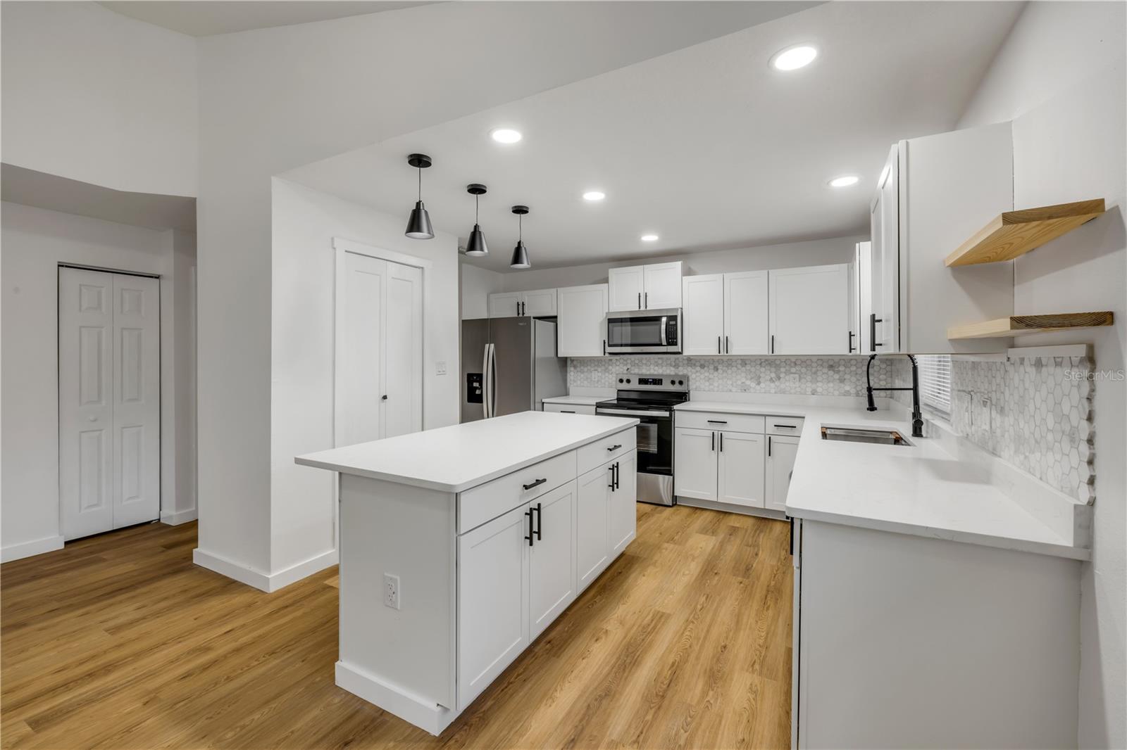 One or more photo(s) has been virtually staged. NO FLOODING HISTORY and located in a top-rated school zone! Situated in the sought-after New Smyrna Beach High district, this turnkey and stylish 3-bedroom, 2-bathroom, 2-car garage concrete block home has been thoughtfully renovated for modern living. Step inside to an open, airy layout filled with natural light and on-trend finishes that blend comfort and design. The kitchen shines with white shaker cabinets, brand-new stainless steel appliances, a stunning marble backsplash, and a spacious pantry. The primary suite is a peaceful retreat with a walk-in closet and a beautifully updated en-suite bathroom featuring a sleek walk-in shower. A second bedroom also includes a walk-in closet—rare for homes this size. Enjoy the durability and beauty of luxury vinyl plank flooring throughout—perfect for kids, pets, and easy upkeep. Major updates include 2024 roof and 2023 water heater, offering peace of mind for years to come. With no prior flood issues, a smart split-bedroom layout, clean modern finishes, and move-in-ready condition, this home checks all the boxes. Schedule your showing today and see why this home stands out in the heart of New Smyrna.
