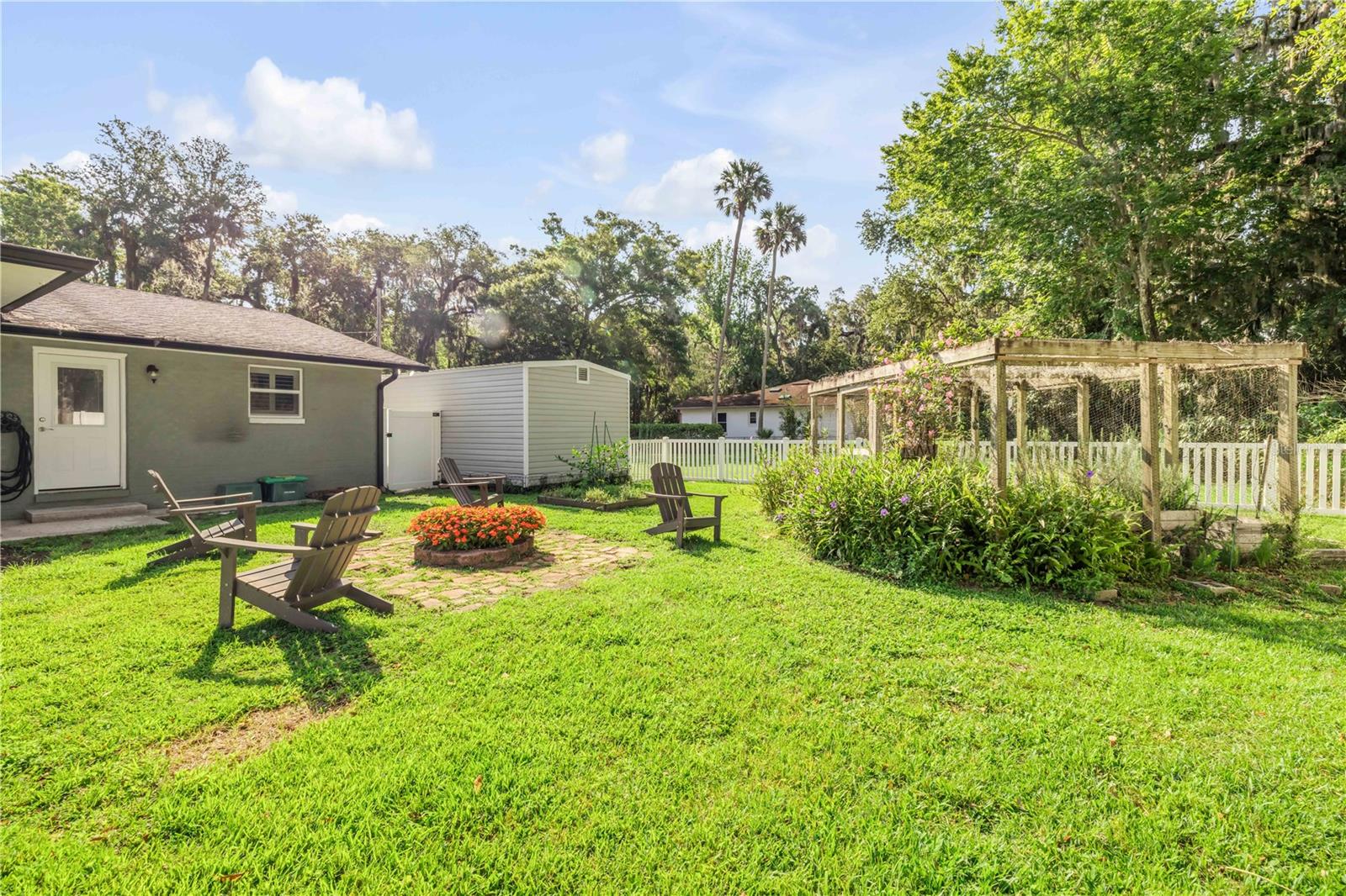Situated on a large corner half acre lot with no HOA, this spacious 4-bedroom, 2-bath ranch-style home offers over 2,300 sq. ft. of beautifully renovated living space — perfect for relaxed Florida living just 5 minutes from the beach. The home welcomes you with an open-concept floor plan, highlighted by a massive great room that flows seamlessly into the kitchen and dining areas. The show-stopping kitchen features a stunning 5' x 8' island, sleek white cabinetry, granite countertops, and stainless steel appliances. Large windows frame views of the herb garden, creating a peaceful and inspiring place to cook. Ideal for entertaining, the spacious dining room easily fits an 8-seater table and connects to a screened-in porch—bringing the outdoors in for year-round enjoyment. The oversized primary suite includes a walk-in closet and a private en-suite bath with dual sinks, granite countertops, and updated cabinetry. Two guest bedrooms are tucked just across the hall, sharing a full bath with a tub/shower combo. A fourth bedroom is located on the opposite side of the home, making it ideal as a home office or private guest retreat. Additional upgrades include a 2016 roof, luxury vinyl plank floors, plantation shutters, architectural rain chain gutters, vinyl fencing, and a separate air-conditioned workshop/storage area just off the garage. With plenty of parking space for your boat or RV, this property combines comfort, style, and freedom — all just minutes from one of the area’s most desirable beaches.