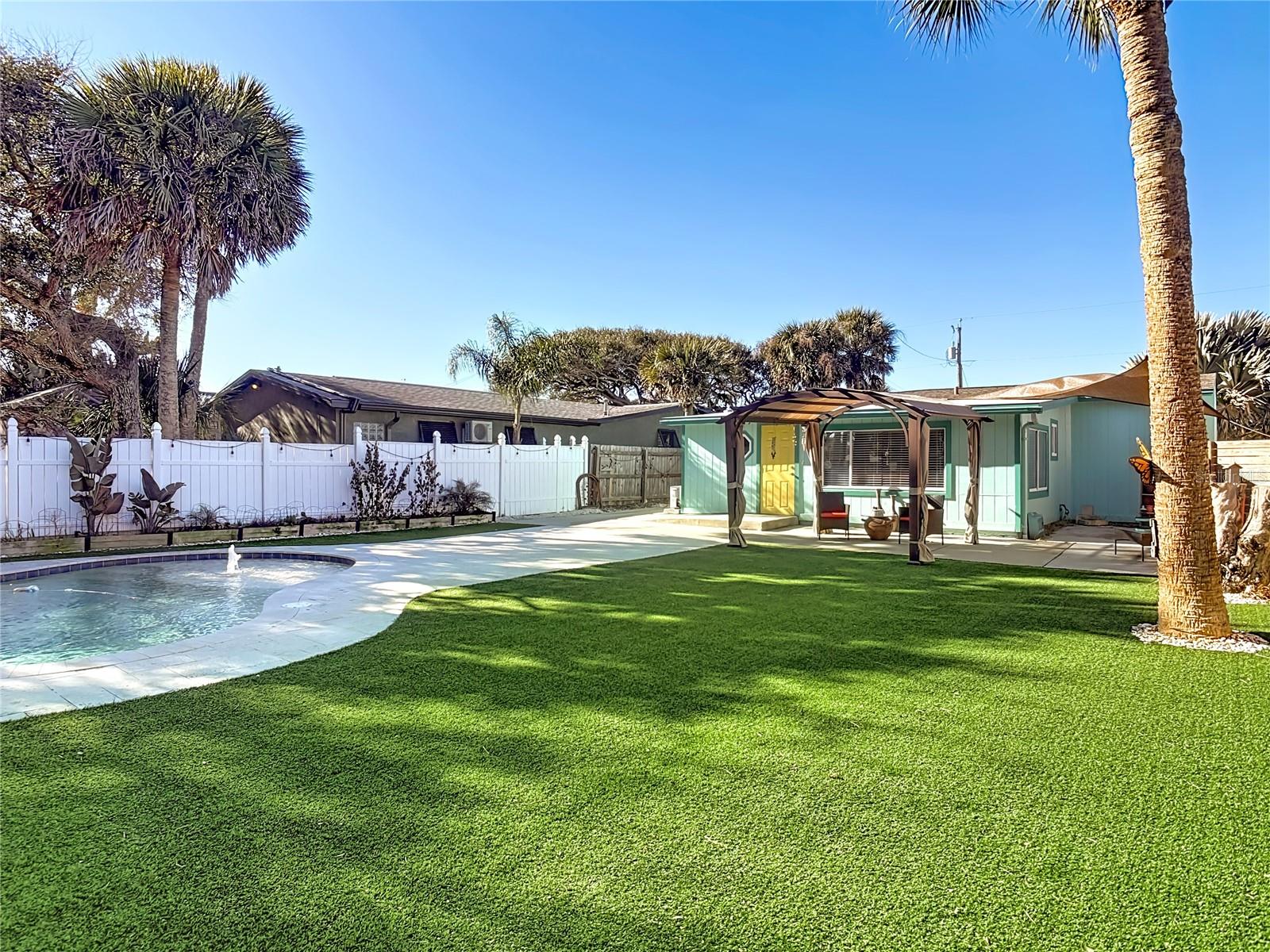 RARE beachside opportunity just steps from the sand! Located directly across from the handicapped beach access on beachside New Smyrna Beach, this 3-bedroom, 2-bath home offers one month rental eligibility and an unbeatable location. Inside features include an updated kitchen and baths with granite countertops, spacious bedrooms, indoor laundry, and a flexible rear bedroom ideal as a primary suite or additional living space with backyard views. Step outside to a private backyard oasis with a fully fenced yard, low-maintenance turf, pool, outdoor shower, and generous lounge space—perfect for relaxing or entertaining after a day at the beach. With a 3-year-old roof, A/C, and pool equipment, this beachside home offers lifestyle, flexibility, and value in one of NSB’s most desirable locations.