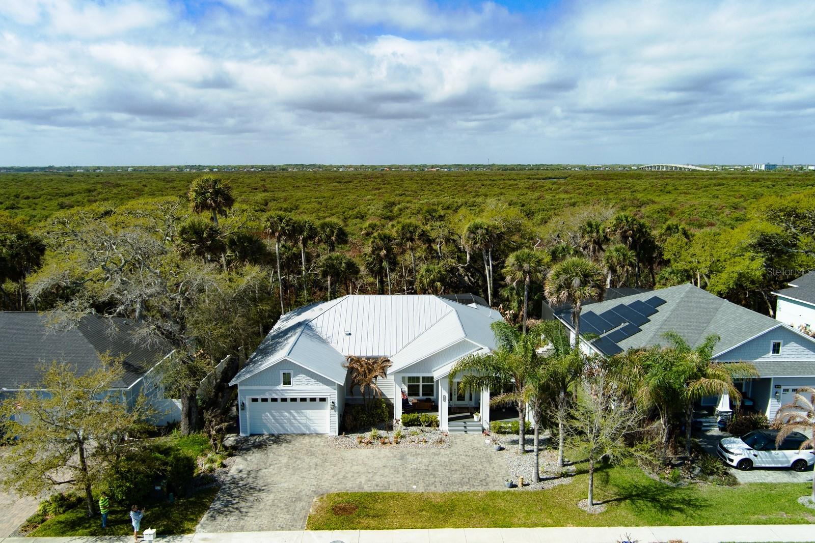 Tucked along the quiet natural preserve of the Callalisa Creek conservation area, this beautifully finished Craftsman style residence by Walters Construction offers a rare opportunity to own newer beachside construction in one of New Smyrna Beach’s most peaceful and desirable settings. Completed and meticulously maintained, the home now presents like a model with warm neutral tones, quality craftsmanship, and a thoughtfully designed open floor plan that creates an immediate sense of comfort and coastal elegance. Offering 3 bedrooms, 2 full baths, 1 half bath, and a dedicated office across more than 2,100 square feet of single level living, the Magnolia floor plan blends everyday functionality with inviting living spaces ideal for both relaxing and entertaining. Built with durable block construction and designed to meet 140 mph wind standards, the home features impact rated insulated vinyl windows, a standing seam metal roof, and a brick paver driveway that enhances both curb appeal and longevity. Inside, vaulted and tray ceilings, crown molding, tile flooring throughout, soft close solid wood cabinetry with dovetail drawers, solid surface countertops, stainless steel Samsung appliances, LED recessed lighting, and spacious walk in closets create a refined yet welcoming interior filled with natural light. The gourmet kitchen anchors the home and opens seamlessly to the spacious great room and dining area, creating a natural gathering space for family and friends, while the bathrooms feature large tiled walk in showers and quality fixtures. Step outside and discover the private backyard retreat that truly sets this property apart, where a screened and heated saltwater pool with fiber optic lighting overlooks the protected Callalisa Creek conservation area, providing a peaceful natural backdrop with exceptional privacy and no neighboring homes behind you. Covered lanai space and an outdoor shower make outdoor living effortless and enjoyable year round. Additional highlights include energy efficient construction with foam insulation and Low E insulated patio doors, an irrigation system, permanent outdoor architectural lighting that enhances the home’s curb appeal after sunset, and an attached two car garage upgraded with its own mini split air conditioning system to keep the space comfortable year round for vehicles, storage, or projects. The property sits high and dry with flood insurance not required, offering additional peace of mind. Located on the beachside of New Smyrna Beach, this home is just a short golf cart ride to area shopping, restaurants, marinas, and many of the local attractions that make this coastal community so special while still providing a quiet private setting to come home to.
