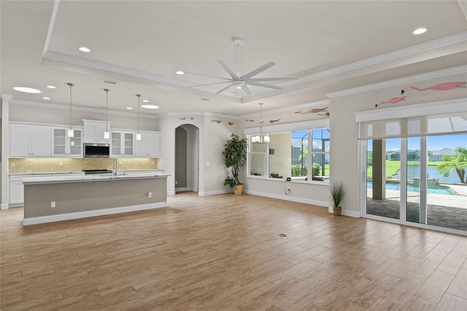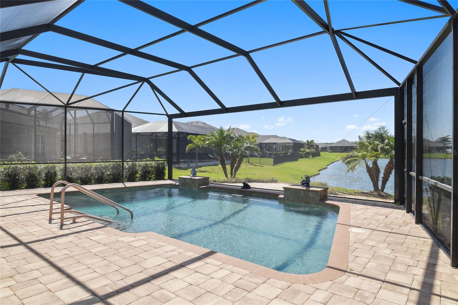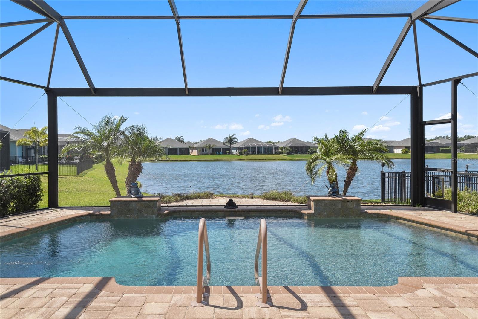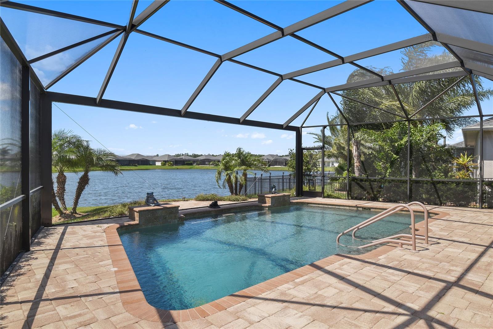 BEAUTIFUL WATERFRONT HOME IN THE PALMS AT VENETIAN BAY! This gorgeous residence features a sprawling 2,100 SF, single-story layout, with a hard to find 3-car garage! Set on nearly a ¼ acre lot, this residence offers a large, screened lanai, heated pool, and tranquil water views. The interior of the home boasts wide hallways, elevated ceilings, and a open-concept floorplan with a kitchen/great room, and split bedroom design. Wood-grain tile floors flow throughout the home and are complimented by elevated ceilings, crown moldings, plantation shutters, electric blinds, recessed lighting, and lots of natural light! The kitchen features a large island with sink, Quartz counters, stainless steel appliances, closet pantry, under cabinet lighting, and a great amount of storage. The living room/great room is open to the kitchen and features an accent wall with fireplace. Glass sliders off the great room open to the screened lanai where you’ll find panoramic views, a heated pool, and outdoor kitchen. Set at the back of the home, to optimize those water views, the primary bedroom is spacious and has a private en suite with large walk-in closet, double sink vanity, and walk-in shower. Two guest rooms, generously sized, sit at the front of the home and share a hall bath. Located in the coveted community of Venetian Bay, residences enjoy convenient access to world famous beaches, shops, and dining, as well as community amenities such as a Town Center with a spa, deli, and fitness center, as well as a resident only Beach and Swim Club. The Venetian Golf Course, an 18-hold semi-private championship course, is also located within walking or golf cart distance. This stunning residence will not last long, schedule your showing today!