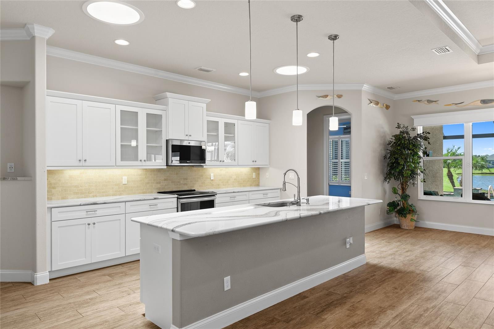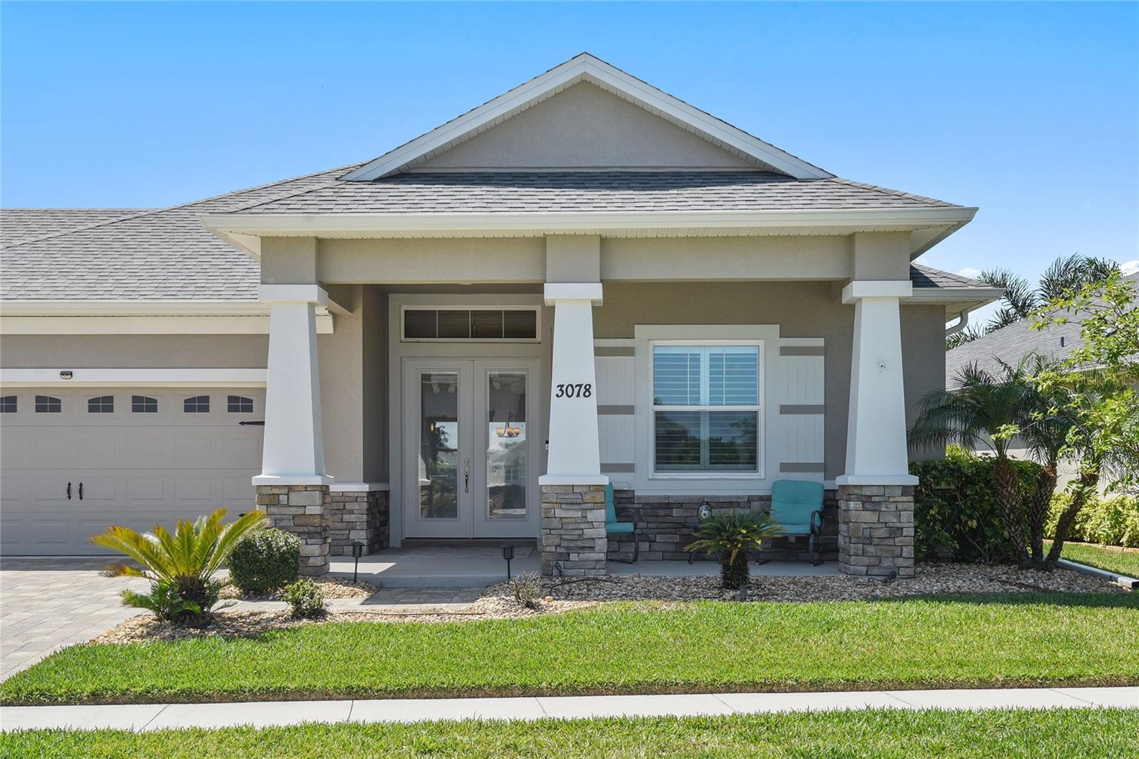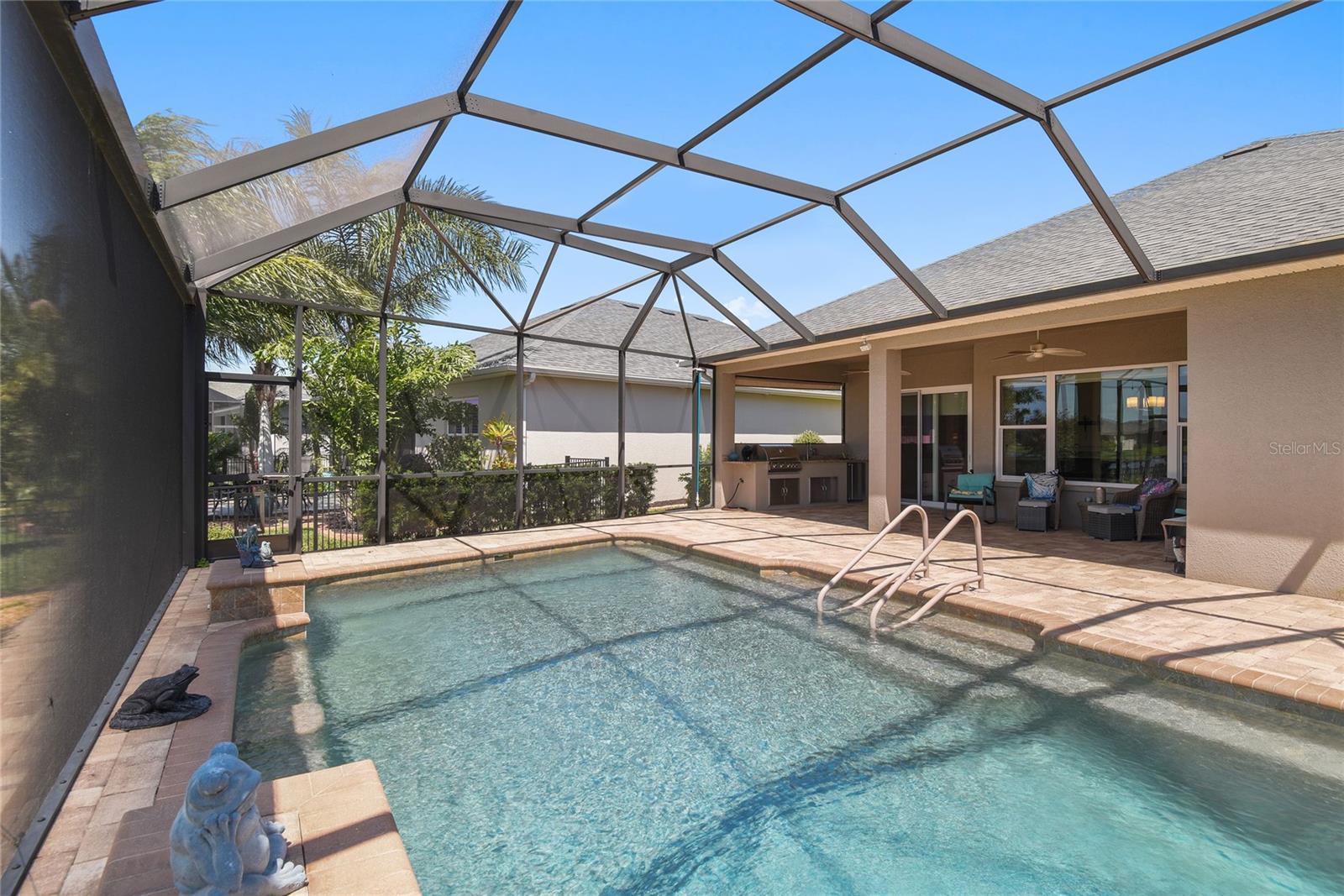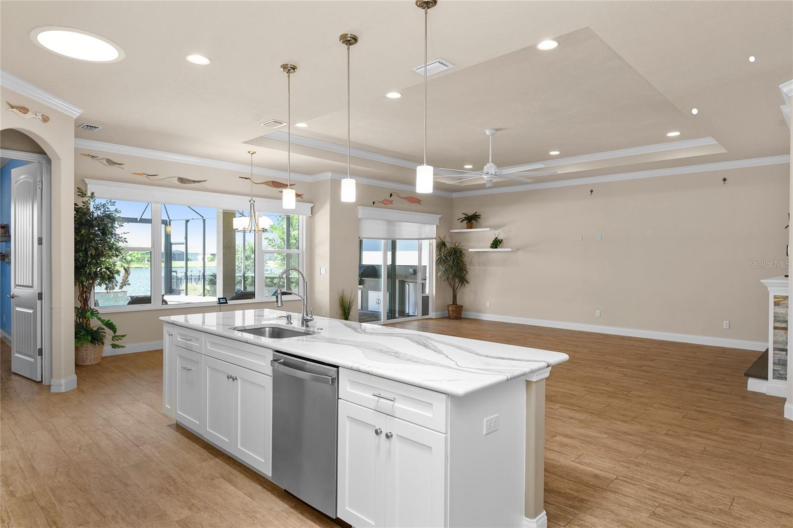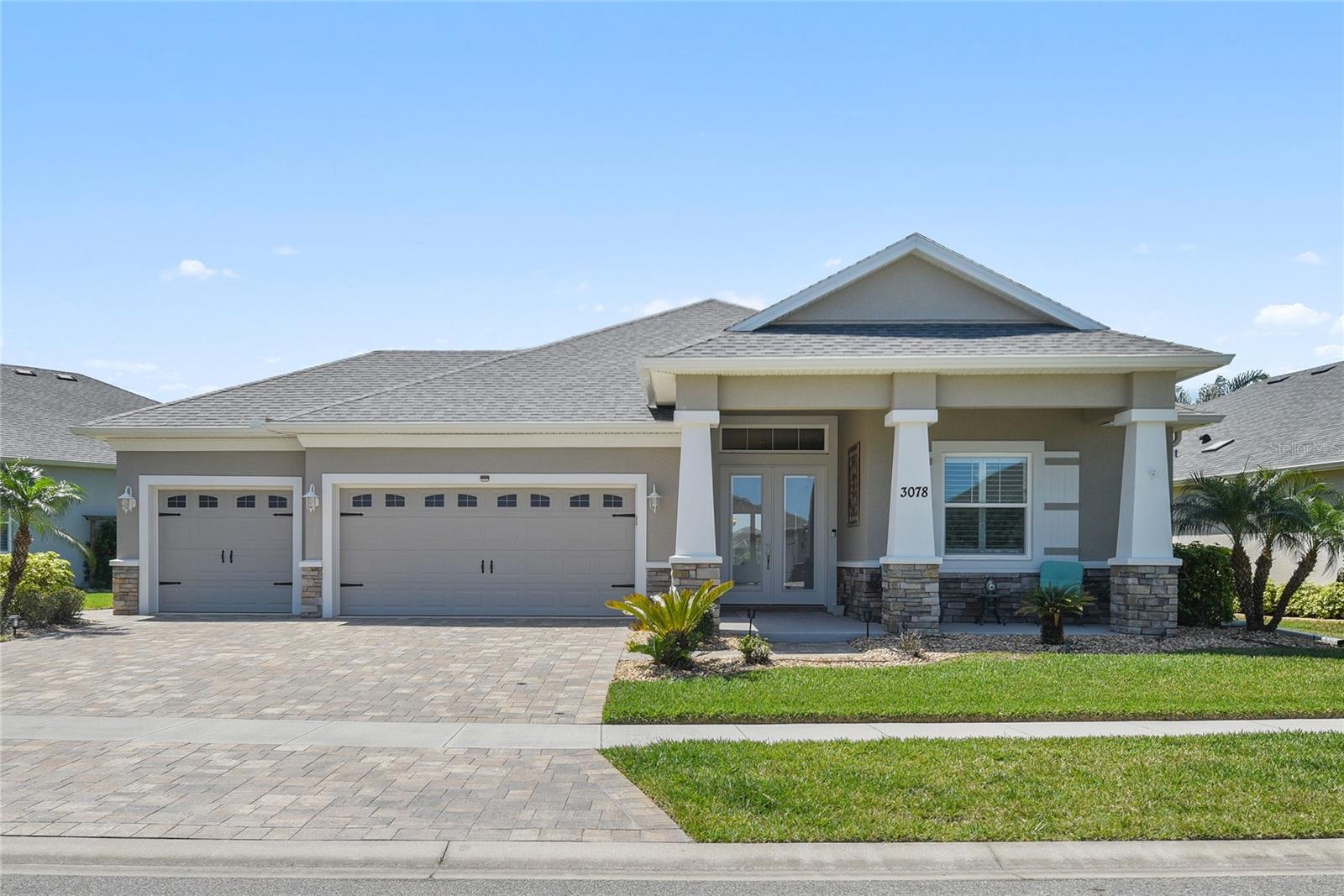 BEAUTIFUL WATERFRONT HOME IN THE PALMS AT VENETIAN BAY! This gorgeous residence features a sprawling 2,100 SF, single-story layout, with a hard to find 3-car garage! Set on nearly a ¼ acre lot, this residence offers a large, screened lanai, heated pool, and tranquil water views. The interior of the home boasts wide hallways, elevated ceilings, and a open-concept floorplan with a kitchen/great room, and split bedroom design. Wood-grain tile floors flow throughout the home and are complimented by elevated ceilings, crown moldings, plantation shutters, electric blinds, recessed lighting, and lots of natural light! The kitchen features a large island with sink, Quartz counters, stainless steel appliances, closet pantry, under cabinet lighting, and a great amount of storage. The living room/great room is open to the kitchen and features an accent wall with fireplace. Glass sliders off the great room open to the screened lanai where you’ll find panoramic views, a heated pool, and outdoor kitchen. Set at the back of the home, to optimize those water views, the primary bedroom is spacious and has a private en suite with large walk-in closet, double sink vanity, and walk-in shower. Two guest rooms, generously sized, sit at the front of the home and share a hall bath. Located in the coveted community of Venetian Bay, residences enjoy convenient access to world famous beaches, shops, and dining, as well as community amenities such as a Town Center with a spa, deli, and fitness center, as well as a resident only Beach and Swim Club. The Venetian Golf Course, an 18-hold semi-private championship course, is also located within walking or golf cart distance. This stunning residence will not last long, schedule your showing today!