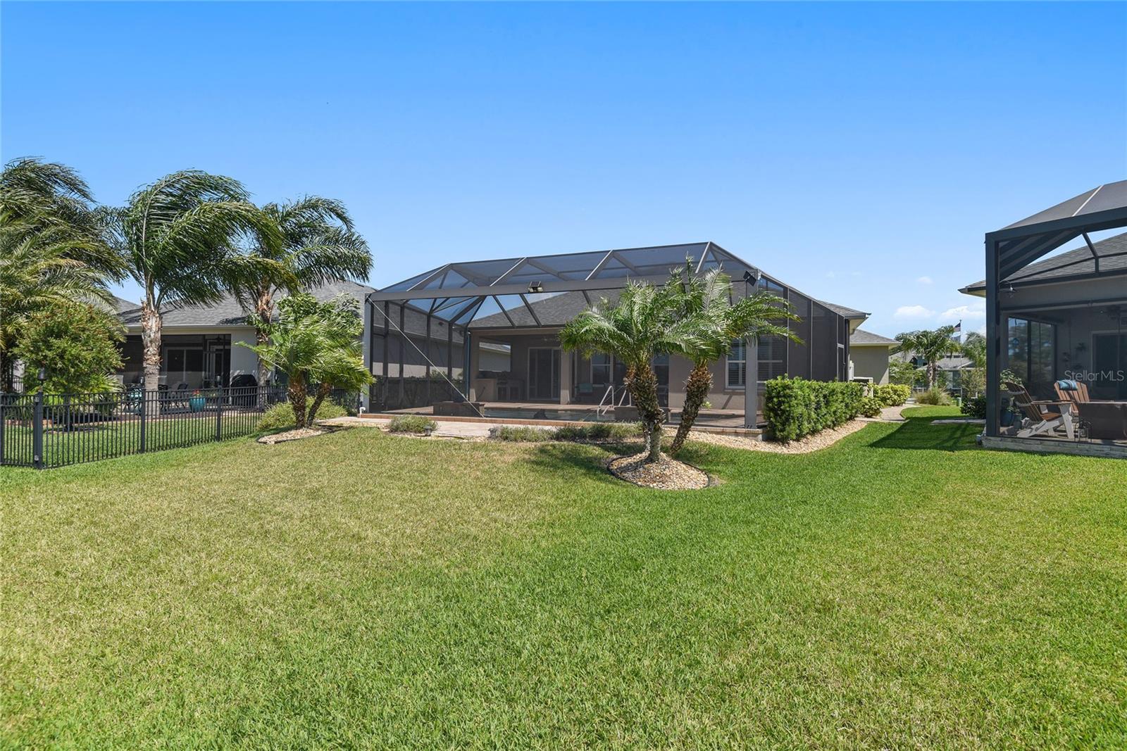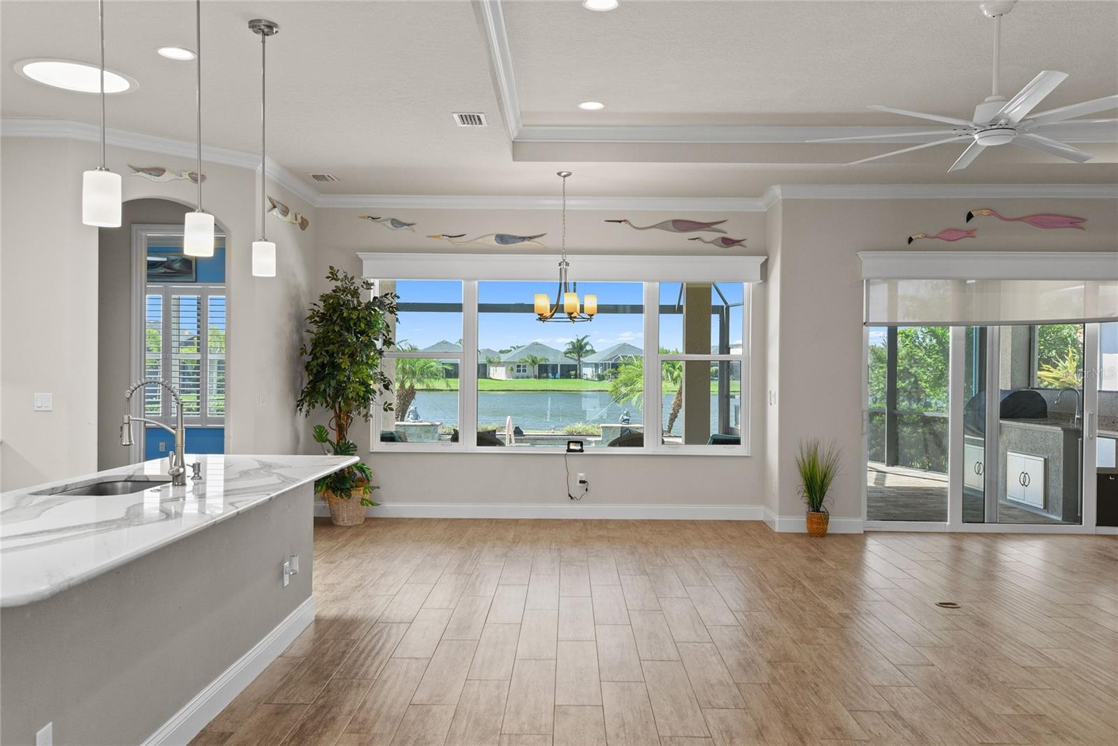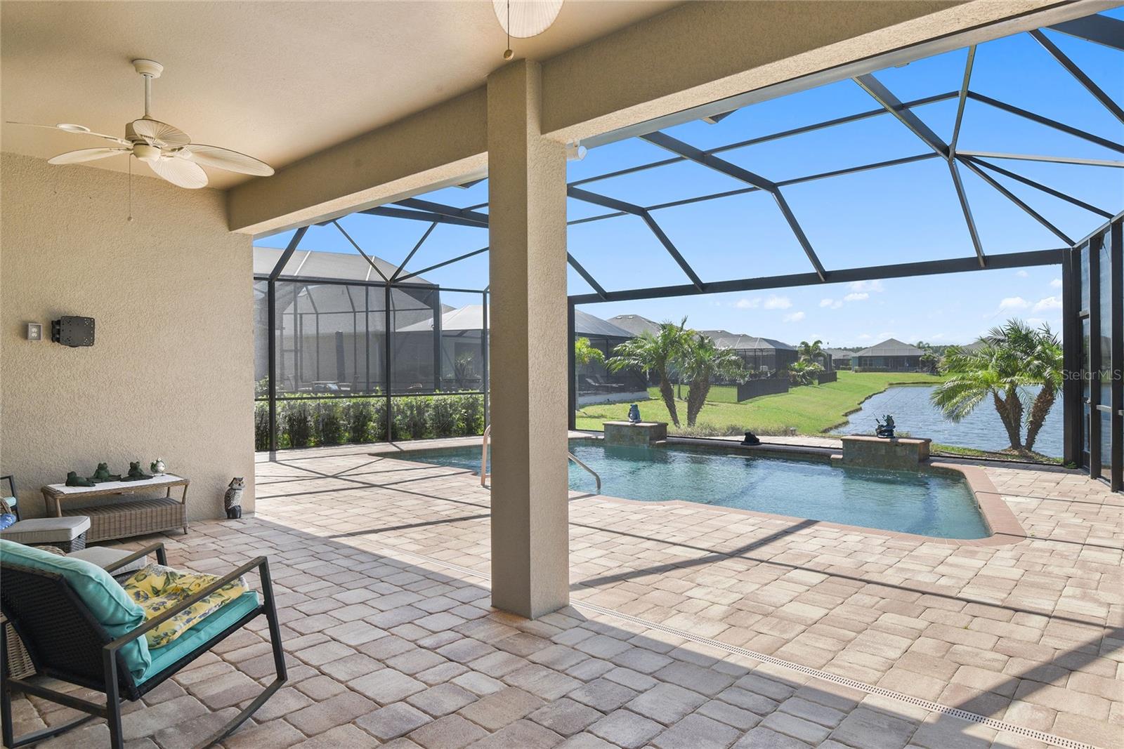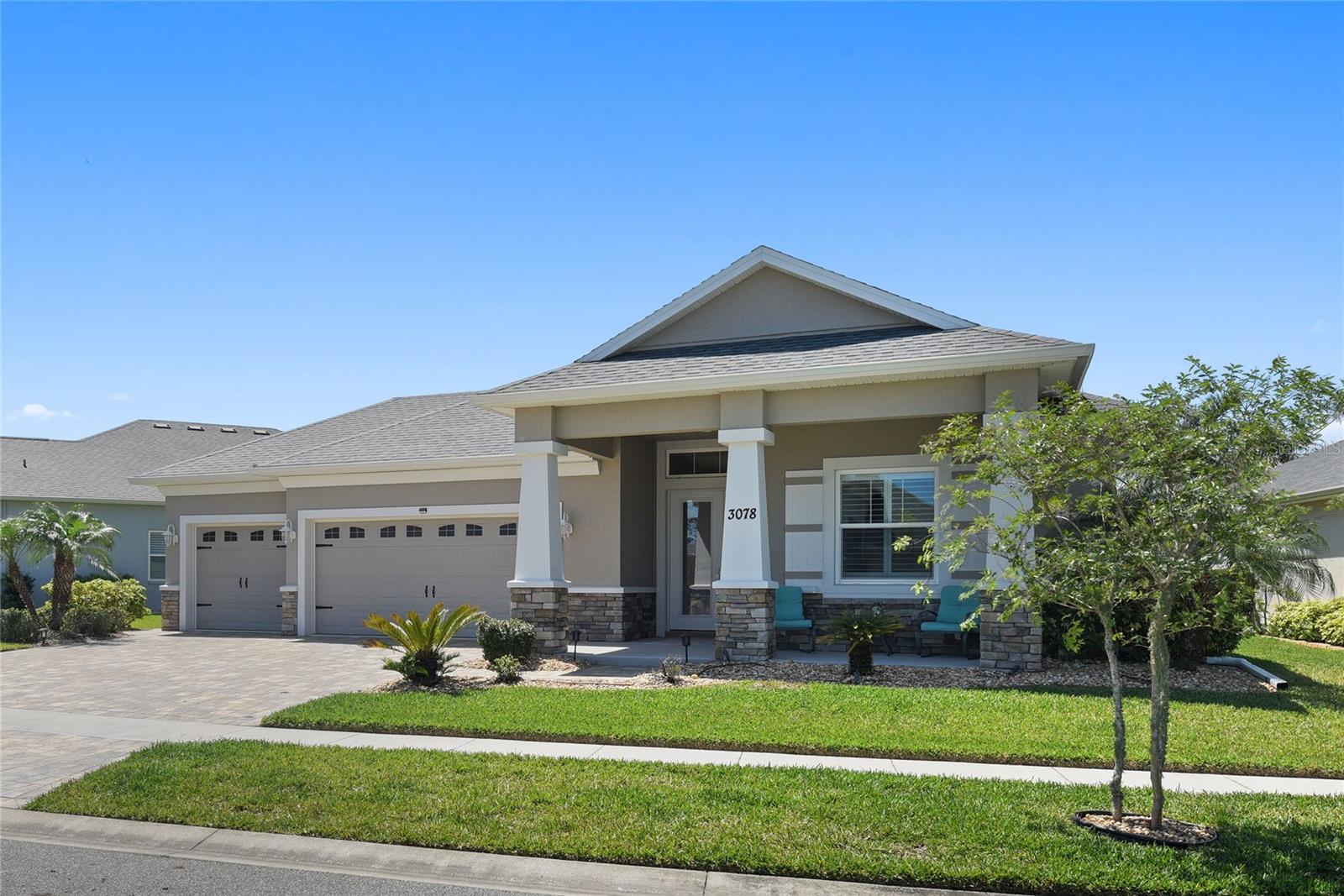 BEAUTIFUL WATERFRONT HOME IN THE PALMS AT VENETIAN BAY! This gorgeous residence features a sprawling 2,100 SF, single-story layout, with a hard to find 3-car garage! Set on nearly a ¼ acre lot, this residence offers a large, screened lanai, heated pool, and tranquil water views. The interior of the home boasts wide hallways, elevated ceilings, and a open-concept floorplan with a kitchen/great room, and split bedroom design. Wood-grain tile floors flow throughout the home and are complimented by elevated ceilings, crown moldings, plantation shutters, electric blinds, recessed lighting, and lots of natural light! The kitchen features a large island with sink, Quartz counters, stainless steel appliances, closet pantry, under cabinet lighting, and a great amount of storage. The living room/great room is open to the kitchen and features an accent wall with fireplace. Glass sliders off the great room open to the screened lanai where you’ll find panoramic views, a heated pool, and outdoor kitchen. Set at the back of the home, to optimize those water views, the primary bedroom is spacious and has a private en suite with large walk-in closet, double sink vanity, and walk-in shower. Two guest rooms, generously sized, sit at the front of the home and share a hall bath. Located in the coveted community of Venetian Bay, residences enjoy convenient access to world famous beaches, shops, and dining, as well as community amenities such as a Town Center with a spa, deli, and fitness center, as well as a resident only Beach and Swim Club. The Venetian Golf Course, an 18-hold semi-private championship course, is also located within walking or golf cart distance. This stunning residence will not last long, schedule your showing today!