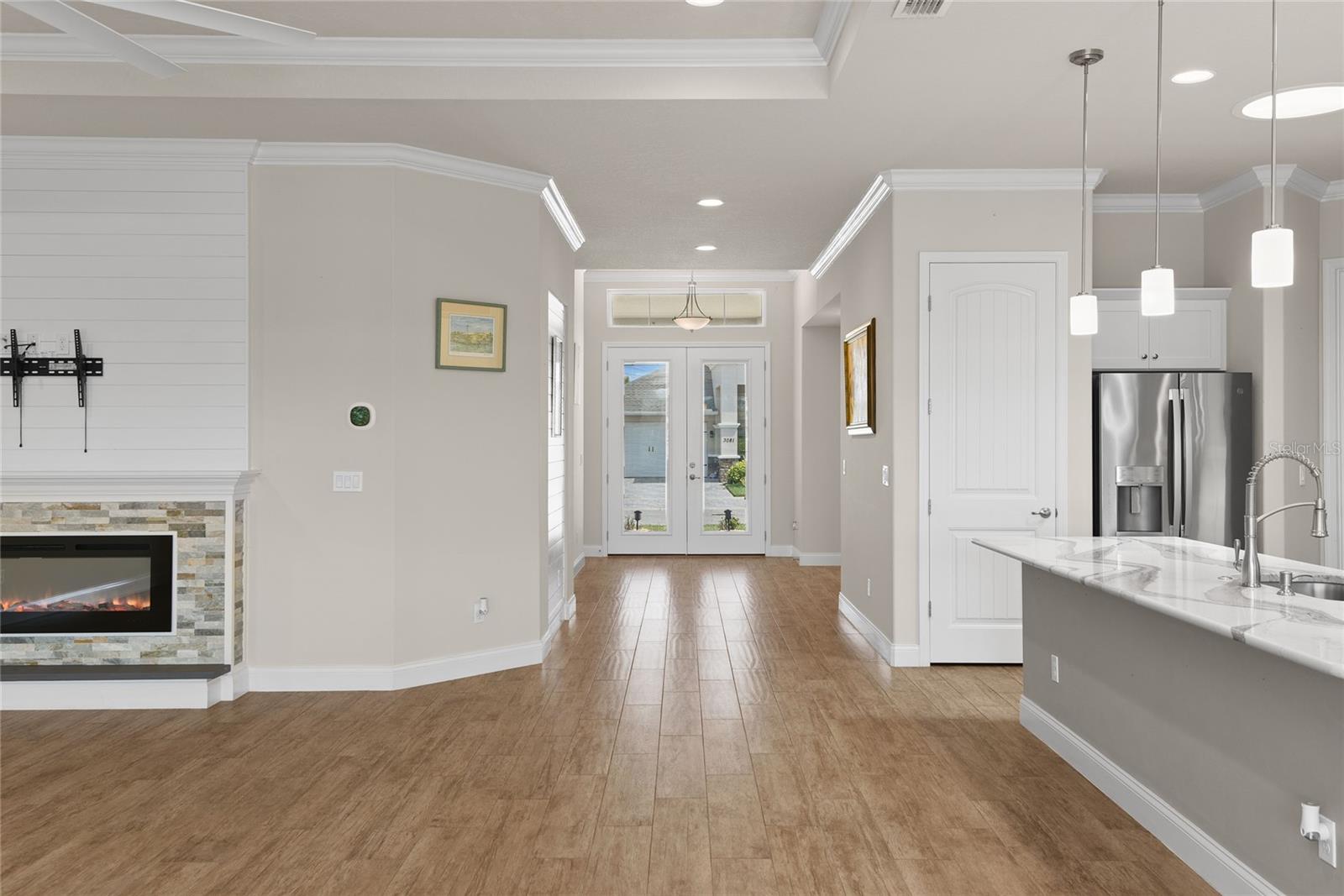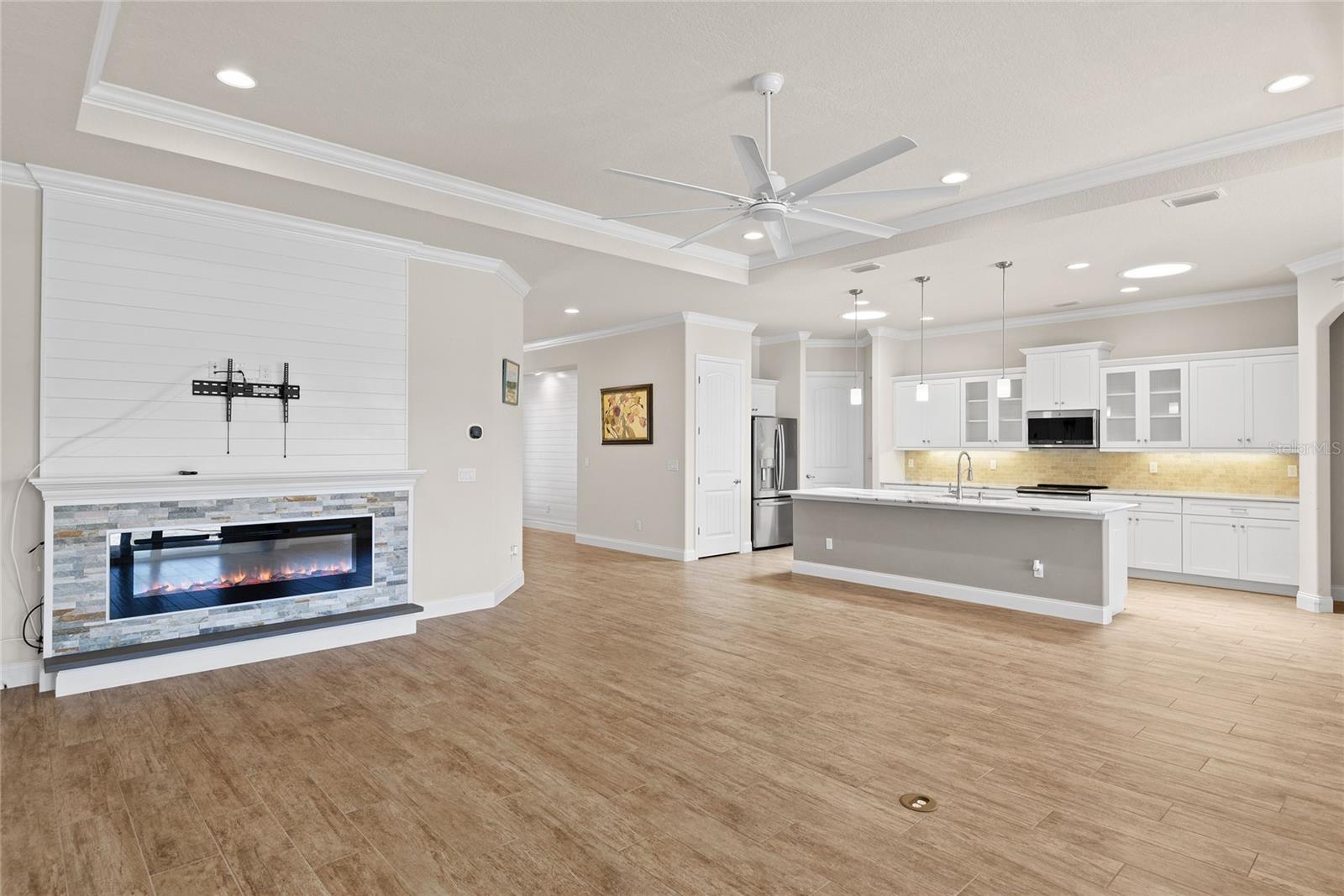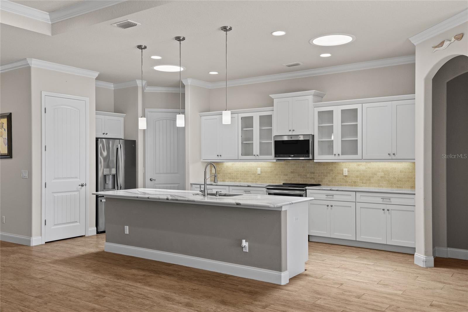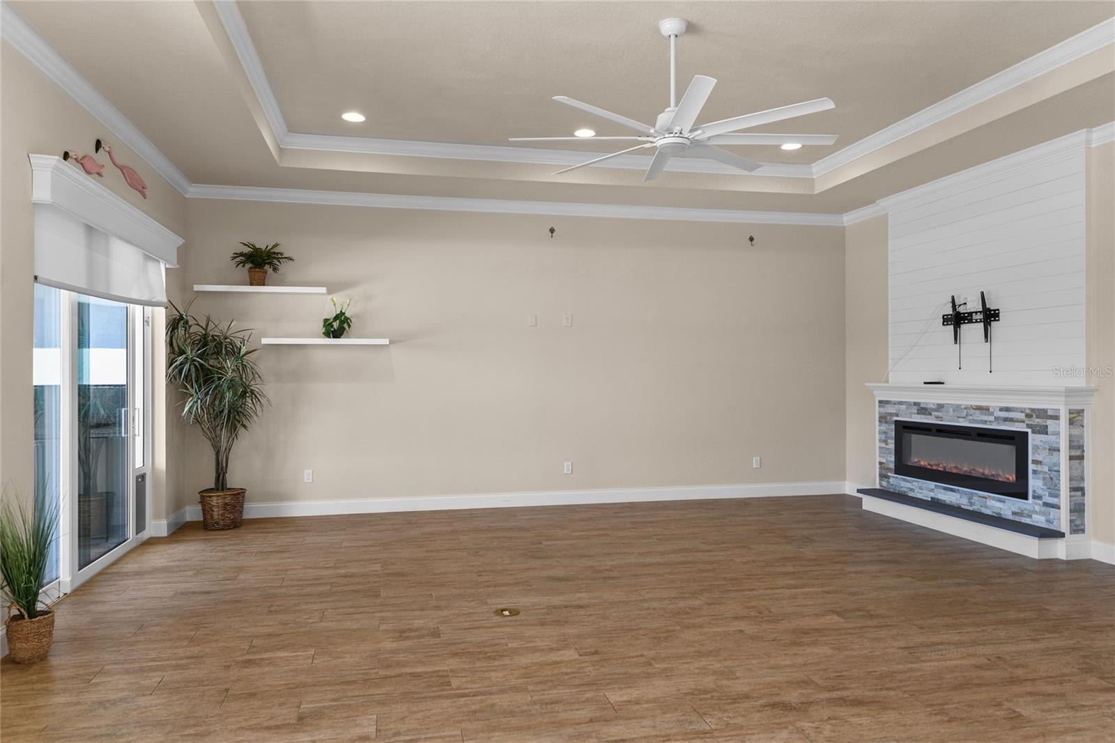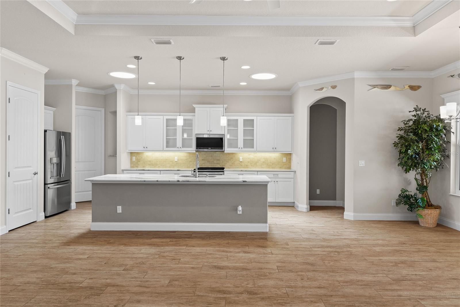 BEAUTIFUL WATERFRONT HOME IN THE PALMS AT VENETIAN BAY! This gorgeous residence features a sprawling 2,100 SF, single-story layout, with a hard to find 3-car garage! Set on nearly a ¼ acre lot, this residence offers a large, screened lanai, heated pool, and tranquil water views. The interior of the home boasts wide hallways, elevated ceilings, and a open-concept floorplan with a kitchen/great room, and split bedroom design. Wood-grain tile floors flow throughout the home and are complimented by elevated ceilings, crown moldings, plantation shutters, electric blinds, recessed lighting, and lots of natural light! The kitchen features a large island with sink, Quartz counters, stainless steel appliances, closet pantry, under cabinet lighting, and a great amount of storage. The living room/great room is open to the kitchen and features an accent wall with fireplace. Glass sliders off the great room open to the screened lanai where you’ll find panoramic views, a heated pool, and outdoor kitchen. Set at the back of the home, to optimize those water views, the primary bedroom is spacious and has a private en suite with large walk-in closet, double sink vanity, and walk-in shower. Two guest rooms, generously sized, sit at the front of the home and share a hall bath. Located in the coveted community of Venetian Bay, residences enjoy convenient access to world famous beaches, shops, and dining, as well as community amenities such as a Town Center with a spa, deli, and fitness center, as well as a resident only Beach and Swim Club. The Venetian Golf Course, an 18-hold semi-private championship course, is also located within walking or golf cart distance. This stunning residence will not last long, schedule your showing today!