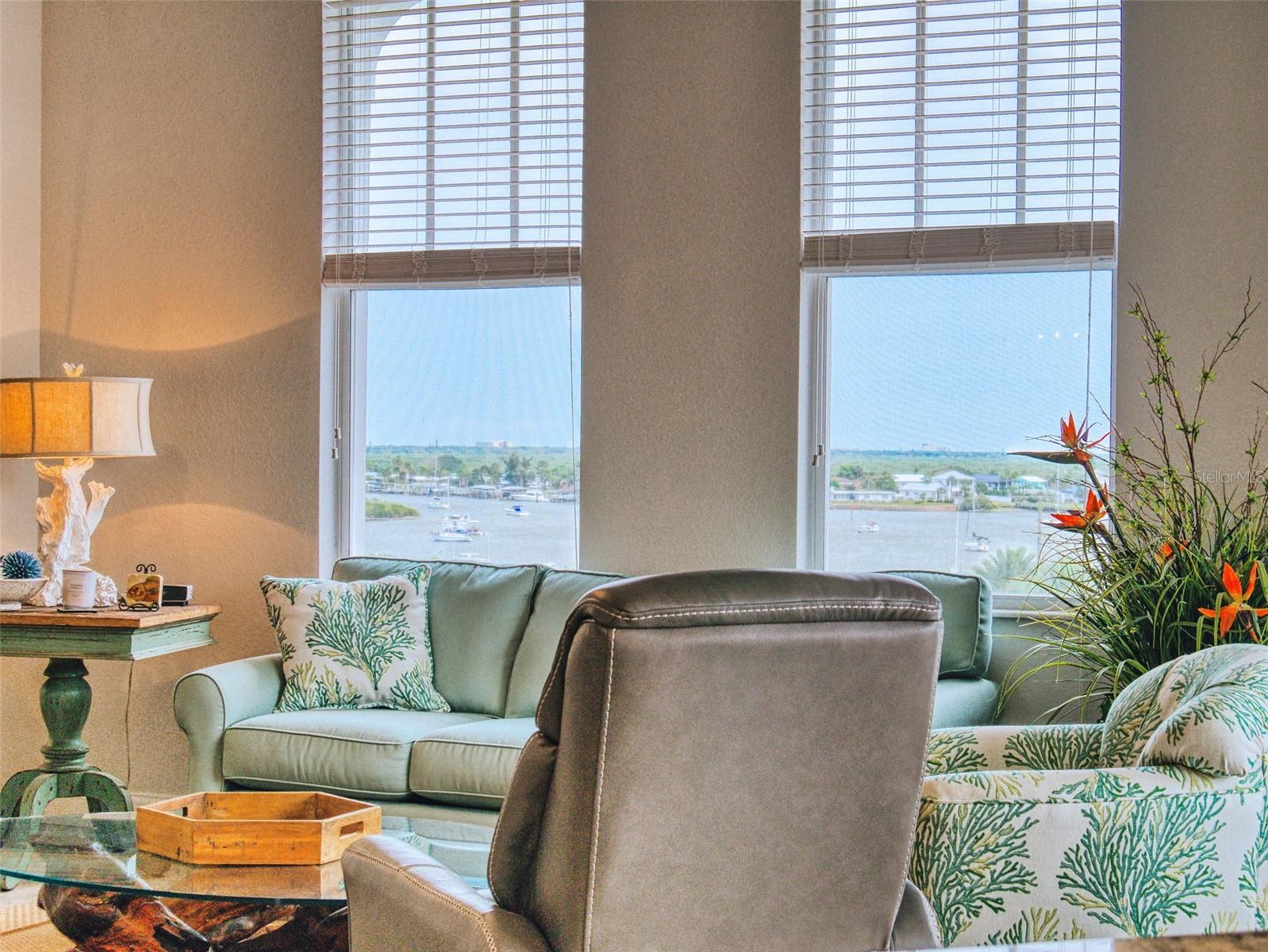 Welcome to your luxury dream home! This beautifully appointed 3-bedroom, 2-bathroom condo is centrally located in the heart of New Smyrna Beach at the Gated Riverwalk Waterfront Community. This top floor, end unit sits on the 6th floor offering breathtaking sunset views over the Intracoastal Waterway and sunrise views over the North Causeway Marina. The Ponce Inlet Lighthouse is visible right in your own backyard. This spacious end unit features 10-foot ceilings, larger patios and extra windows for a light and bright filled unit and an open concept layout, this condo blends coastal elegance with modern comfort. Step into the large kitchen featuring granite countertops, under counter lighting, upgraded GE Profile stainless steel appliances, a large breakfast bar perfect for entertaining. The Living and dining areas flow seamlessly onto a private balcony perfect for breakfast or a cocktail in the evening. The primary suite boasts water views, a large walk-in closet, dual vanity, walk in shower, jetted jacuzzi tub. Two additional bedrooms provide a pocket door for privacy and flexibility for guests, a home office or family living. Enjoy resort style amenities including a pool, fitness room, theatre room, Bocce, Pickle ball, tennis, shuffleboard, grills and a fire pit. This condo is the ultimate Coastal Living Lifestyle. The property was used as a second home for seasonal occupancy and gently used. Location is everything and you are in the heart of New Smyrna Beach where walking, biking or golf carting are all available for all the local events, art shows, car shows, farmers market, shopping and dining at all the local favorites. Watch the shuttle launches, fireworks and parades right from your balcony. The beach is just minutes away right over the North Causeway Bridge. Boat slips are available to purchase by owners. Don't miss this rare opportunity, schedule a private tour today.