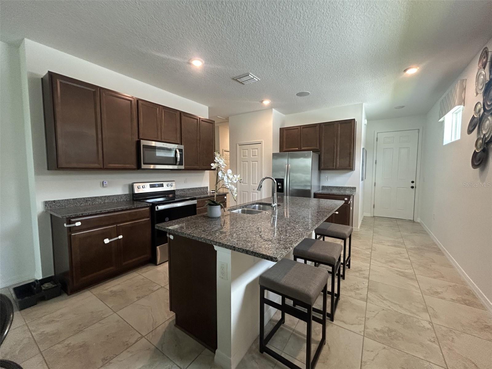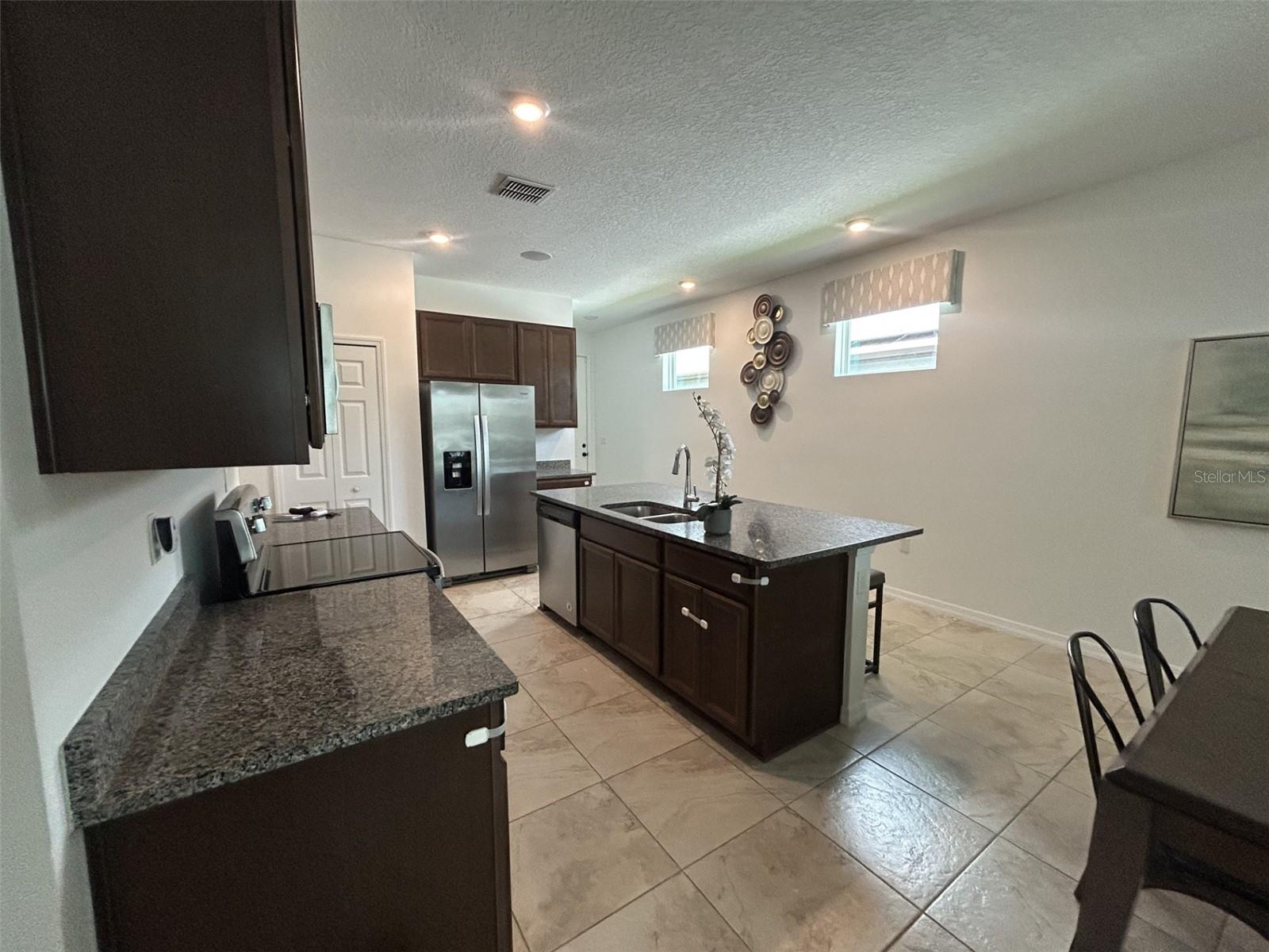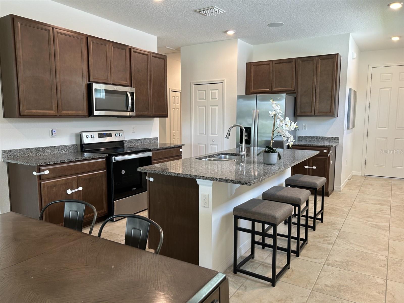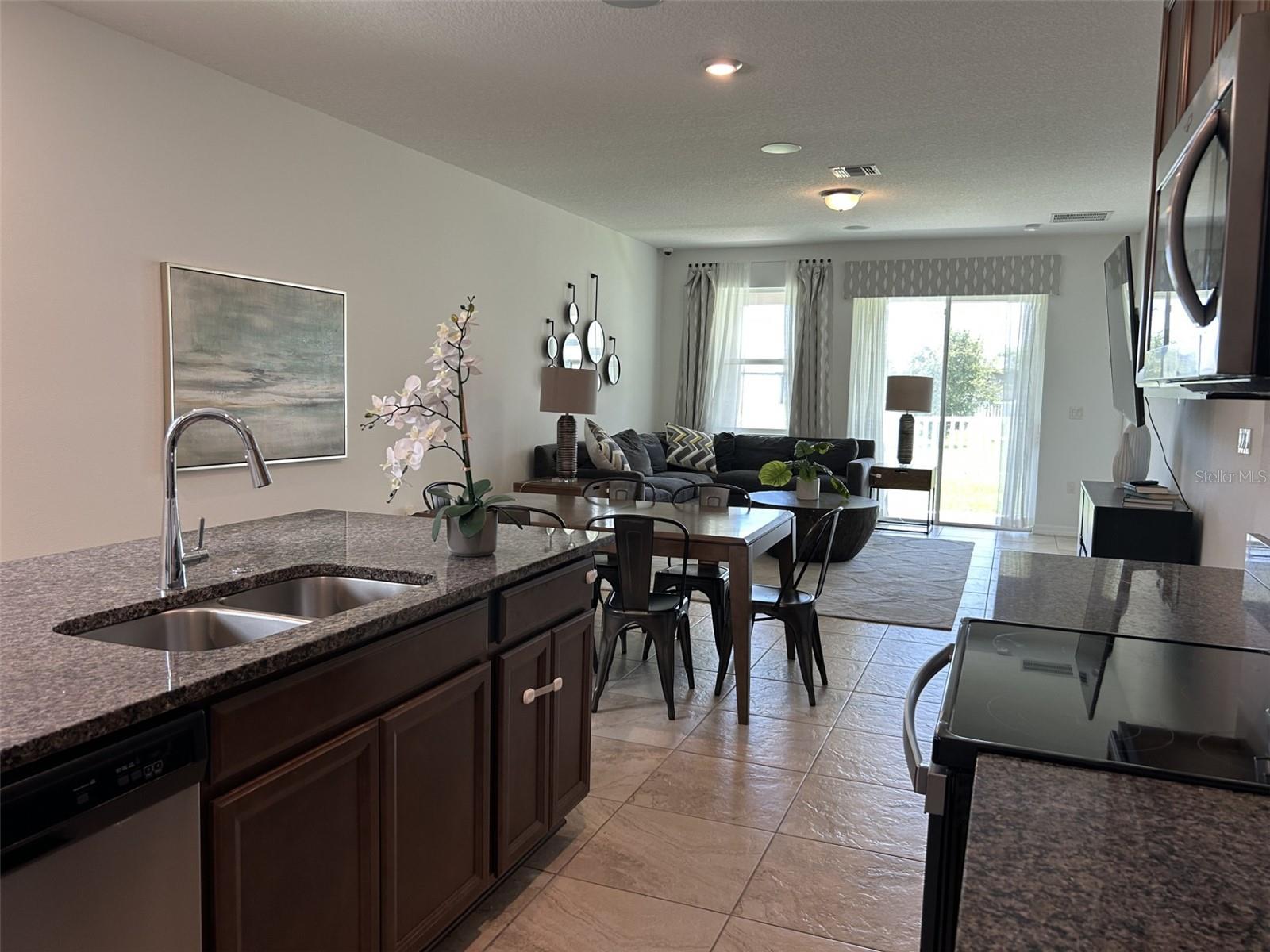Don't miss this bright and airy Former Model Home, freshly painted inside. Spacious open floor plan offering 4 bedrooms, 2 full baths, 2 car garage. This modern open concept features a spacious combination of great room, dining area, and kitchen. The fully equipped kitchen offers a center island with abundant cabinetry, walk-in pantry, and granite countertops. The primary bedroom features a walk-in closet, en-suite bath with linen closet, large shower, and dual sinks. Enjoy the relaxing water view from the comfort of the lanai. This Energy Star home offers many upgrades including: security camera system, pavers on driveway, attractive knockdown high ceilings, LED lighting, and speakers throughout - just to list a few. Only minutes to New Smyrna Beach, shopping, restaurants, and I-95. Just a short drive to Canaveral National Seashore and Daytona International Speedway. You MUST SEE to appreciate, ready for a new owner!!!