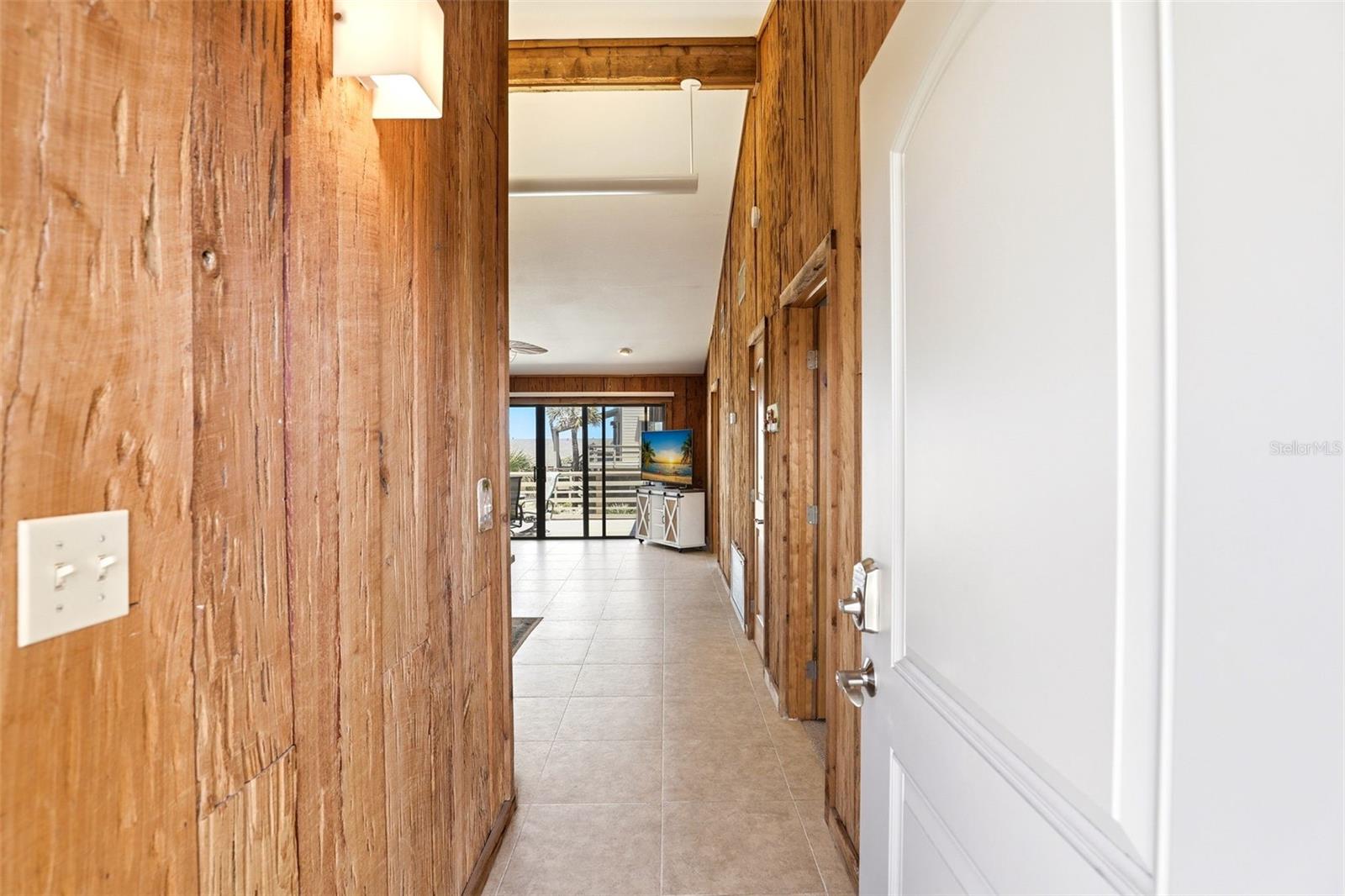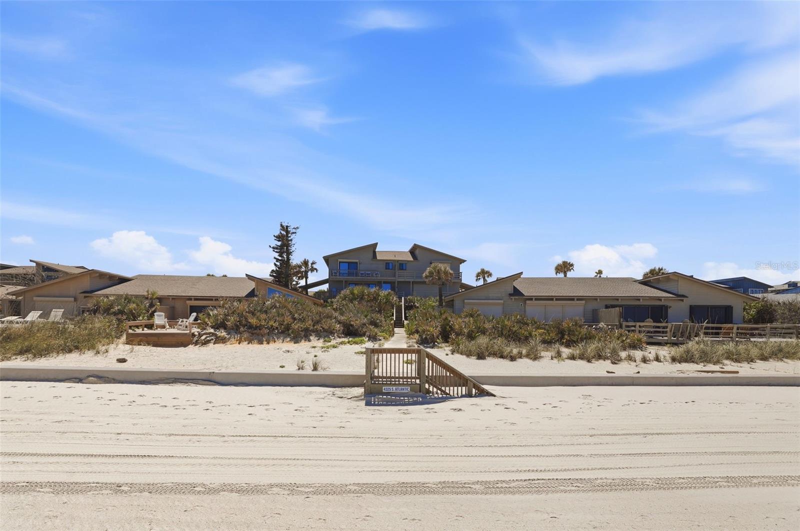 Welcome to your slice of coastal paradise in New Smyrna Beach! Sea Dues - Dolphin offers this rare and unique property as part of an intimate beachfront community on the NO DRIVE beach. The Dolphin community is 10 townhomes set along the beautiful Atlantic Ocean. The second floor features a bright, open-concept design with a spacious living and dining area, an open kitchen, and two generously sized bedrooms—each with its own en-suite bath. The Cathedral ceilings and beautiful cypress and pecky cypress wood paneling elevate this great room configuration. Step out onto your private second-floor deck to enjoy ocean views and refreshing coastal breezes, creating the perfect setting for relaxing or entertaining. On the ground level, a versatile studio-style space offers its own open layout with a designated sleeping area, partial kitchen, and living space. Sliding doors lead to a private patio—ideal for guests, extended family, or additional living flexibility. A deep one-car garage provides added convenience for a vehicle, pool toys and storage. Perfectly positioned, the unit overlooks the community pool and includes easy access to the beach via a private walkway. Whether you’re seeking a full-time residence, vacation retreat, or investment opportunity, this distinctive property delivers the best of effortless beachside living. New main roof 2026. New hardee board and weather stripping Spring 2025. Impact windows(11) 2017. Hot water heater 2024. Deck refurbishment 2022. New garage door 2021. New interior doors 2020. Primary bath renovation 2018. HVACS 2022 & 2025