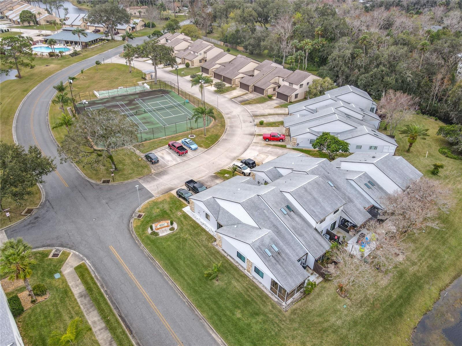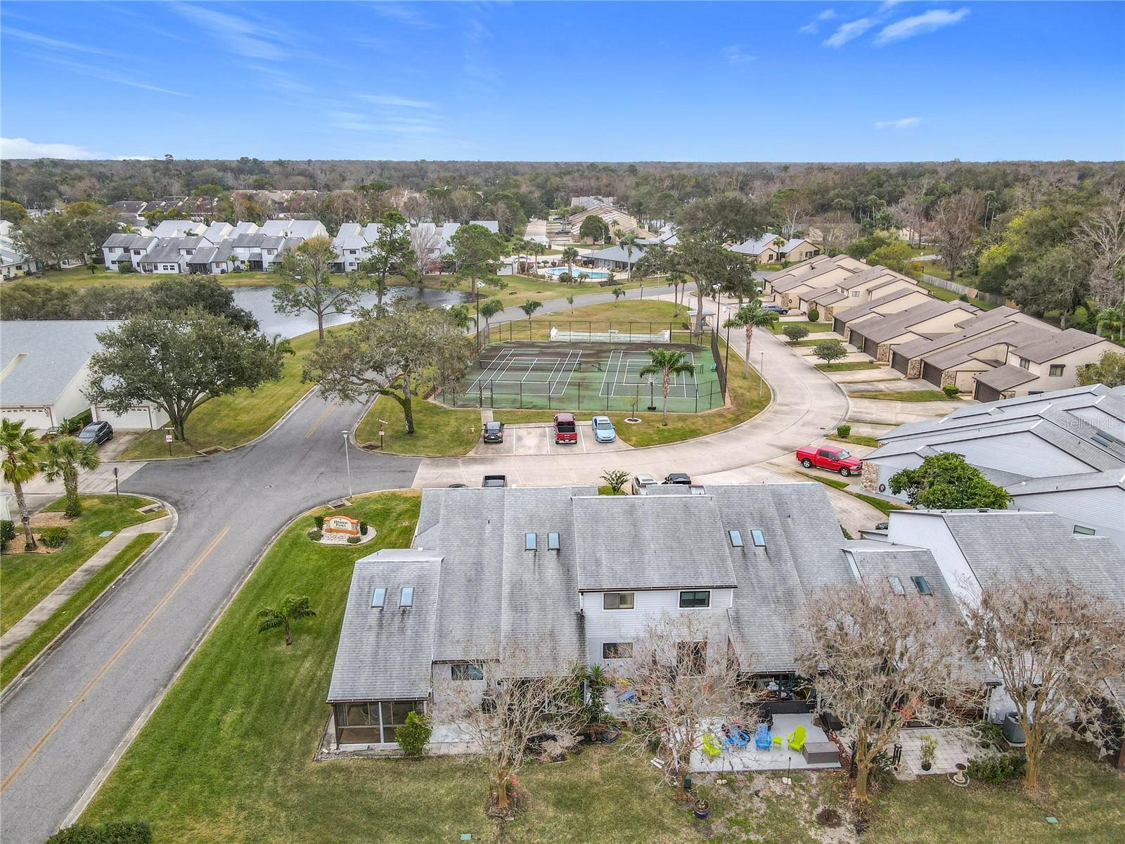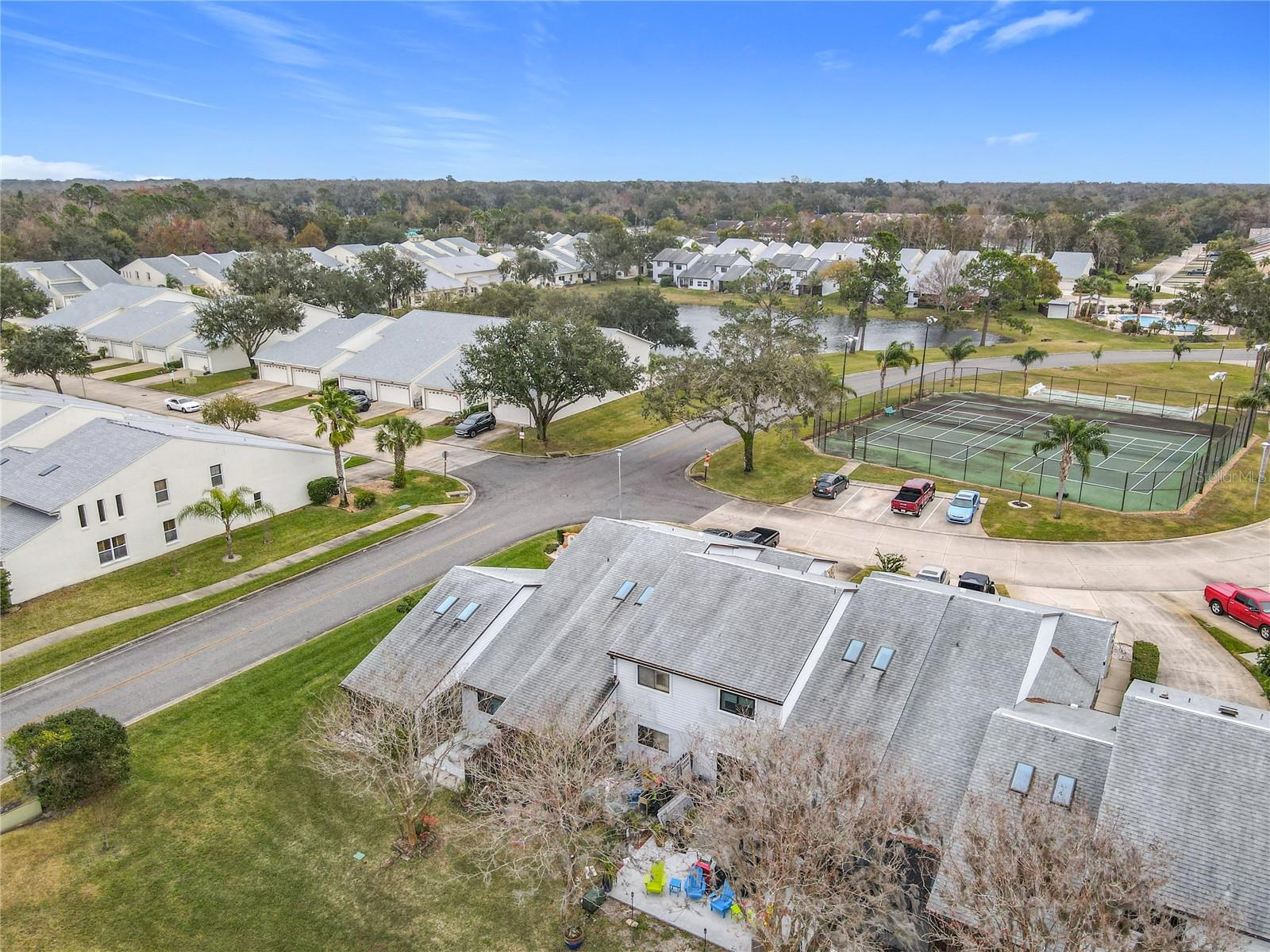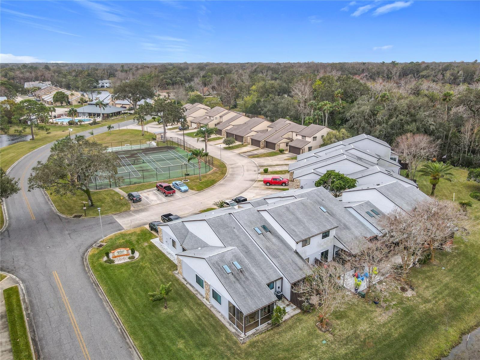 Discover this spacious Hidden Pines townhouse offering over 1,400 sq ft of air-conditioned living space and 2,400 sq ft total. Featuring 2 bedrooms, 2.5 baths, and a versatile loft that can easily be converted into a third bedroom. Located just across the street from the tennis and shuffleboard courts with extra parking. The main living area has a vaulted ceiling with skylights, providing plenty of natural light. There is ample storage space with walk-in closets in both bedrooms and the loft! Drink your morning coffee on the covered screened porch that boasts serene views of the pond and fountain. Enjoy the blend of comfort, convenience, and scenic charm in this well-maintained townhouse. Perfectly suited for a variety of lifestyles, it’s a must-see! Located close to shopping, restaurants and the beach.