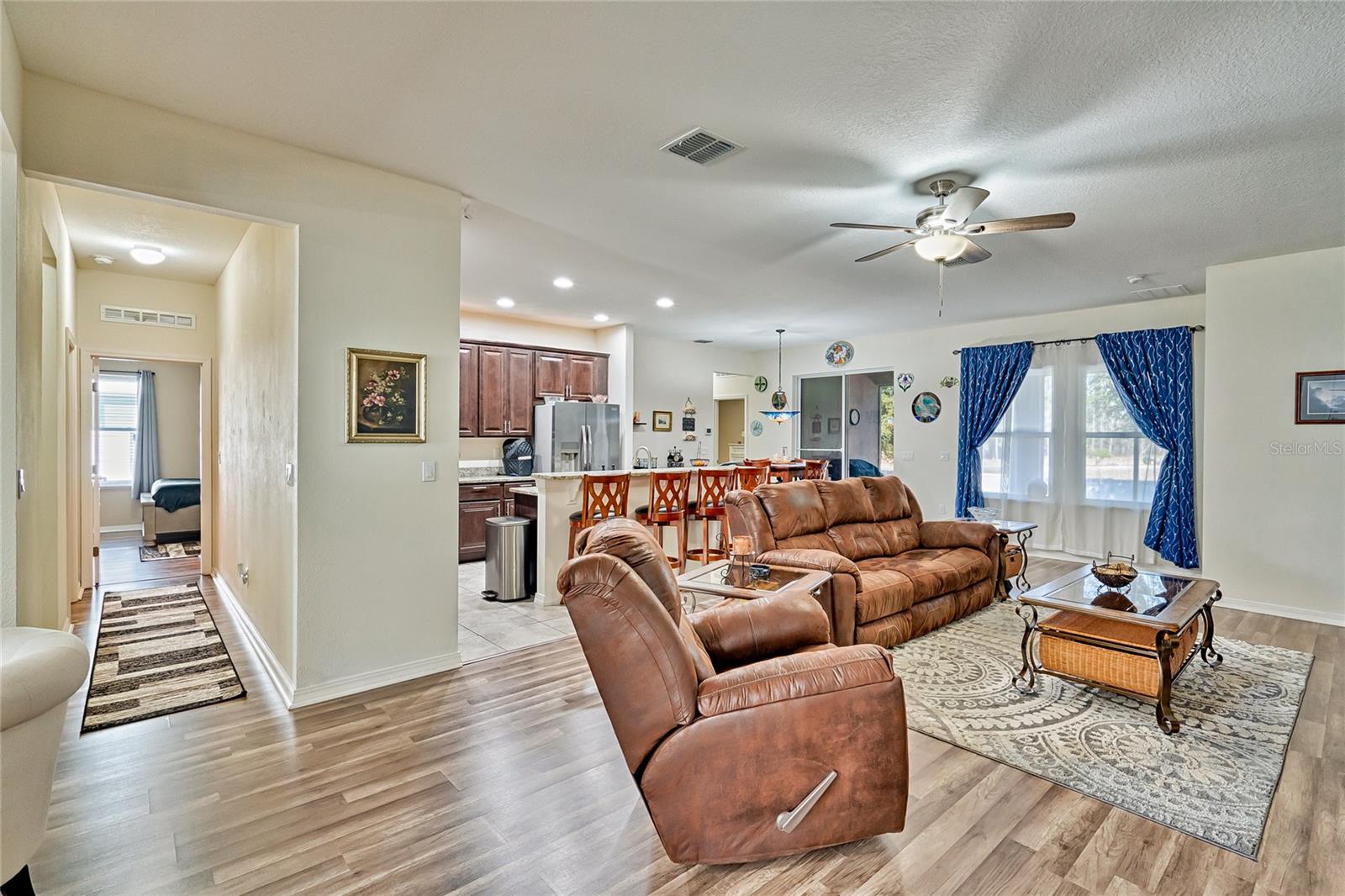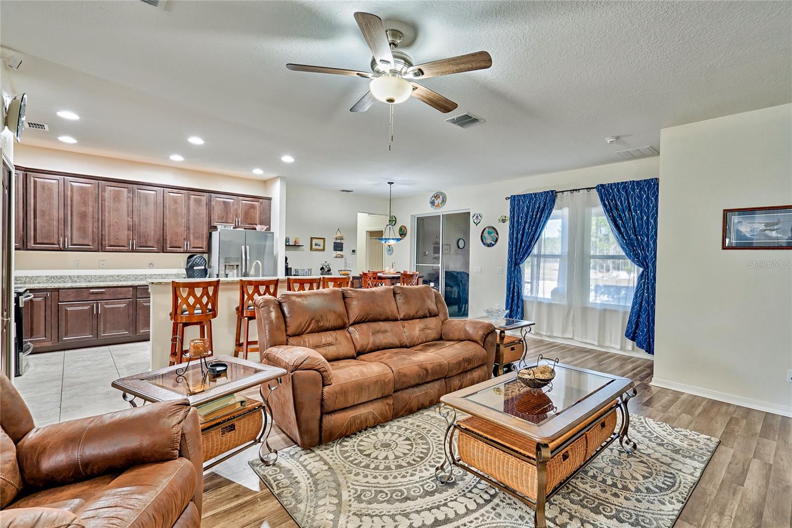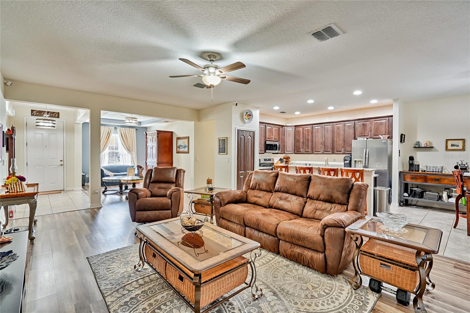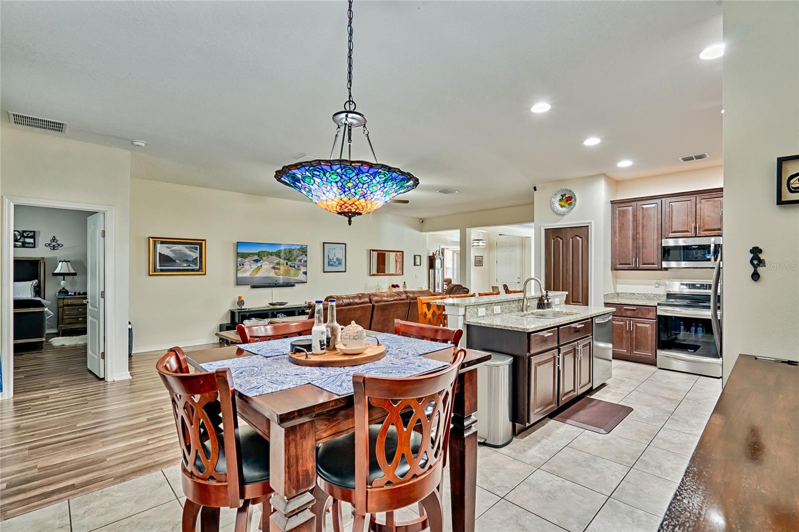 This 4 bedroom/3 bathroom turn-key, move in ready home w/ mother-in-law suite has been immaculately maintained and features a functional open floor plan! Upon entering the home you are welcomed into the foyer. The foyer is flanked by the formal living room/office with French doors and the dining area/flex space. The eat-in kitchen opens to the family room and features beautiful granite counter tops, wood cabinets, large island/breakfast bar, induction oven, SS Frigidaire Gallery appliances only 2-yrs old, built-in microwave, and pantry. The primary bedroom is very spacious and has en suite bath with a walk-in shower, dual vanities, built-in storage for linens, vanity area, and walk-in closet. The screened back patio opens to the fully fenced back yard which overlooks a retention/green space area that adds more privacy and assures no other homes would be built around you. The three-car garage is ideal for storage! This home is very low maintenance and move-in ready. Builder installed built-in pest control system which is maintained quarterly. Welcome HOME!