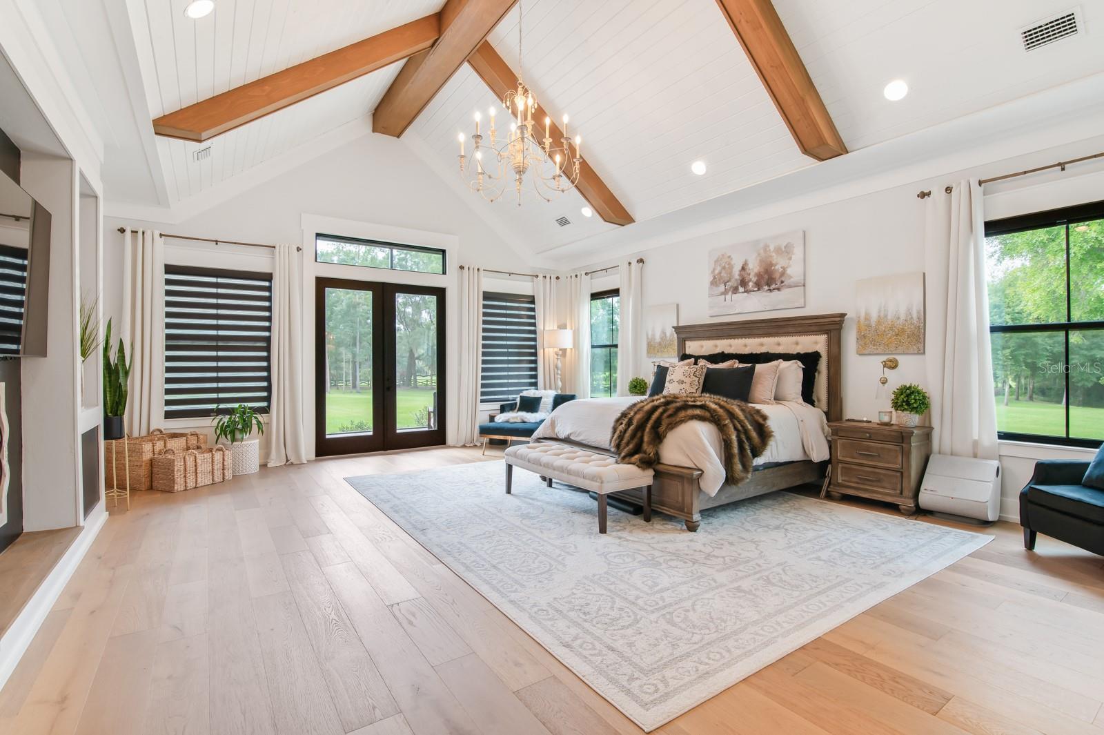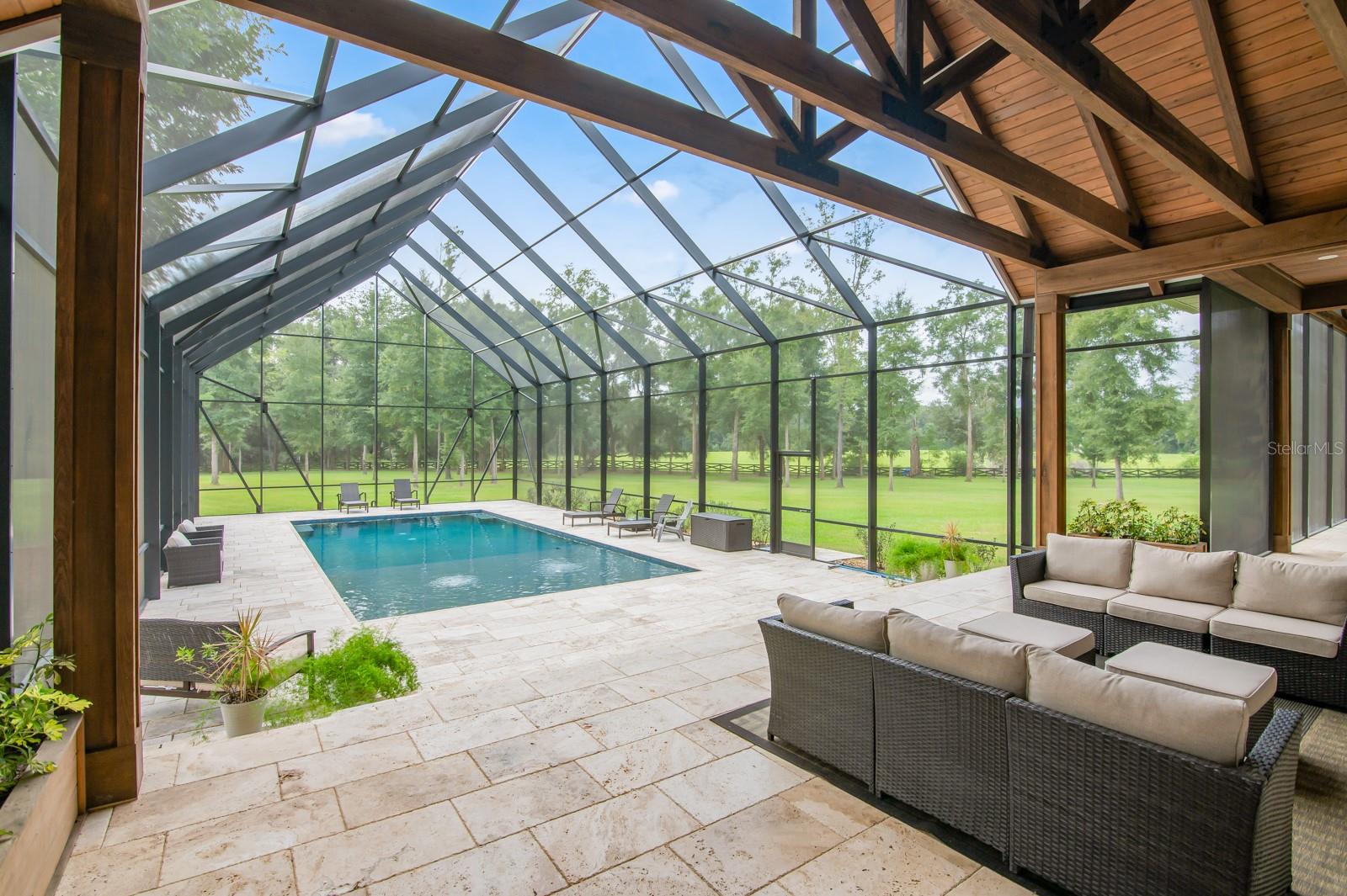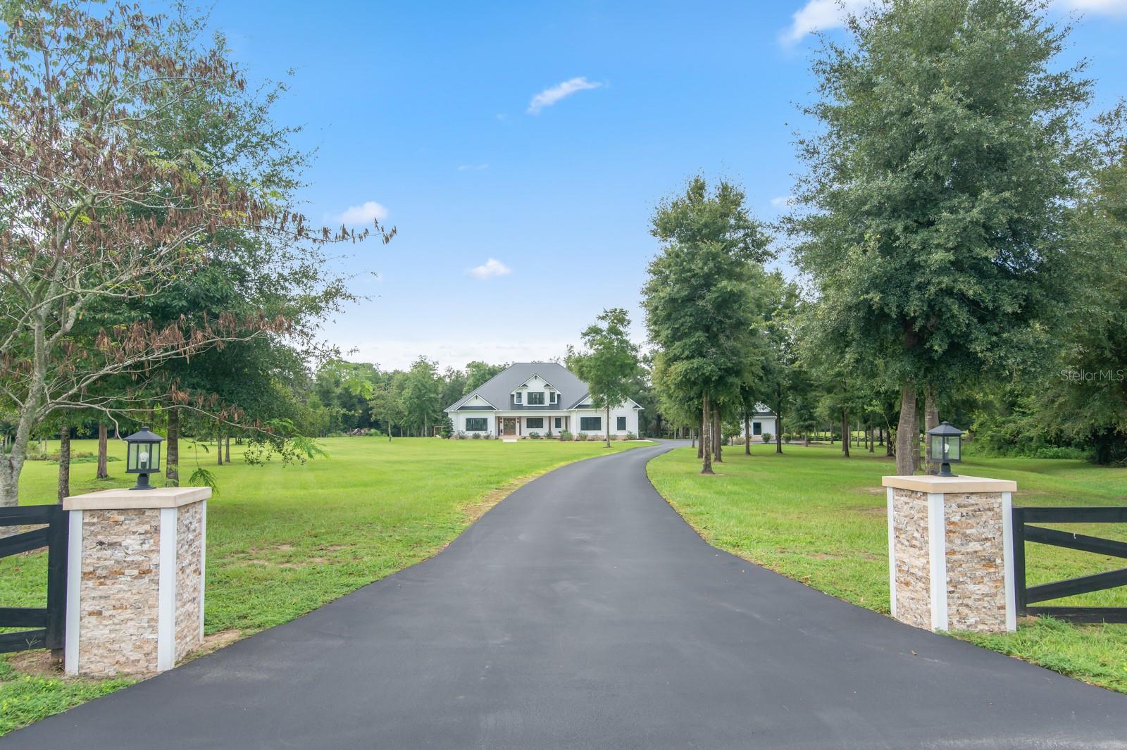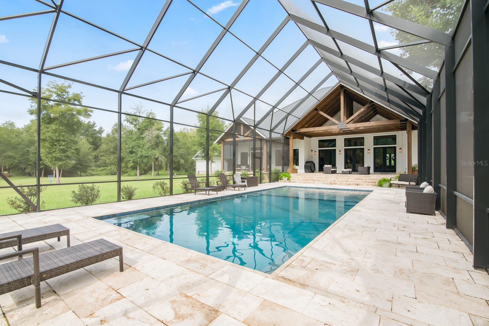 Experience refined country living in this remarkable custom-built home located within the prestigious, gated Charleston neighborhood. Set on over 6 acres, this 4-bedroom, 3.5-bath residence includes a private study, entertainment room, loft, and dedicated storage space—offering luxury and flexibility for any lifestyle. Step inside through an impressive entryway that reveals soaring 23-foot ceilings adorned with cypress tongue-and-groove accents. Rich wood floors flow throughout the home, complemented by a show-stopping staircase featuring floating solid walnut treads. The gourmet kitchen is designed for both entertaining and everyday living, featuring a large center island, high-end gas range, butler’s pantry, and a coffee/wet bar for added convenience. The open-concept layout seamlessly connects to the great room, where walls of glass overlook the spectacular outdoor oasis. The primary suite is a true retreat, complete with vaulted ceilings, private glass doors leading to the pool area, and a spa-inspired en-suite bathroom. Highlights include a glass-enclosed shower, dual vanities, and a dream-worthy custom walk-in closet with built-in cabinetry and direct access to the laundry room. Step outside to your own private paradise: a screened saltwater pool with hand-built cypress trusses and extensive travertine decking—perfect for year-round enjoyment. Additional features include two tankless water heaters, full-house generator hookup, Central vacuum system and water softener. Four-car garage, large underground propane tank and Horse-friendly property. This home offers a rare blend of luxury, functionality, and space—truly a must-see.