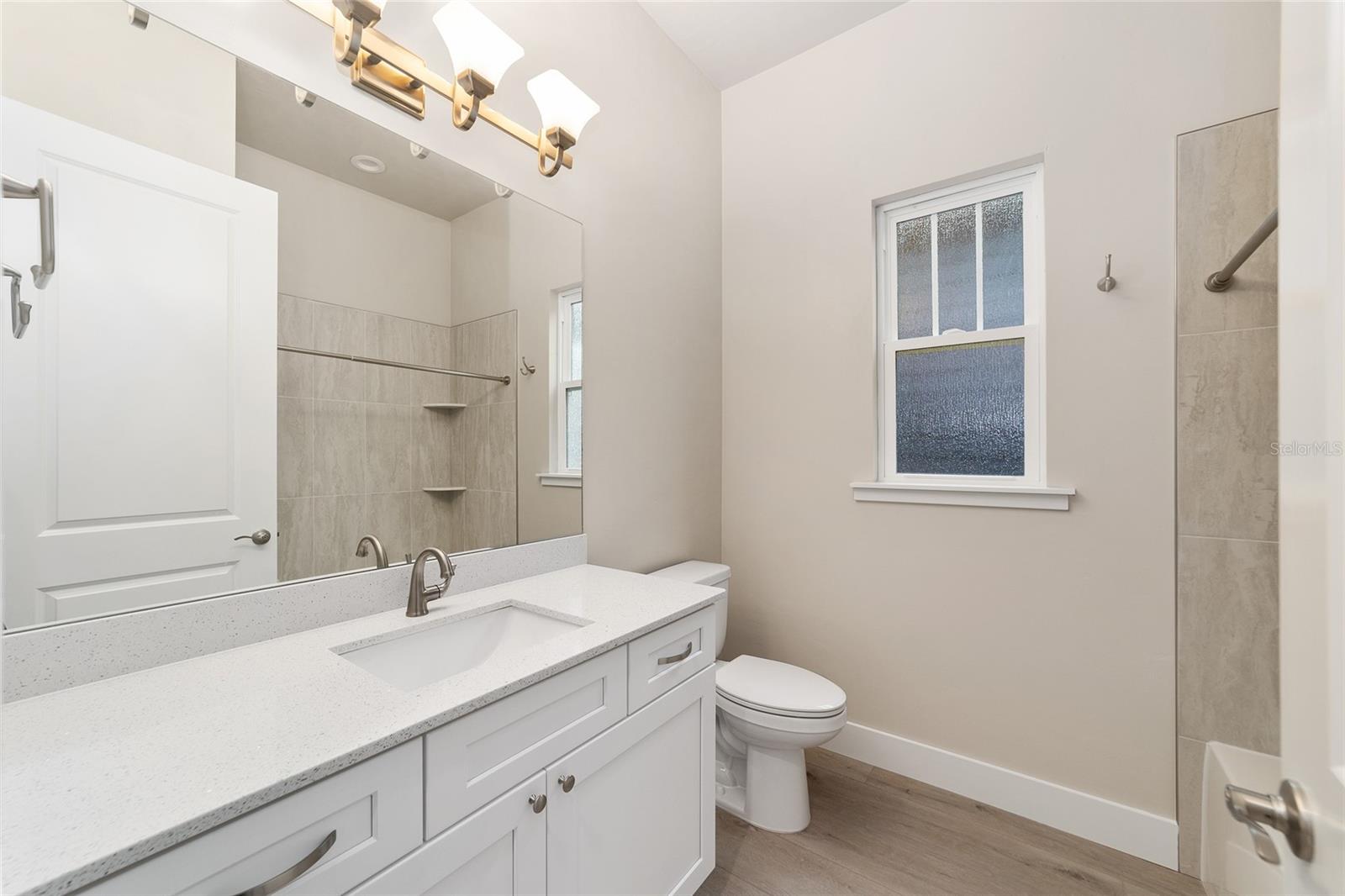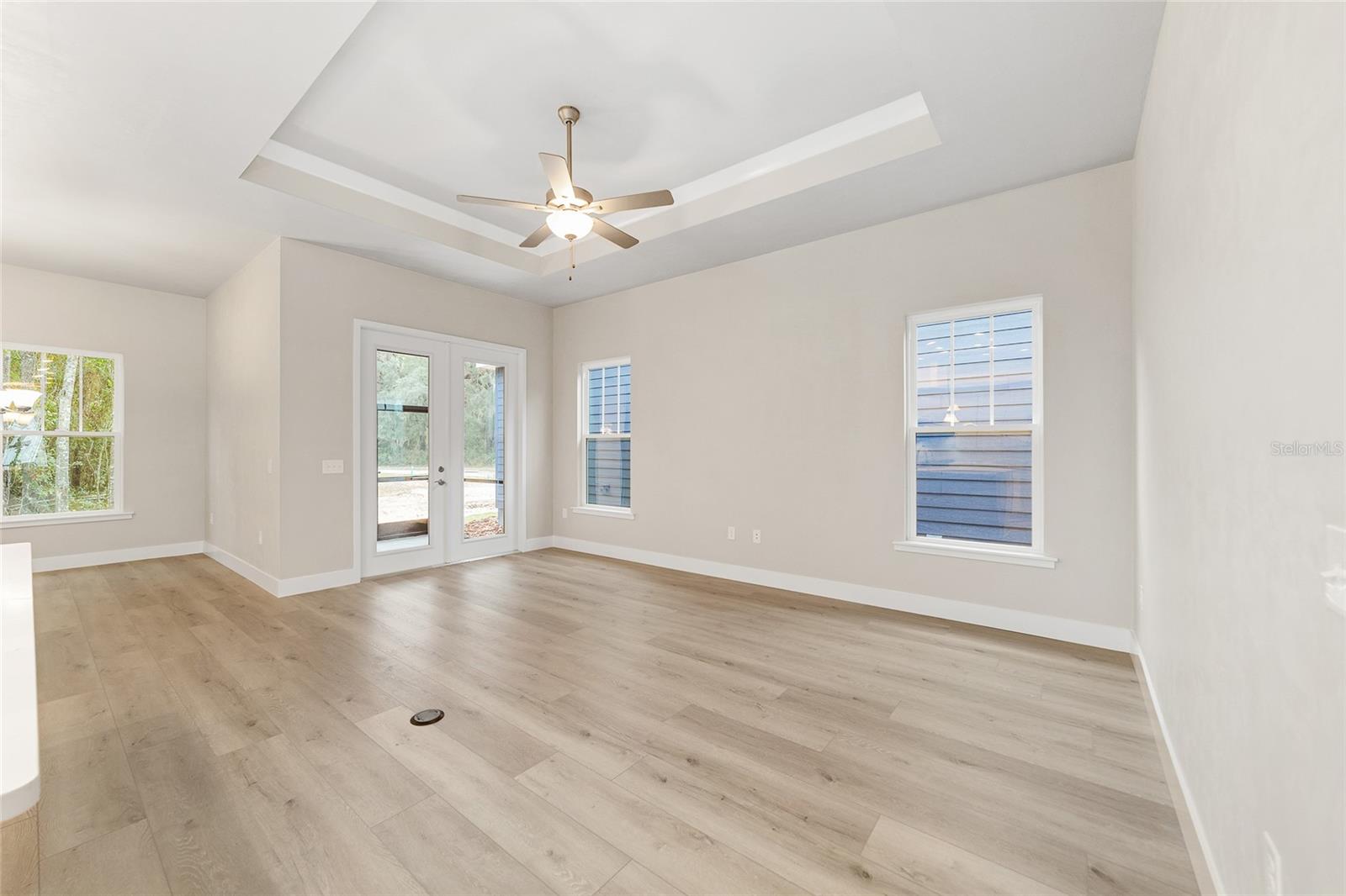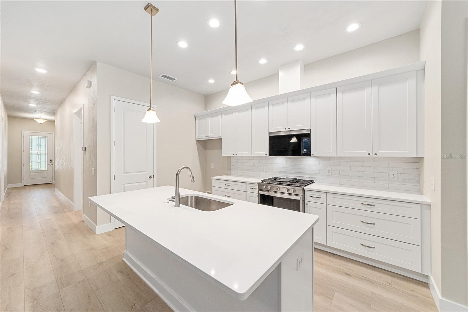 AVAILABLE NOW! NO CDD. Move-in ready NEW construction with a 1% builder credit toward buyer closing costs! The Ramona II Model by the Builder of the Year, Kara Bolton Homes, is a spacious 3 bedroom/2 bath with a 1 1/2-car garage and inviting front porch. The home features wood look luxury plank flooring throughout the entire home. With 10 ft. ceilings and 8 ft. doors, the open floor plan is spacious and inviting. The kitchen features ample lighting, quartz countertops, undermount sink, solid wood cabinets with soft close drawers and stainless-steel appliances including a gas stove, with over the range vented microwave, dishwasher and disposal. The Living Room features trey ceiling and glass doors leading to a covered and screened porch/lanai area, creating an indoor/outdoor living space. The impressive Primary Suite includes a large walk-in closet with en-suite bathroom with an oversized walk-in shower, quartz topped double vanity and water closet. The two additional bedrooms are spacious and comfortable, with a stylish second bath that includes a tiled shower/bath and quartz finishes. Modern move in ready upgrades include window blinds for added privacy, endless hot water from a tankless gas hot water heater, a smart deadbolt, and coach lights on a photocell. Fully landscaped eco-friendly Zoysia sod with irrigation. The impressive exterior includes Hardie board siding and decorative pavers. Low $110 monthly HOA covers COX high speed internet along with access to pool, clubhouse, tennis and pickleball courts, and partial front maintenance. Minutes from shopping and dining, only 4.5 mi to North Florida Regional Hospital, 11 mi to Shands and VA Hospitals and 8 mi to UF. Schedule your showing today! Please verify current school zones with ACSB.