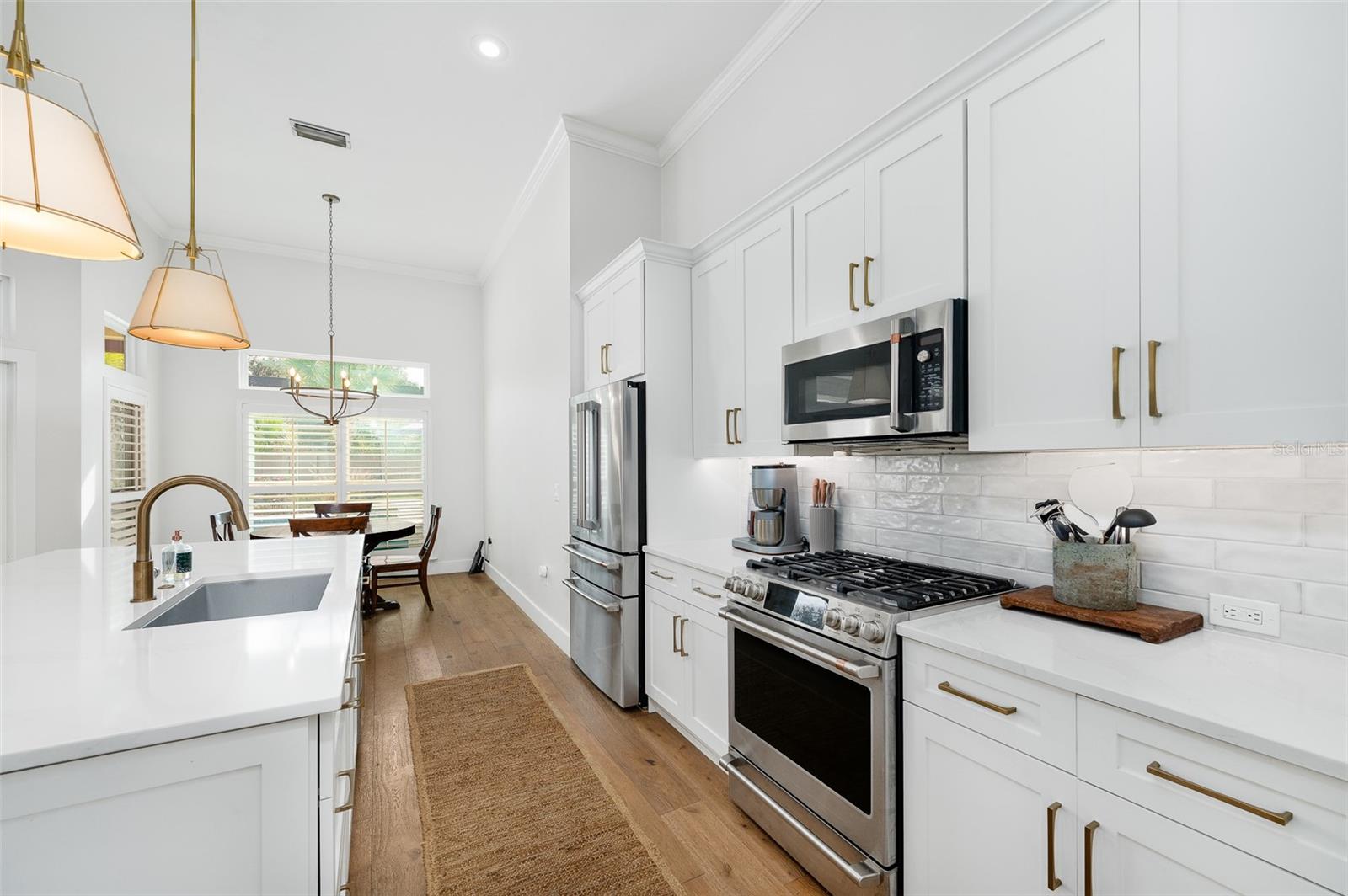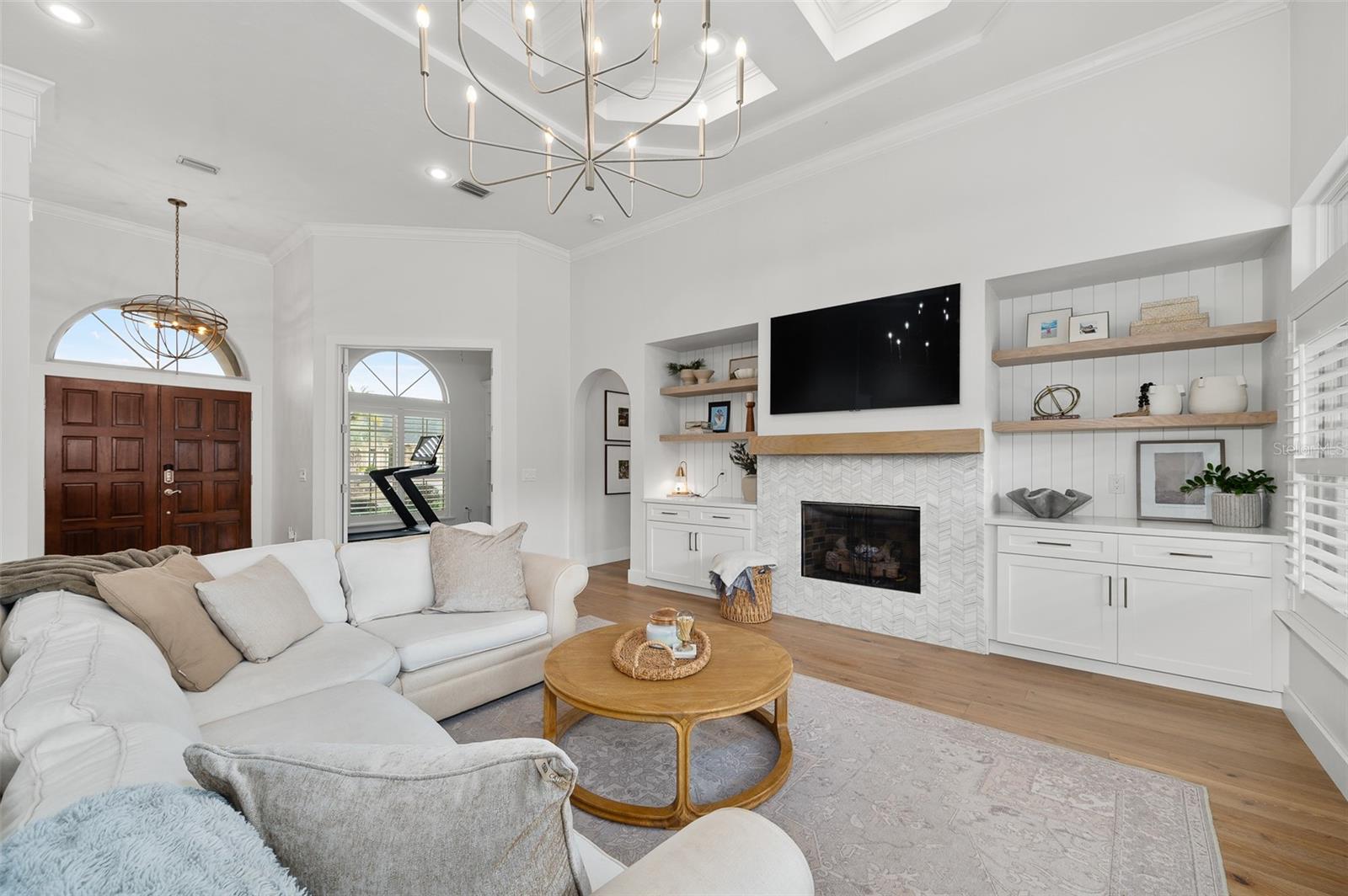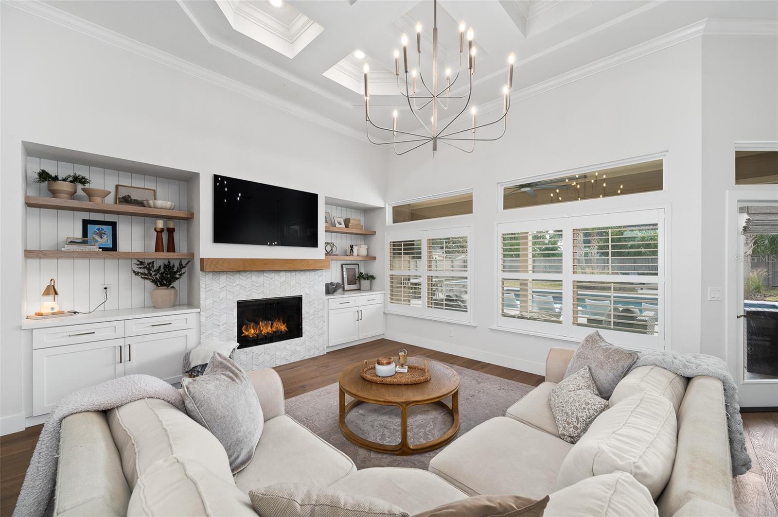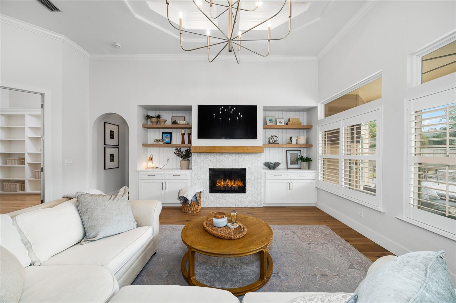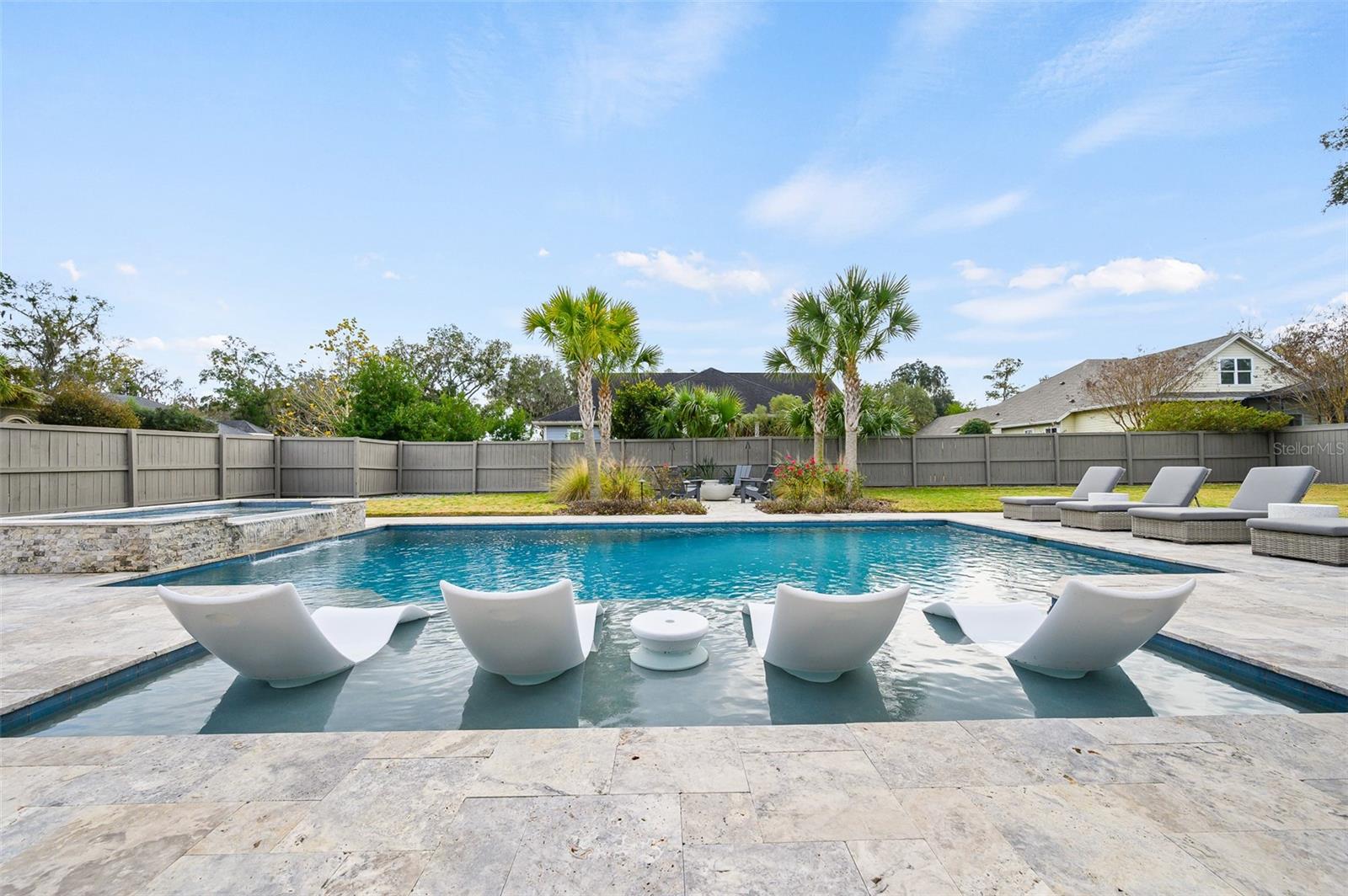 Welcome to this fully renovated 4-bedroom, 3-bath POOL/SPA home with a dedicated STUDY, located in the highly desirable Arbor Greens community. Thoughtfully updated from top to bottom, this home blends timeless elegance with modern luxury, featuring wire-brushed, high-quality engineered wood floors and plantation shutters throughout. The heart of the home is the stunning open-concept great room, seamlessly connected to the kitchen and highlighted by soaring ceilings with coffered detail. A gas fireplace with a luxury tile surround, modern built-ins, and floating shelves creates a striking focal point, while expansive windows offer breathtaking views of the pool and backyard. The chef’s kitchen has been completely renovated with new cabinetry, quartz countertops, a designer tile backsplash, and premium 2025 stainless steel Café appliances. The laundry room is equally impressive, featuring custom cabinetry, quartz counters, a resin sink, and a newer front-loading washer and dryer. The split floor plan offers exceptional privacy, with the primary suite tucked away and showcasing dual closets with custom built-in shelving and a luxurious bathroom complete with a soaking tub, separate glass-enclosed shower, and dual vanities. Three additional guest bedrooms share two beautifully updated full bathrooms, one of which also serves as a convenient pool bath with direct access to the backyard. Step outside to your own private resort, where a spectacular pool added in 2022 awaits. This outdoor oasis includes an expansive travertine paver patio, oversized spillover hot tub, extended firepit area, and custom landscape lighting by Entropics featuring elegant tiki torch accents. A covered lanai with motorized screens allows for year-round enjoyment while overlooking the large, fully fenced backyard. Additional highlights include fresh designer paint, new light and plumbing fixtures throughout, gas tankless water heater, a 50-amp hookup for a whole-house generator, wiring in the garage for an EV charger and natural gas hook up for future summer kitchen on patio. Arbor Greens offers top-rated school zoning for Meadowbrook Elementary, Fort Clarke Middle, and Buchholz High, along with a community clubhouse, pool, and playground. Enjoy direct access to Jonesville shopping, including Publix, CVS, restaurants, and more. This exceptional home offers luxury living, thoughtful upgrades, and an unbeatable location.