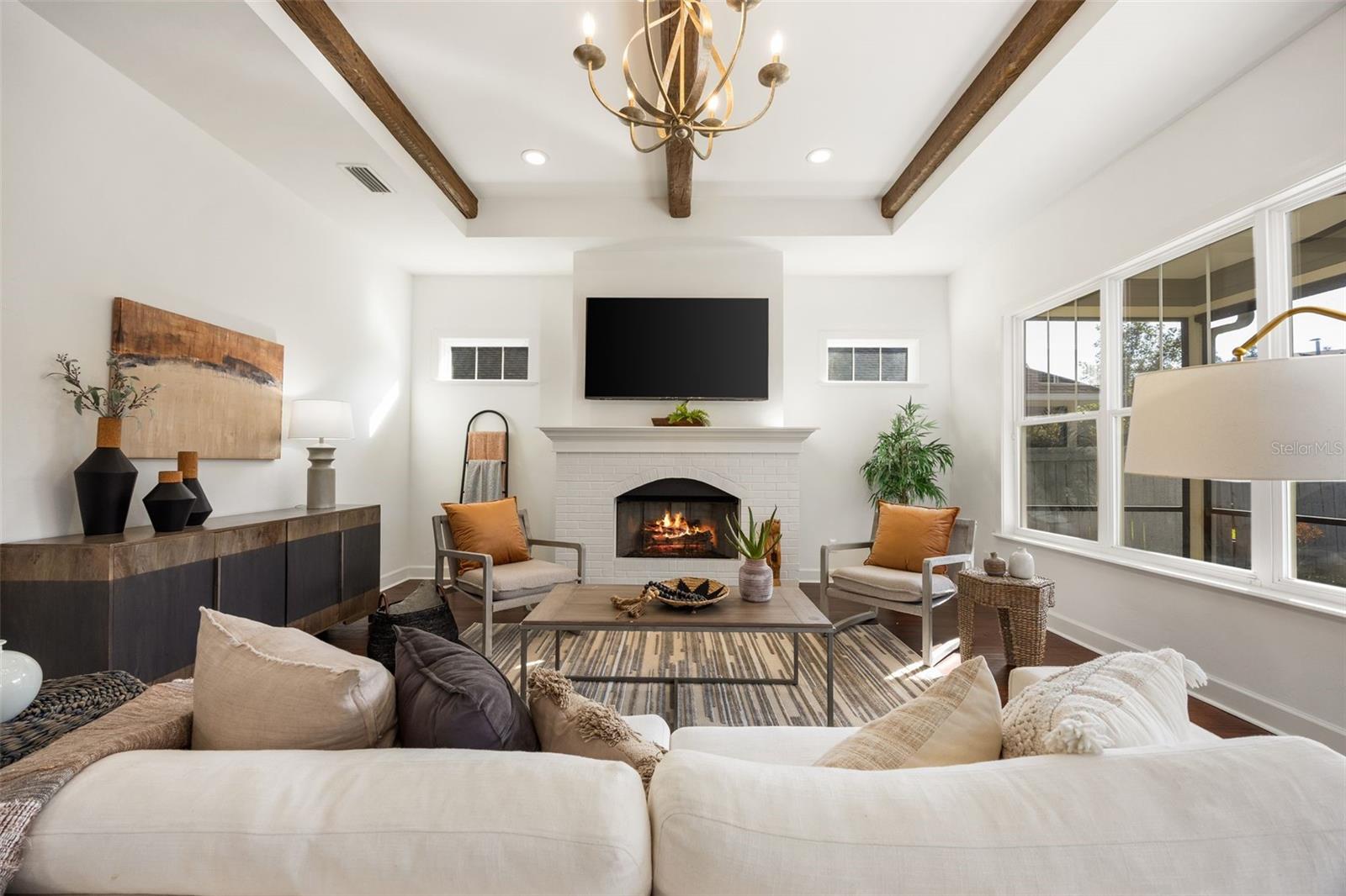 Experience a higher standard of construction in this custom-built Joyner home. Stunning 3 bedroom, 2 bathroom perfectly situated in the highly sought-after Arbor Greens community. Designed for modern comfort and style, this residence also features a versatile office/flex room, ideal for working from home or a dedicated hobby space. Step inside to discover an inviting atmosphere marked by elegant wood floors, a cozy fireplace, and stunning architectural details including tray ceilings and rustic wood beams. The newly painted interior provides a fresh, move-in-ready feel. The heart of the home is a chef's delight, boasting a gourmet kitchen equipped with a gas stove, luxurious granite countertops, and sleek stainless steel appliances. Outdoor living is effortless with an oversized screened porch, perfect for enjoying the beautiful Florida weather overlooking the meticulously green manicured yard. The home's curb appeal is undeniable, featuring a charming facade with a brick paver driveway and walkway and a welcoming wood accented porch ceiling. Location is everything! This home offers an extremely walkable lifestyle, less than one mile from the vibrant Tioga Town Center. Enjoy unparalleled convenience with easy access to a variety of restaurants, boutique shopping, a grocery store, pre-schools, a fitness center, physical therapy, and more! Don't miss the opportunity to make this exquisite Arbor Greens property your new address!