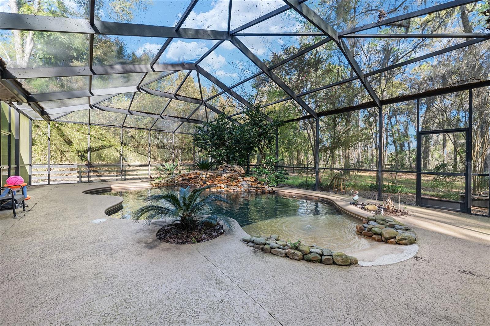 One or more photo(s) has been virtually staged. Situated within the gated Steeplechase Farms community, this 5-bedroom, 3 full and 2 half-bath custom home offers over 4,100 square feet of living space on 1.78 private acres. Major updates have already been completed, including a new roof (2024), HVAC (2021), and water heater (2020), providing added peace of mind. The interior features high ceilings, a stone-accented fireplace, and open living and dining areas, along with a spacious kitchen offering a large island, pantry, and ample prep space. The main-level primary suite includes direct pool access, dual closets, and a generous en-suite bath, while three additional bedrooms and an upstairs suite provide flexible living options for guests or multi-generational needs. Outdoors, enjoy a screen-enclosed pool with an extended deck and covered lanai, all set on a fully fenced lot shaded by mature oaks with no rear neighbors. A circular paved driveway and side-entry three-car garage add both function and curb appeal, all just minutes from Newberry, Tioga, Publix, and UF/Shands.