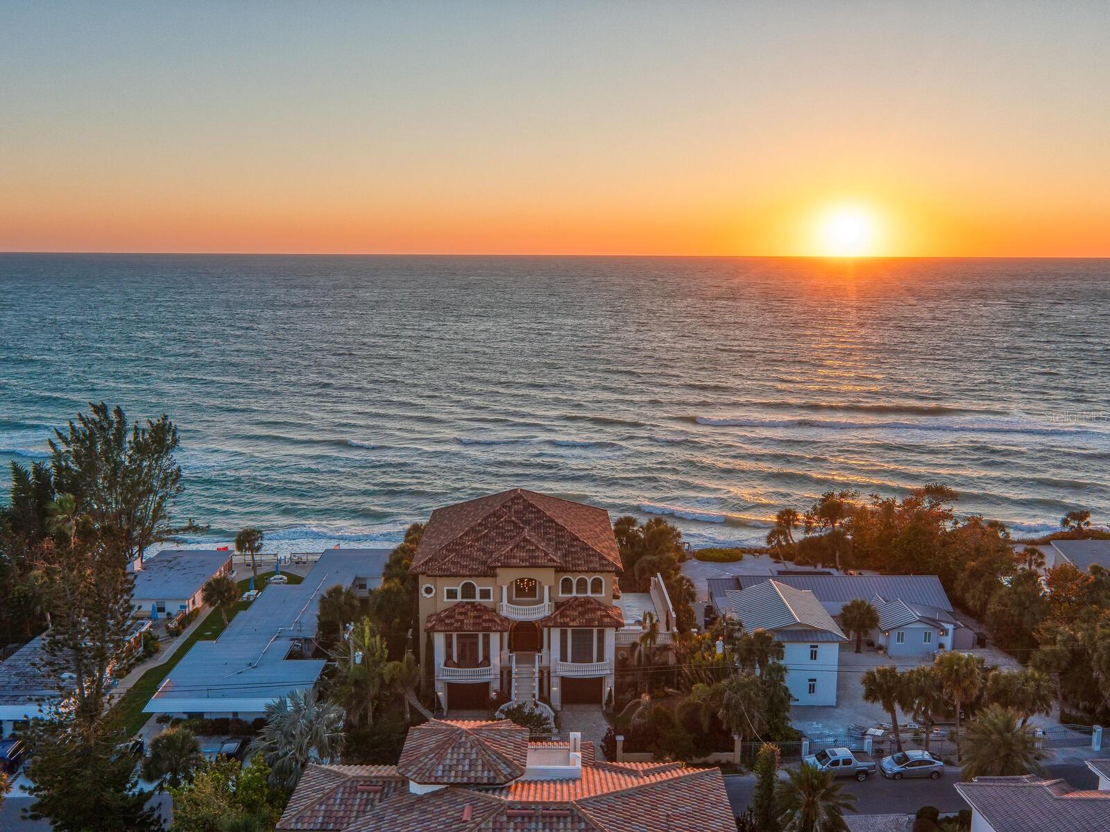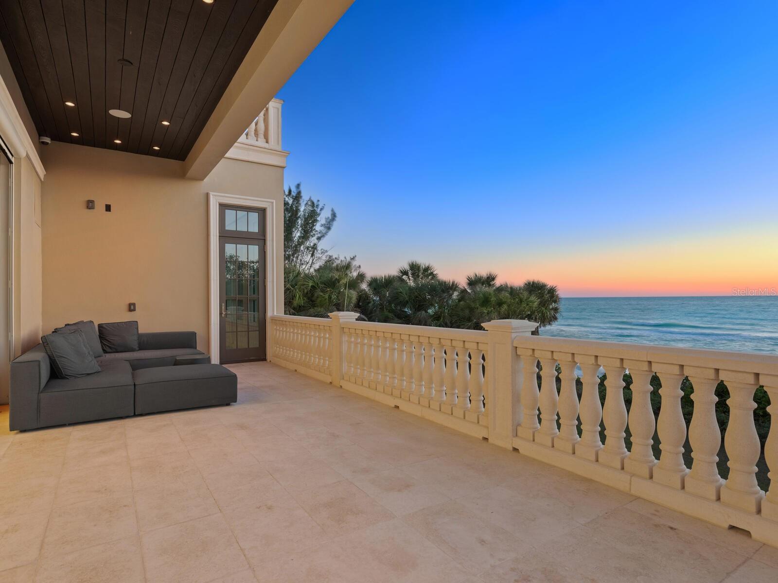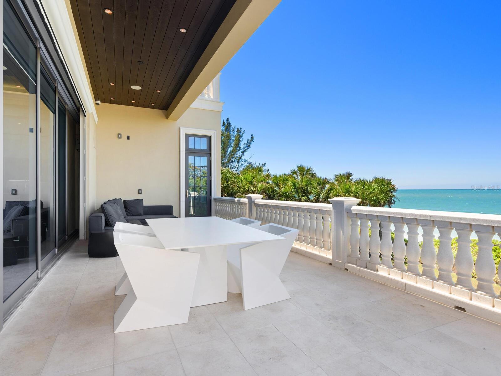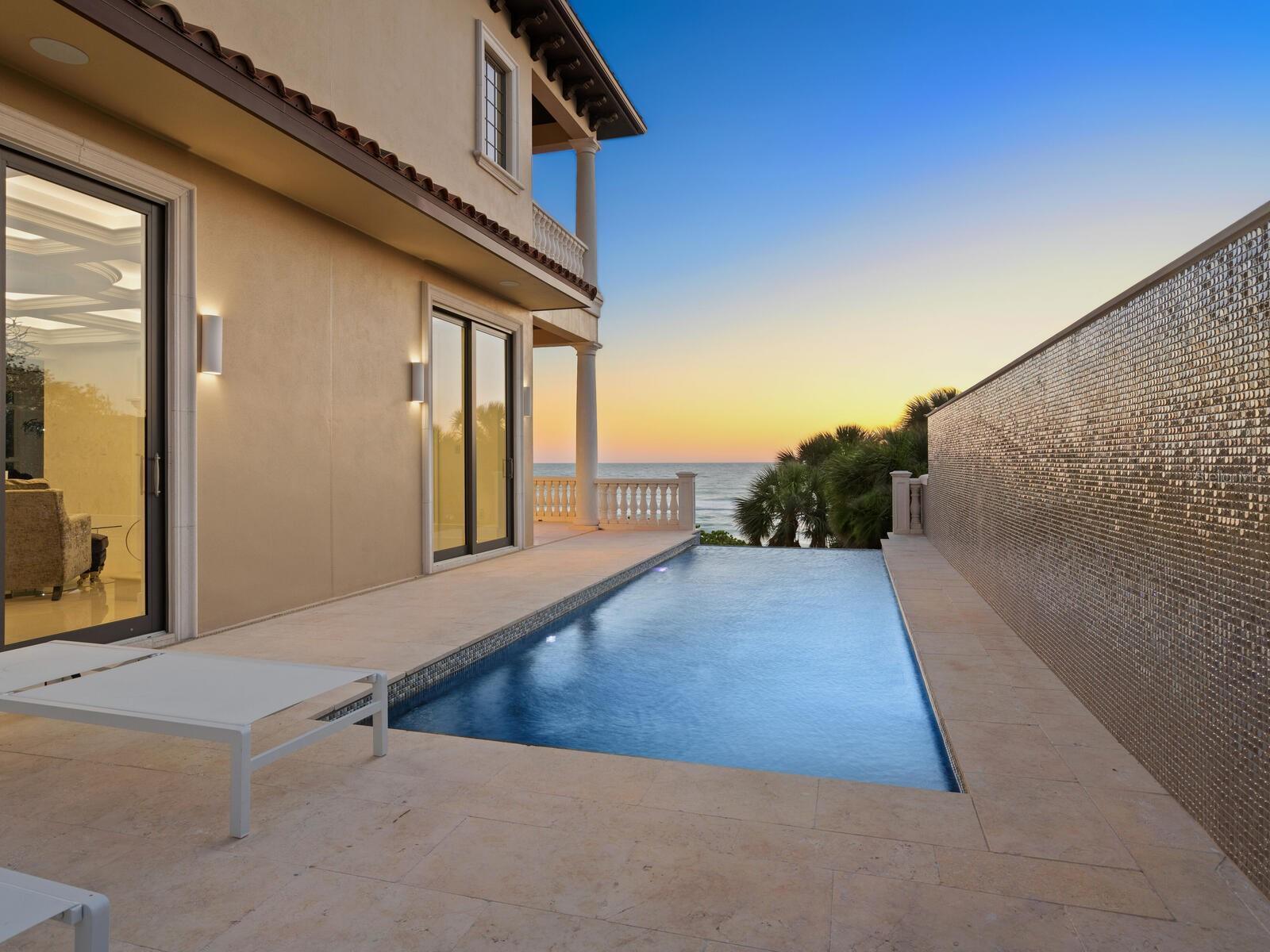 Refined elegance in a near-perfect location just steps from the white sandy beach, this 2018-built Casey Key gulf front estate has it all. Upon entering through the custom wood-arched double doors one may be taken aback by the juxtaposition of the traditional exterior and dramatic clean lined interior that gives way to breathtaking views of the gentle blue waters of the Gulf of Mexico. Towering ceilings and expansive walls of glass maximize the water vistas while the use of unique finishes and custom design elements create an impressive yet comfortable feeling throughout. Designed for entertaining, the home's main living areas are open to terracing outdoor spaces creating a seamless functional flow inside and out that accentuates the true island lifestyle. The gourmet kitchen is completely open to the adjacent dining area and great room and includes custom Italian Cucina cabinetry, Dekton counters, galley sink, a large rectangular island with counter height seating, and an appliance package featuring cabinet front Miele refrigerator, freezer, and dishwasher, two Bosch double wall ovens and Induction cooktop, and a Sharp microwave built into the island. The open infinity pool is just off the great room and is the perfect spot to relax after a day on the beach or to take in a stunning sunset. There is a pool bath accessible from the pool deck. The main living level also features a state-of-the-art media room with seating for seven, a guest suite, a powder room, and a butler’s pantry. The second living level boasts a spa-like owner’s retreat with a private terrace, a sitting area, a walk-through closet, dual vanities, a water closet, free-standing tub, and a frameless glass-enclosed shower with multiple shower heads. There are two additional guest suites and a large laundry room on this level as well. The lower level features a walkout to a private back yard and an enormous amount of storage space. A Creston home automation system, full house Generac generator, three-stop elevator, gas fireplace, motorized screens, motorized sliding glass door, hidden linear air conditioning vents, and two, two-car garages complete this incredible home.