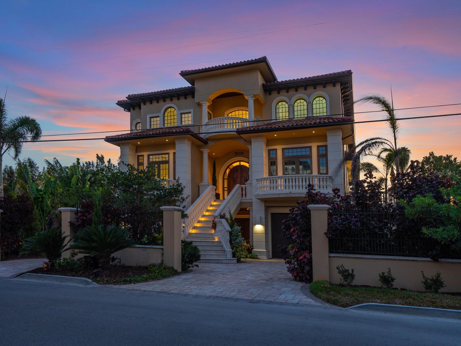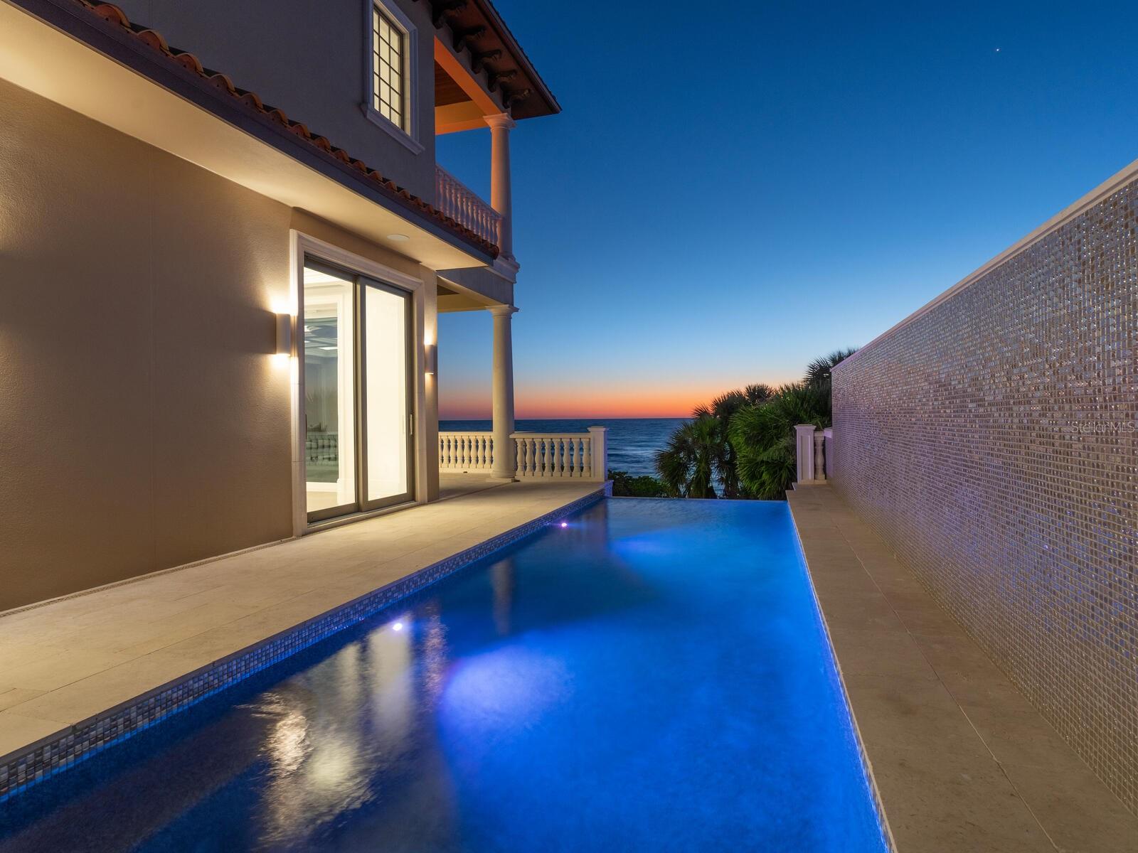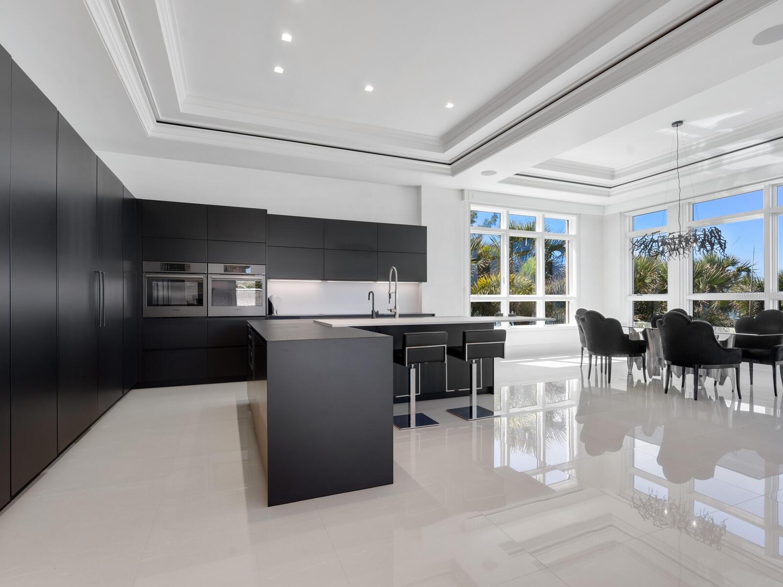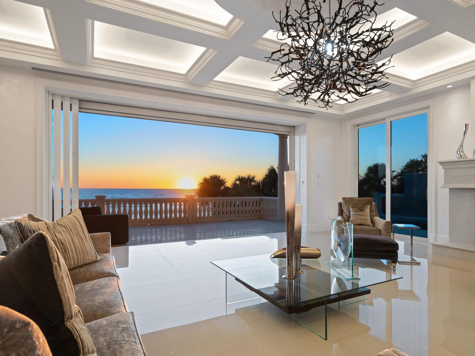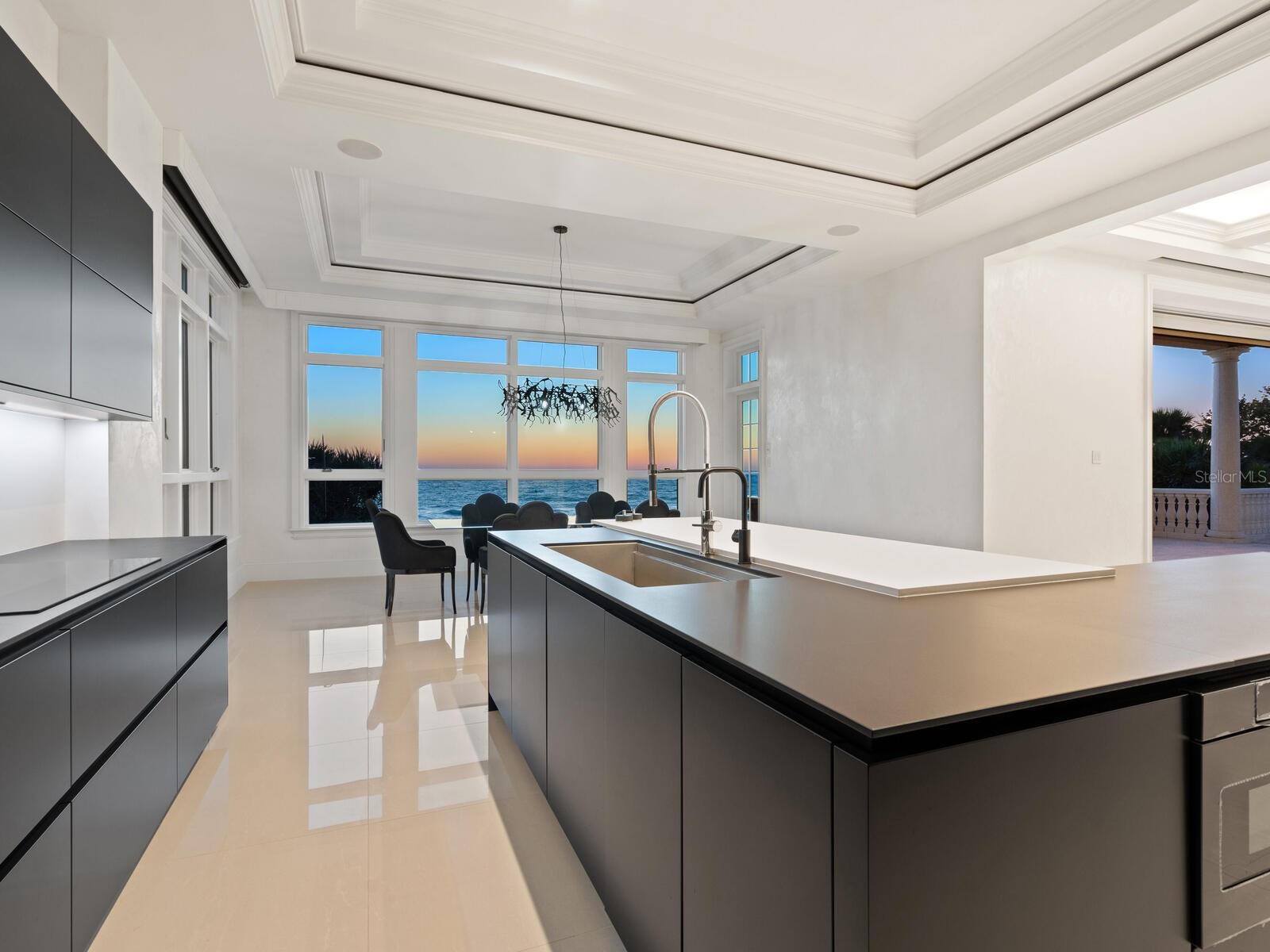 Refined elegance in a near-perfect location just steps from the white sandy beach, this 2018-built Casey Key gulf front estate has it all. Upon entering through the custom wood-arched double doors one may be taken aback by the juxtaposition of the traditional exterior and dramatic clean lined interior that gives way to breathtaking views of the gentle blue waters of the Gulf of Mexico. Towering ceilings and expansive walls of glass maximize the water vistas while the use of unique finishes and custom design elements create an impressive yet comfortable feeling throughout. Designed for entertaining, the home's main living areas are open to terracing outdoor spaces creating a seamless functional flow inside and out that accentuates the true island lifestyle. The gourmet kitchen is completely open to the adjacent dining area and great room and includes custom Italian Cucina cabinetry, Dekton counters, galley sink, a large rectangular island with counter height seating, and an appliance package featuring cabinet front Miele refrigerator, freezer, and dishwasher, two Bosch double wall ovens and Induction cooktop, and a Sharp microwave built into the island. The open infinity pool is just off the great room and is the perfect spot to relax after a day on the beach or to take in a stunning sunset. There is a pool bath accessible from the pool deck. The main living level also features a state-of-the-art media room with seating for seven, a guest suite, a powder room, and a butler’s pantry. The second living level boasts a spa-like owner’s retreat with a private terrace, a sitting area, a walk-through closet, dual vanities, a water closet, free-standing tub, and a frameless glass-enclosed shower with multiple shower heads. There are two additional guest suites and a large laundry room on this level as well. The lower level features a walkout to a private back yard and an enormous amount of storage space. A Creston home automation system, full house Generac generator, three-stop elevator, gas fireplace, motorized screens, motorized sliding glass door, hidden linear air conditioning vents, and two, two-car garages complete this incredible home.