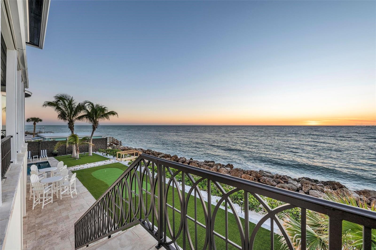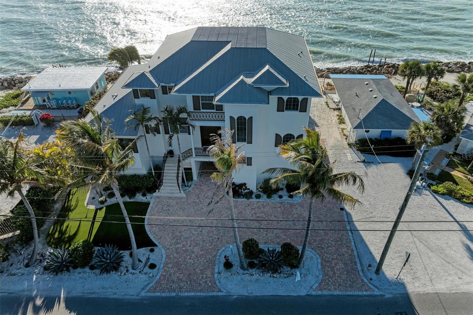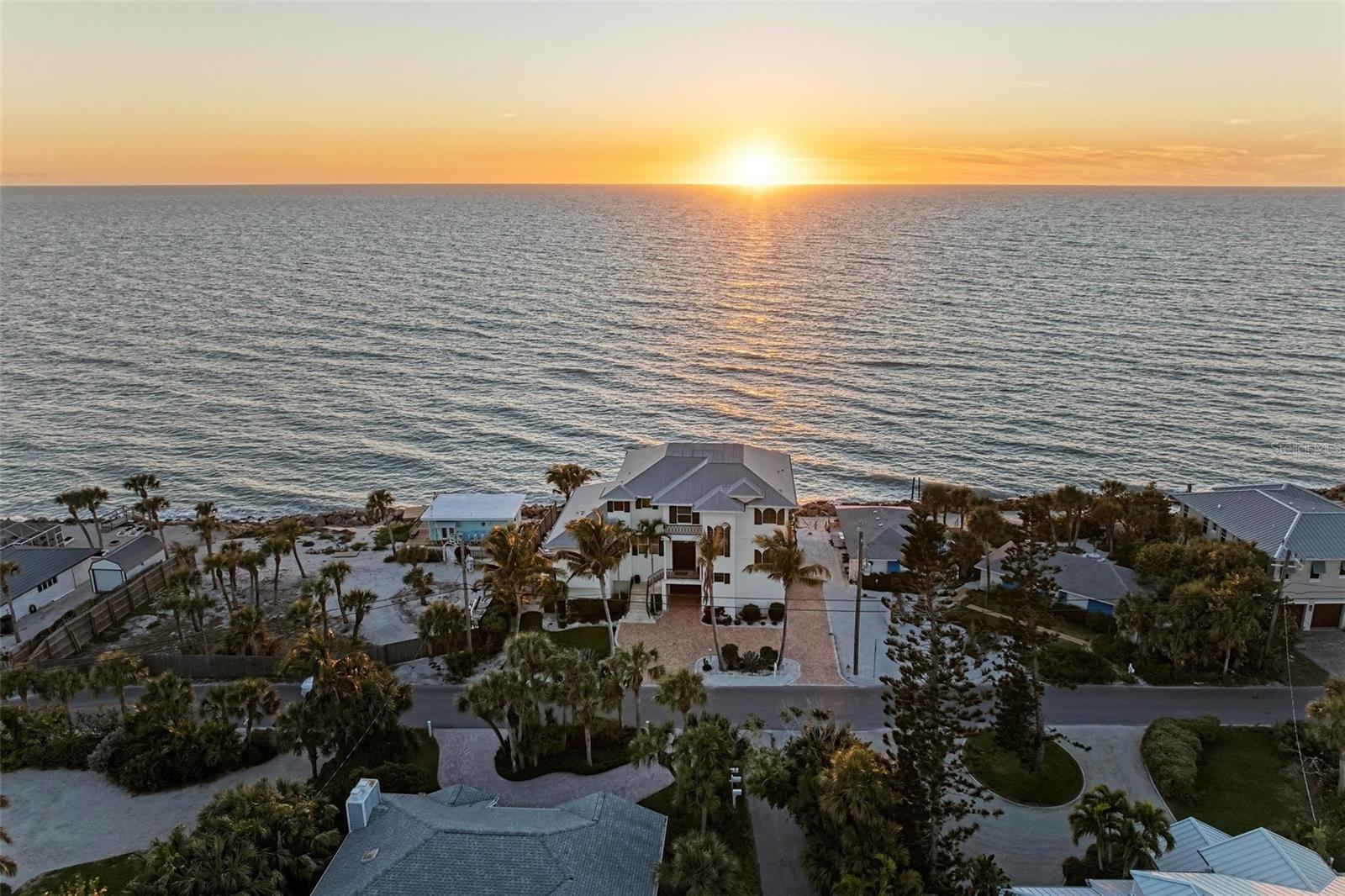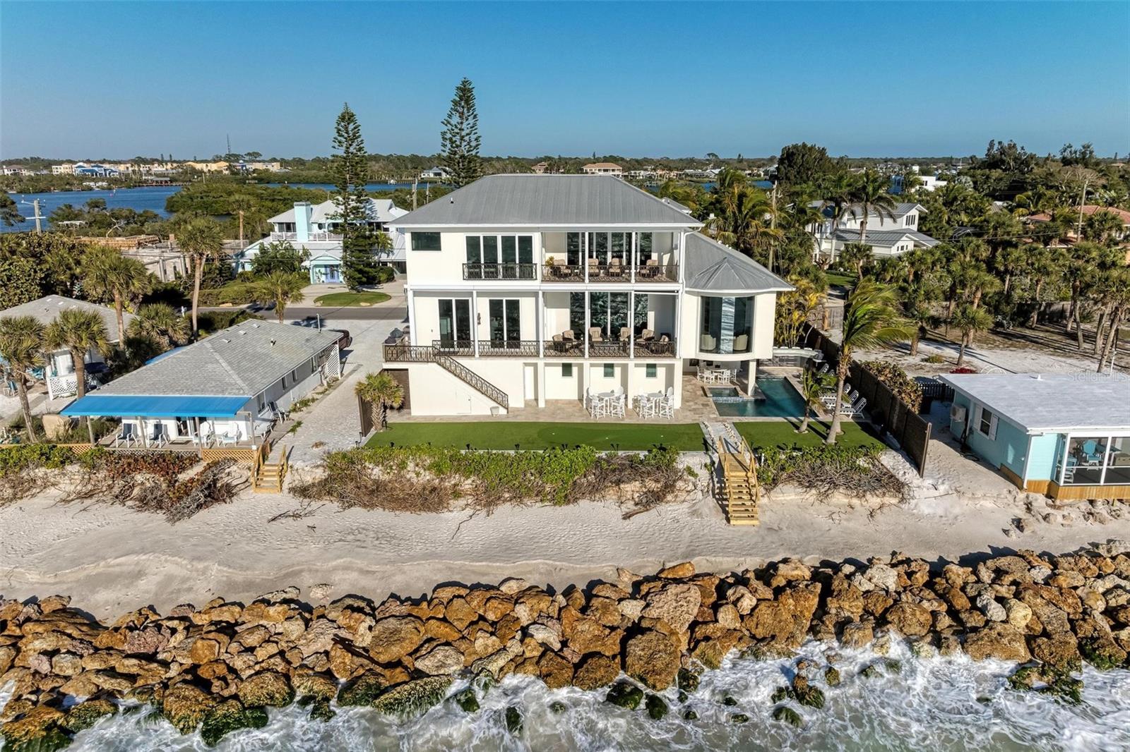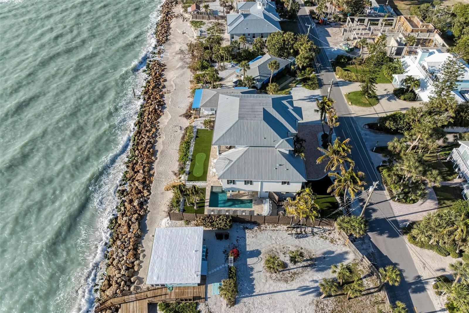 Nestled along the pristine shores of Casey Key, this luxurious residence optimizes coastal living at its finest. Boasting breathtaking panoramic views of the Gulf of Mexico, this 4-bedroom, 4.5-bathroom plus pool room with full bath, home is a masterpiece of architectural design and opulent comfort. Upon entering, guests are greeted by an elegant foyer leading to a spacious living area adorned with floor-to-ceiling windows and balcony, allowing natural light to cascade throughout the space and offering uninterrupted vistas of the turquoise waters beyond. The open-concept layout seamlessly connects the living room, dining area, and gourmet kitchen, creating an ideal setting for entertaining or simply enjoying tranquil evenings with loved ones. The kitchen is a chef's dream, featuring top-of-the-line appliances, custom cabinetry, and a center island with bar seating. Adjacent to the kitchen is an inclusive dining area, perfect for enjoying morning coffee while soaking in the breathtaking views or entertaining guests for dinner parties. For added convenience, an elevator provides easy access to all levels of the home, ensuring accessibility for residents and guests alike. The master suite, located on the main floor, is a sanctuary unto itself, complete with a spa-like bathroom featuring a walk-in shower, dual vanities, and a walk-in closet. With floor to ceiling picture windows, waking to the serene views is easy with remote shades for optimal relaxation and resting. On the second floor, you'll discover three additional bedroom suites, each providing serene havens. One suite could be a second master suite with soaking tub, dual vanity, and walk-in shower and closet that provide a private escape of expansive coastal views. Adjacent to these bedrooms, a family room awaits, ideal for hosting gatherings or unwinding in comfort. Step out onto the expansive balcony and immerse yourself in the soothing melody of waves crashing against the shore, enhancing the atmosphere of relaxation and tranquility. The expansive outdoor living space is an entertainer's paradise, featuring a sparkling salt water heated pool and spa overlooking the Gulf, a spacious deck for sunbathing, and a putting green for golf enthusiasts. Outdoor kitchen by the pool area and on the main level makes it easy to entertain in both areas watching the award winning sunsets of Casey Key. The pool room with dishwasher, sink, ice maker, and refrigerator plus full bath makes after pool or beach fun easily cleaned up and not tracked through the main home. Full feature sheet attached as the upgrades are endless! With its unparalleled location, luxurious amenities, and unparalleled views, this Casey Key residence offers a rare opportunity to experience coastal living at its absolute finest. Whether as a full-time residence or a vacation retreat, this magnificent home is sure to exceed even the most discerning buyer's expectations.