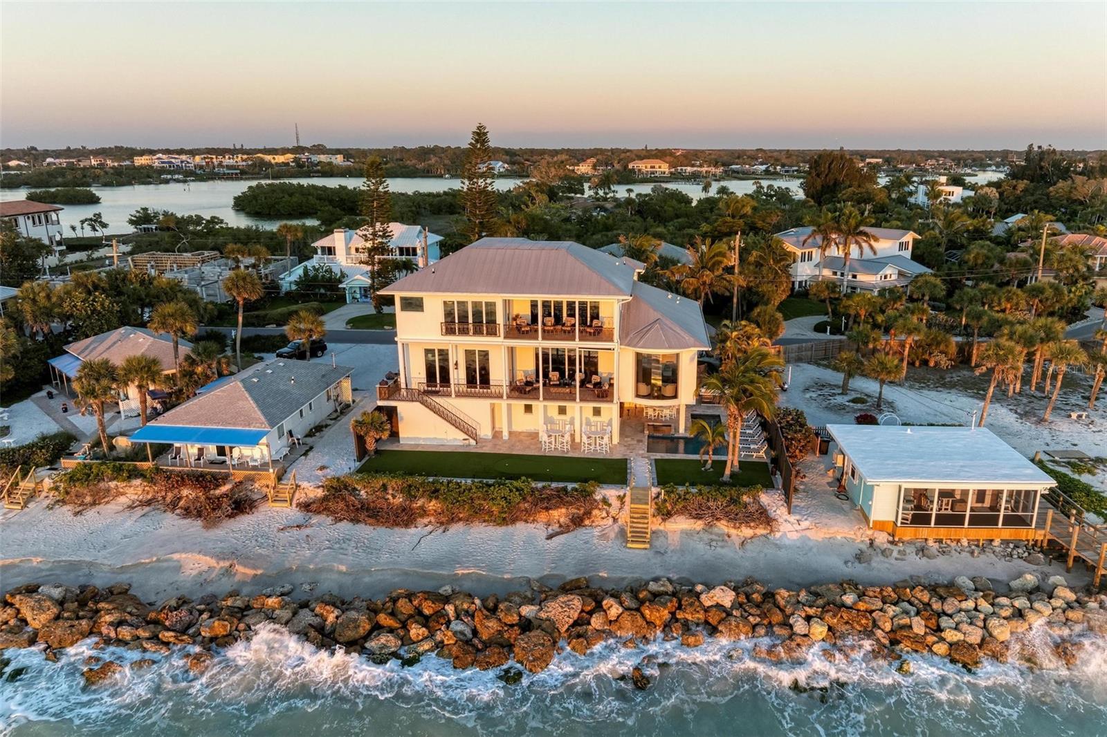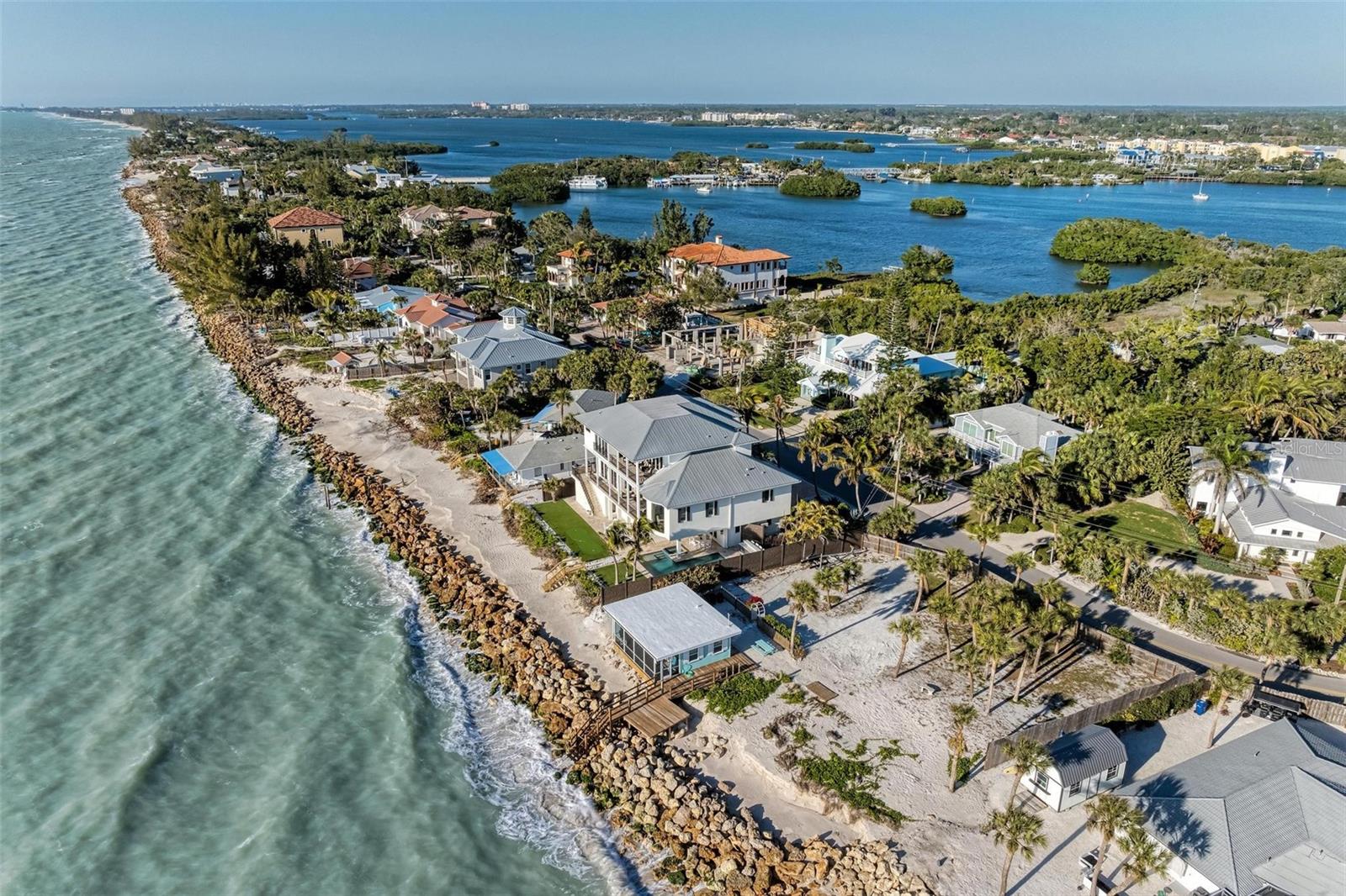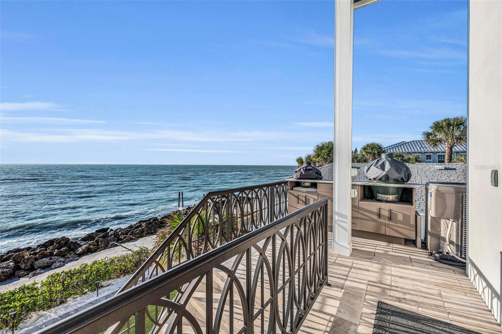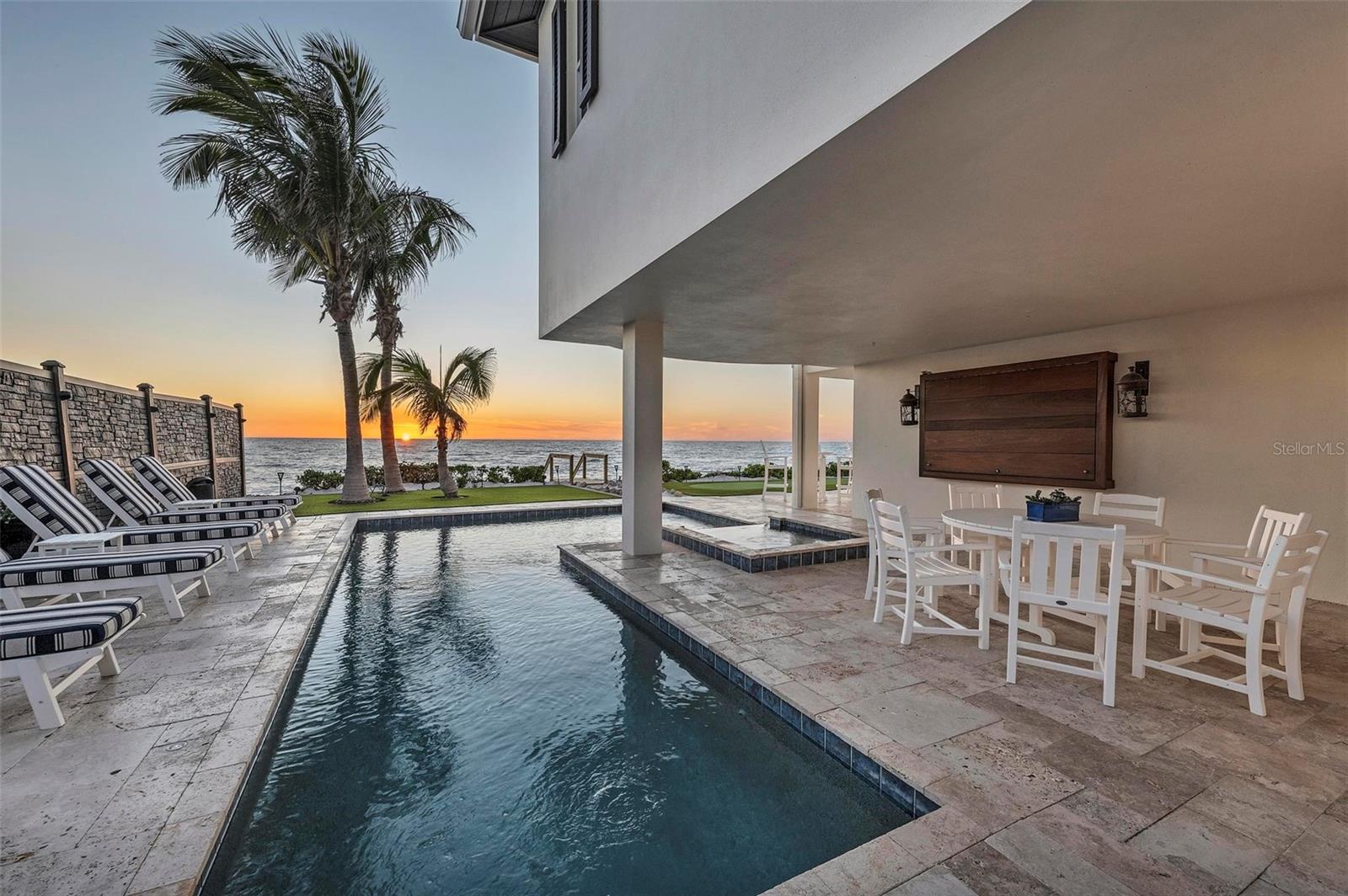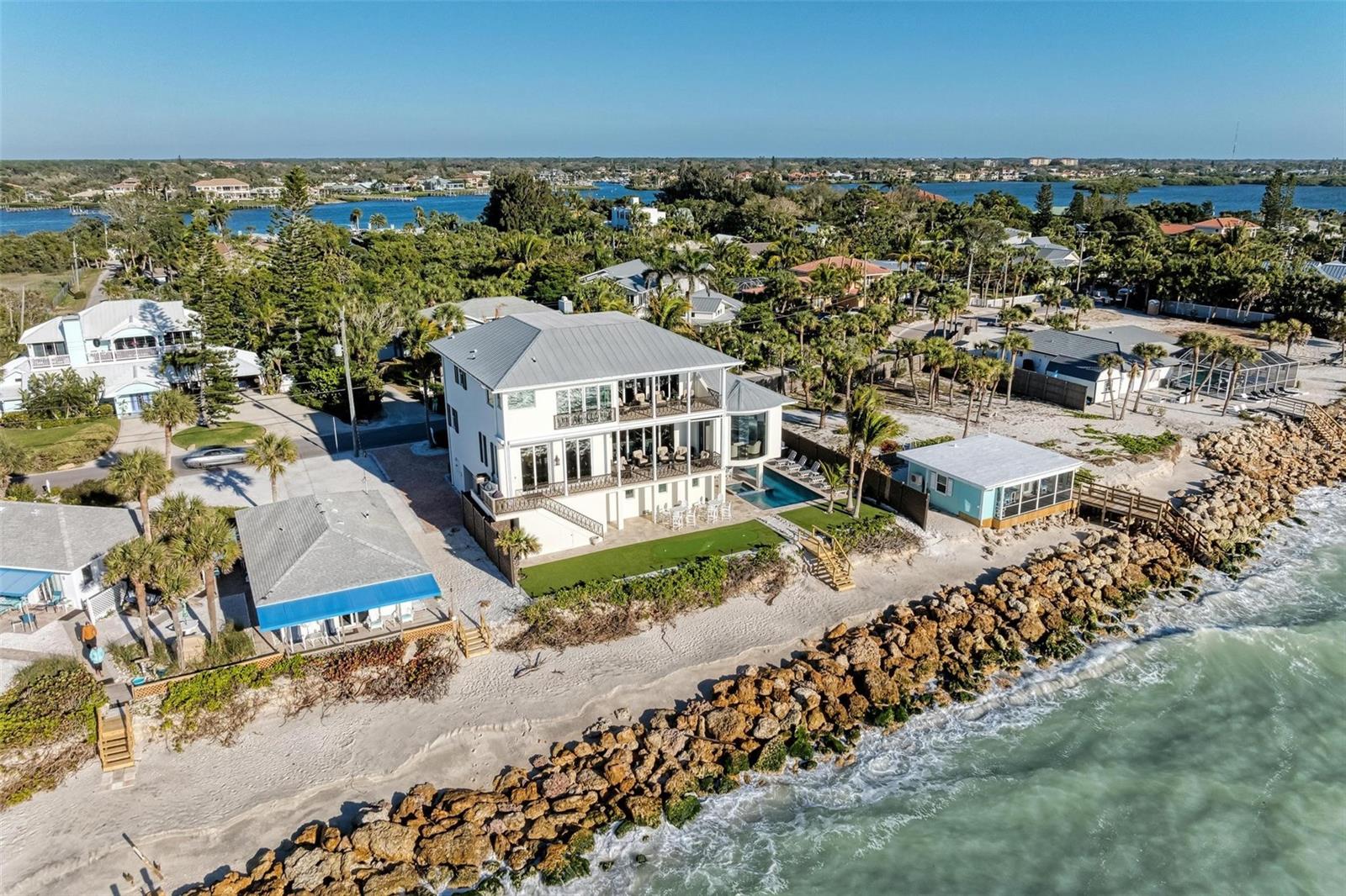 Nestled along the pristine shores of Casey Key, this luxurious residence optimizes coastal living at its finest. Boasting breathtaking panoramic views of the Gulf of Mexico, this 4-bedroom, 4.5-bathroom plus pool room with full bath, home is a masterpiece of architectural design and opulent comfort. Upon entering, guests are greeted by an elegant foyer leading to a spacious living area adorned with floor-to-ceiling windows and balcony, allowing natural light to cascade throughout the space and offering uninterrupted vistas of the turquoise waters beyond. The open-concept layout seamlessly connects the living room, dining area, and gourmet kitchen, creating an ideal setting for entertaining or simply enjoying tranquil evenings with loved ones. The kitchen is a chef's dream, featuring top-of-the-line appliances, custom cabinetry, and a center island with bar seating. Adjacent to the kitchen is an inclusive dining area, perfect for enjoying morning coffee while soaking in the breathtaking views or entertaining guests for dinner parties. For added convenience, an elevator provides easy access to all levels of the home, ensuring accessibility for residents and guests alike. The master suite, located on the main floor, is a sanctuary unto itself, complete with a spa-like bathroom featuring a walk-in shower, dual vanities, and a walk-in closet. With floor to ceiling picture windows, waking to the serene views is easy with remote shades for optimal relaxation and resting. On the second floor, you'll discover three additional bedroom suites, each providing serene havens. One suite could be a second master suite with soaking tub, dual vanity, and walk-in shower and closet that provide a private escape of expansive coastal views. Adjacent to these bedrooms, a family room awaits, ideal for hosting gatherings or unwinding in comfort. Step out onto the expansive balcony and immerse yourself in the soothing melody of waves crashing against the shore, enhancing the atmosphere of relaxation and tranquility. The expansive outdoor living space is an entertainer's paradise, featuring a sparkling salt water heated pool and spa overlooking the Gulf, a spacious deck for sunbathing, and a putting green for golf enthusiasts. Outdoor kitchen by the pool area and on the main level makes it easy to entertain in both areas watching the award winning sunsets of Casey Key. The pool room with dishwasher, sink, ice maker, and refrigerator plus full bath makes after pool or beach fun easily cleaned up and not tracked through the main home. Full feature sheet attached as the upgrades are endless! With its unparalleled location, luxurious amenities, and unparalleled views, this Casey Key residence offers a rare opportunity to experience coastal living at its absolute finest. Whether as a full-time residence or a vacation retreat, this magnificent home is sure to exceed even the most discerning buyer's expectations.
