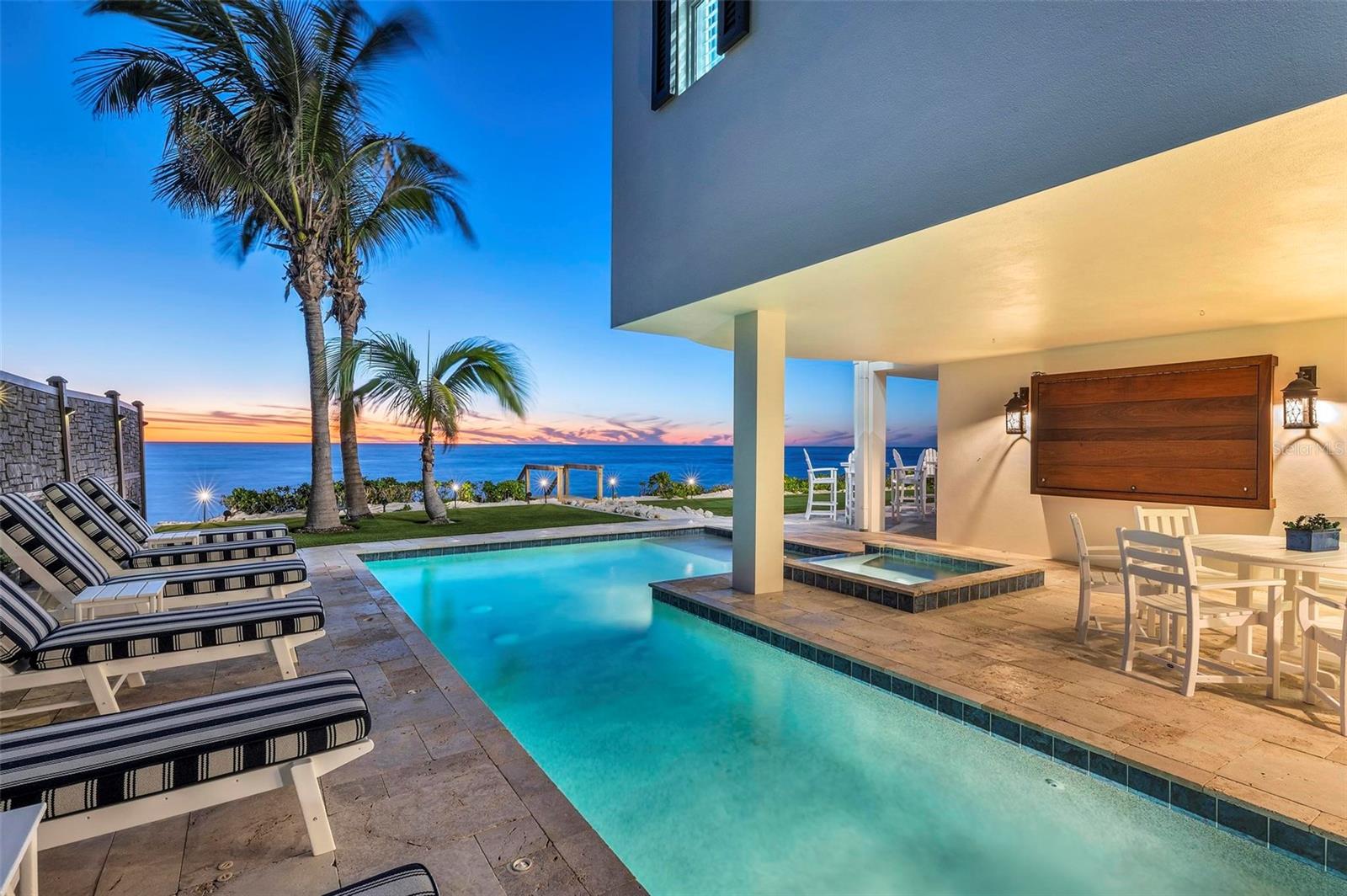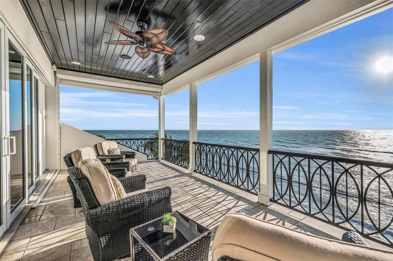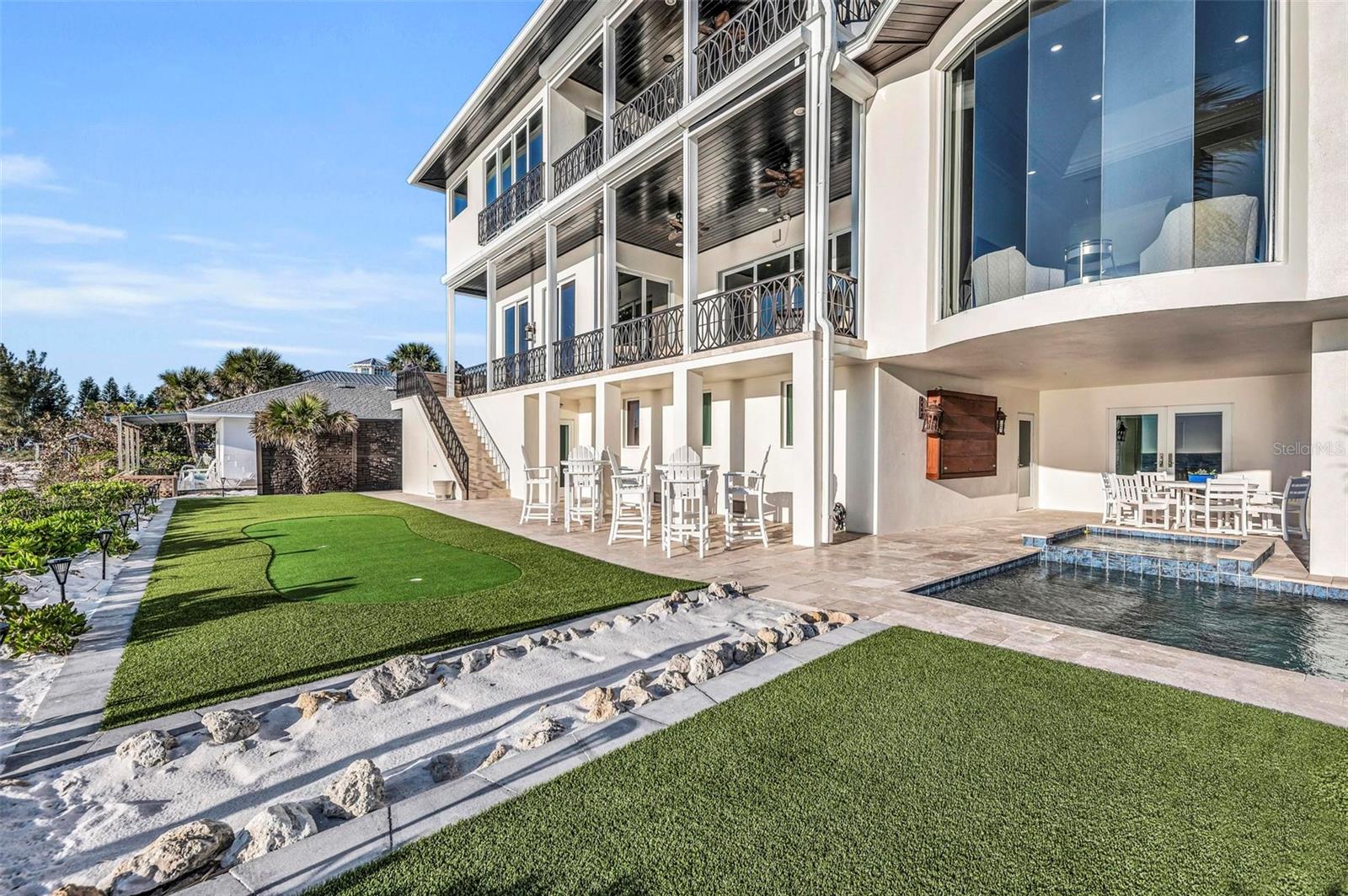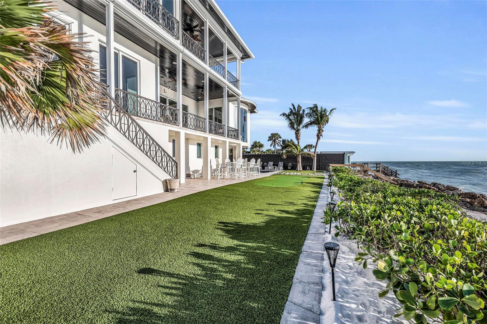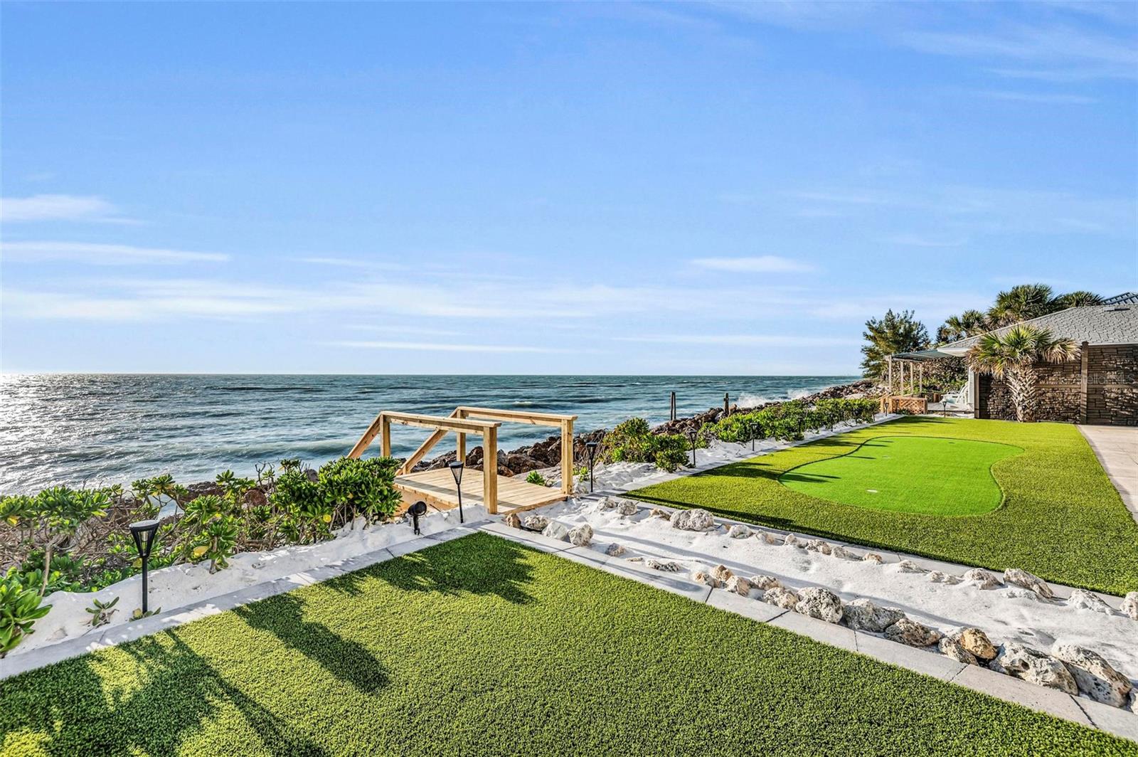 Nestled along the pristine shores of Casey Key, this luxurious residence optimizes coastal living at its finest. Boasting breathtaking panoramic views of the Gulf of Mexico, this 4-bedroom, 4.5-bathroom plus pool room with full bath, home is a masterpiece of architectural design and opulent comfort. Upon entering, guests are greeted by an elegant foyer leading to a spacious living area adorned with floor-to-ceiling windows and balcony, allowing natural light to cascade throughout the space and offering uninterrupted vistas of the turquoise waters beyond. The open-concept layout seamlessly connects the living room, dining area, and gourmet kitchen, creating an ideal setting for entertaining or simply enjoying tranquil evenings with loved ones. The kitchen is a chef's dream, featuring top-of-the-line appliances, custom cabinetry, and a center island with bar seating. Adjacent to the kitchen is an inclusive dining area, perfect for enjoying morning coffee while soaking in the breathtaking views or entertaining guests for dinner parties. For added convenience, an elevator provides easy access to all levels of the home, ensuring accessibility for residents and guests alike. The master suite, located on the main floor, is a sanctuary unto itself, complete with a spa-like bathroom featuring a walk-in shower, dual vanities, and a walk-in closet. With floor to ceiling picture windows, waking to the serene views is easy with remote shades for optimal relaxation and resting. On the second floor, you'll discover three additional bedroom suites, each providing serene havens. One suite could be a second master suite with soaking tub, dual vanity, and walk-in shower and closet that provide a private escape of expansive coastal views. Adjacent to these bedrooms, a family room awaits, ideal for hosting gatherings or unwinding in comfort. Step out onto the expansive balcony and immerse yourself in the soothing melody of waves crashing against the shore, enhancing the atmosphere of relaxation and tranquility. The expansive outdoor living space is an entertainer's paradise, featuring a sparkling salt water heated pool and spa overlooking the Gulf, a spacious deck for sunbathing, and a putting green for golf enthusiasts. Outdoor kitchen by the pool area and on the main level makes it easy to entertain in both areas watching the award winning sunsets of Casey Key. The pool room with dishwasher, sink, ice maker, and refrigerator plus full bath makes after pool or beach fun easily cleaned up and not tracked through the main home. Full feature sheet attached as the upgrades are endless! With its unparalleled location, luxurious amenities, and unparalleled views, this Casey Key residence offers a rare opportunity to experience coastal living at its absolute finest. Whether as a full-time residence or a vacation retreat, this magnificent home is sure to exceed even the most discerning buyer's expectations.