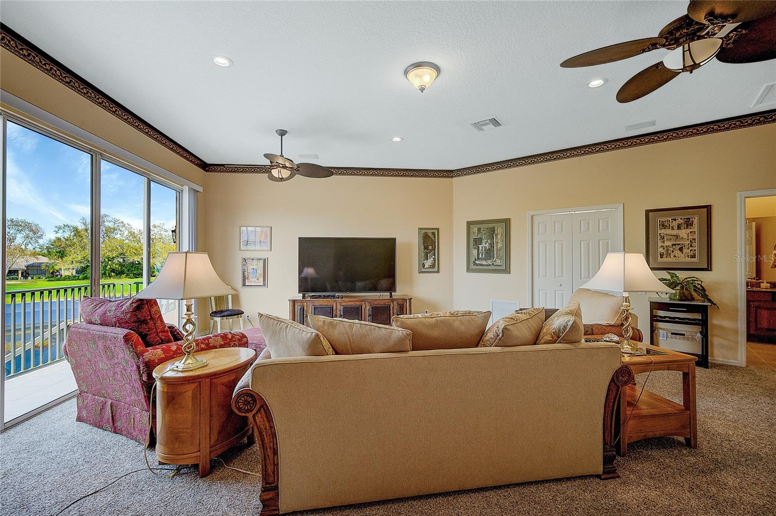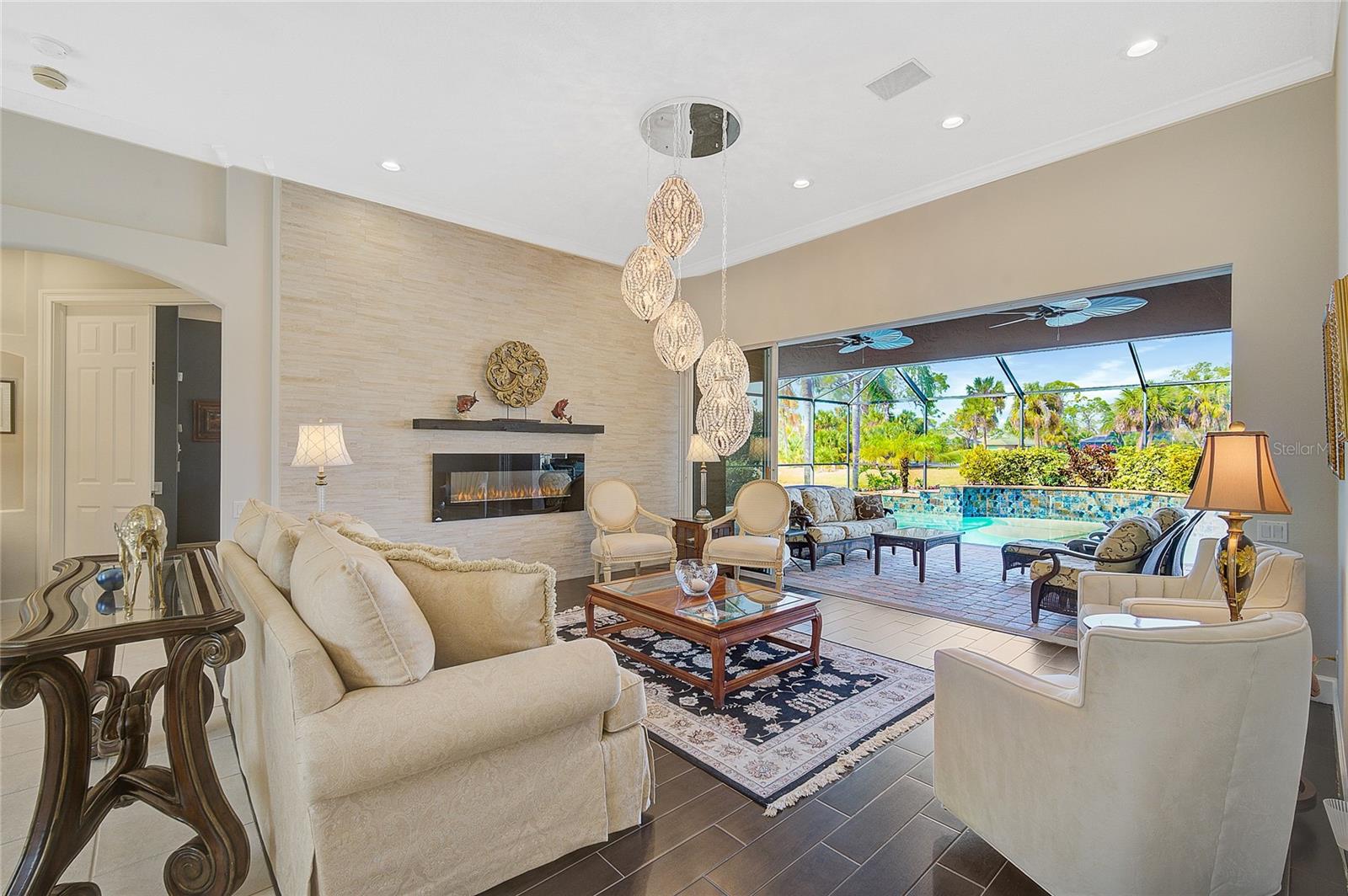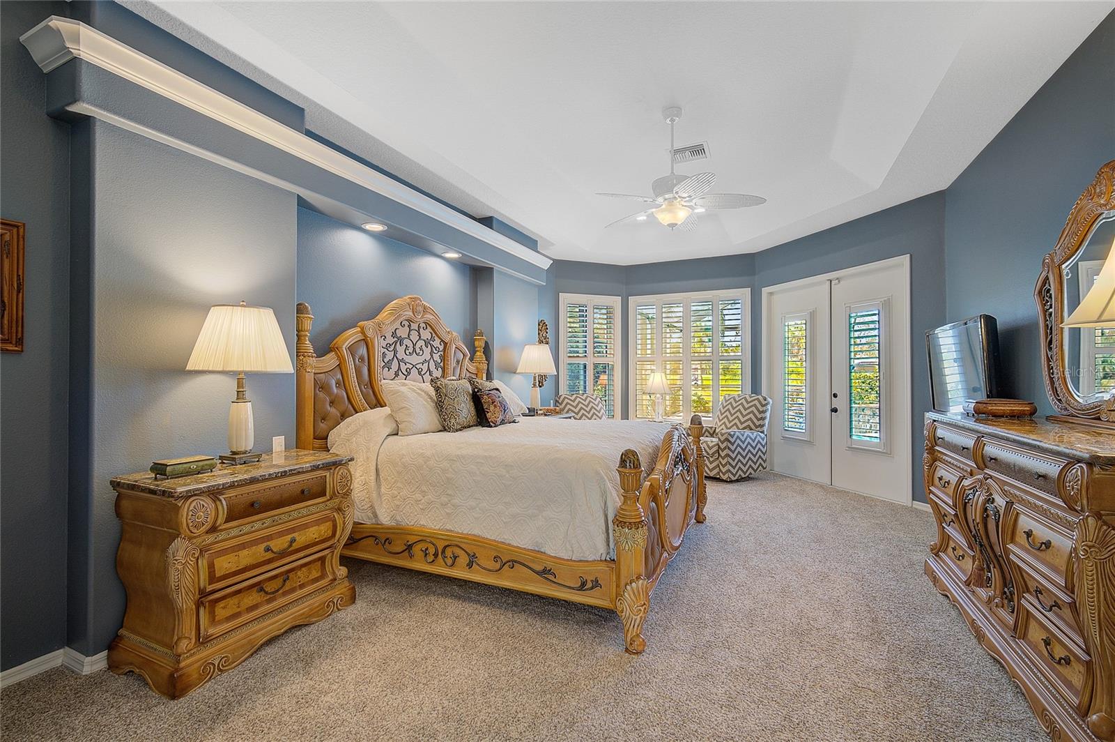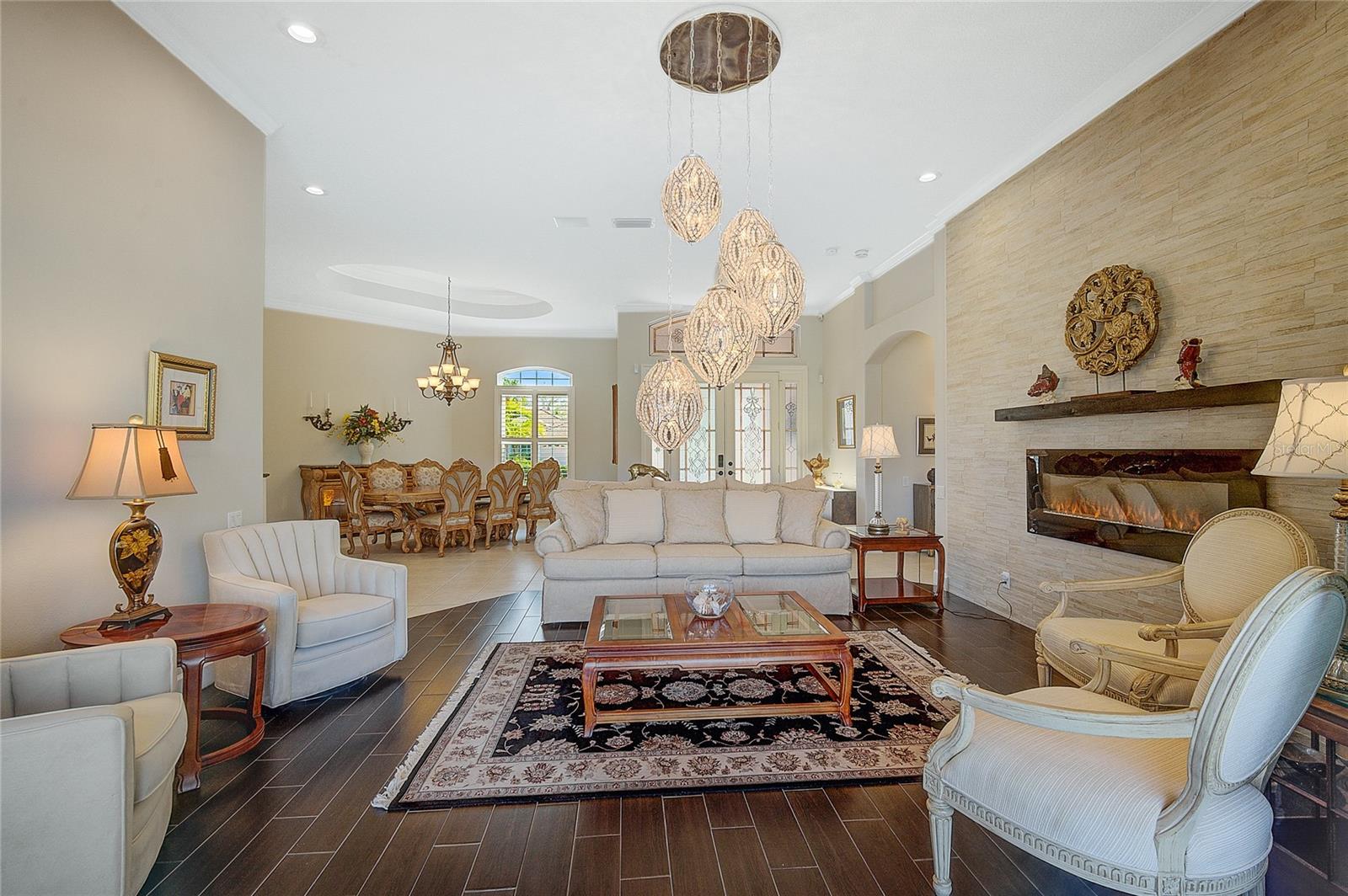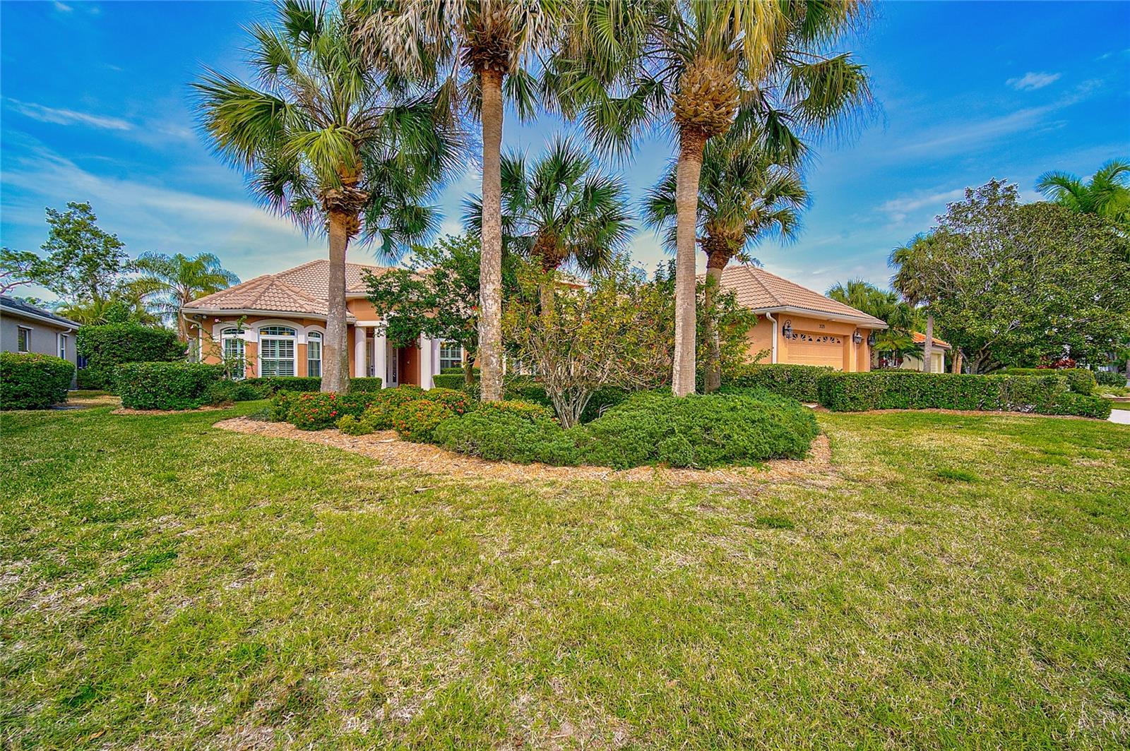 Luxury, comfort and views converge! This captivating LAKEFRONT VIEW home with 3-CAR GARAGE has an expansive floor plan of 4,255 sq ft overlooking the highly desirable golf community of Calusa Lakes. The two-story residence opens to a grand foyer, living room with dazzling stone designed fireplace and open formal dining area. This property offers exquisite finishes throughout including crown molding, built-in wall units, recessed lighting, wood cabinetry and plantation shutters. The gourmet kitchen is a chef’s delight hosting a gas cooktop, built-in ovens, granite counter tops coupled with an oversized island with microwave and beverage cooler. The grand kitchen with aquarium window overflows into the spacious trey ceiling family room where natural sunlight cascades throughout the rooms. There are 4 total bedrooms, 3 are ensuite, one which is located on the second floor or could be ideal for family entertainment, a media room or potential in-law set up. The second floor presents a private balcony with a picturesque view of the meticulous grounds, tranquil pond and the 16th green. The main level hosts a private office ideal for working at home, a comfortable media room which could also be an additional office or perfect workout space. There is a gracious primary suite with 2 walk-in closets and the en-suite is designed with elegance in mind with jetted tub, dual sinks, marble finishes and walk in shower. Step out directly from the primary suite onto the impressive lanai and you will think you entered a 5-star resort. You will appreciate floating in the newly resurfaced 2021 heated pool or relaxing in the spa with your favorite cold beverage. The sound of cascading water as you host friends and relatives on the expansive brick paved lanai with built-in kitchen and granite bar sitting area, will have people never wanting to leave. The freshly painted interior is extremely tasteful with neutral palettes and the 4 air conditioners allow for controlled cooling throughout the home. No CDD fee , low $300 a quarter HOA fee and NO mandatory golf membership makes this the ideal community. Close proximity to world renowned beaches, unique boutique shops, numerous restaurants and cultural activities. The back private residence only gate allows quick access to I-75, international airports both north and south as well as the new Sarasota Memorial Hospital. Welcome to your palatial paradise! BE SURE TO VIEW THE 3-D & AERIAL TOURS.
